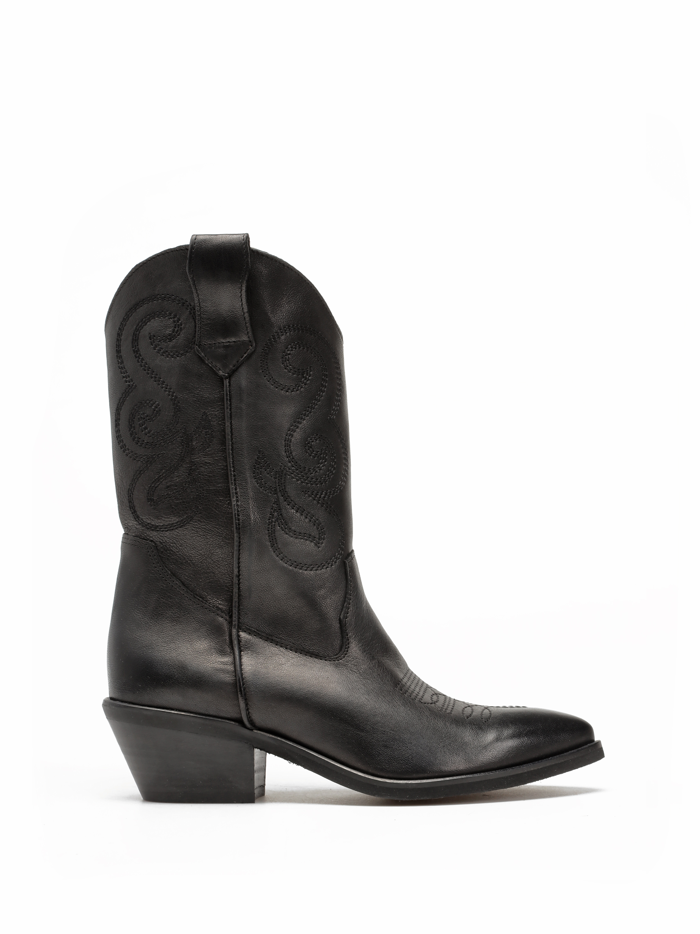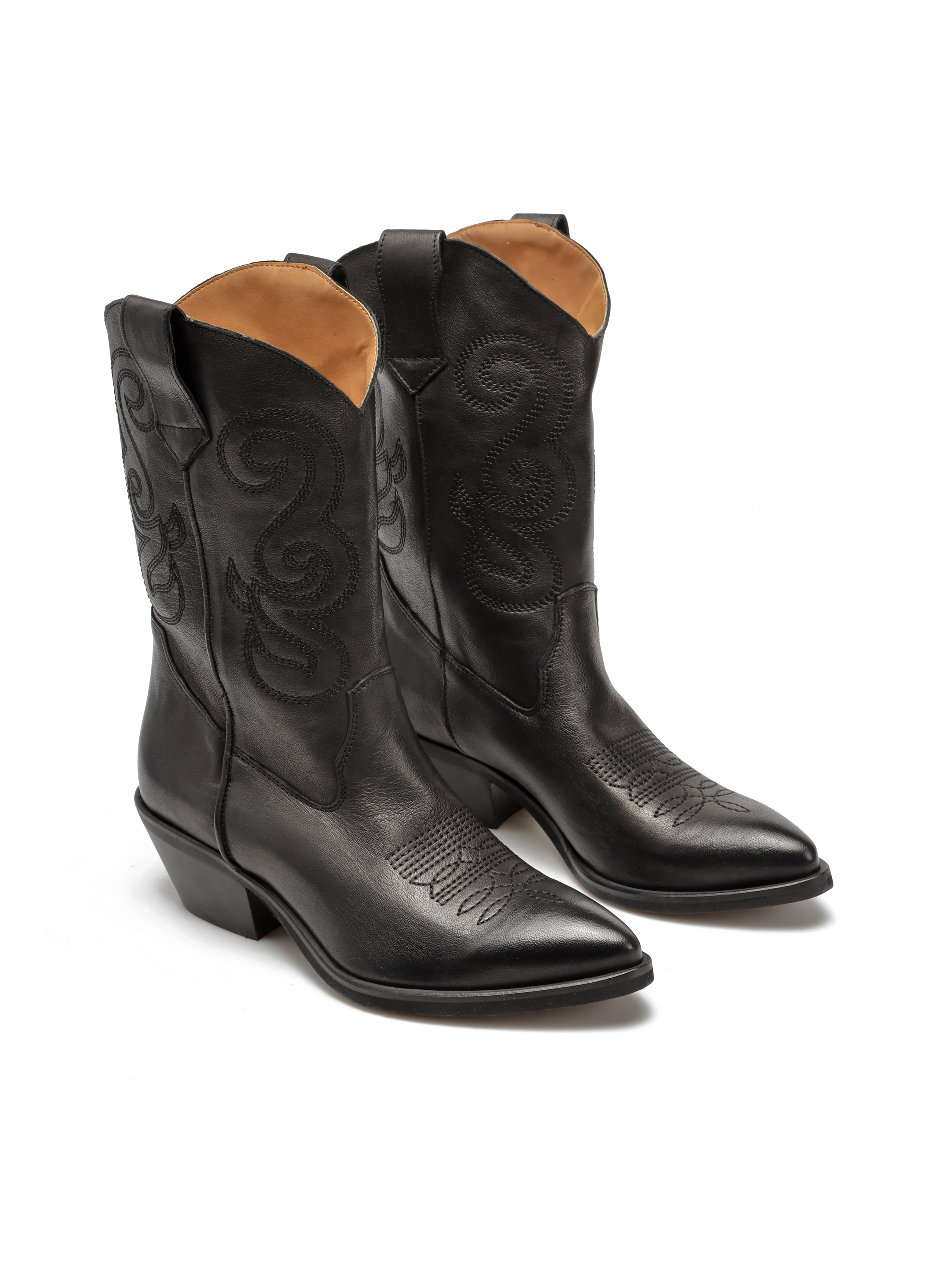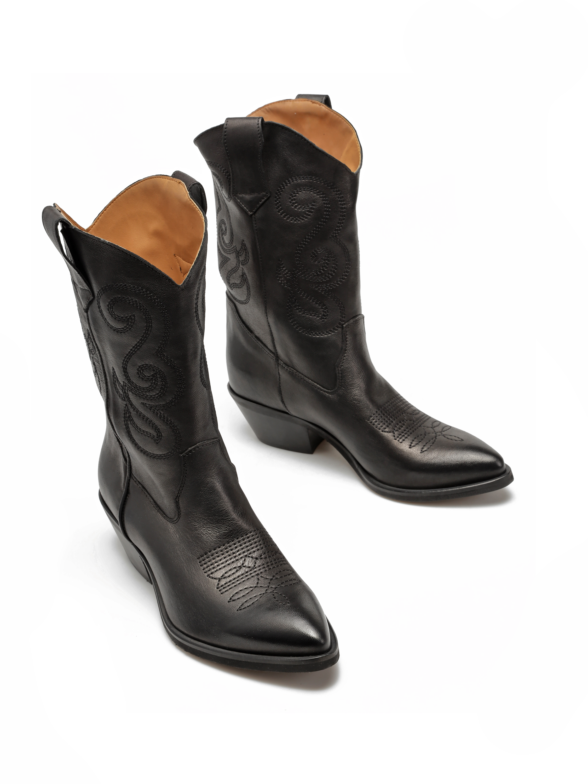 Wsuwane kowbojki to must have sezonu. Cholewka za kostkę w czarnym kolorze wykonana jest z włoskiej, naturalnej skóry. Model z charakterystycznym ściętym obcasem na słupku oraz noskiem w szpic. Detale w postaci stylowych przeszyć cholewki wyróżniają ten model.