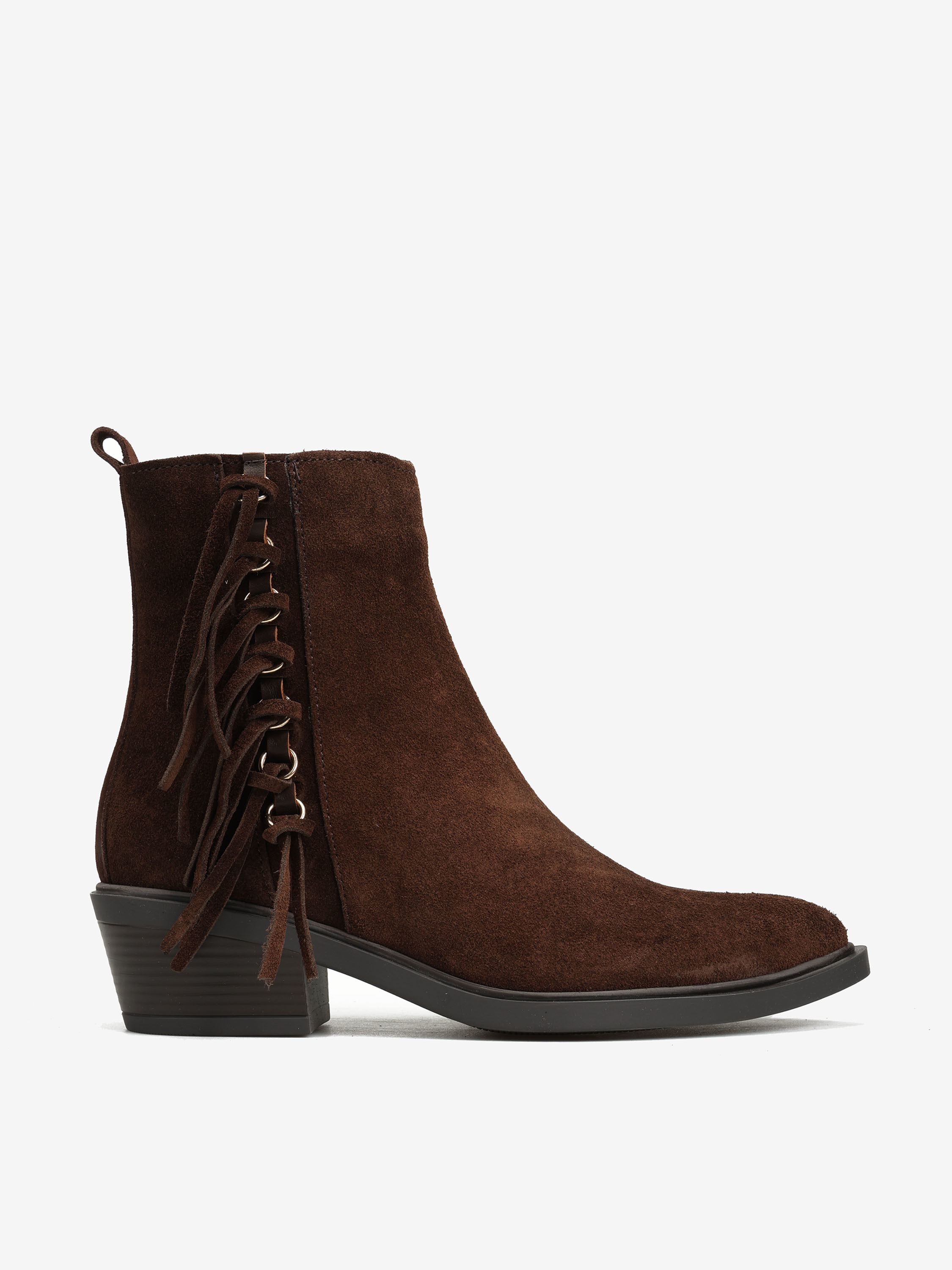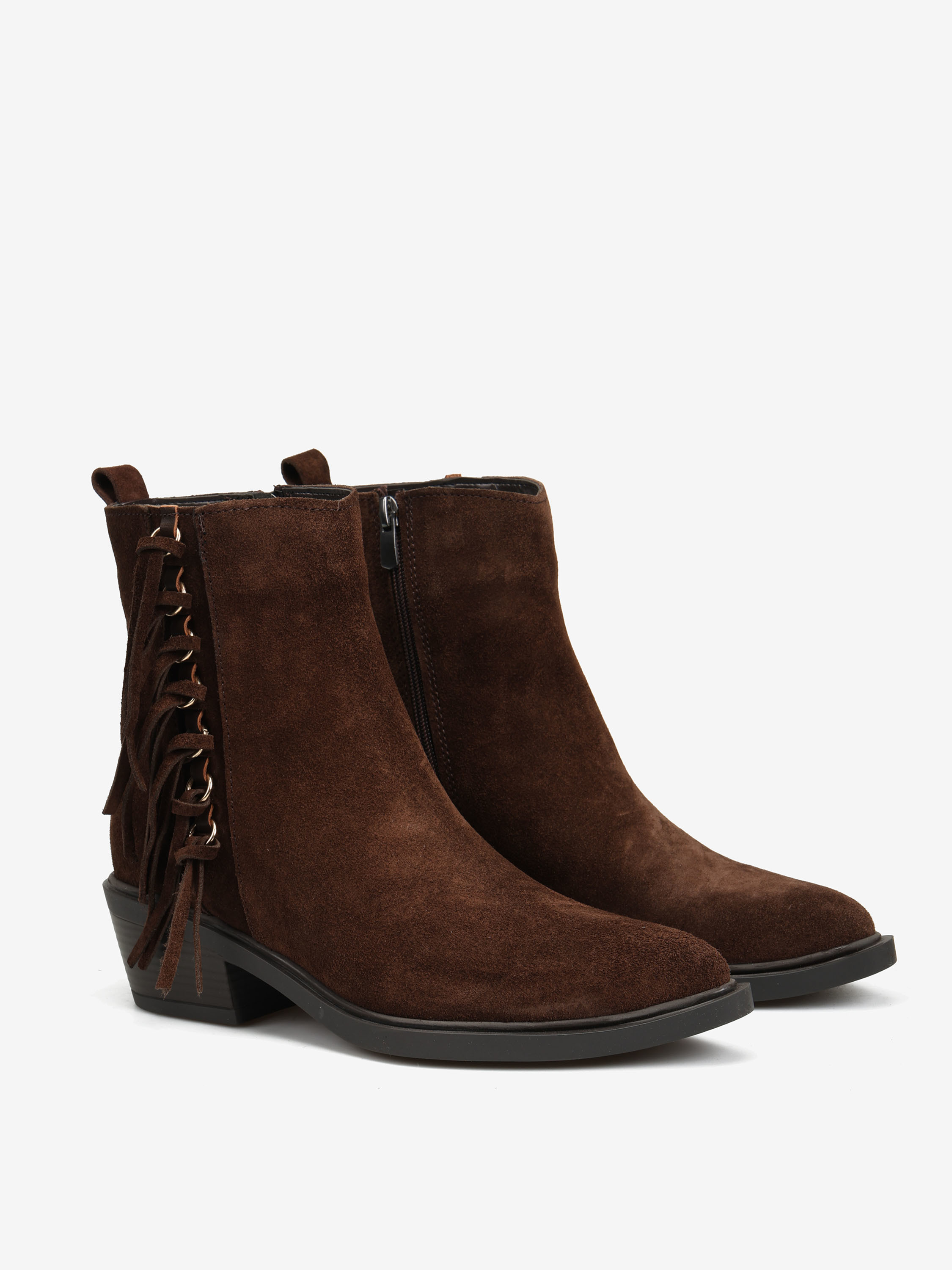 Kowbojki z ozdobnymi frędzlami i zapięciem na suwak przy kostce.
