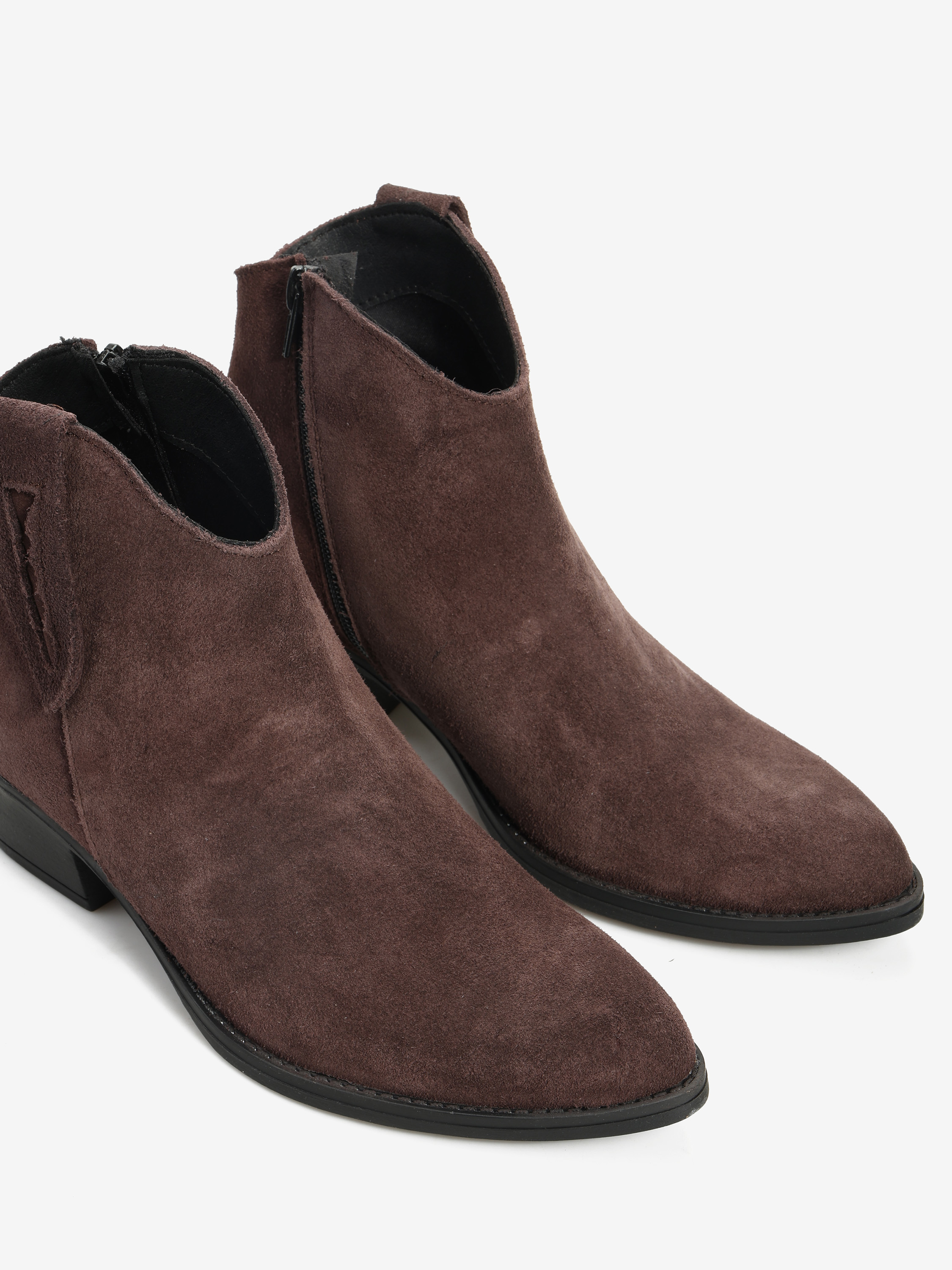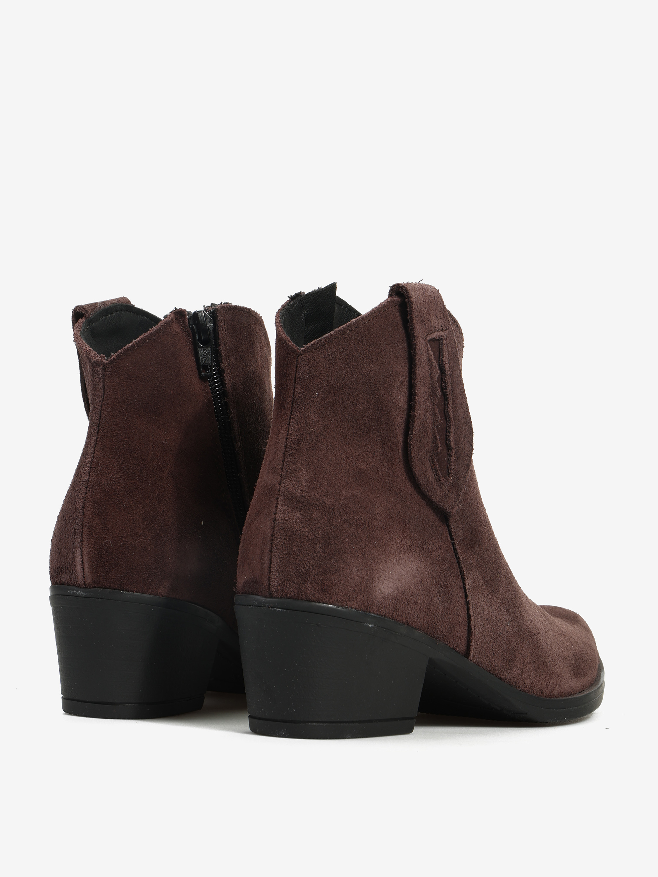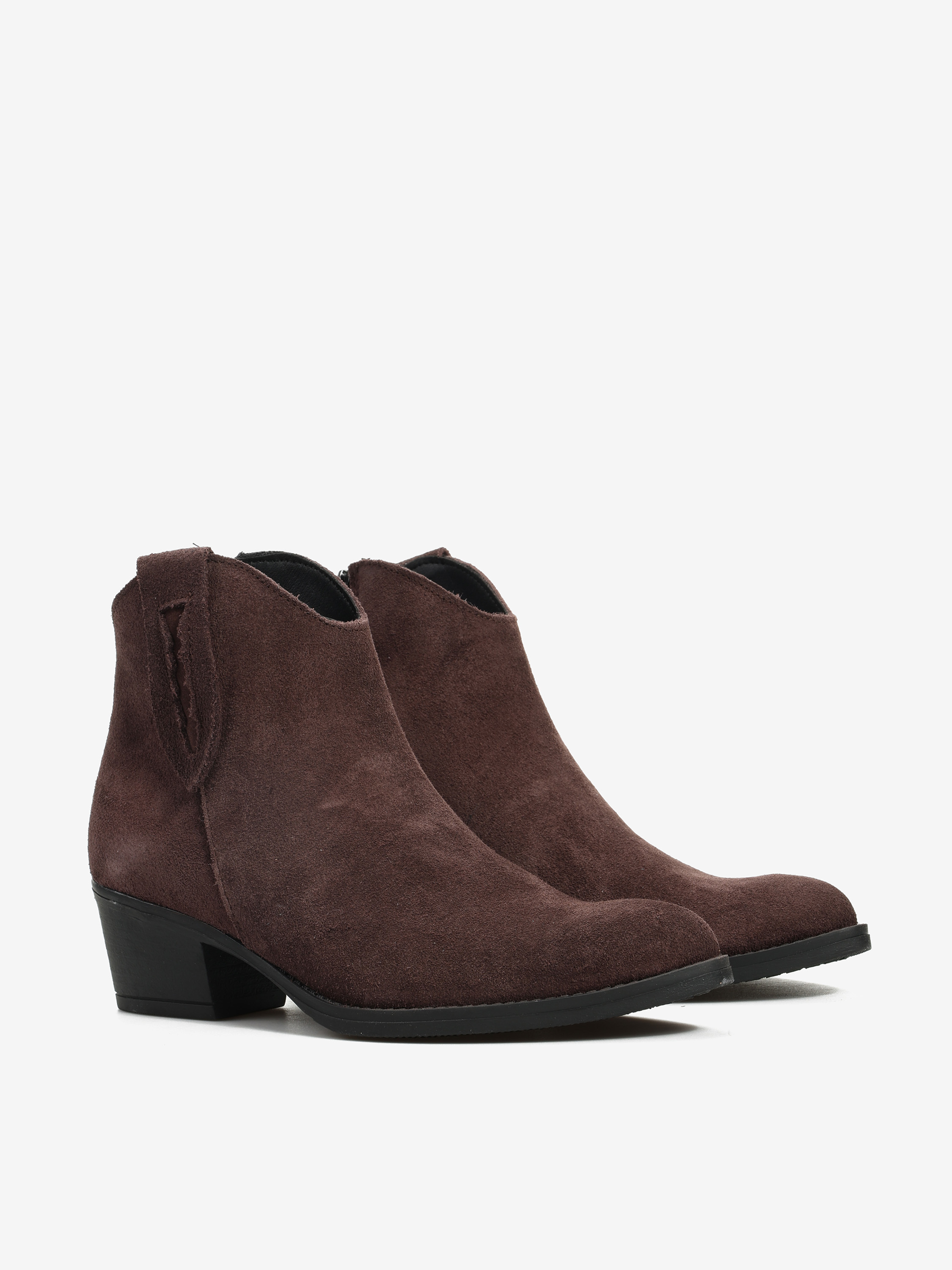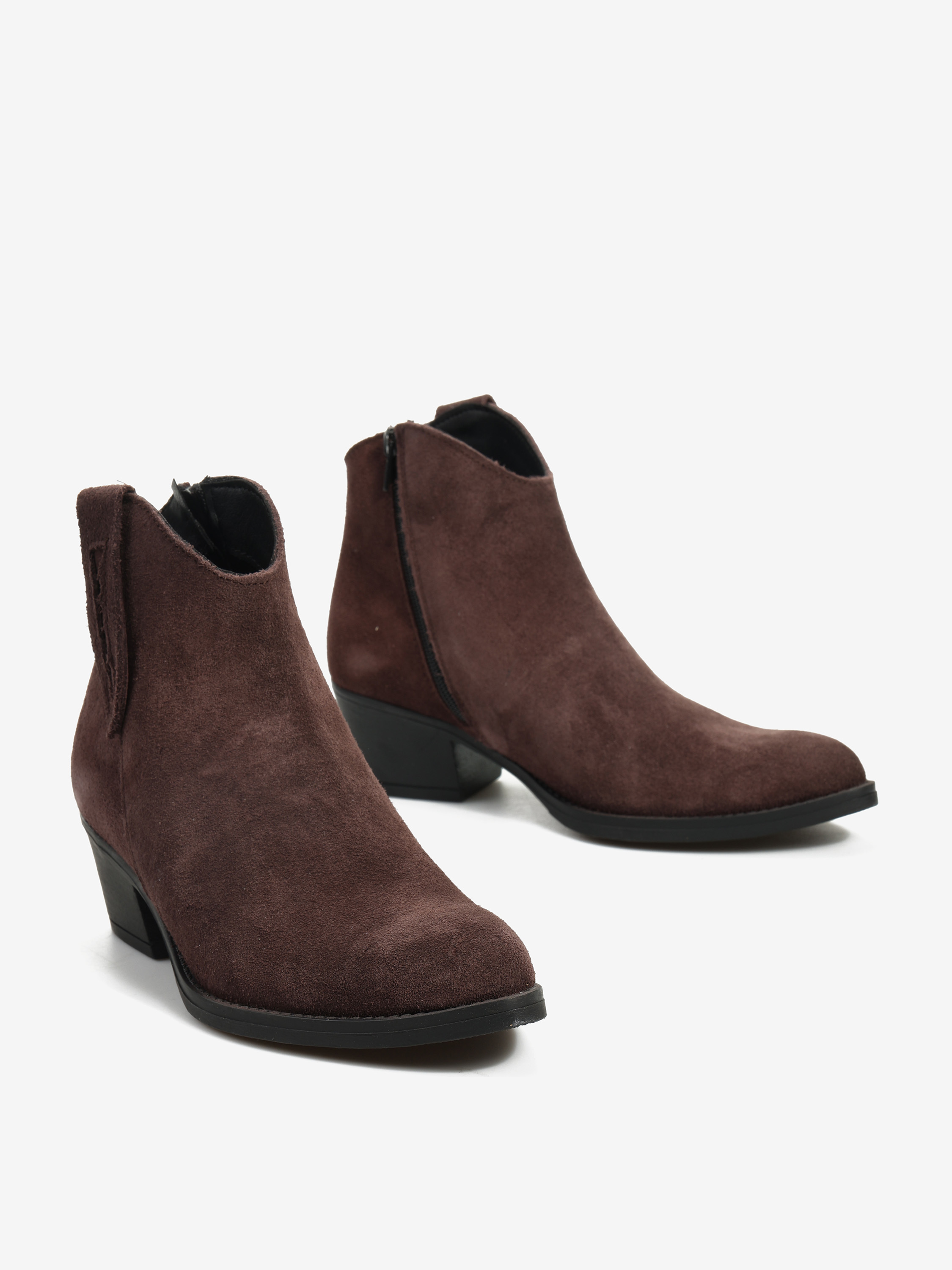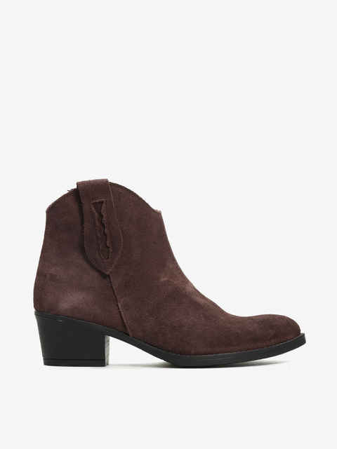 Krótkie kowbojki z ozdobną szlufką i zapięciem na suwak. Wykonane z brązowego zamszu.