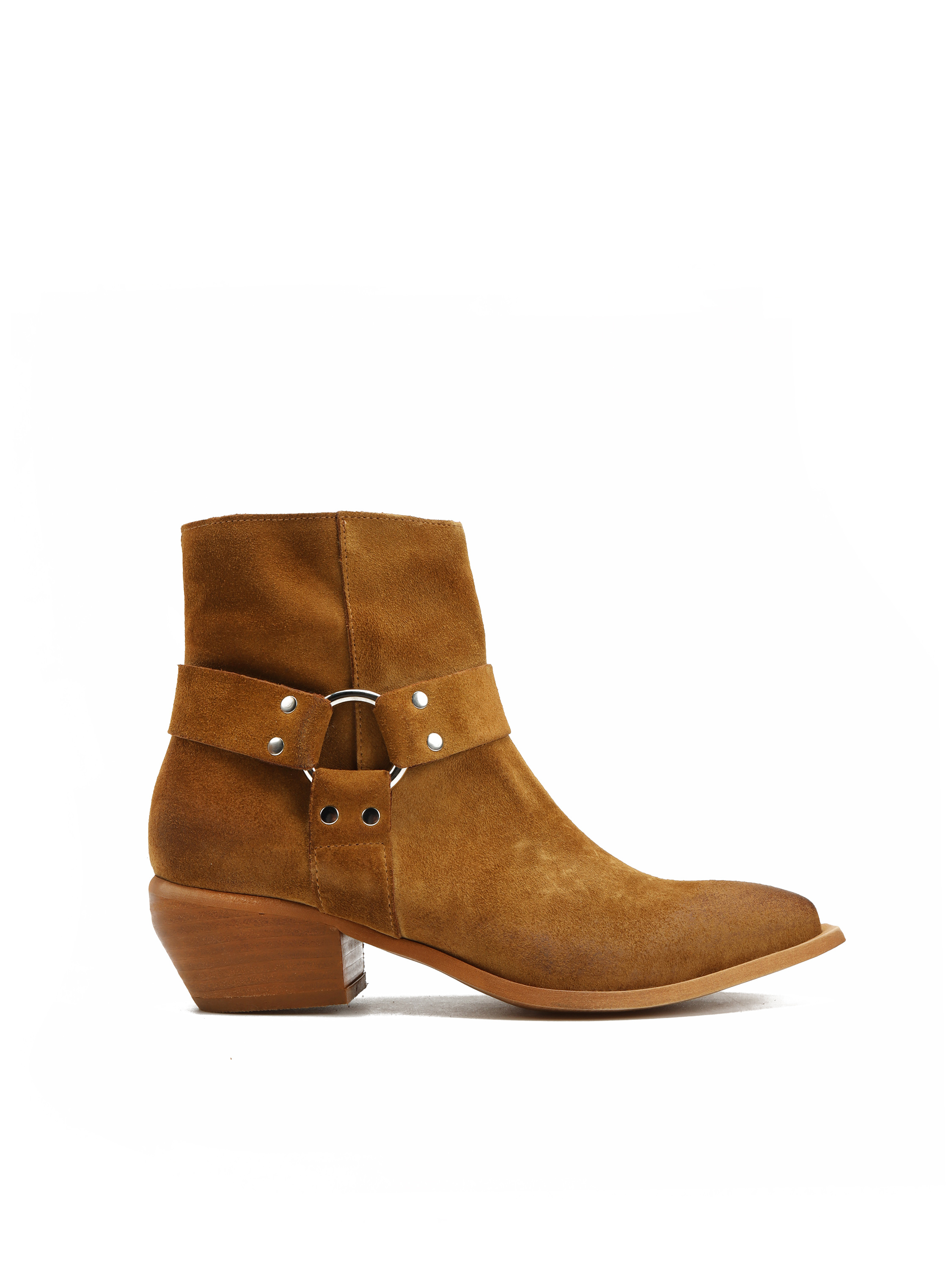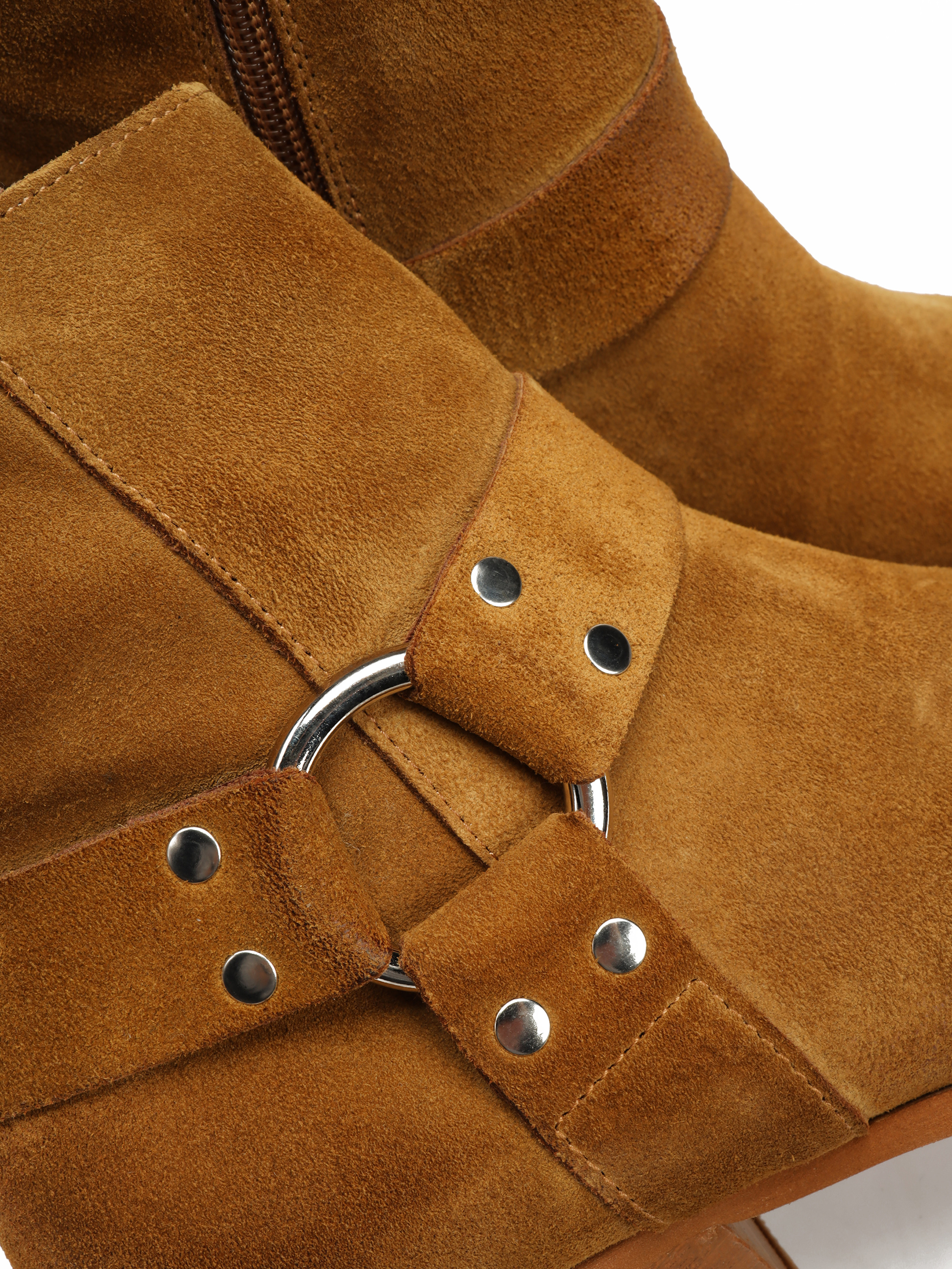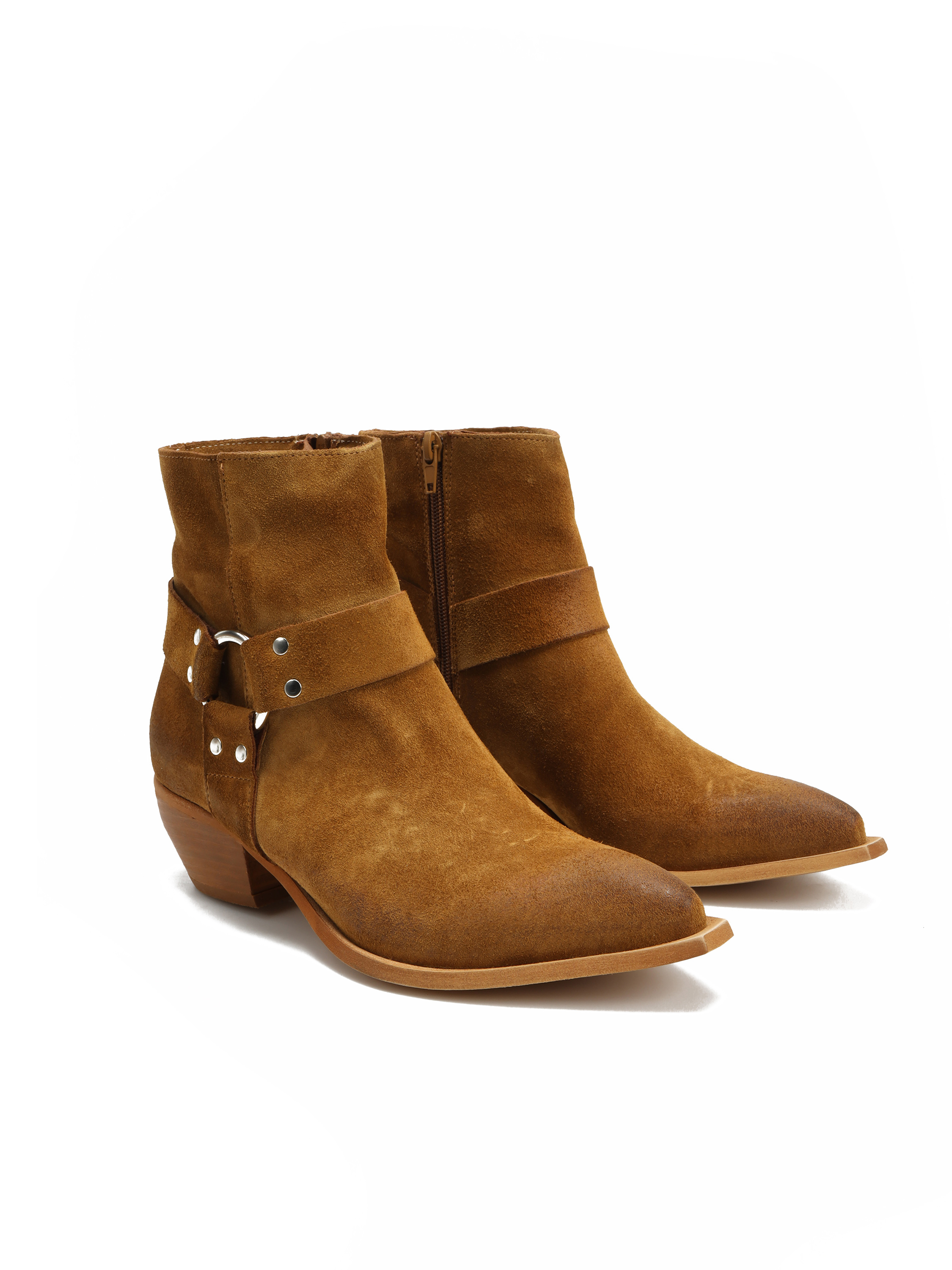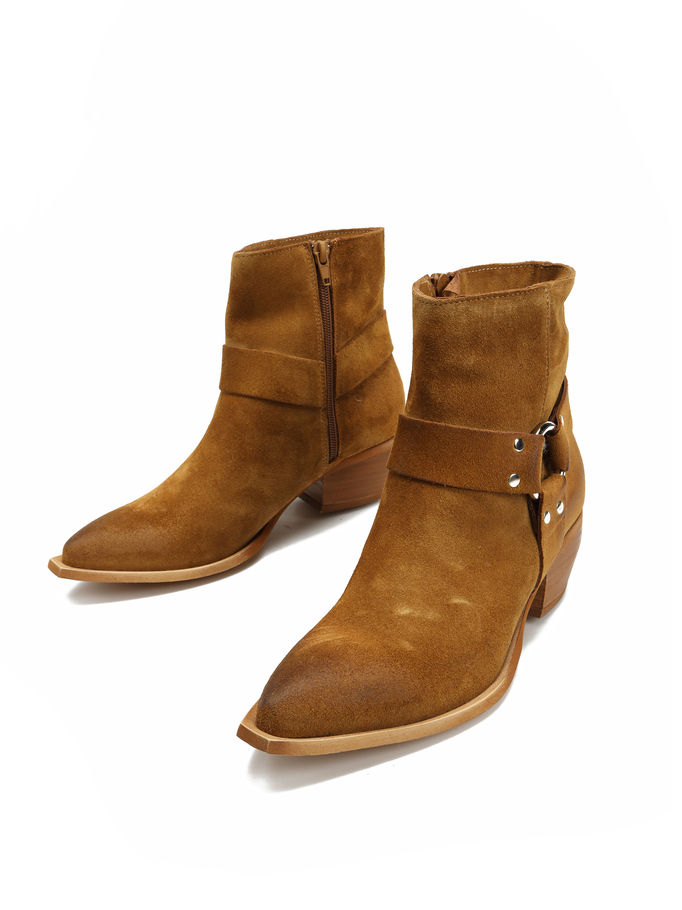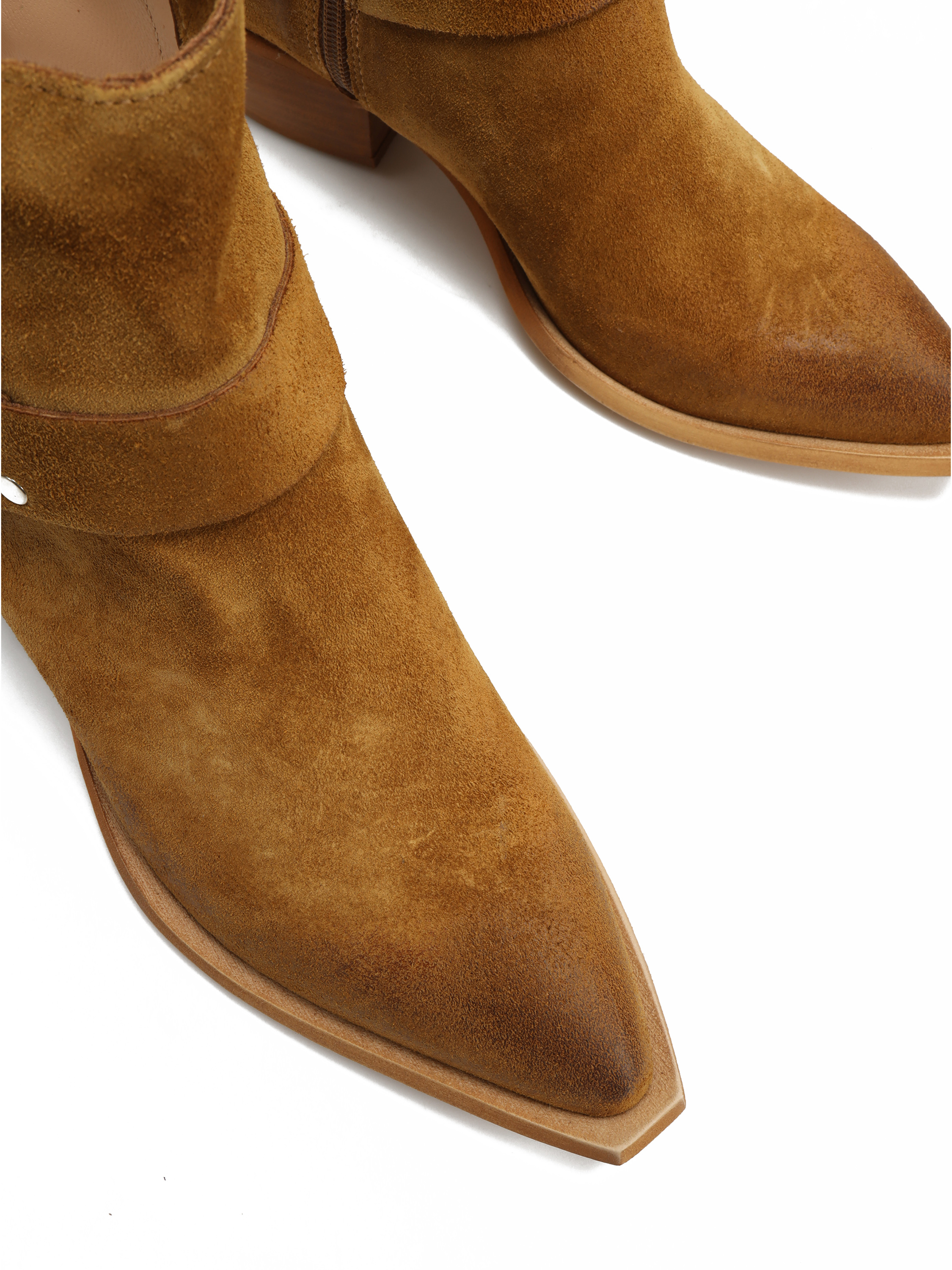 Krótkie kowbojki to gorący Trend sezonu. Wsuwana cholewka w kolorze rudym wykonana jest z naturalnej skóry zamszowej. Charakterystyczny dla tego fasonu ścięty obcas i nosek w szpic wyróżniają ten model.