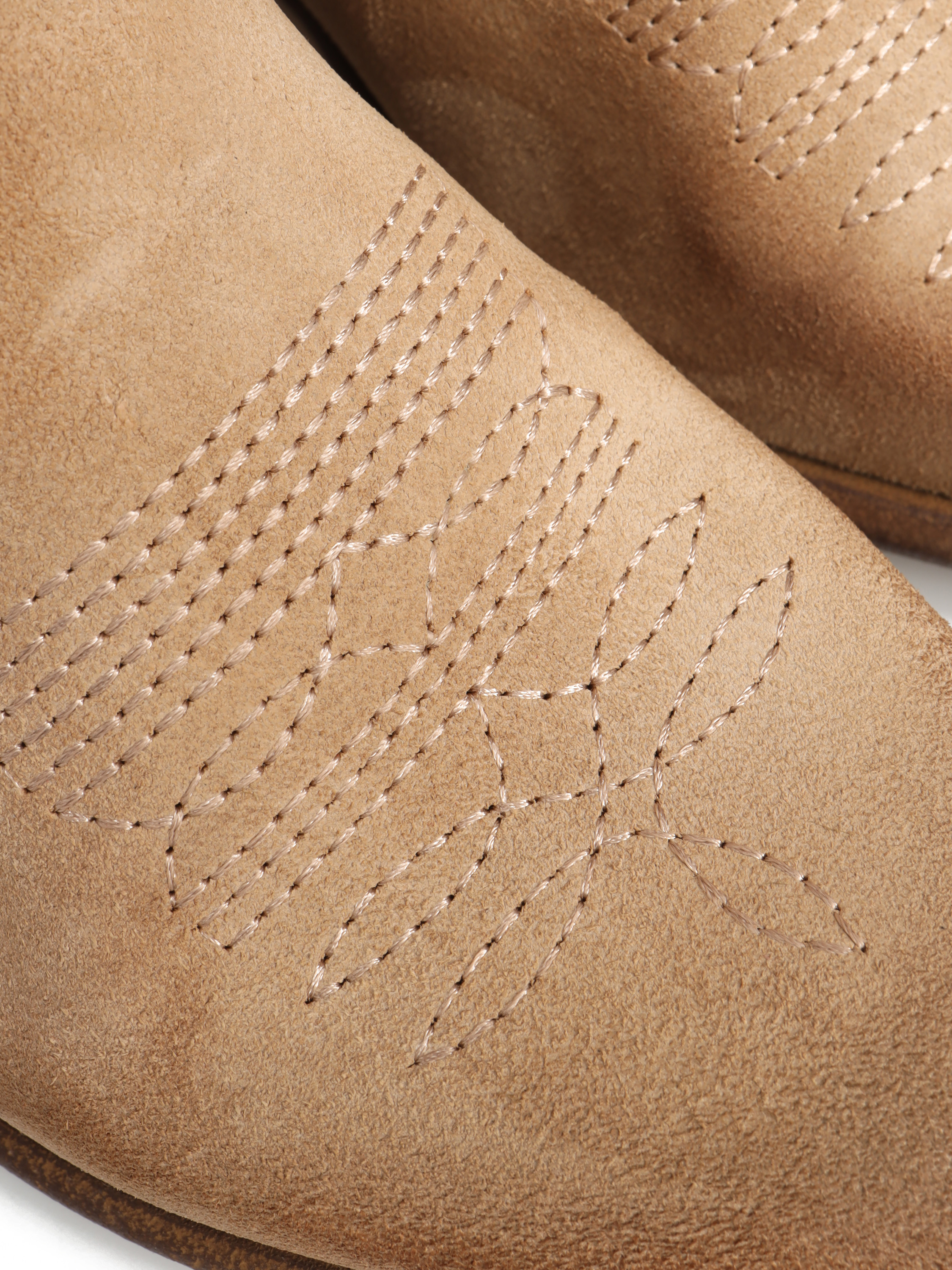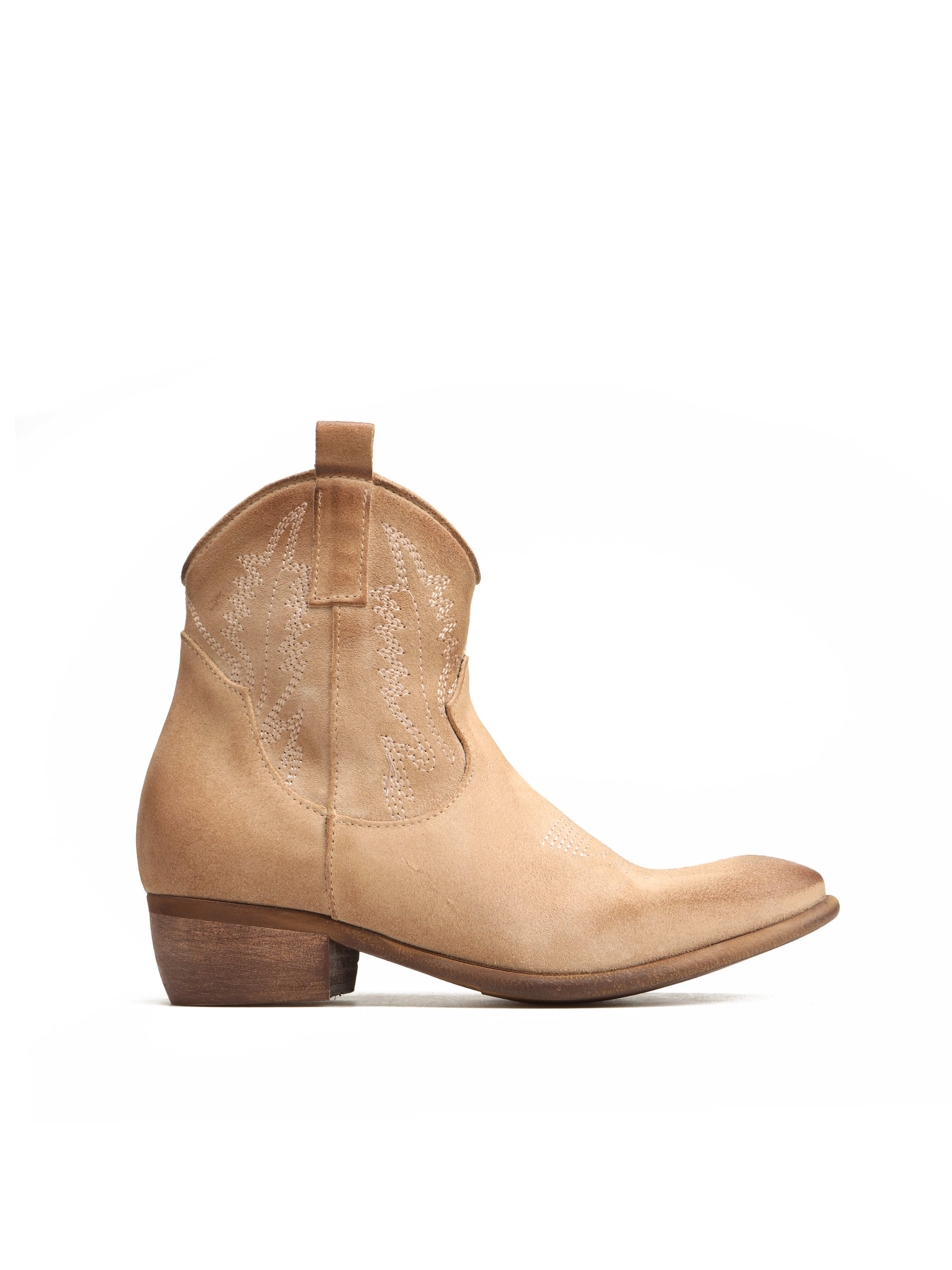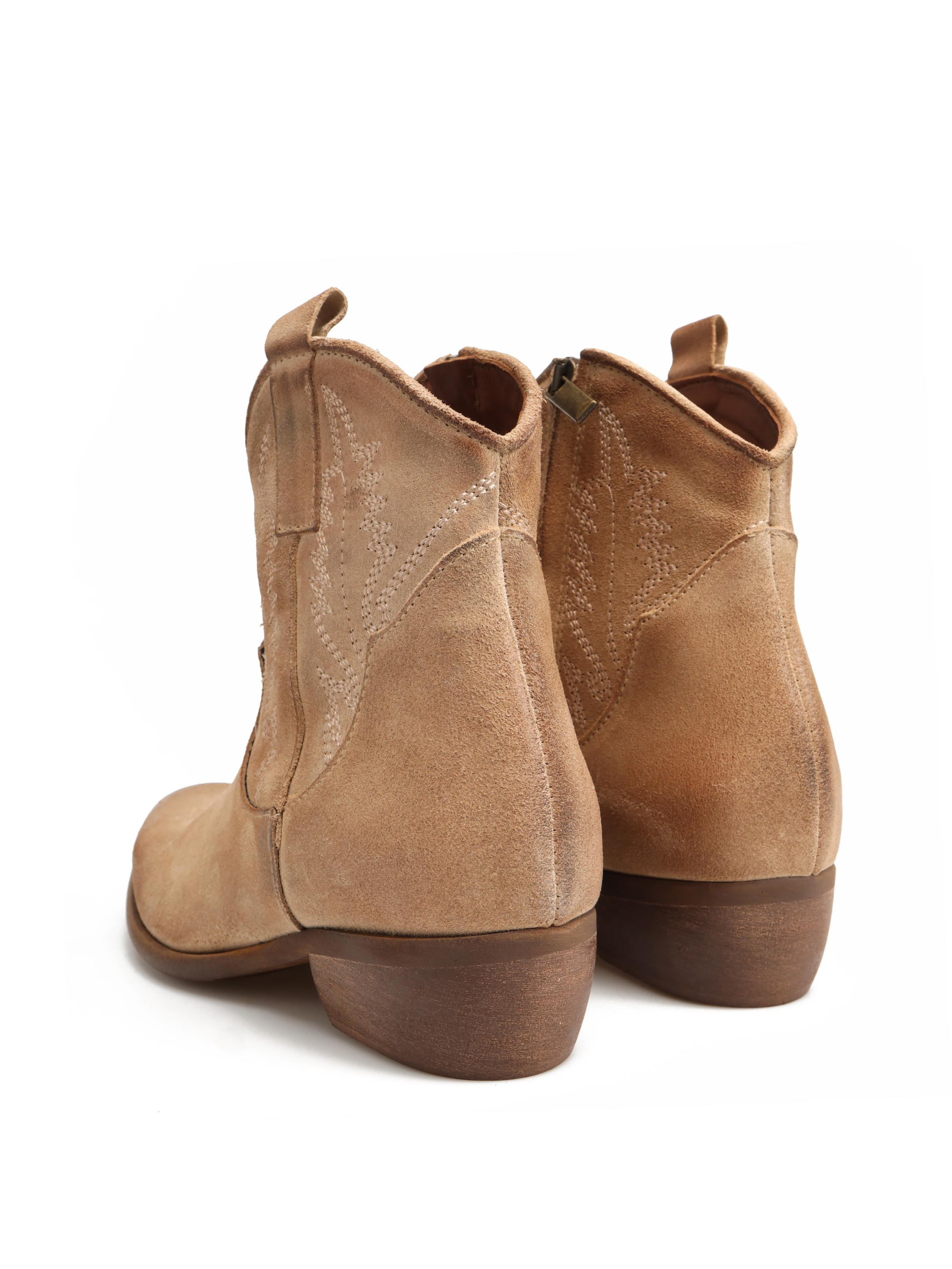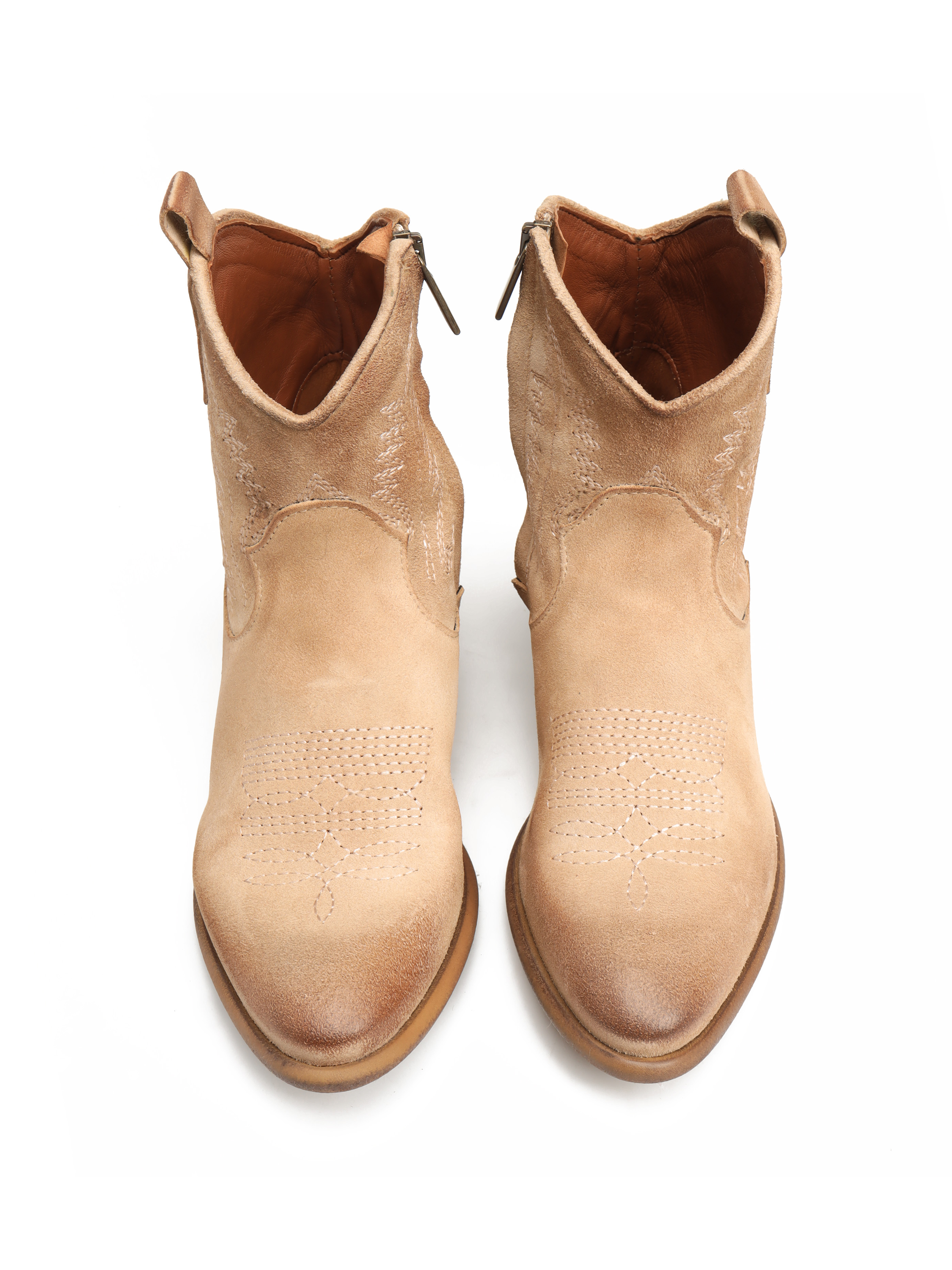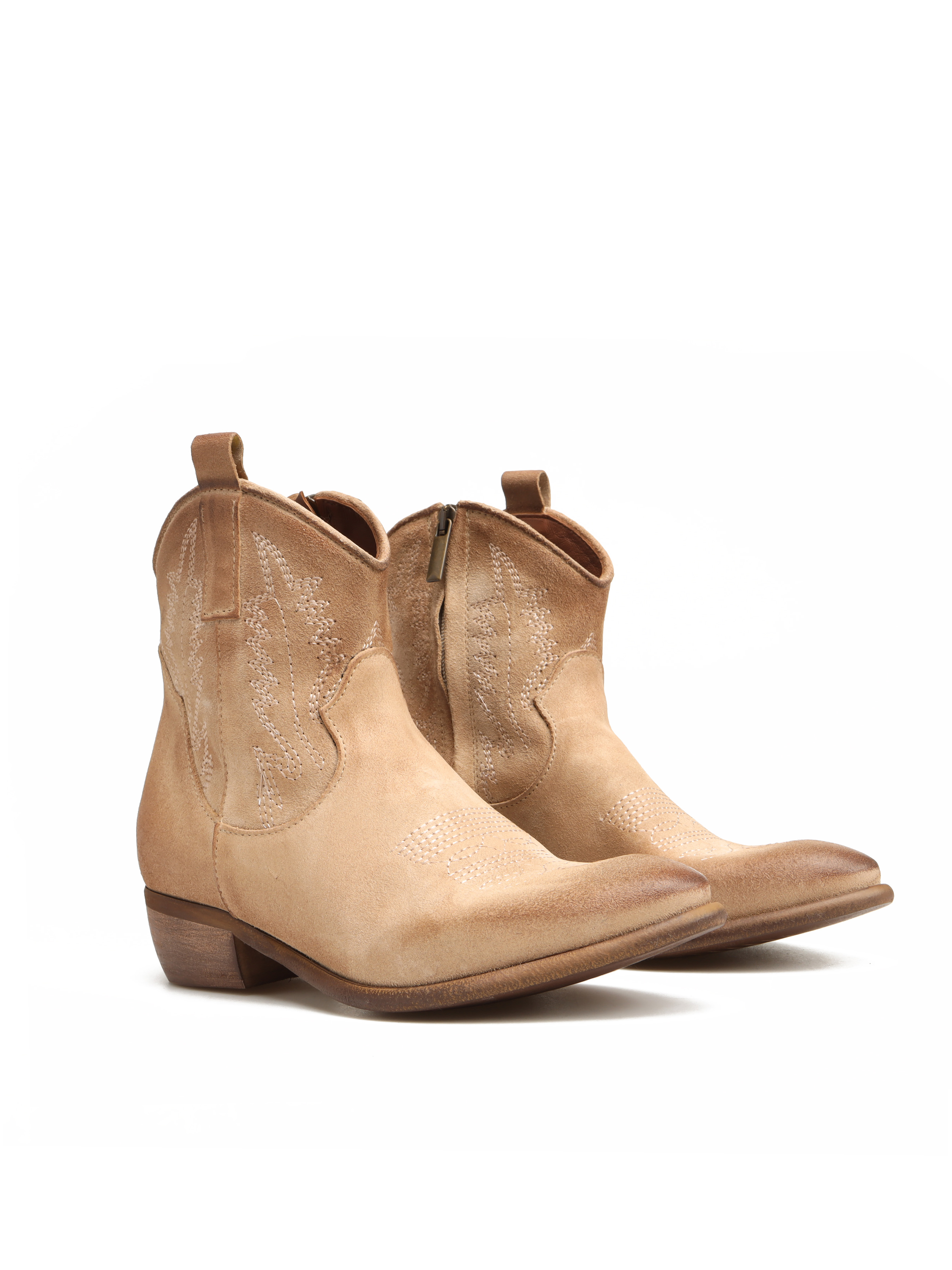 Krótkie kowbojki HEGO'S Milano wykonane są z zamszowej skóry. Cholewka w beżowym kolorze zapinana jest na zamek błyskawiczny. Fason ze ściętym obcasem oraz noskiem w szpic . Charakterystyczne przeszycia cholewki to detal, który wyróżnia ten model.