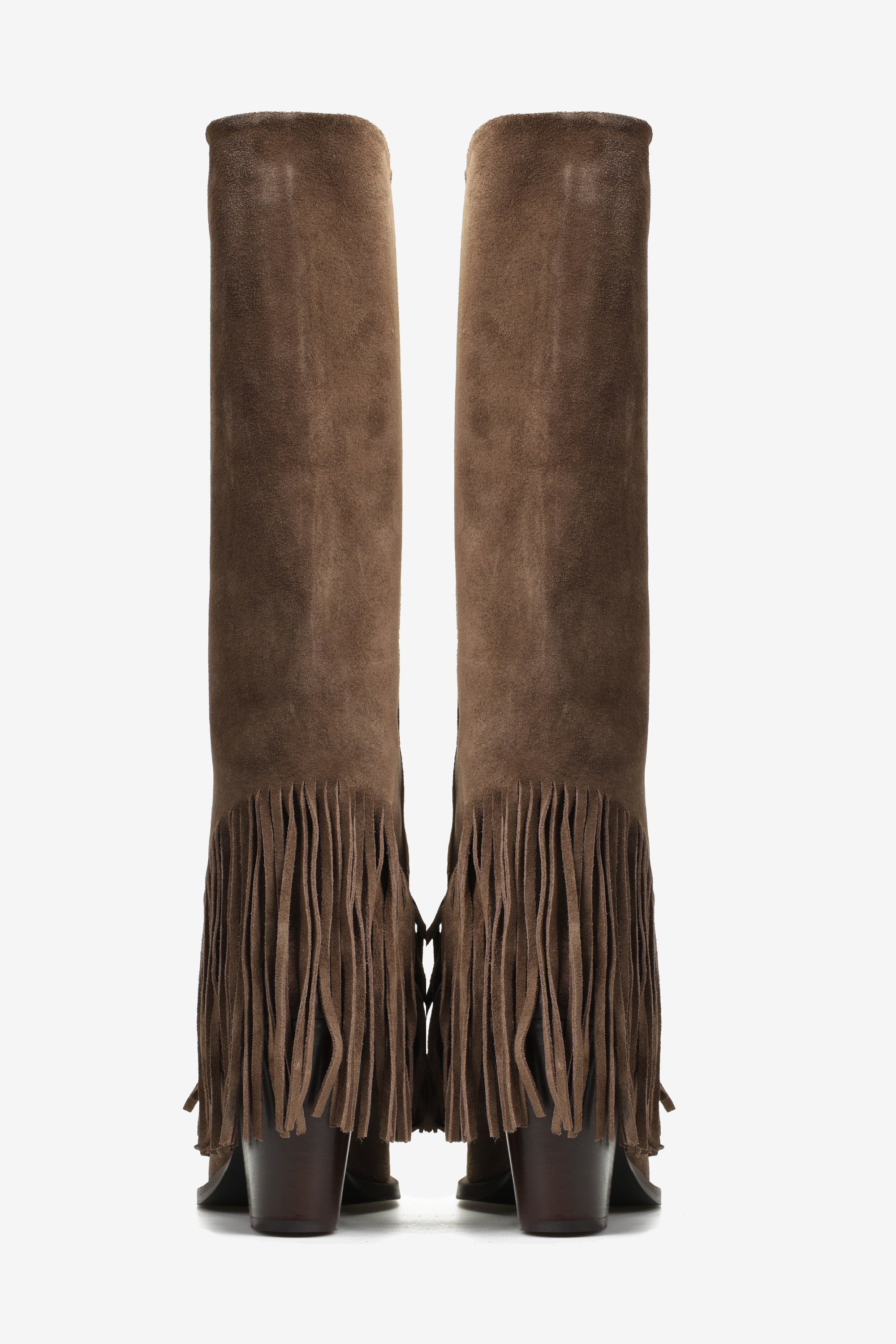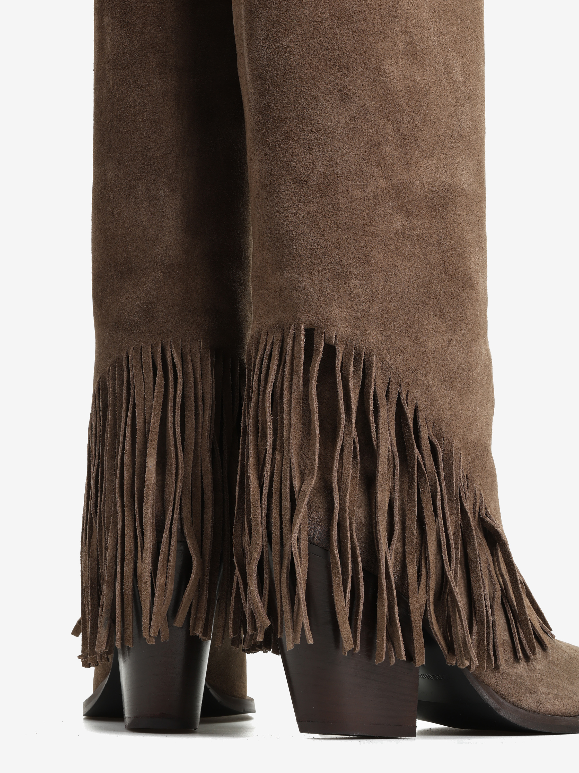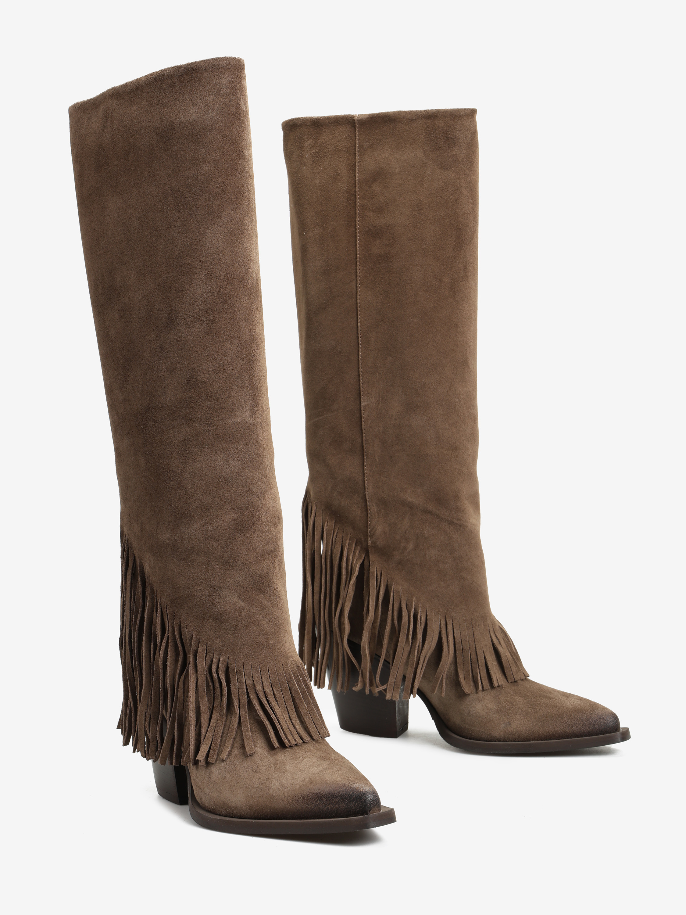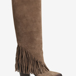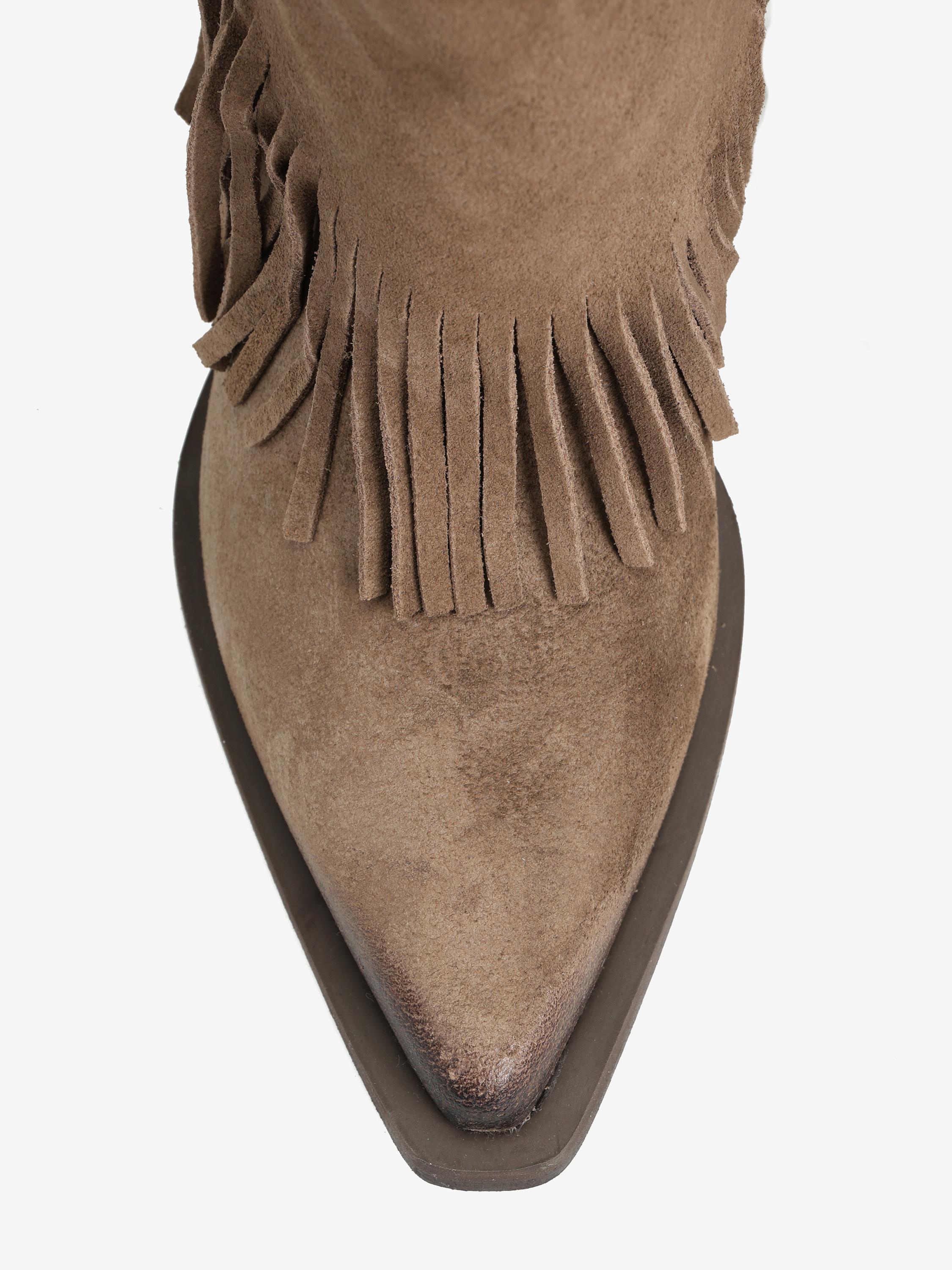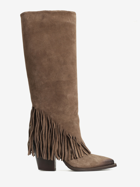 Zamszowe, wsuwane kowbojki z noskami w szpic i ozdobnymi frędzlami w dolnej części cholewki.