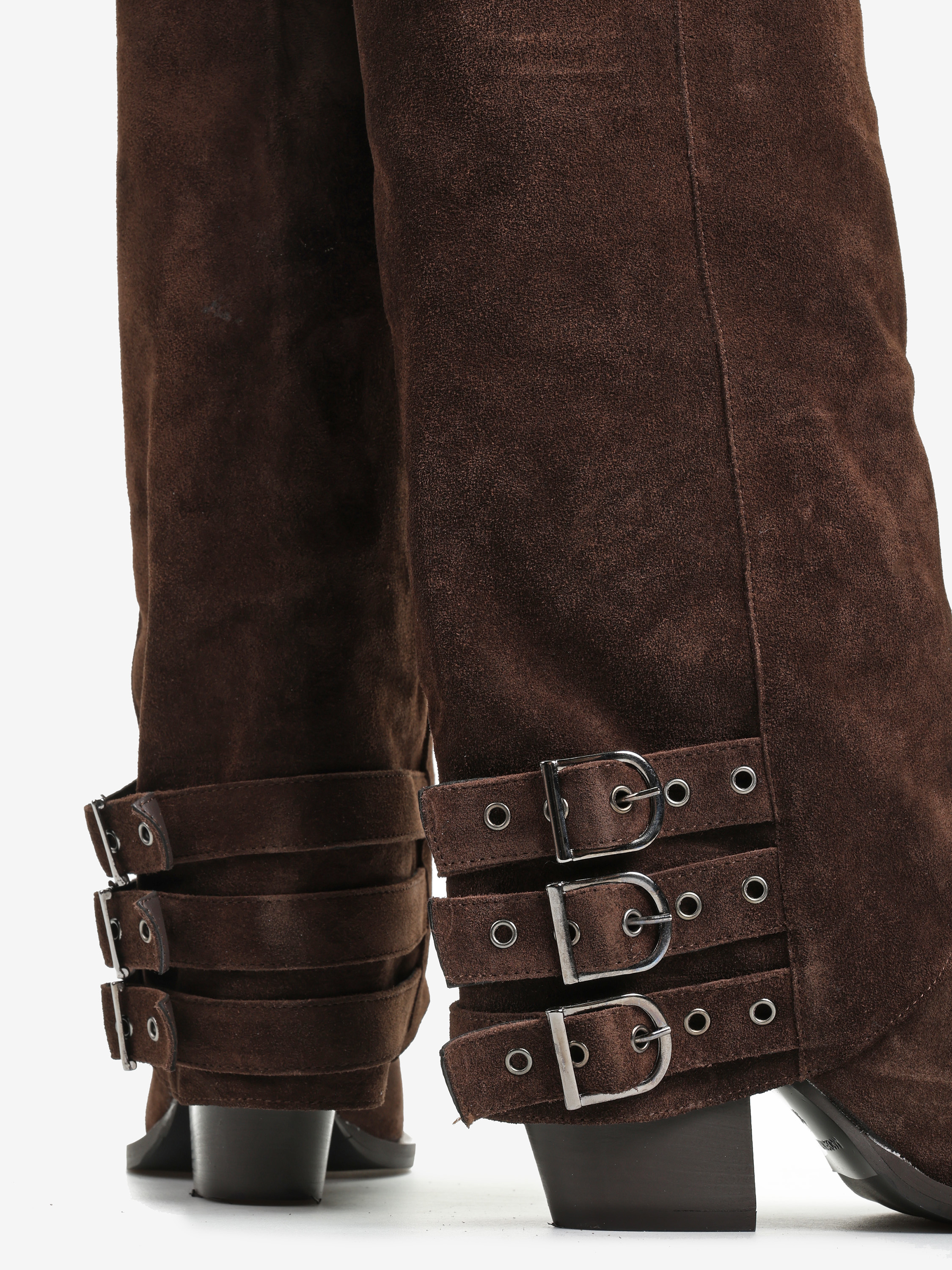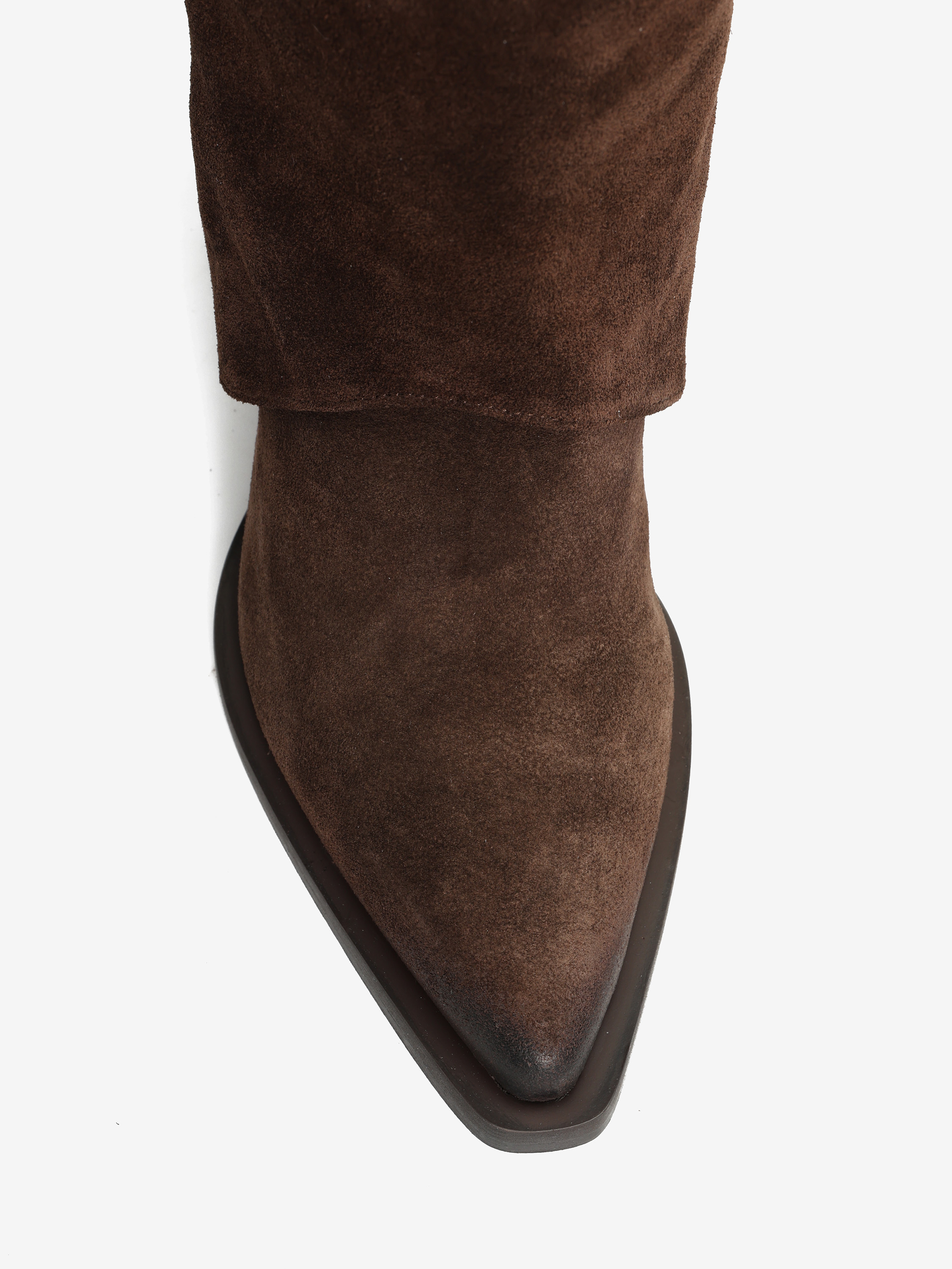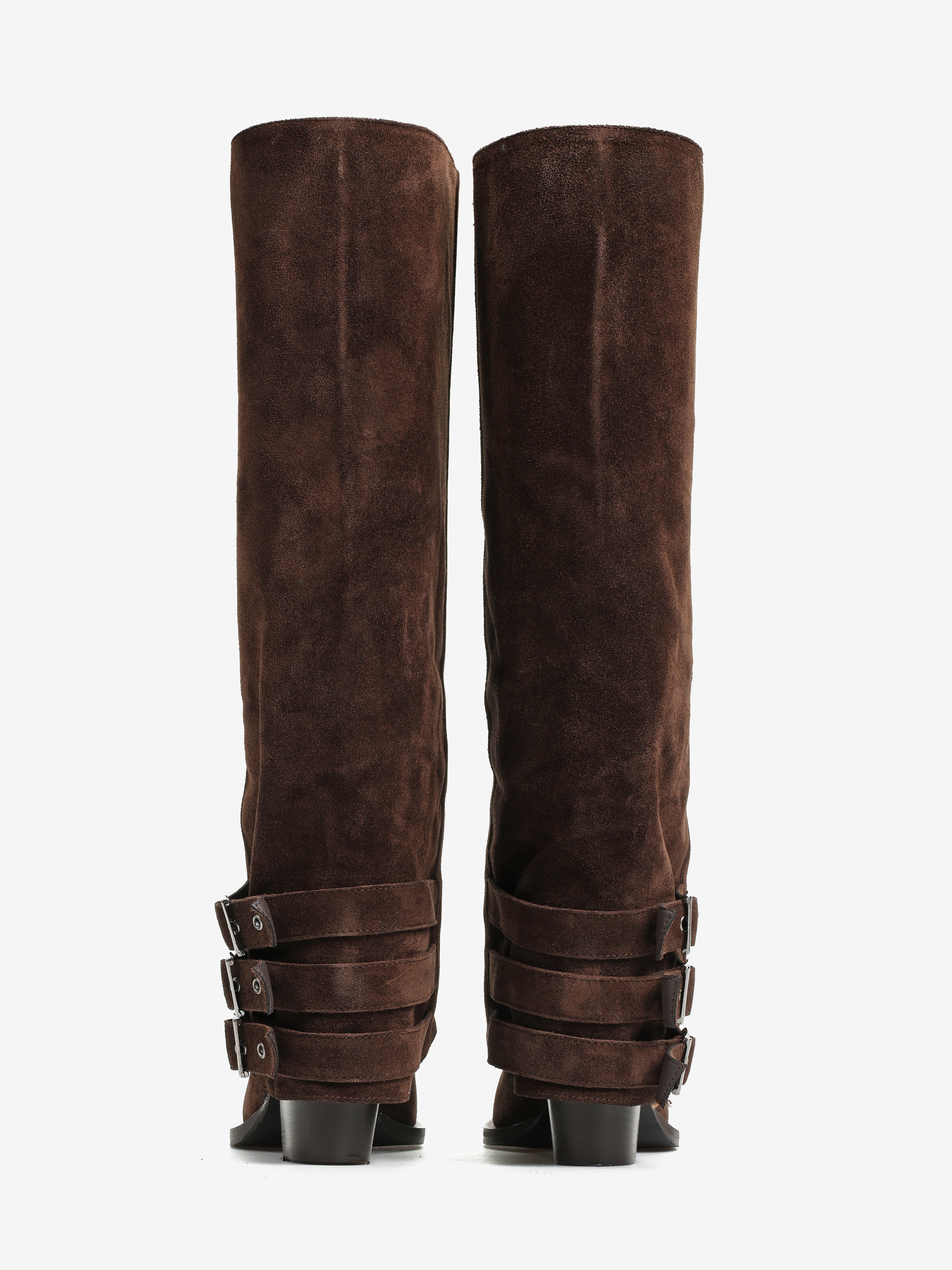 Zamszowe, wsuwane kowbojki z przedłużoną cholewą. Noski w szpic i ozdobne paski przy obcasie.