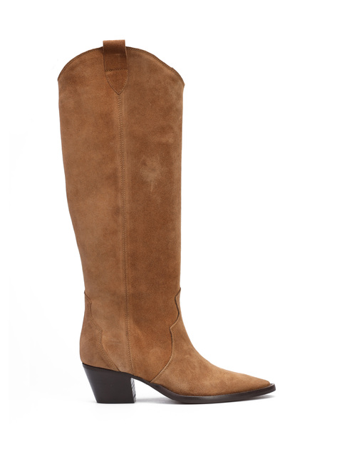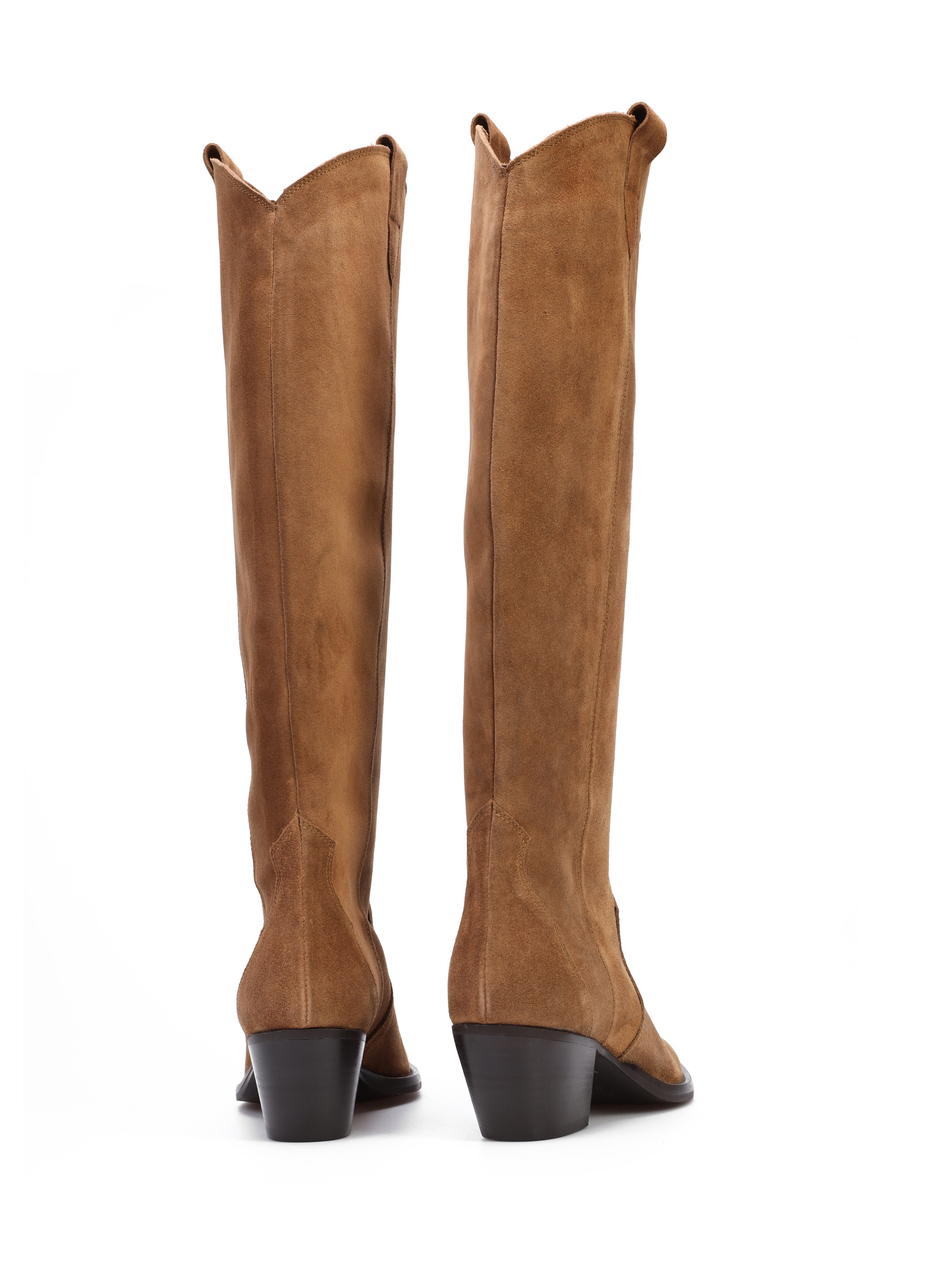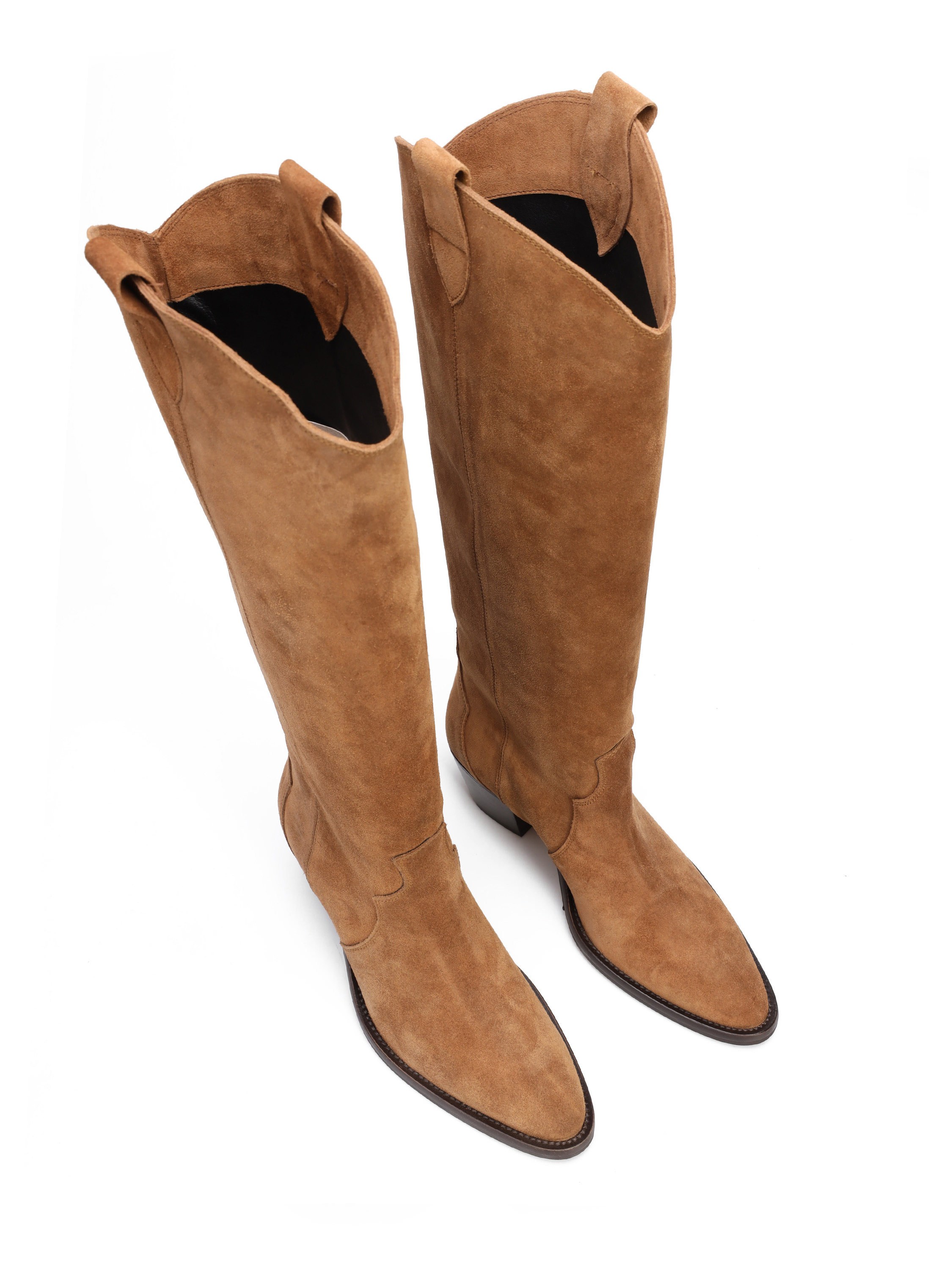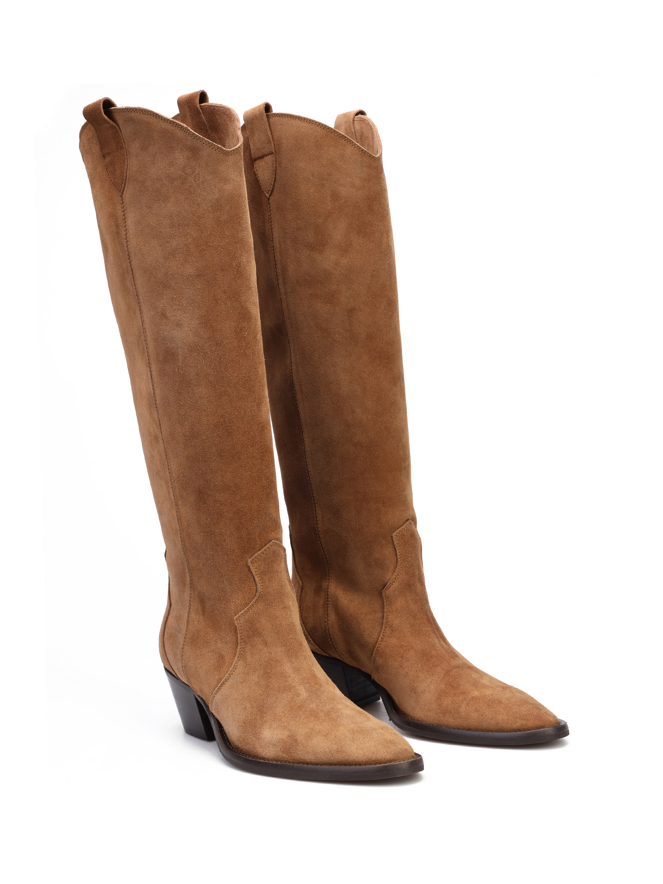 Wsuwane kowbojki to must have sezonu. Wysoka, szeroka cholewka w rudym kolorze wykonana jest z włoskiej, zamszowej skóry. Model z charakterystycznym ściętym obcasem na słupku oraz noskiem w szpic.