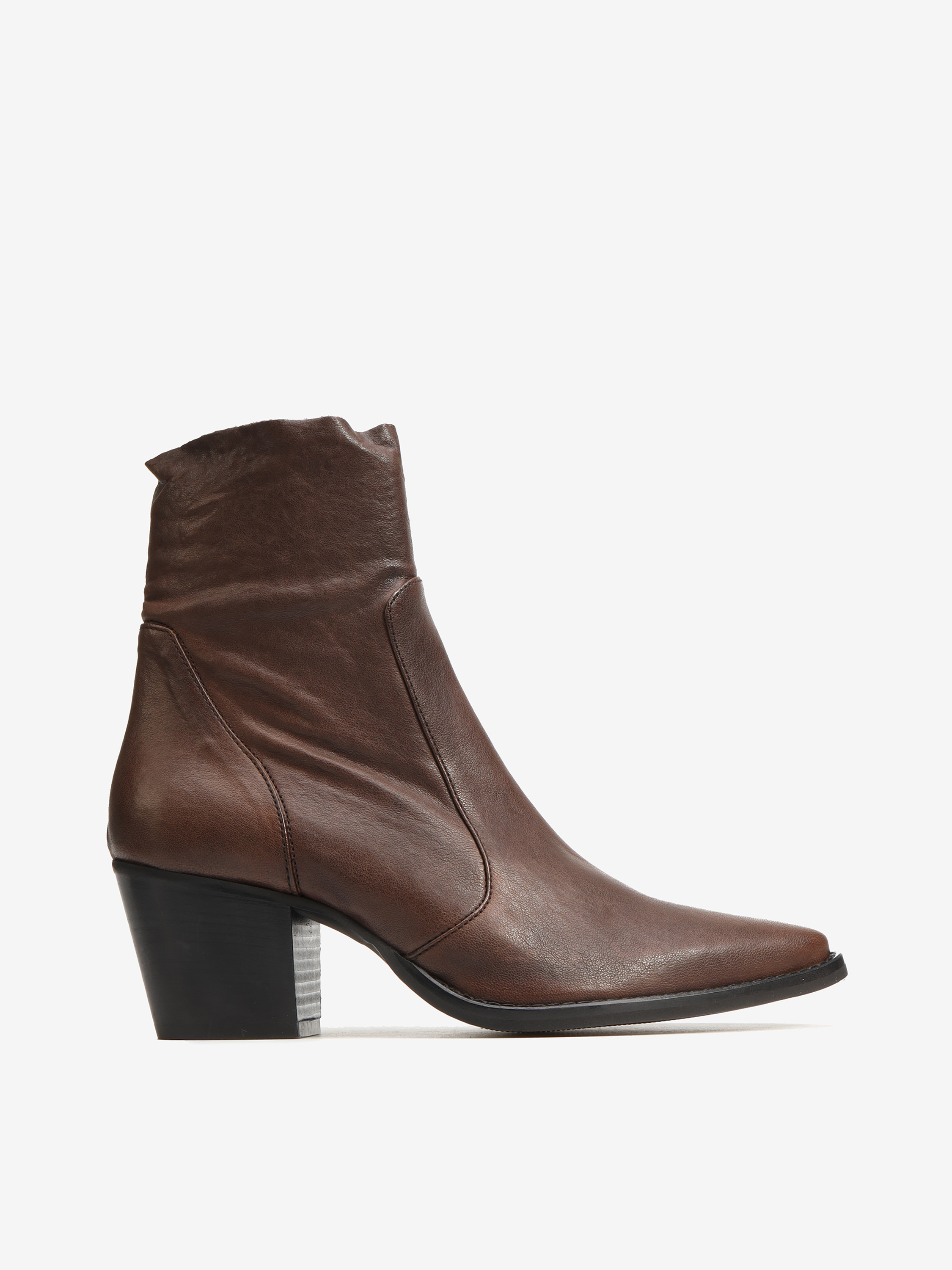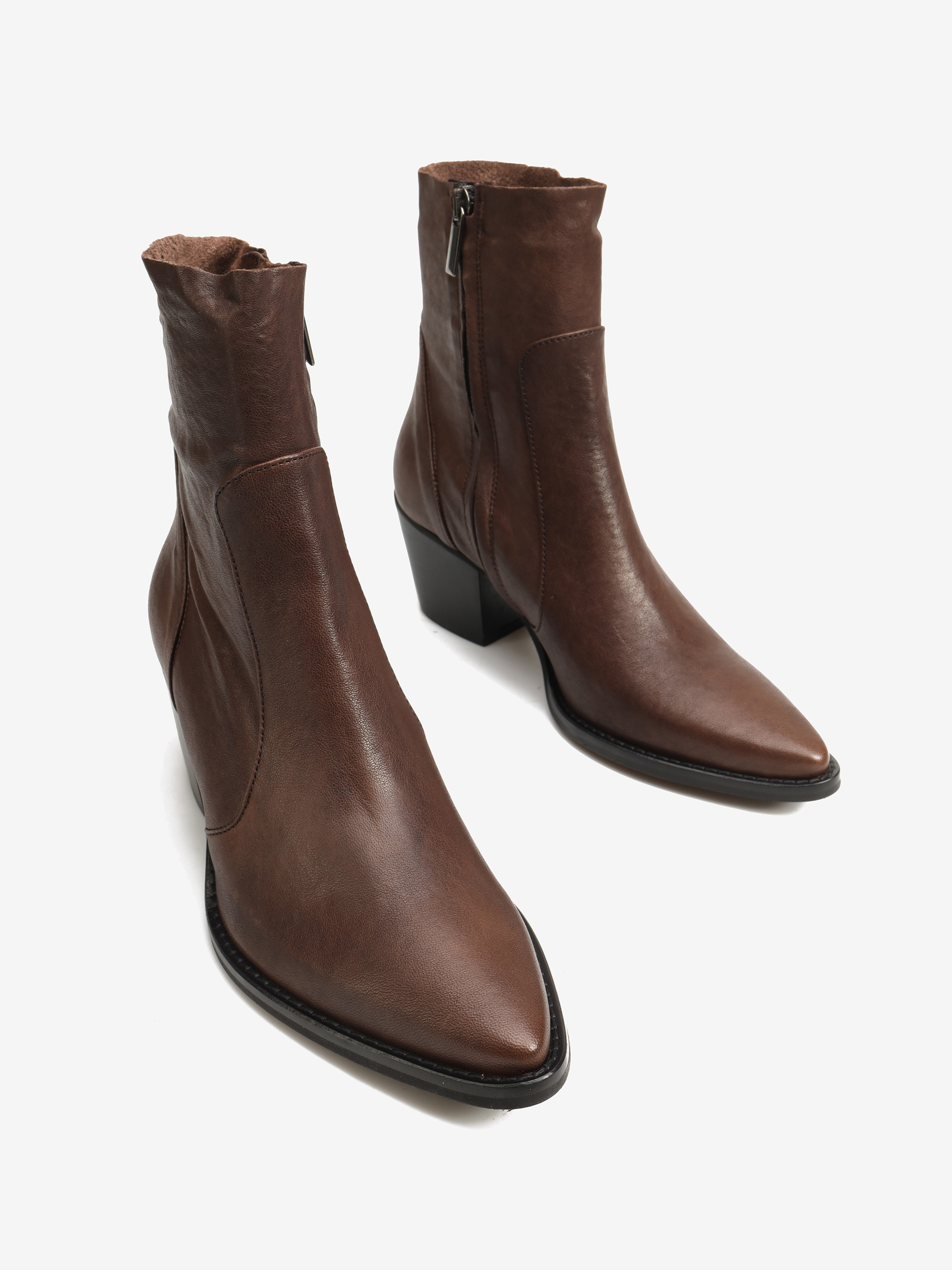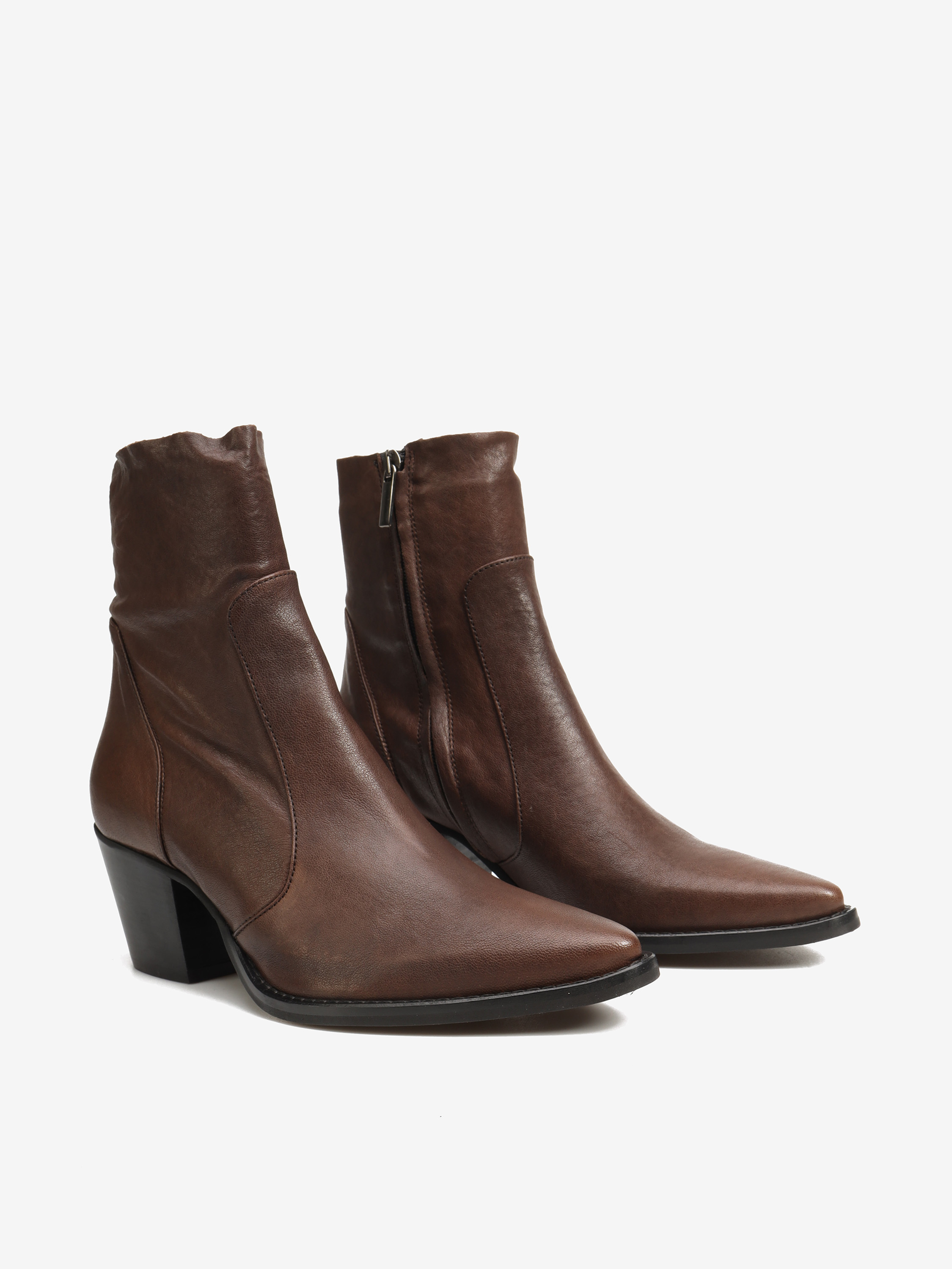 Kowbojki na wysokim obcasie. Skórzane przeszycia i zapinanie na zamek.