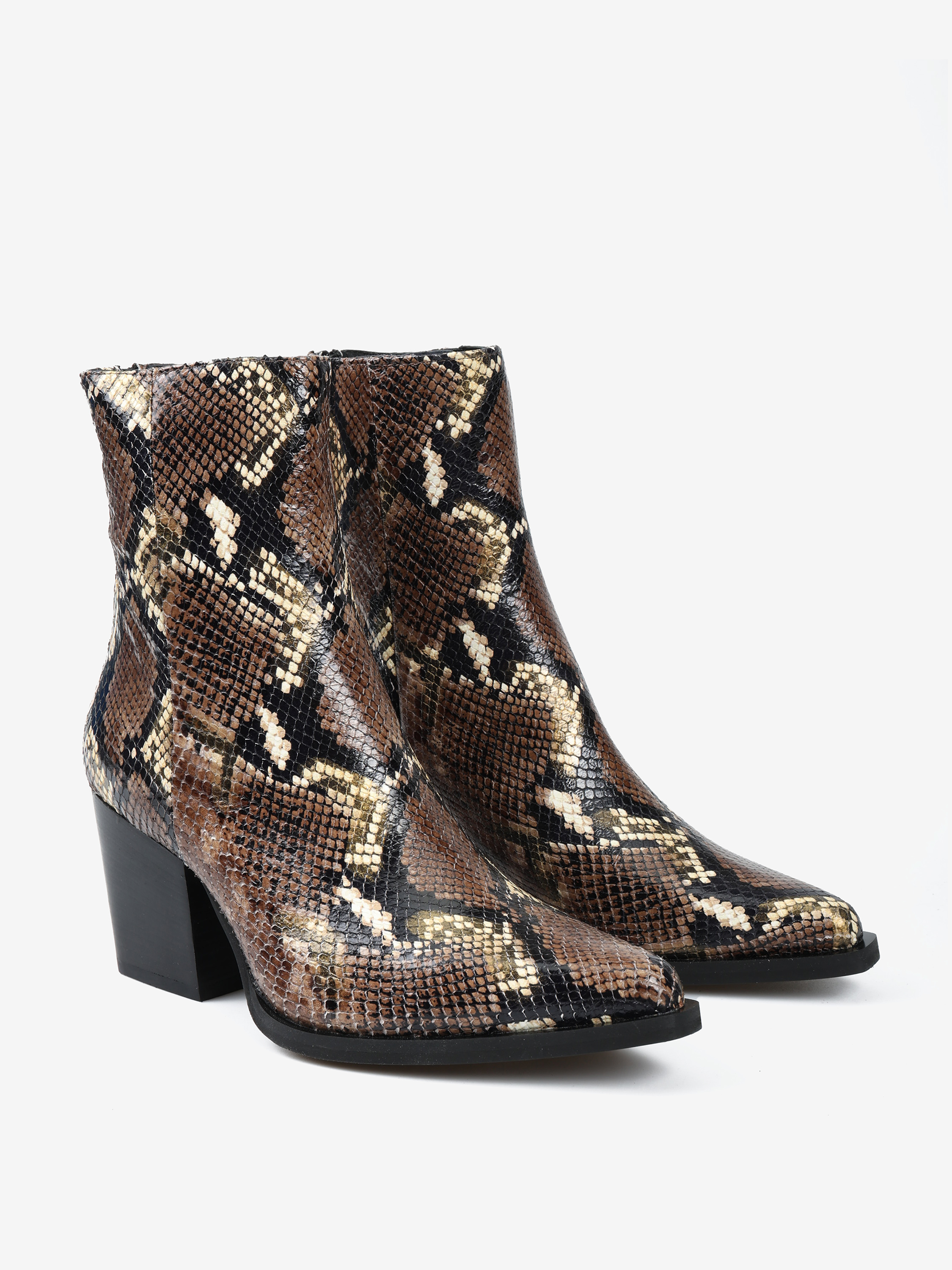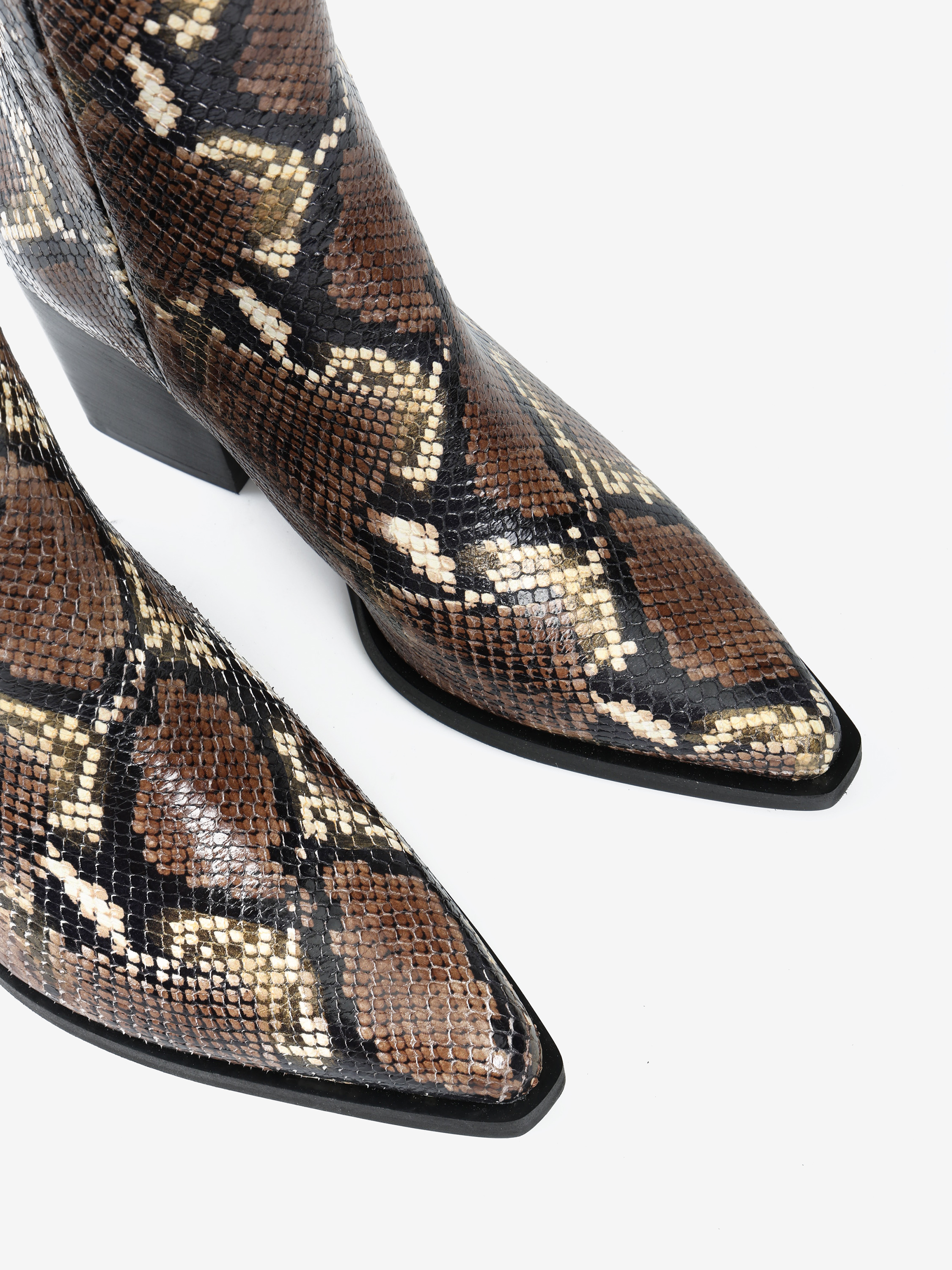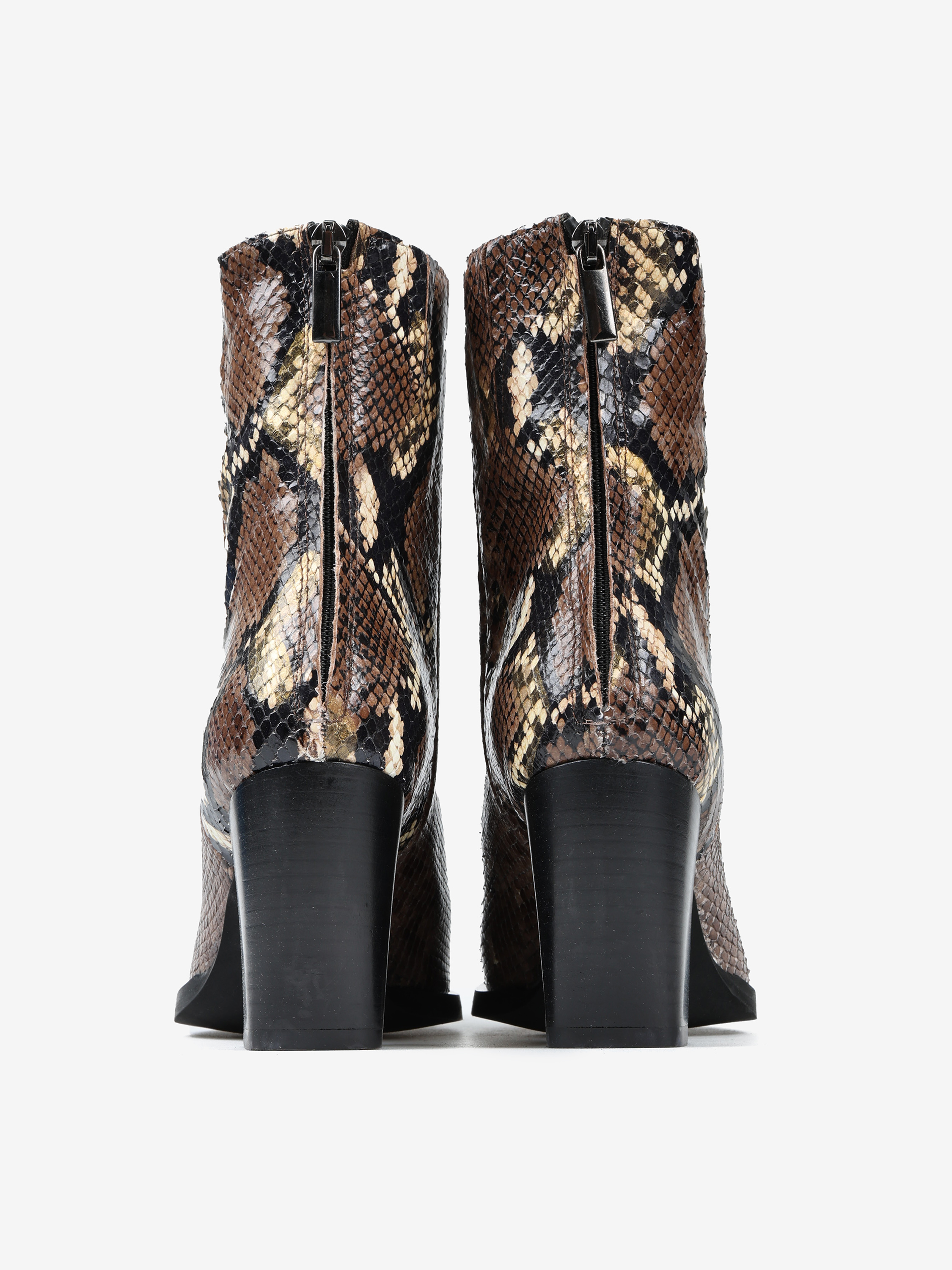 Kowbojki na wysokim obcasie z zapięciem na suwak. Wykonane z naturalnej skóry w wężowy wzór.