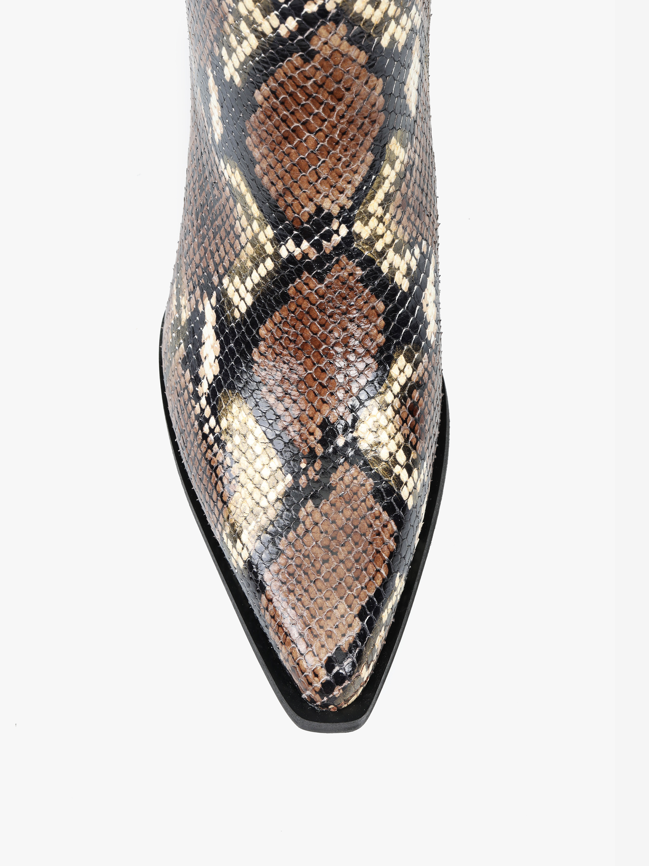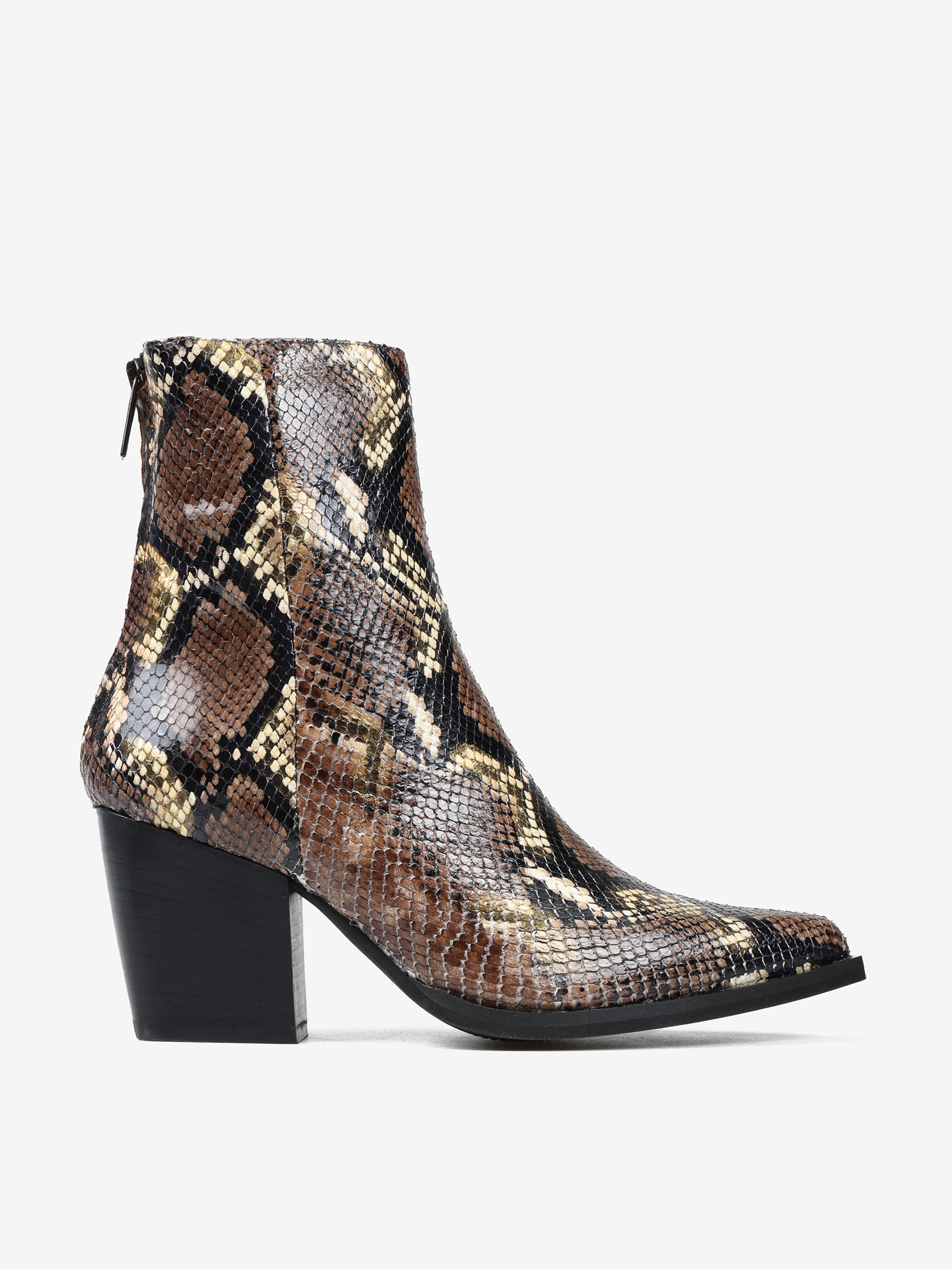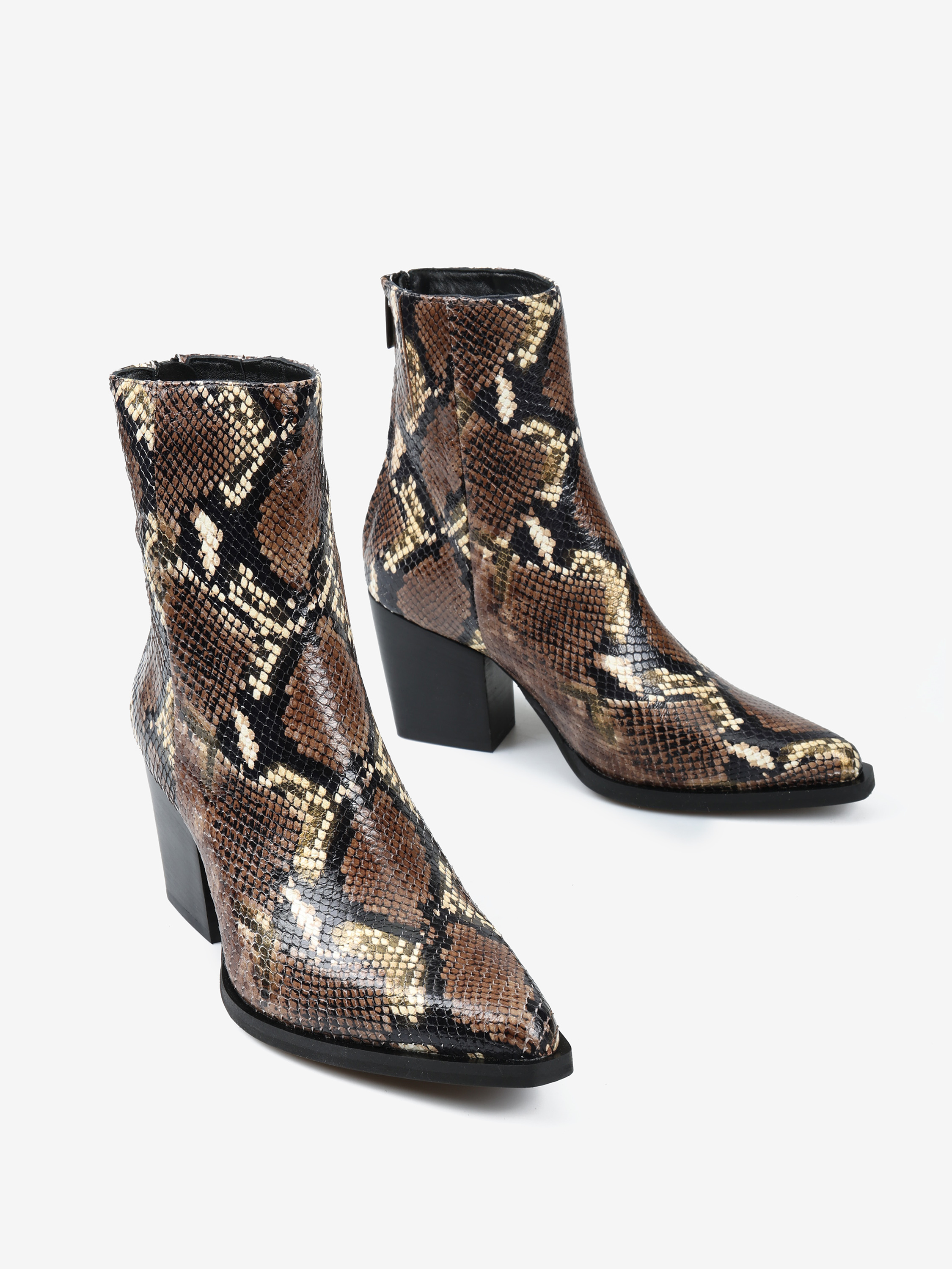 Kowbojki na wysokim obcasie z zapięciem na suwak. Wykonane z naturalnej skóry w wężowy wzór.