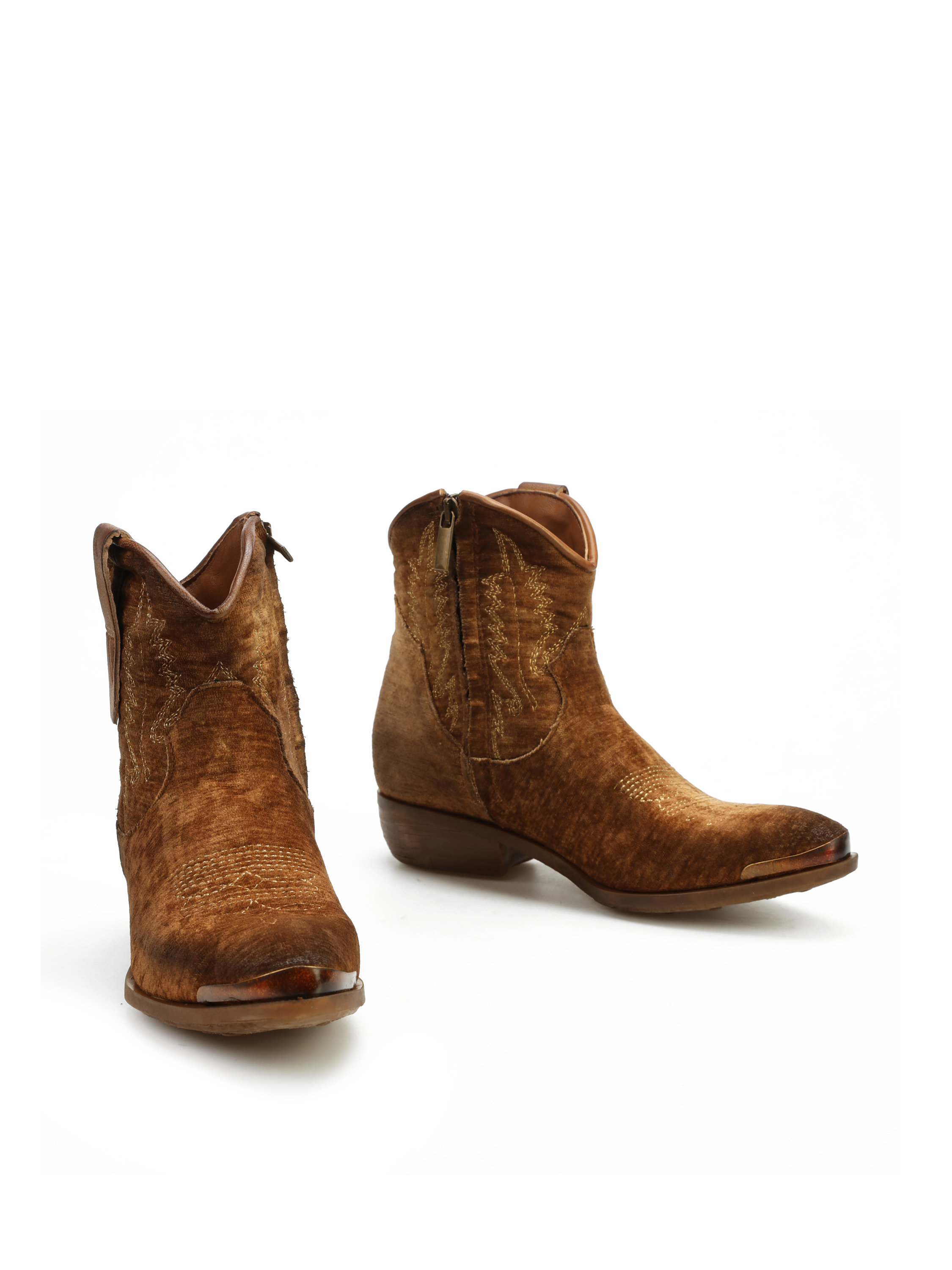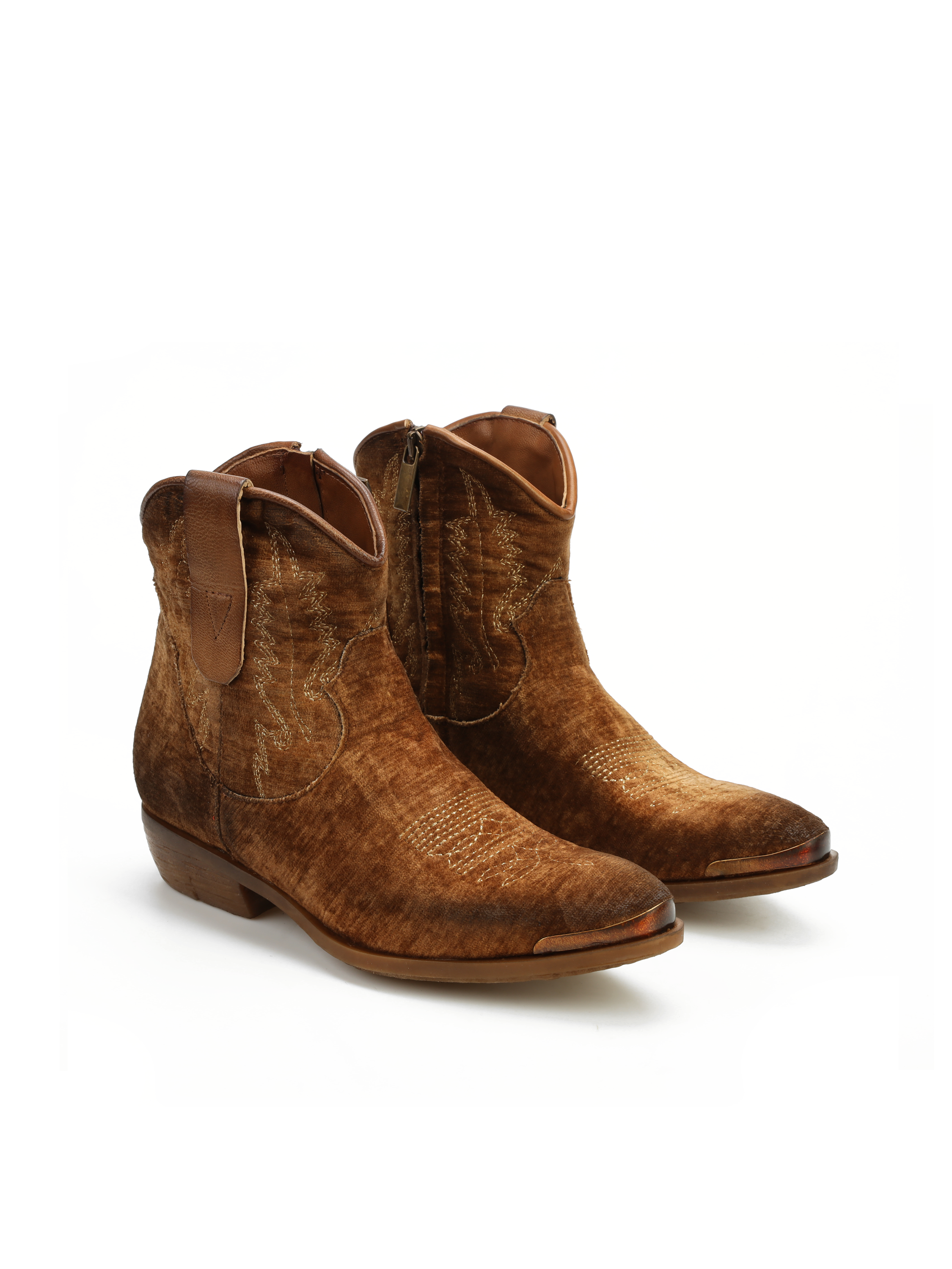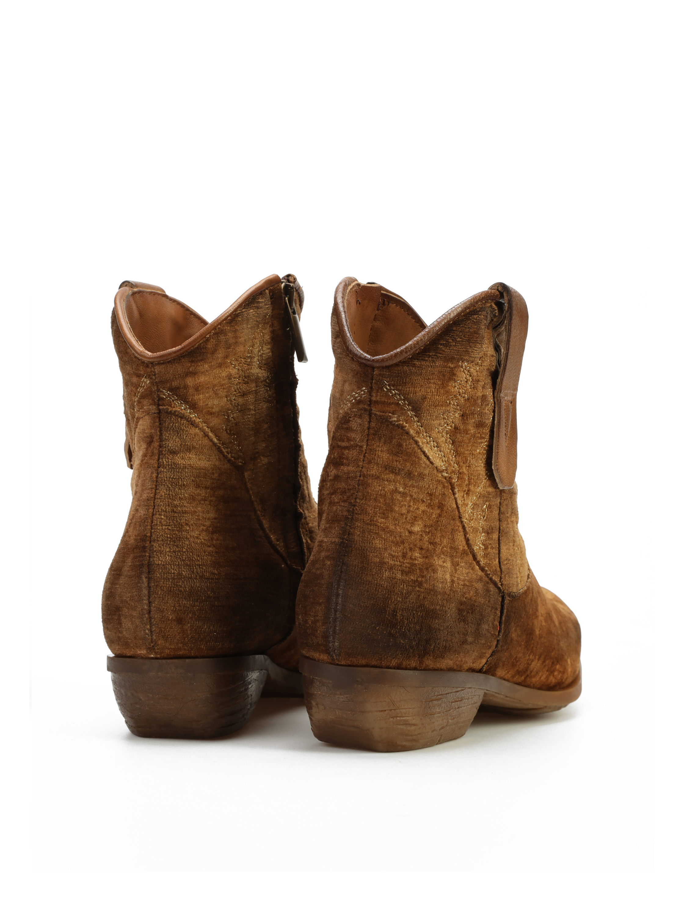 Krótkie kowbojki to gorący Trend sezonu. Cholewka za kostkę w rudym kolorze wykonana jest z weluru. Wnętrze buta to skóra naturalna. Charakterystyczny dla tego fasonu ścięty obcas i nosek w szpic wyróżniają ten model. Ukryty zamek błyskawiczny ułatwia zakładanie obuwia.