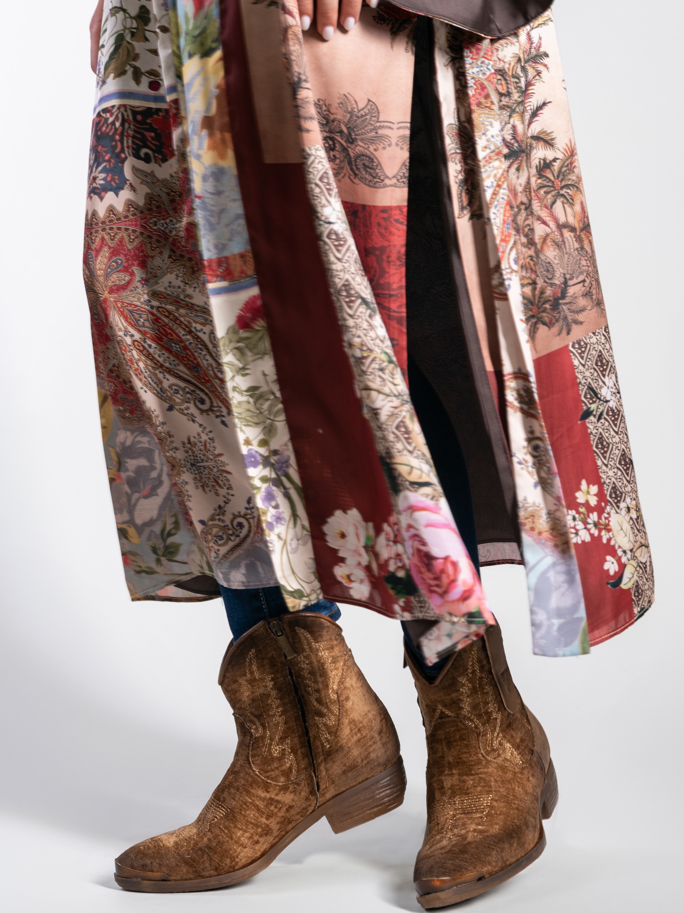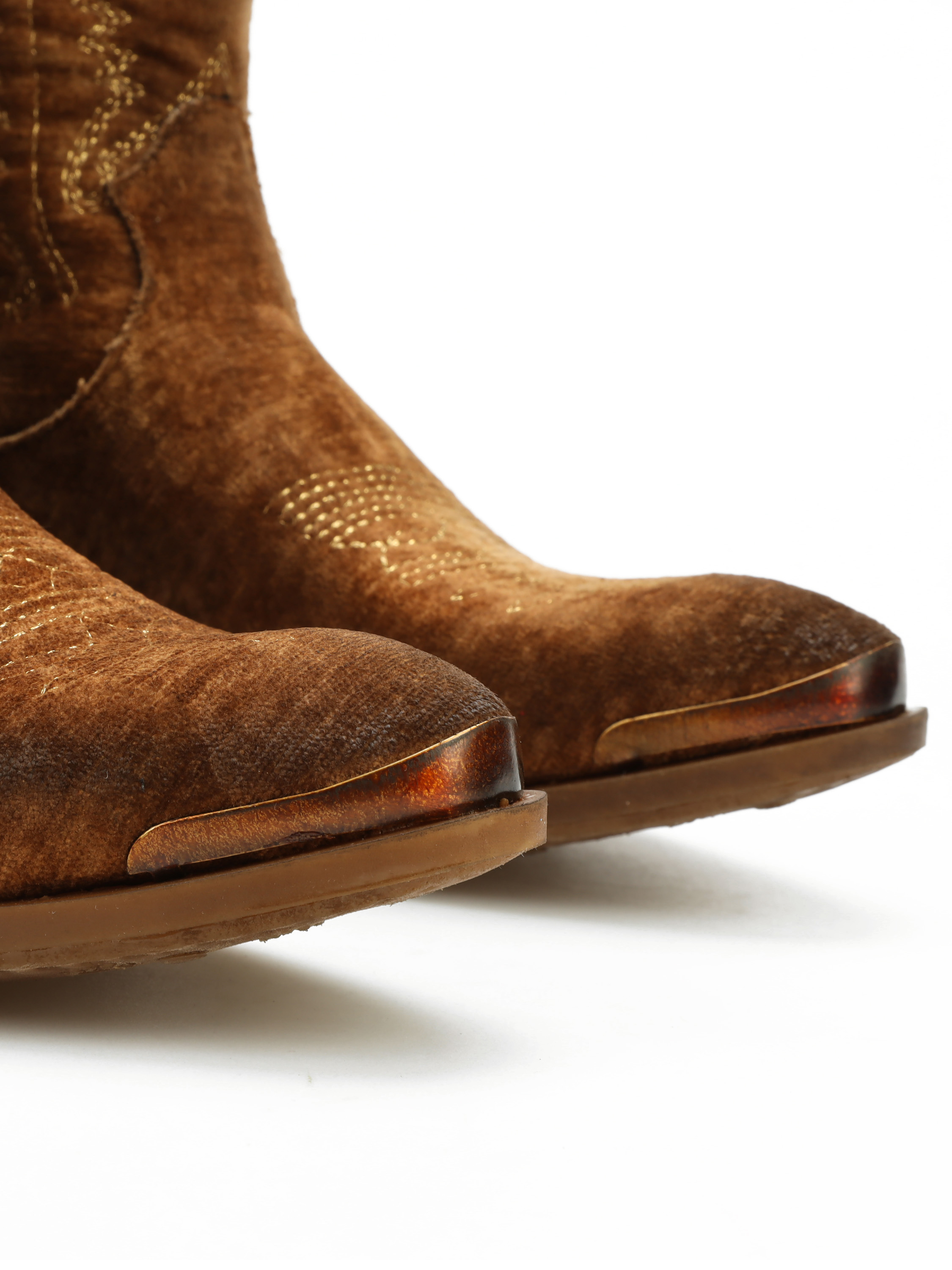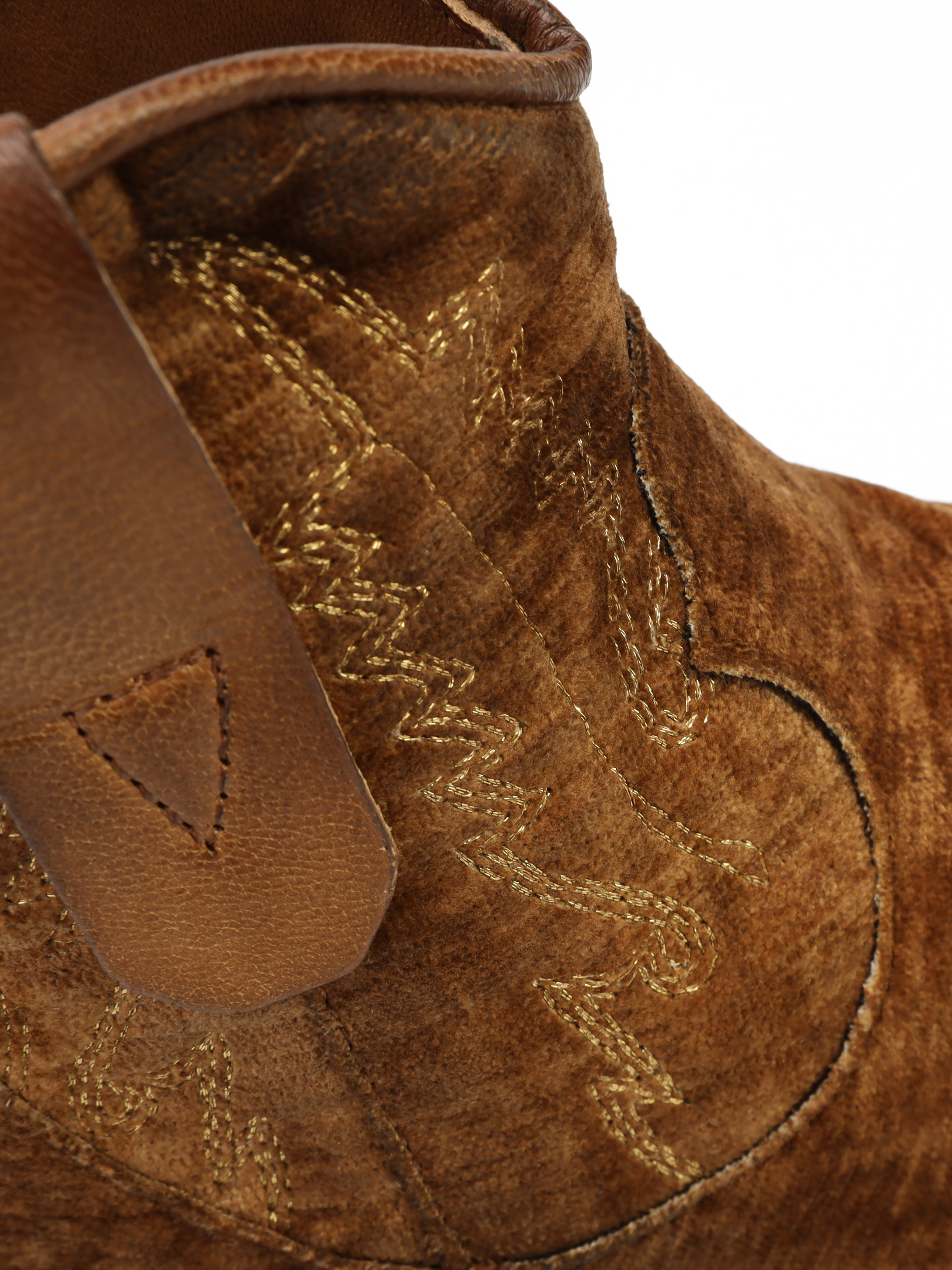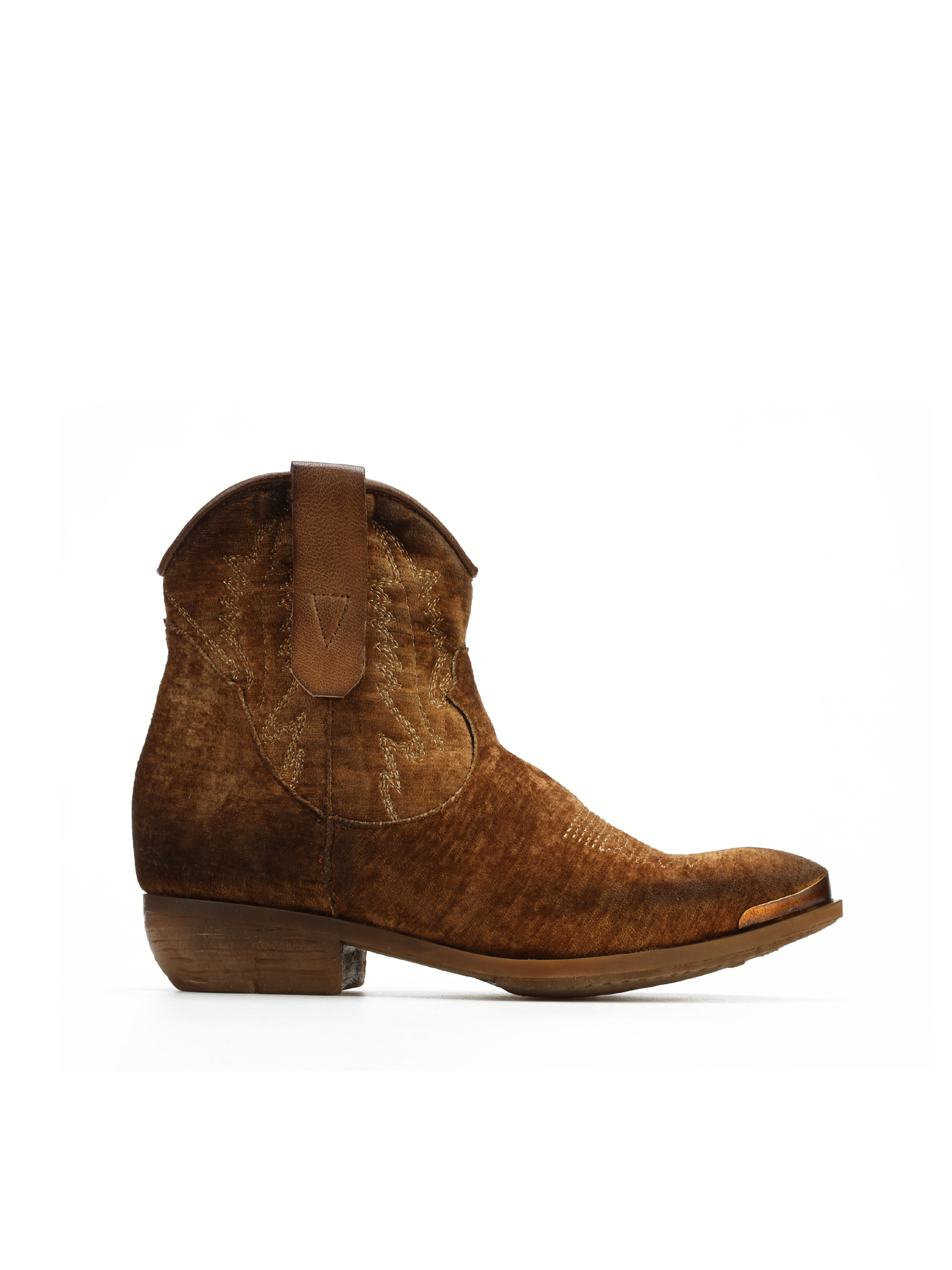 Krótkie kowbojki to gorący Trend sezonu. Cholewka za kostkę w rudym kolorze wykonana jest z weluru. Wnętrze buta to skóra naturalna. Charakterystyczny dla tego fasonu ścięty obcas i nosek w szpic wyróżniają ten model. Ukryty zamek błyskawiczny ułatwia zakładanie obuwia.