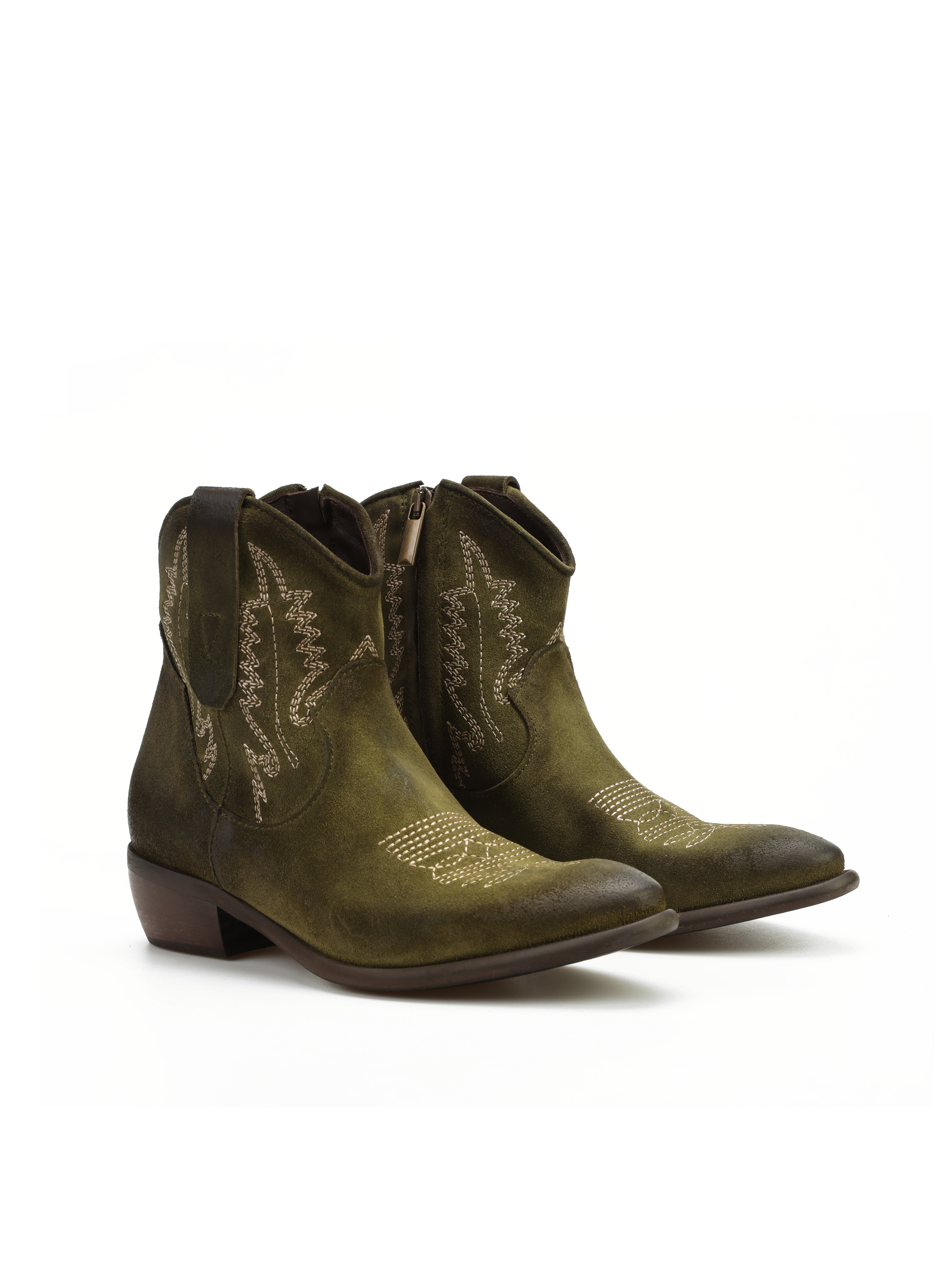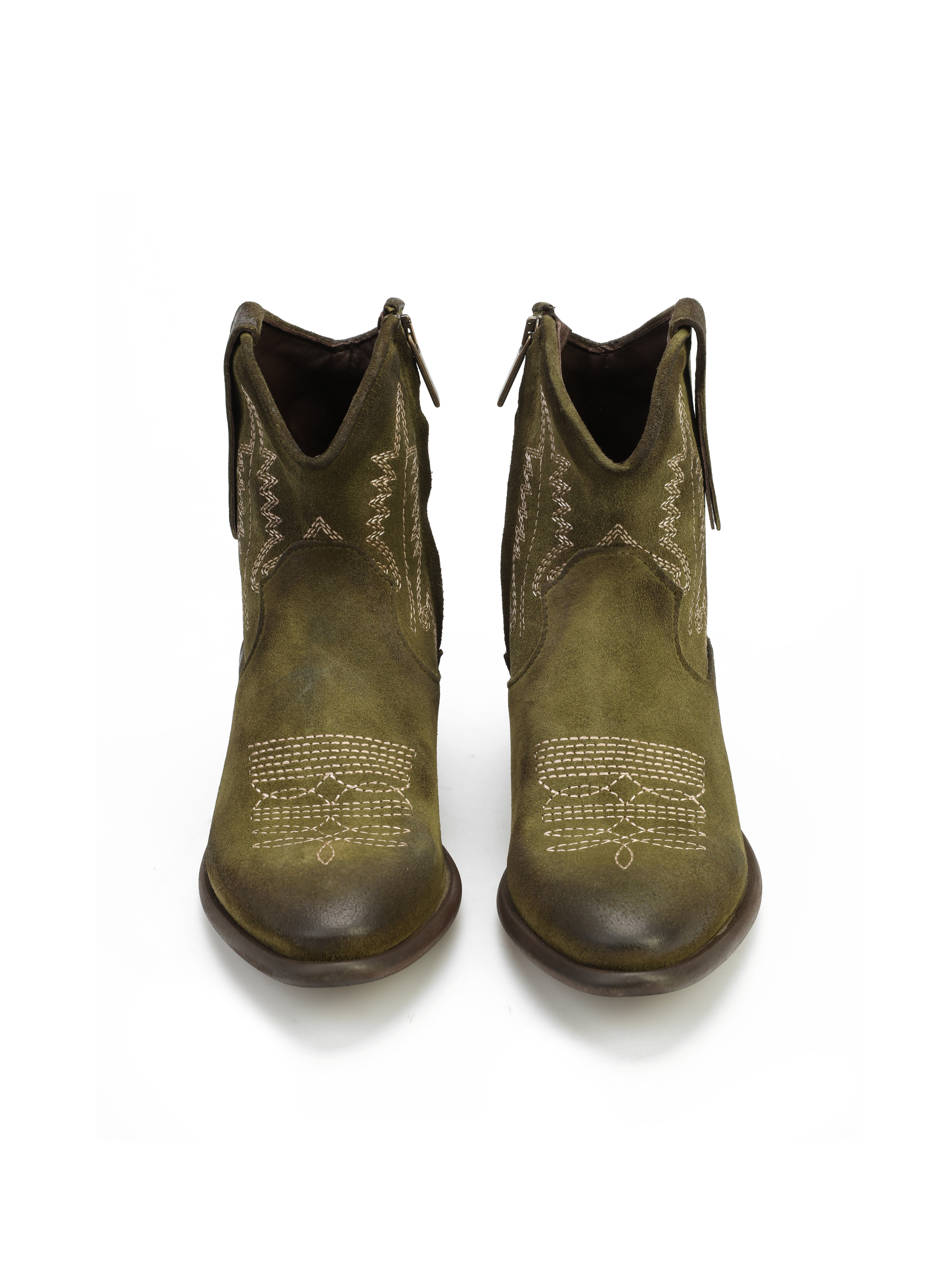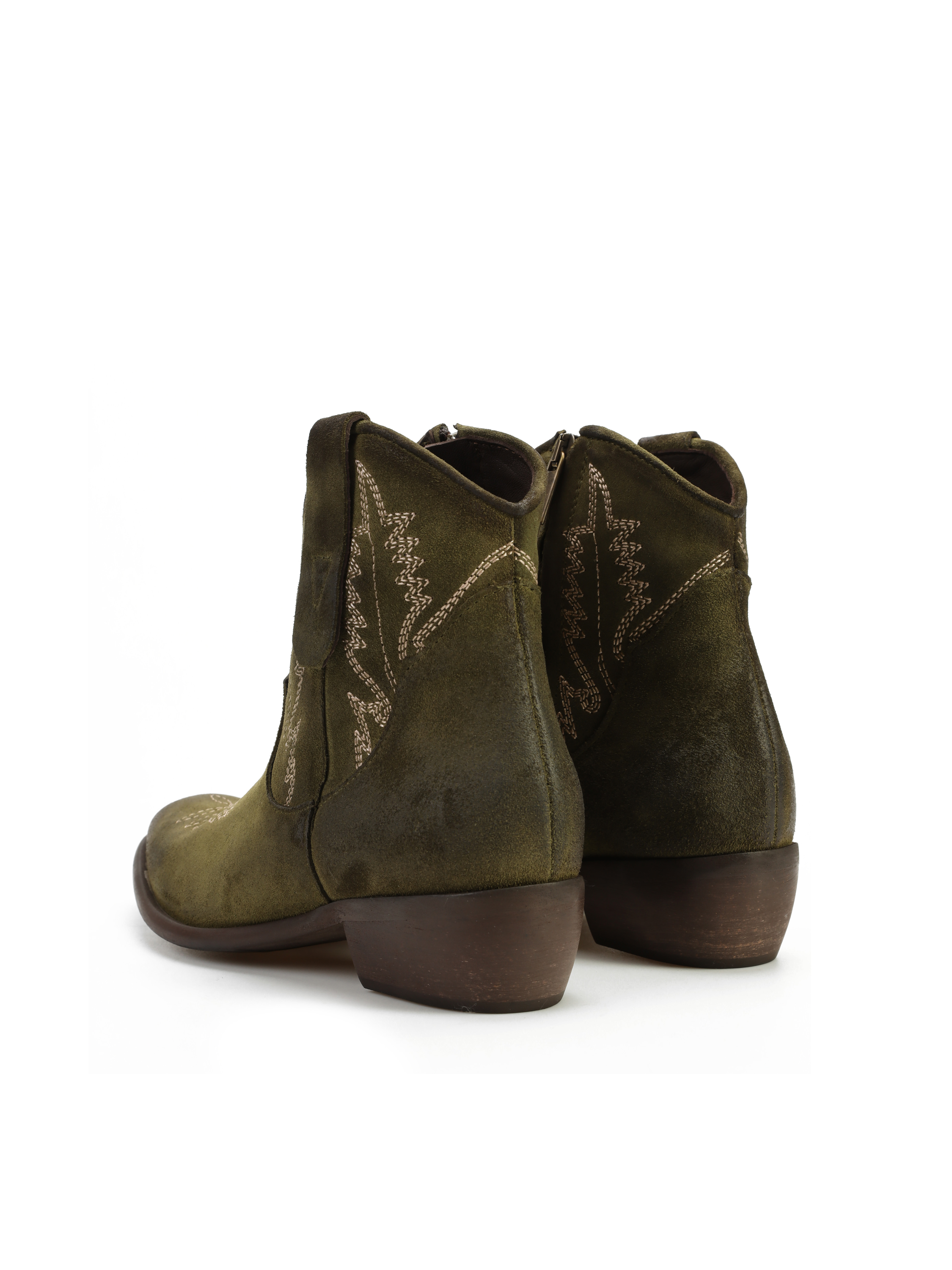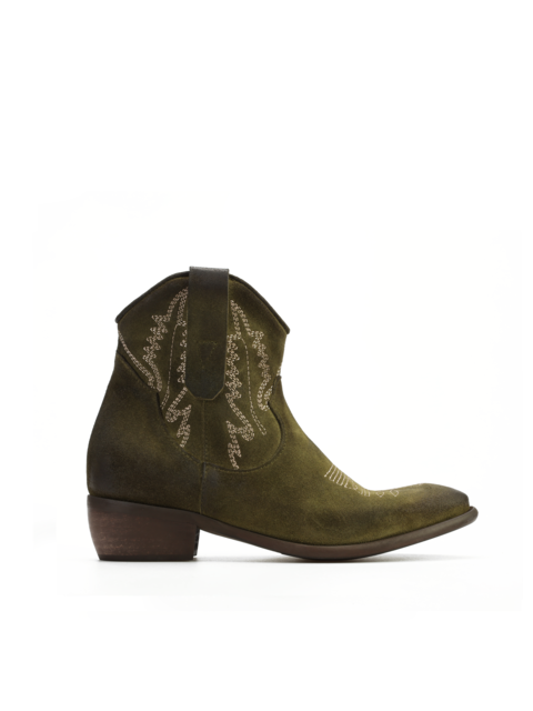 Krótkie zamszowe kowbojki to gorący Trend sezonu. Cholewka za kostkę w kolorze khaki wykonana jest z naturalnej skóry zamszowej. Charakterystyczny dla tego fasonu ścięty obcas i nosek w szpic wyróżniają ten model. Ukryty zamek błyskawiczny ułatwia zakładanie obuwia.