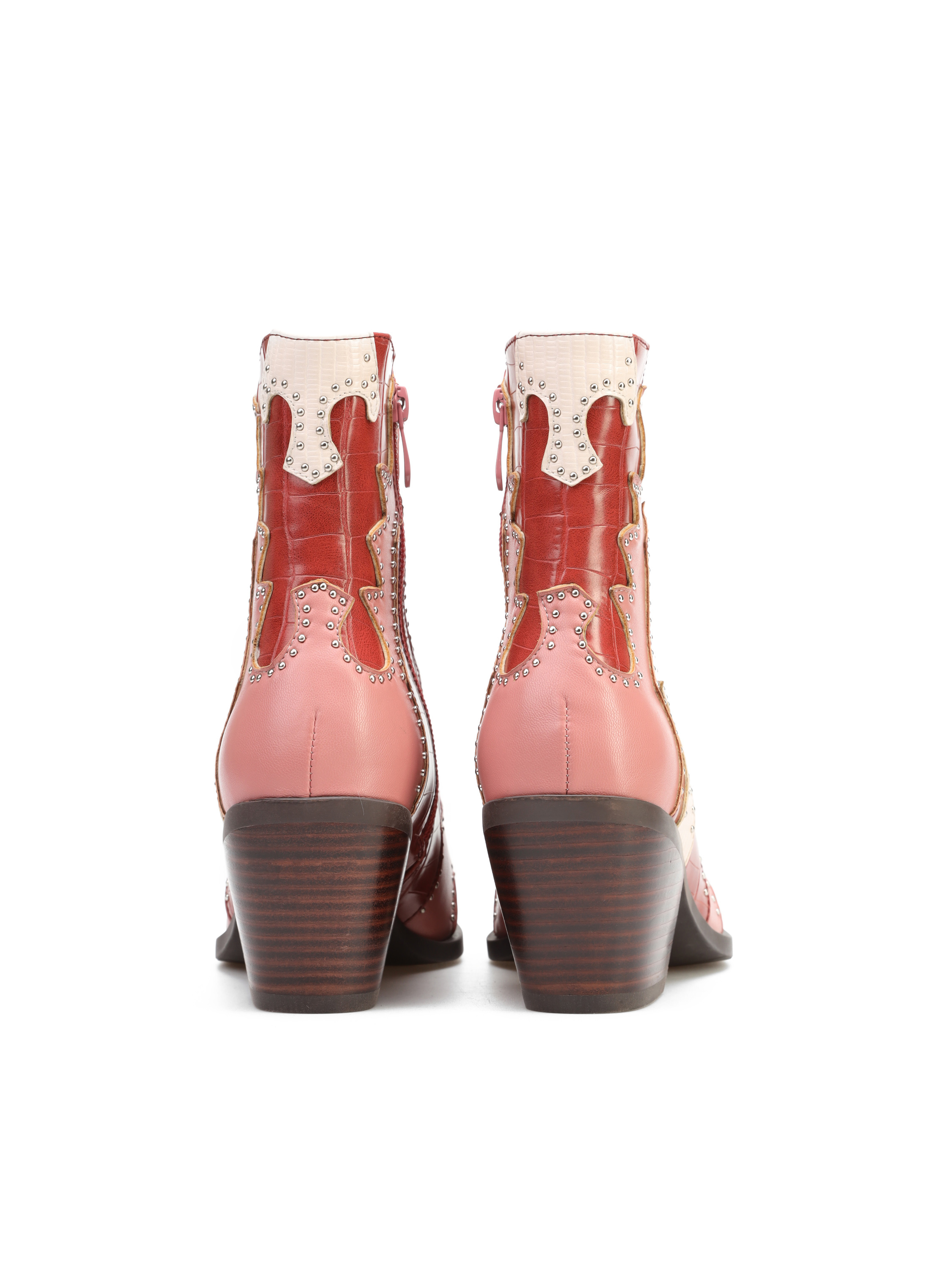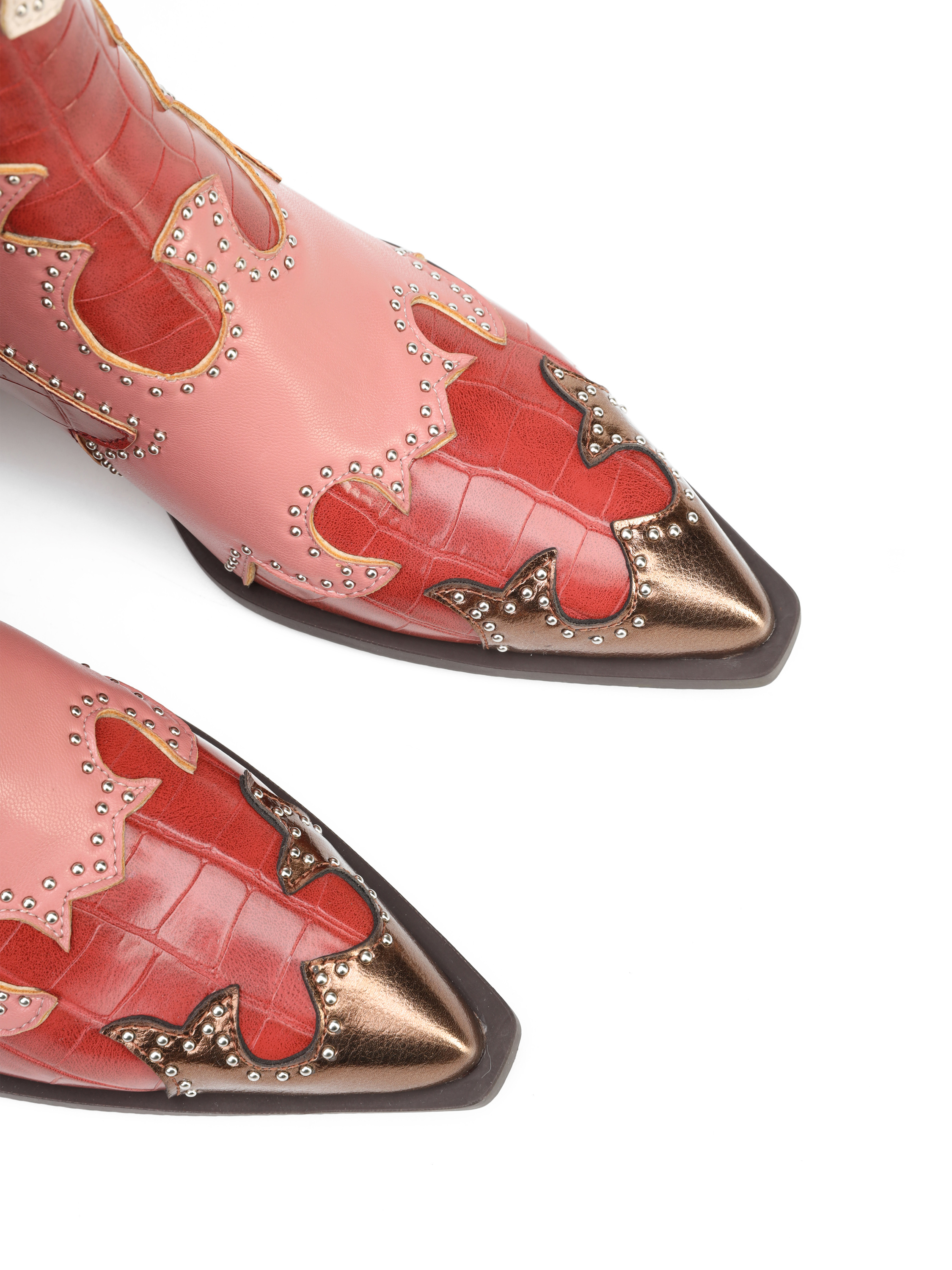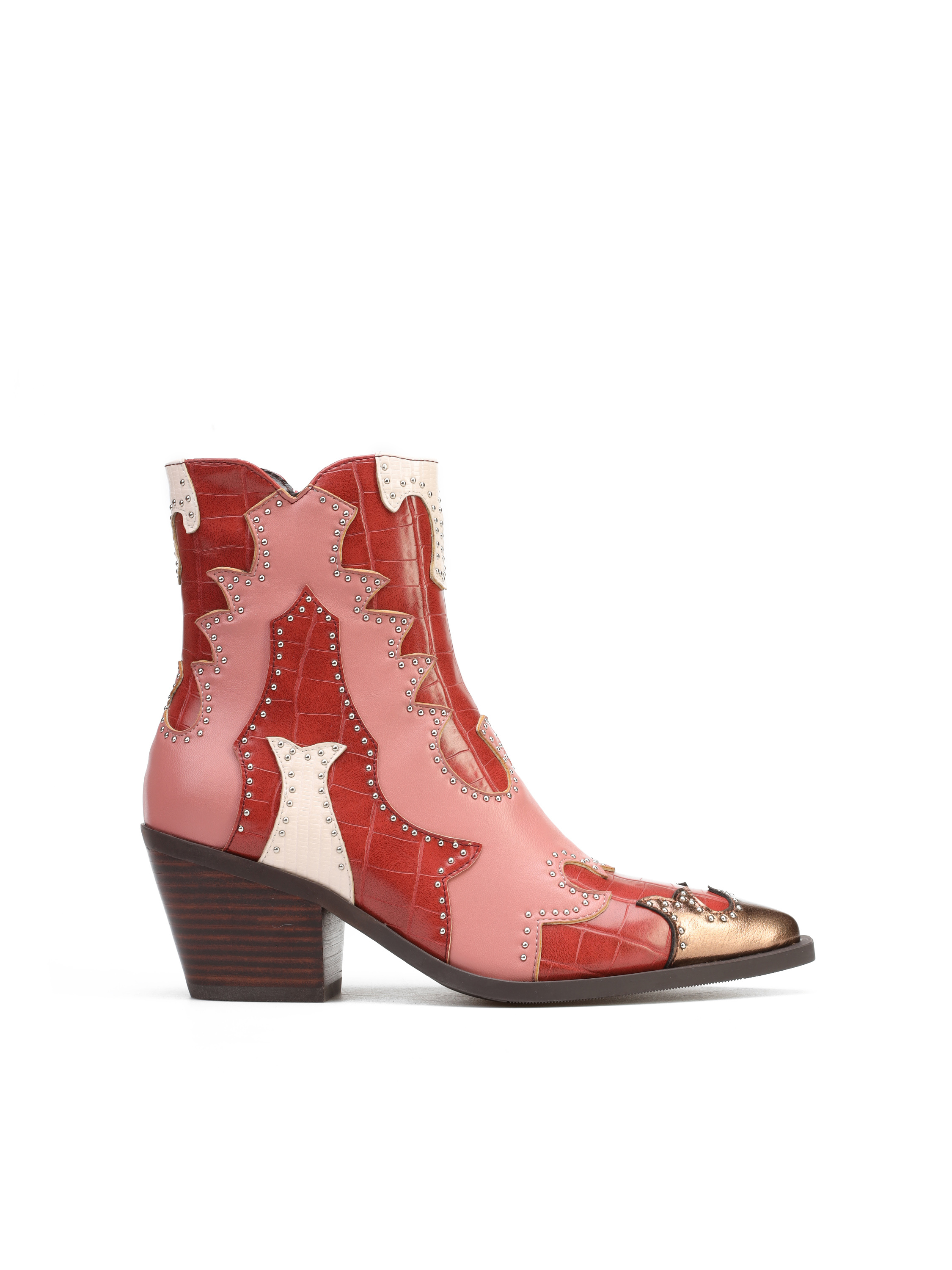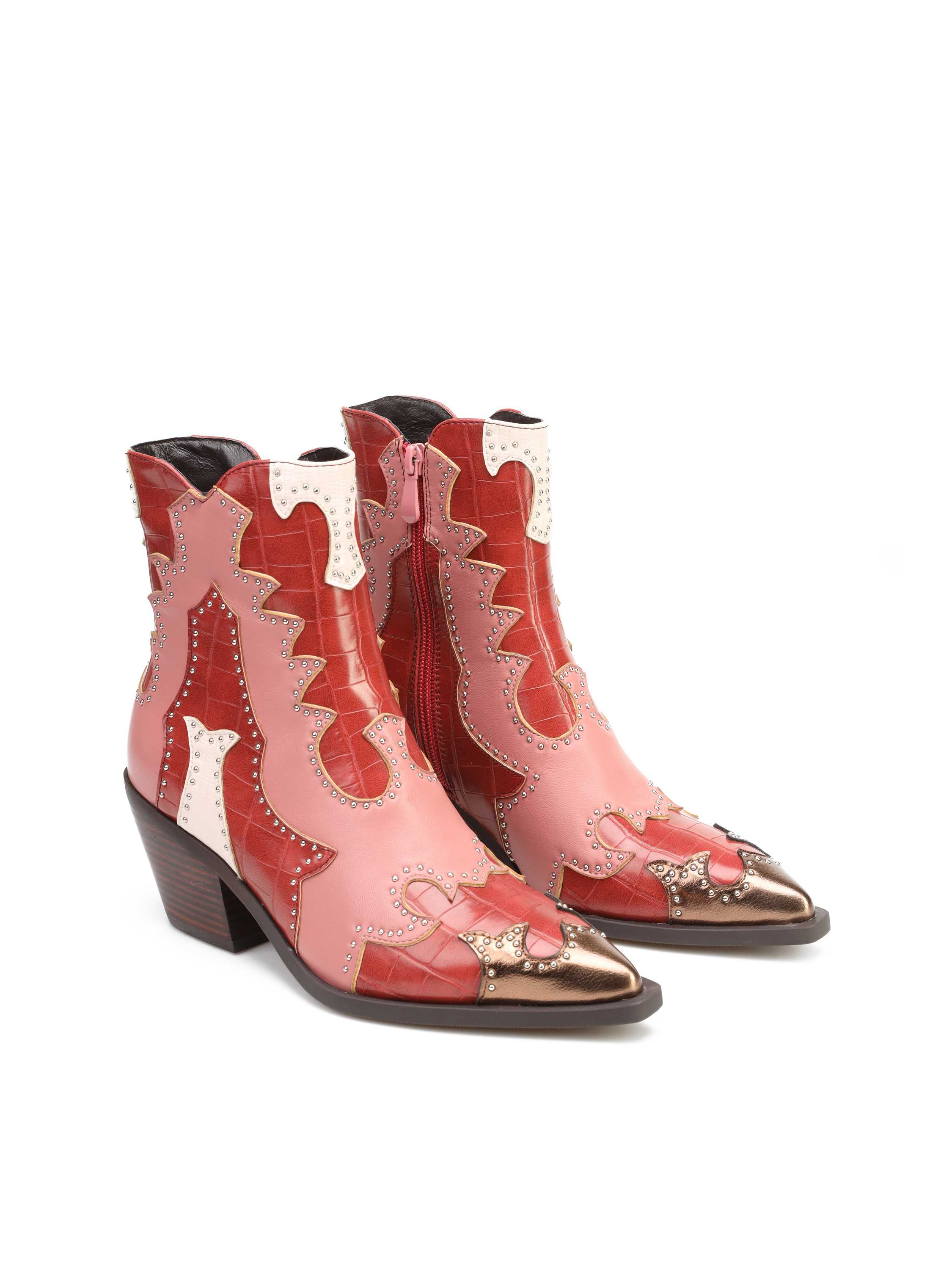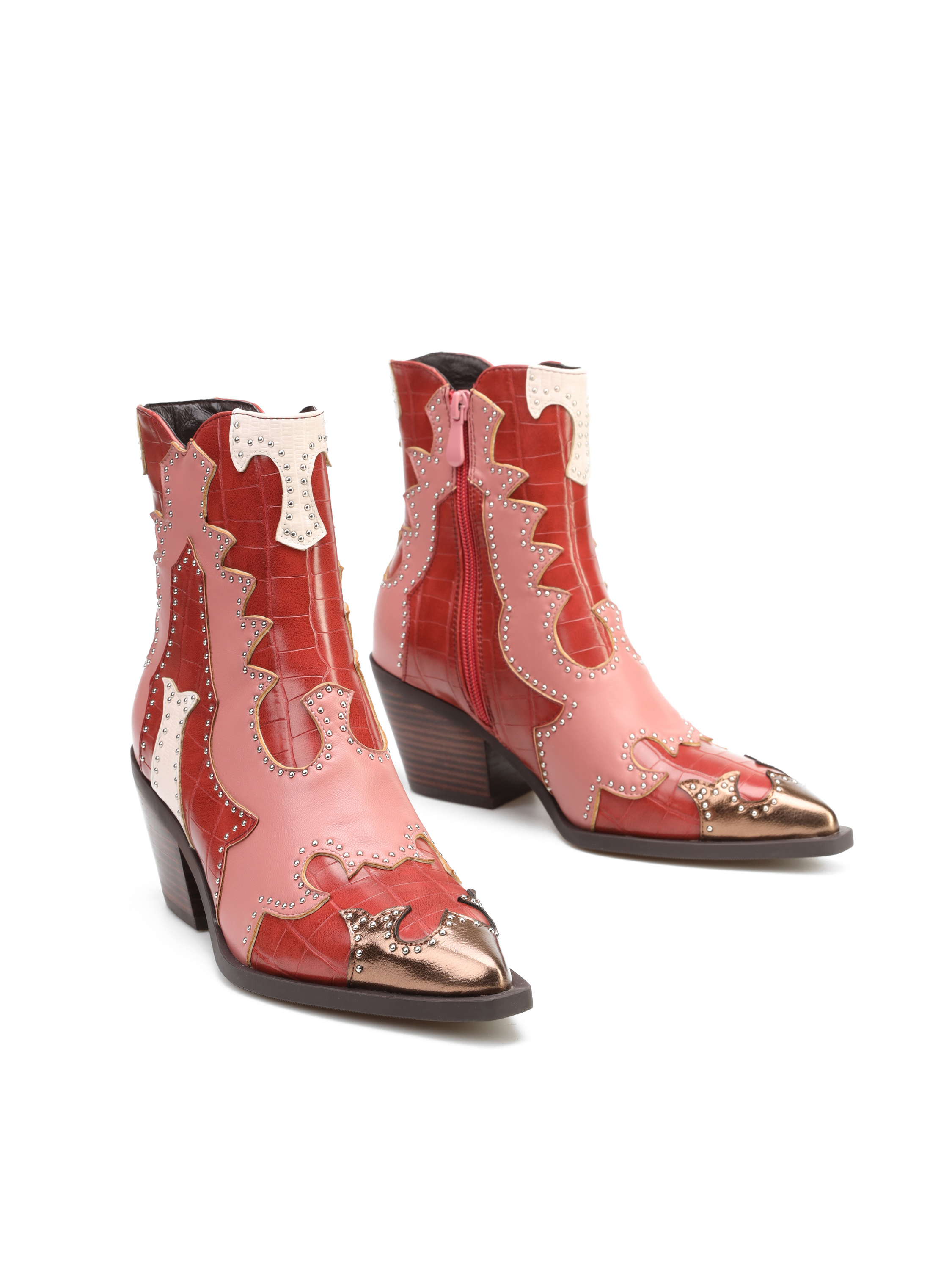 Krótkie kowbojki to must have sezonu. Cholewka z łączonych faktur i kolorów uzupełniona została o srebrne dżety. Posiada zamek błyskawiczny. Fason z noskiem w szpic oraz ściętym obcasem charakterystycznym dla tego modelu.