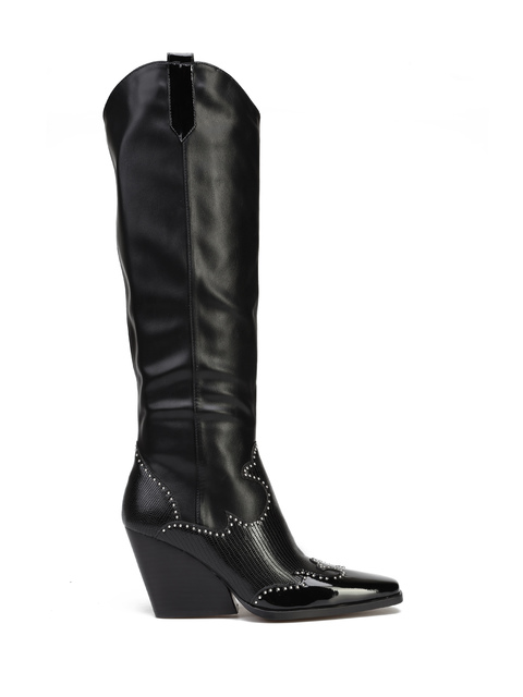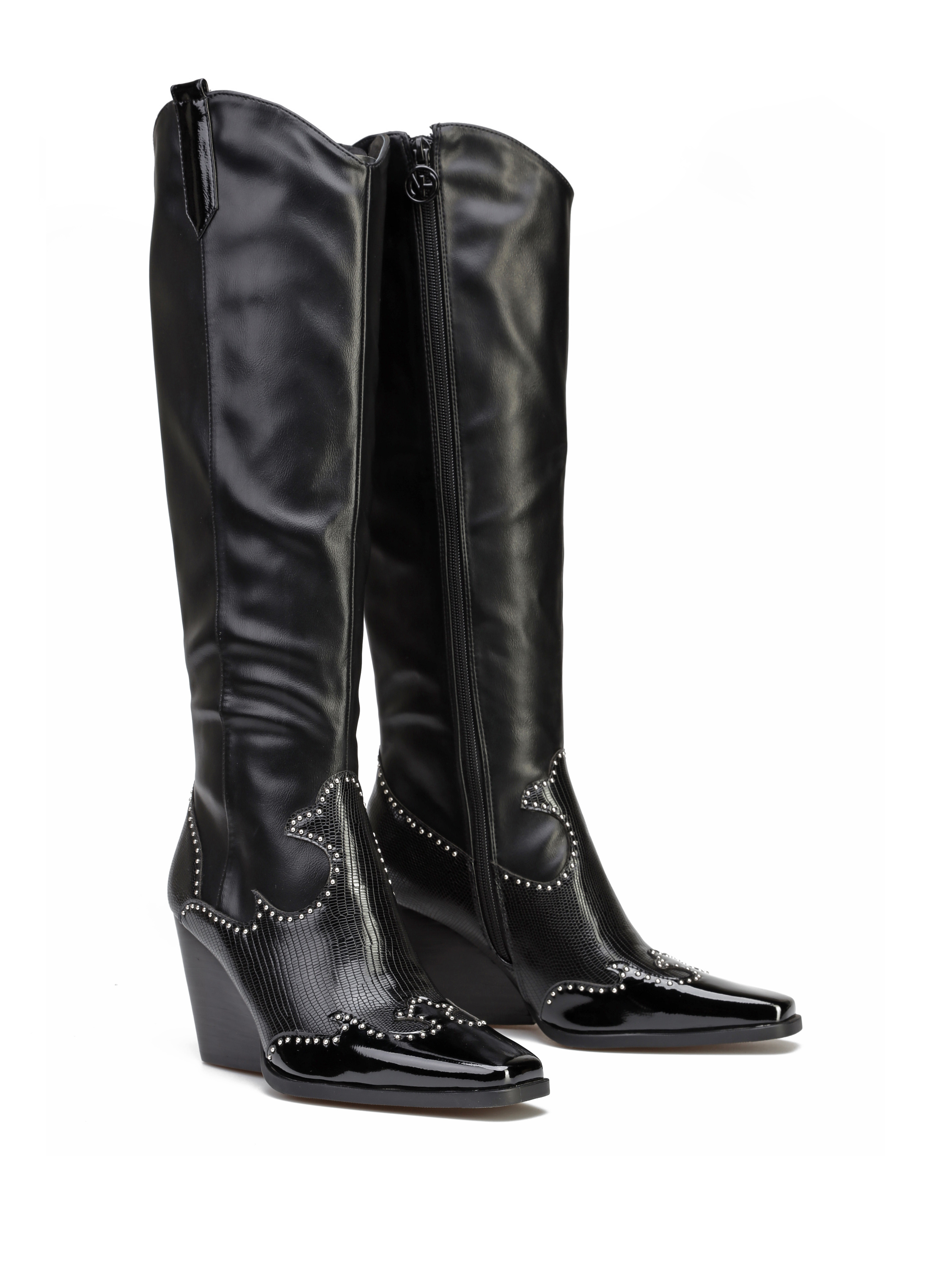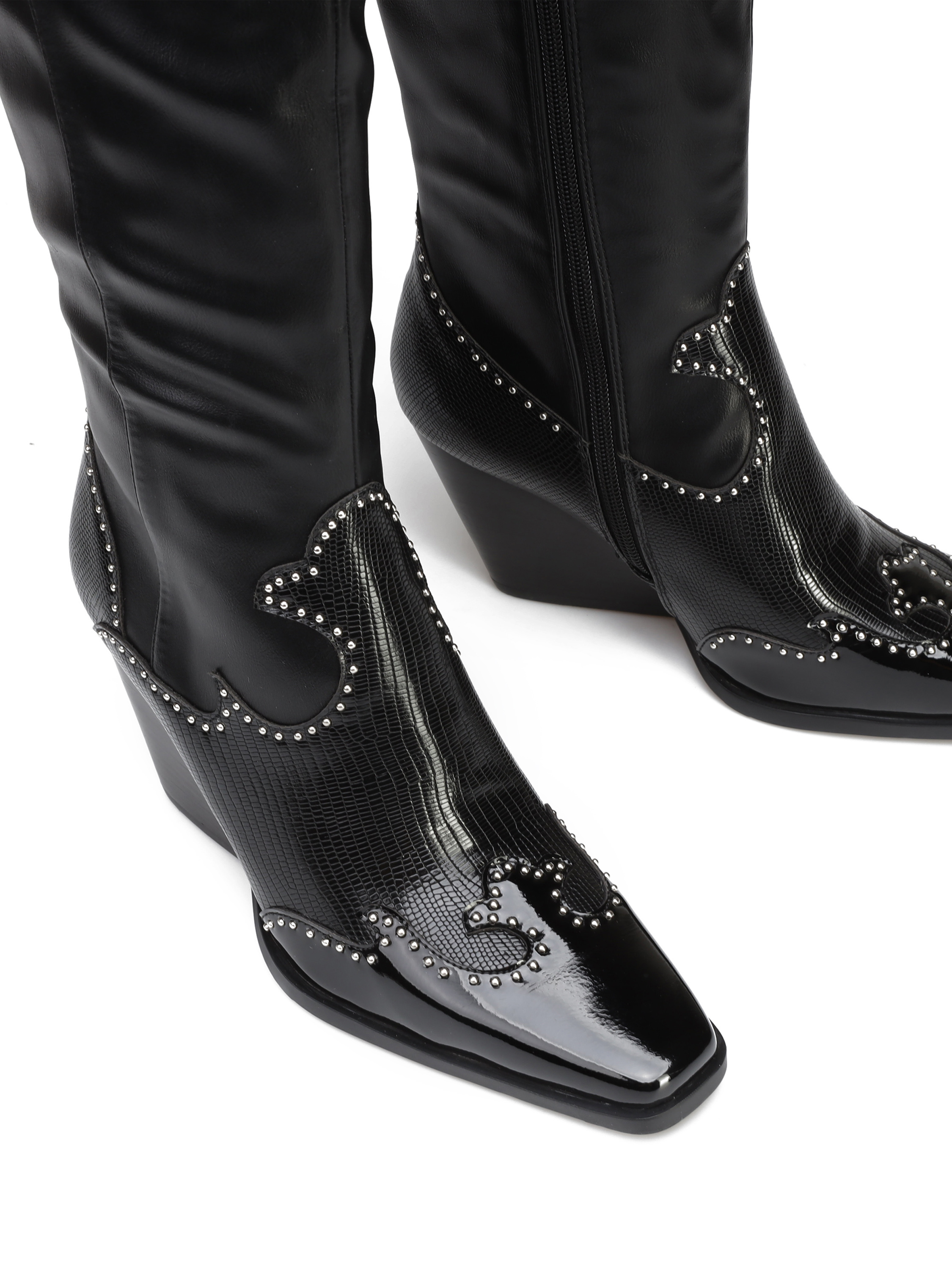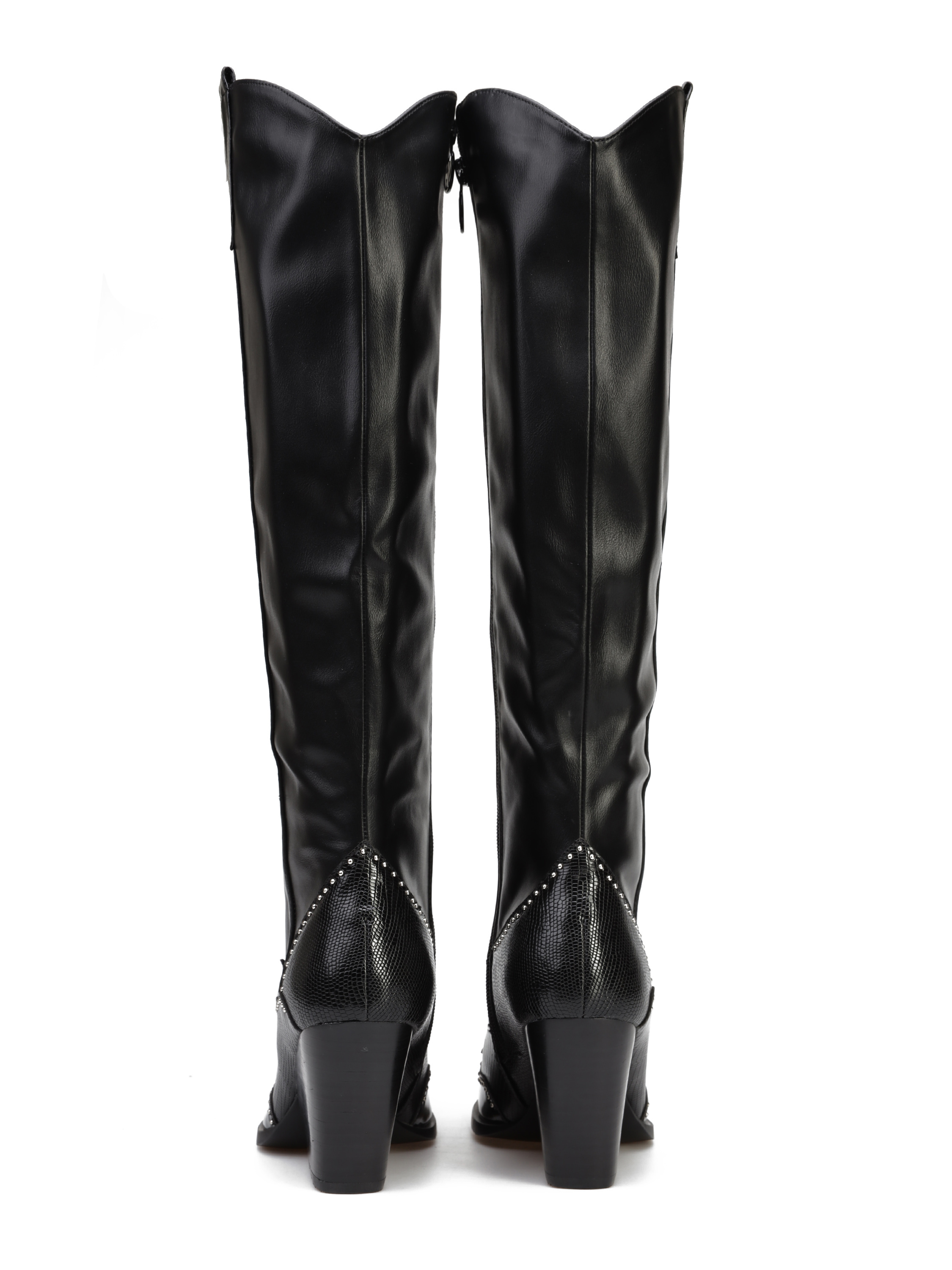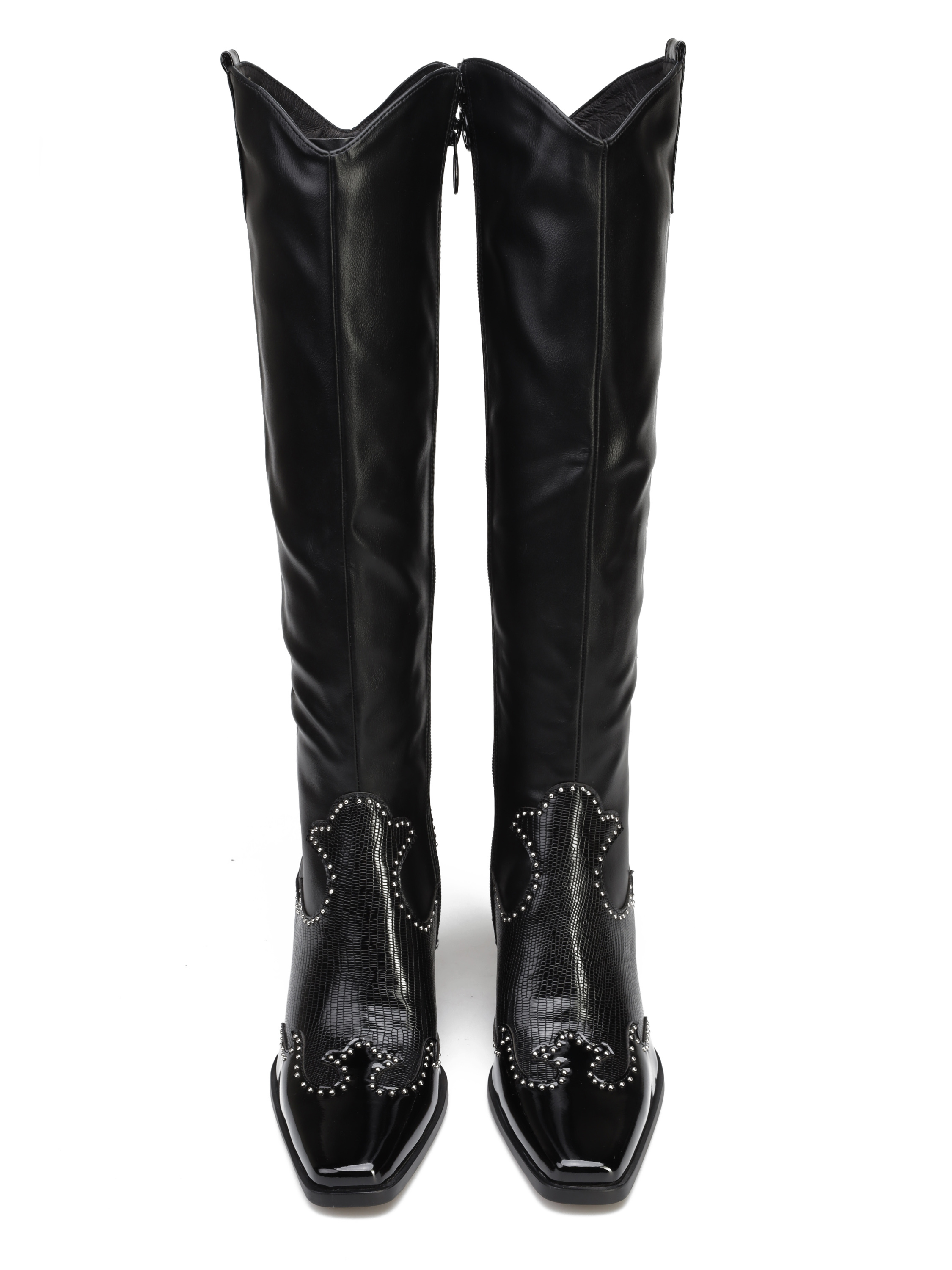 Wysokie kowbojki to gorący Trend sezonu. Cholewka do kolana posiada zamek błyskwiczny, który ułatwia zakładanie i zdejmowanie obuwia. Ozdobiona została metalowymi dżetami w srebrnym kolorze. Model na wygodnym, ściętym obcasie na słupku.