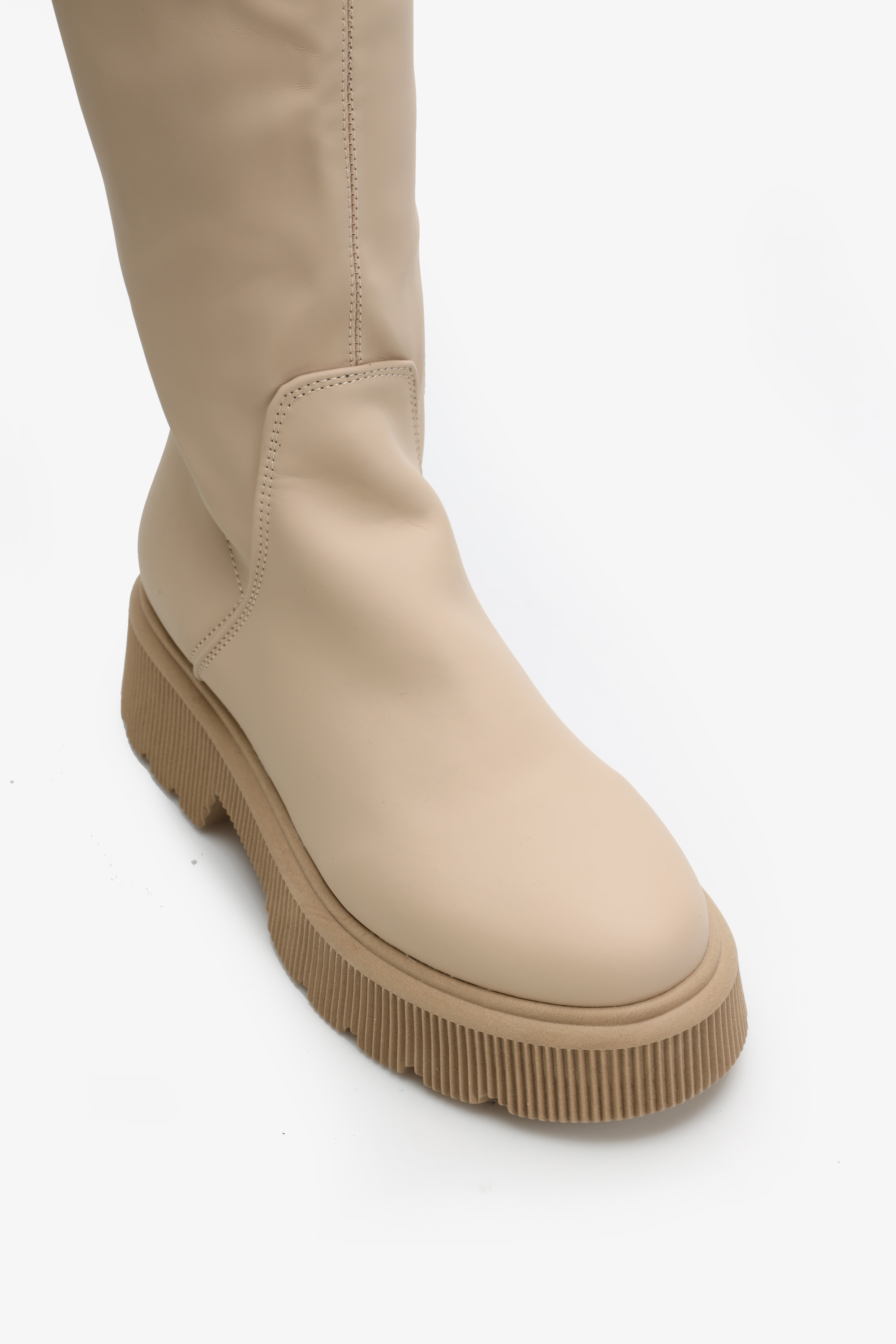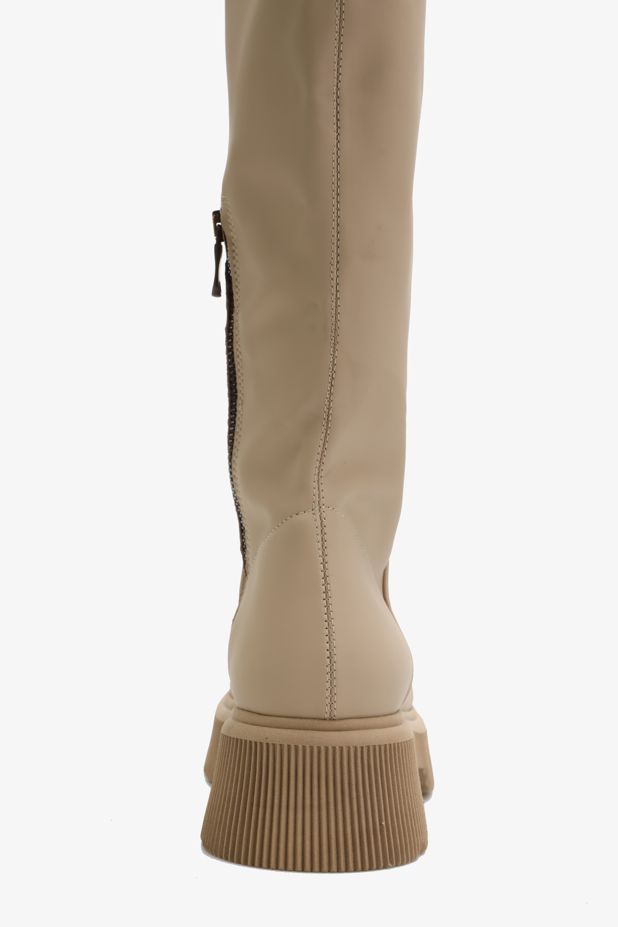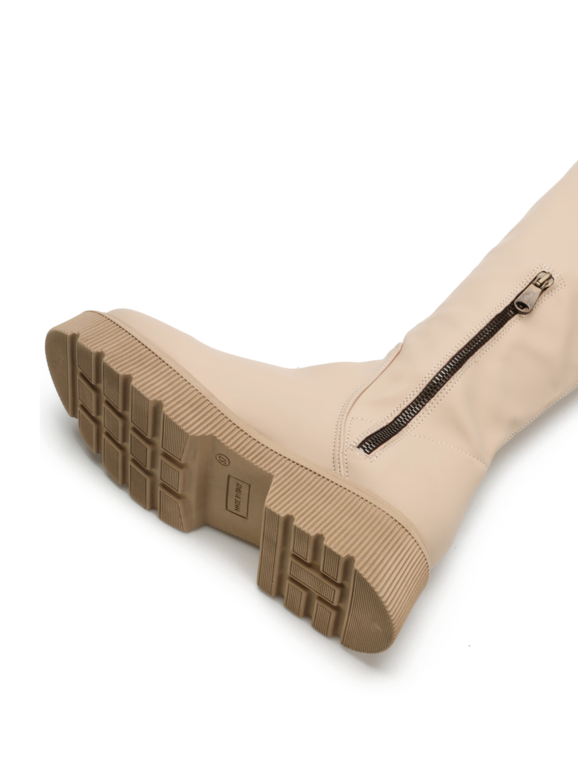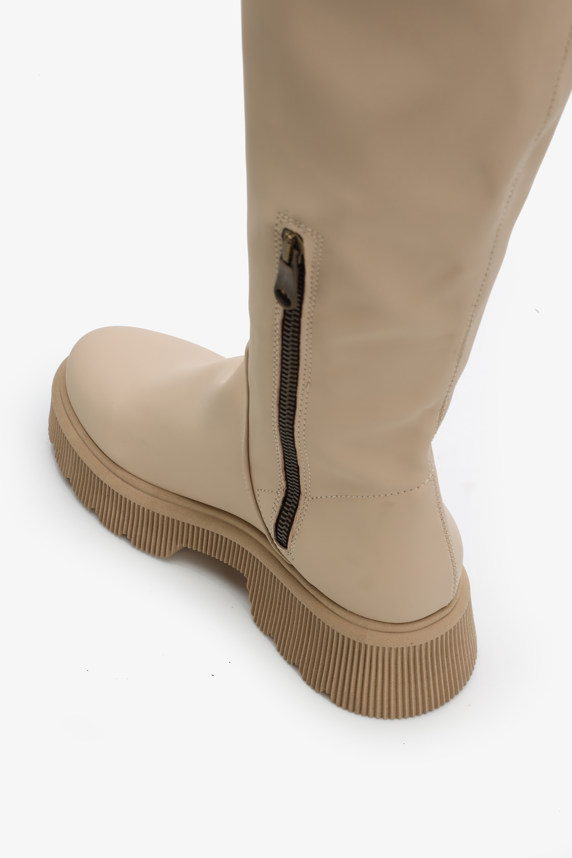 Model posiada grubą podeszwę, która izoluje stopę od podłoża. Wysoka, dopasowana cholewka wyposażona została w ukryty zamek ułatwiający zakładanie i zdejmowanie butów.