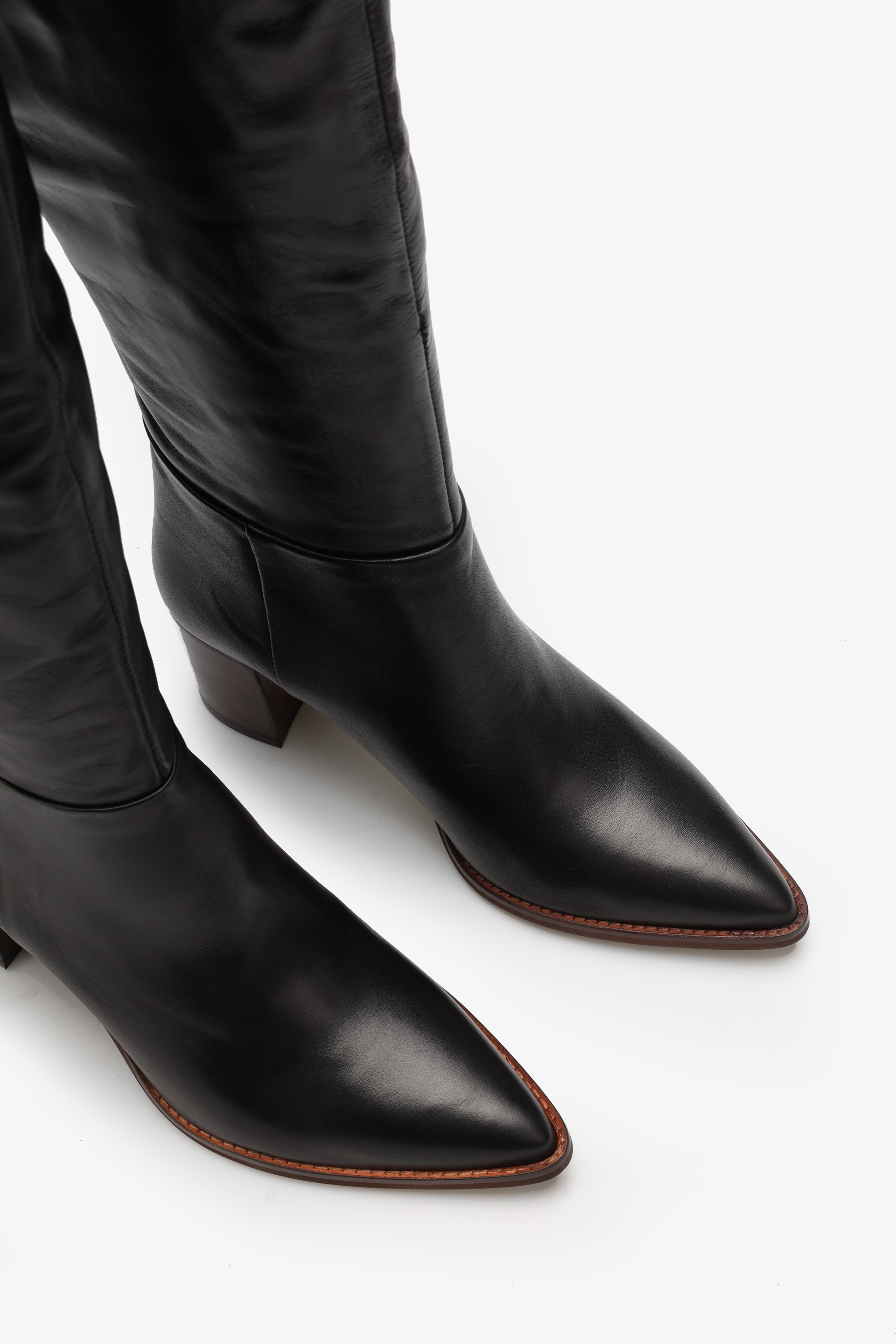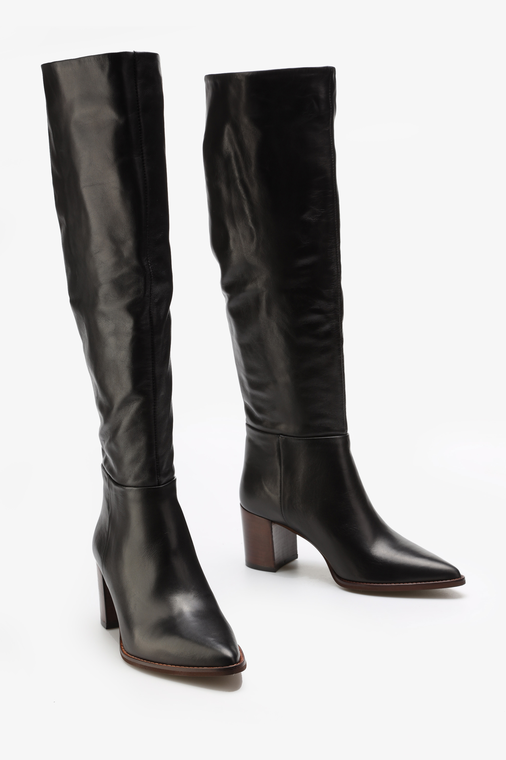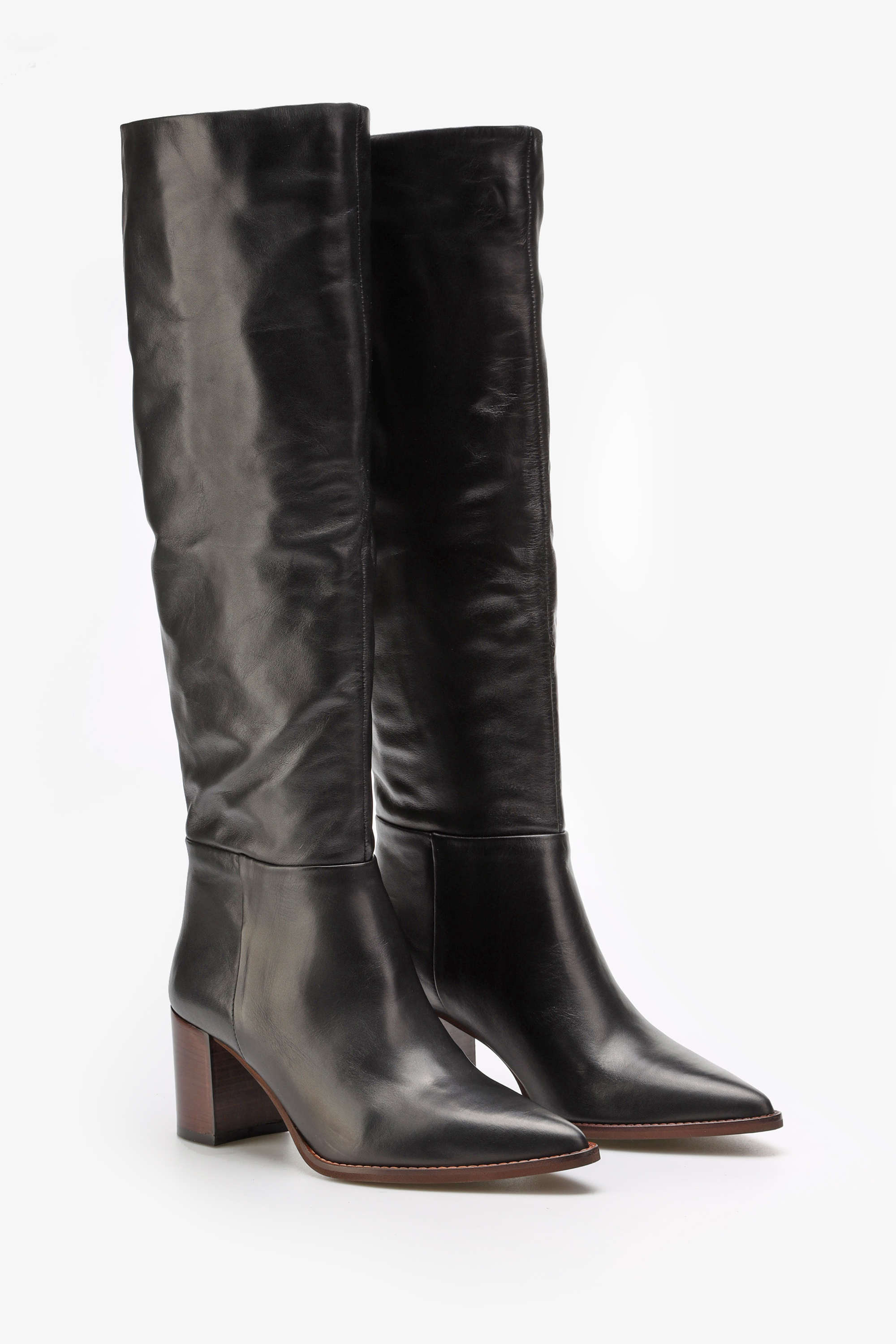 Wsuwane kozaki przed kolano wczarnym kolorze w całości wykonane są z naturalnej skóry licowej. Wysoka cholewka idealnie przylega do nogi. Stabilny obcas na słupku i nosek w szpic wpisują się w Trendy sezonu. Prosty fason o jednolitej fakturze to model, który zostanie z nami na dłużej.