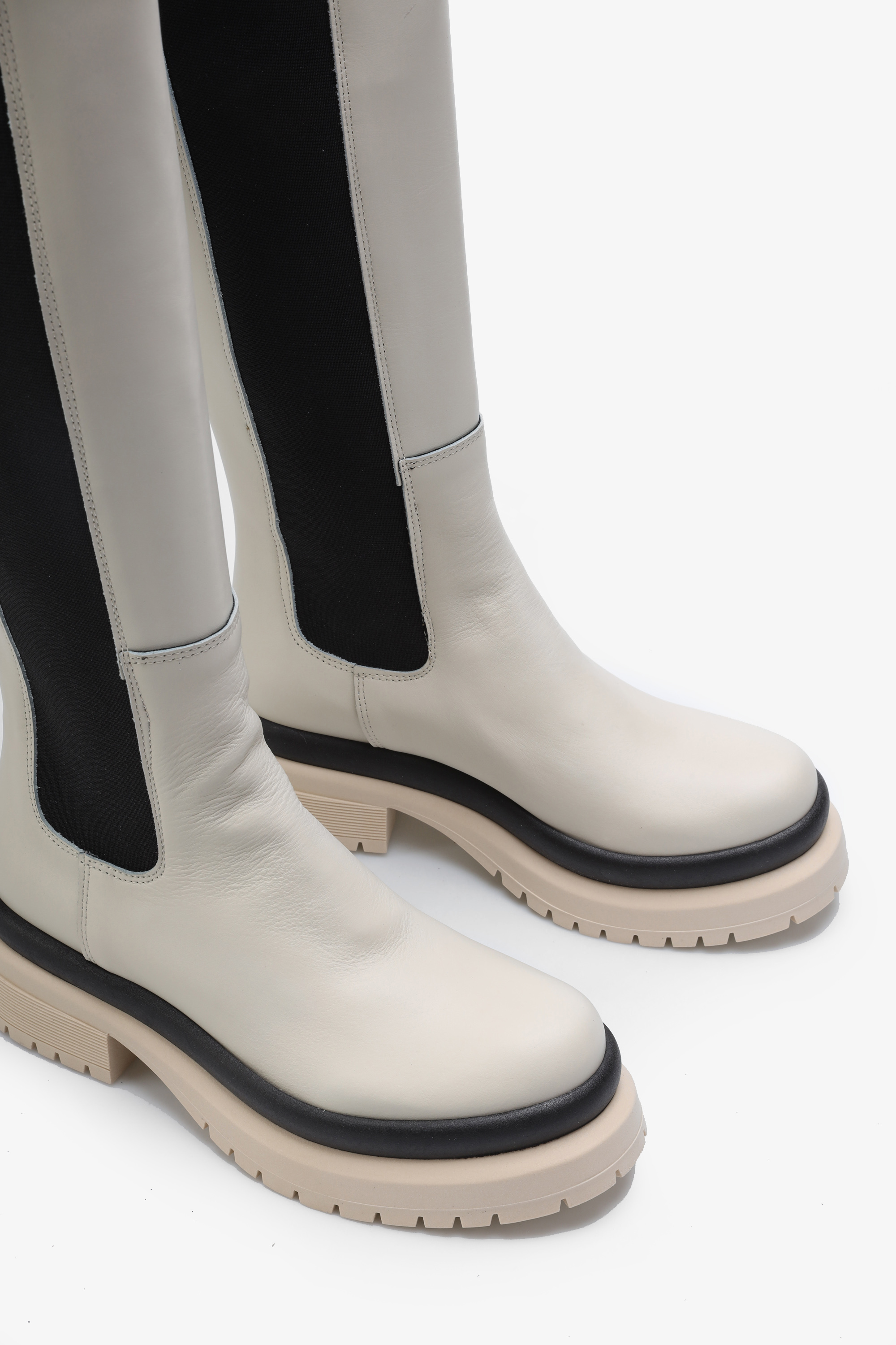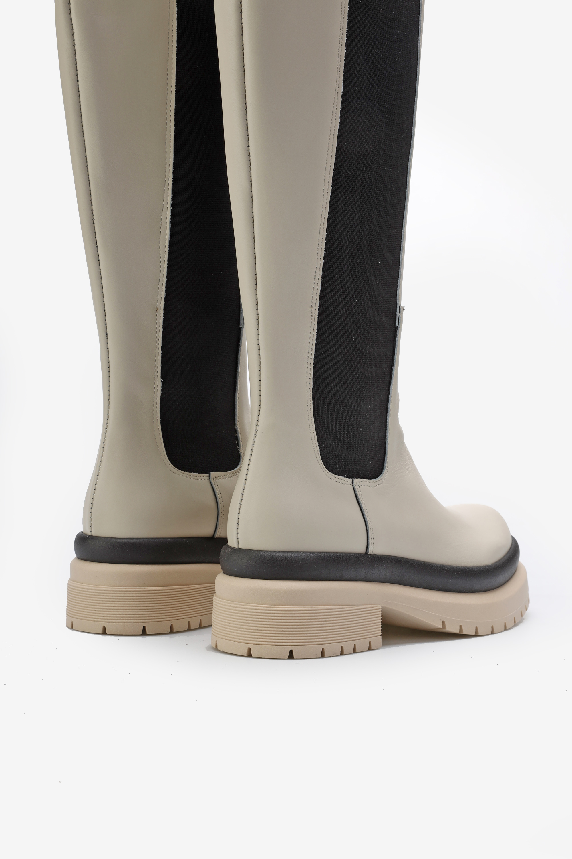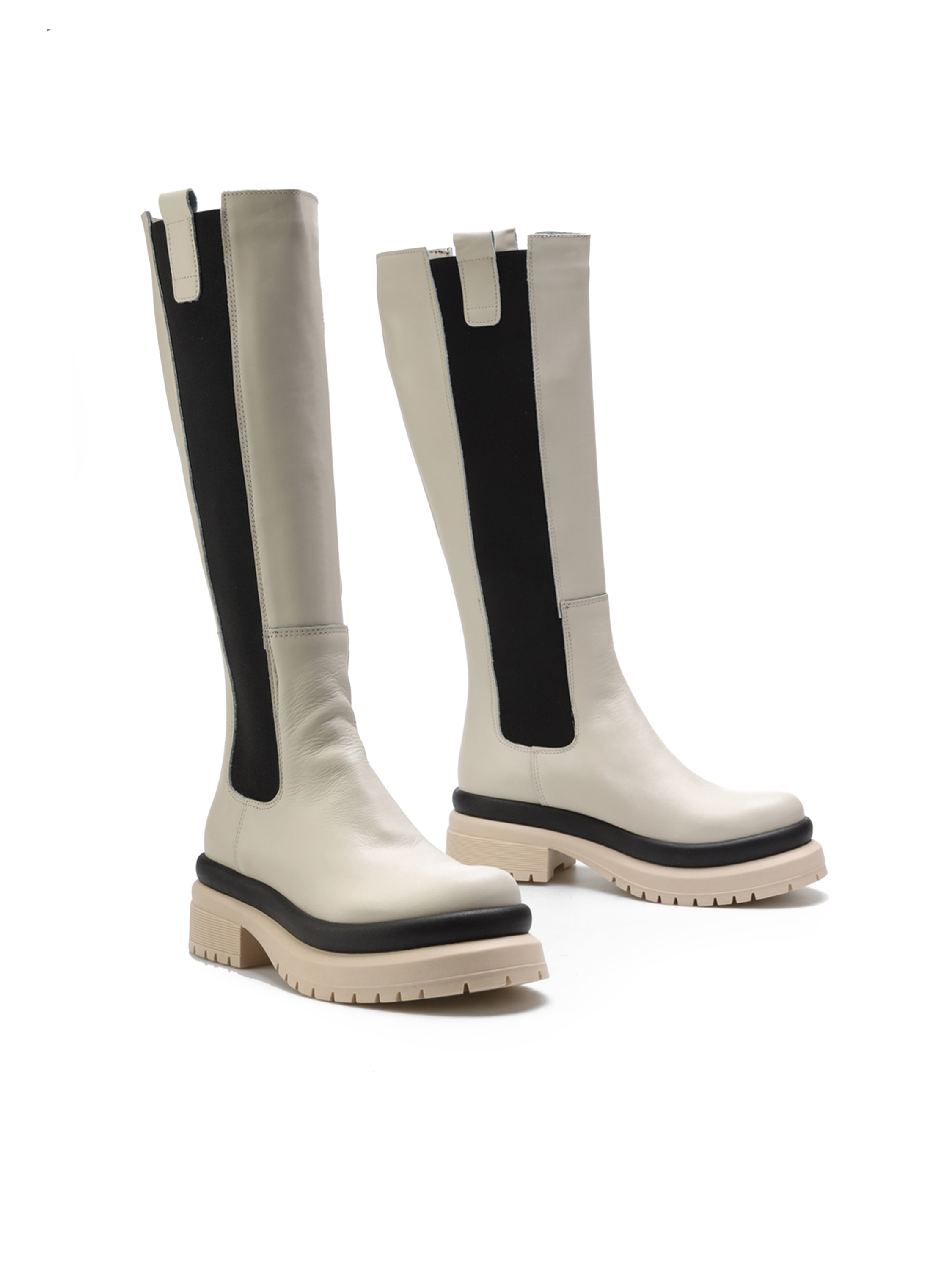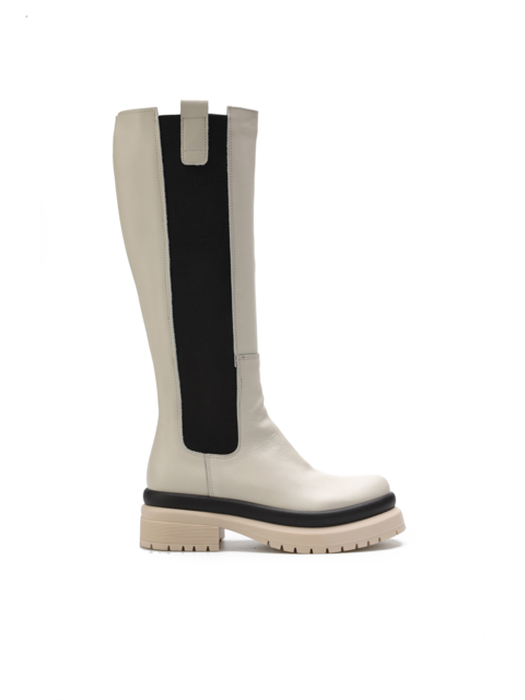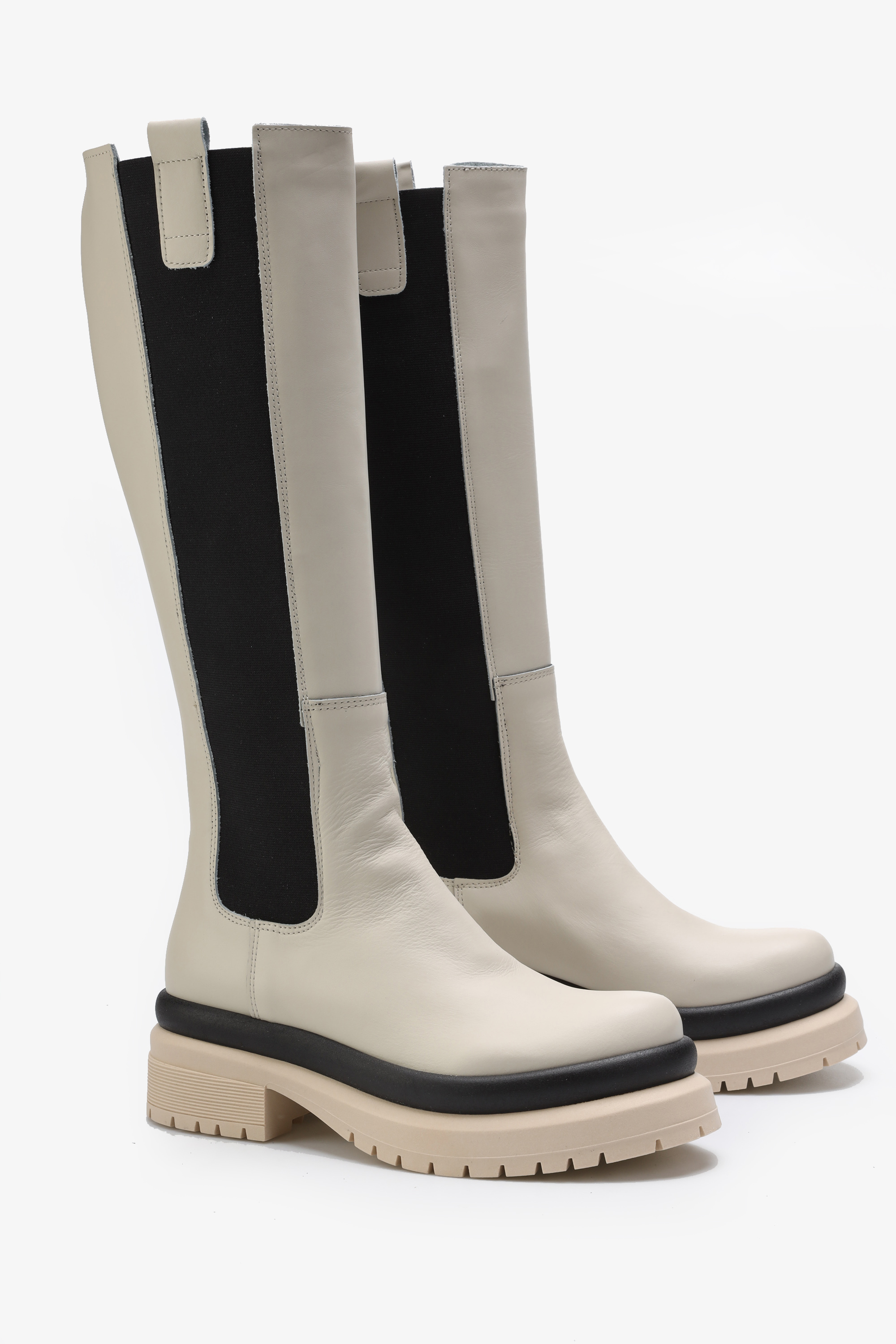 Wsuwane kozaki w kremowym kolorze natury wykonane są z naturalnej skóry licowej. Wysoka, dopasowana cholewka wyposażona jest w elastyczną wstawkę, która ułatwia zakładanie i zdejmowanie obuwia. Wpisująca się w najnowsze Trendy masywna podeszwa na platformie odpowiada za wygodę i stabilny krok. Zestawienie uniwersalnych kolorów i pasek oddzielający cholewkę od podeszwy nadają modelowi modowego wyglądu.