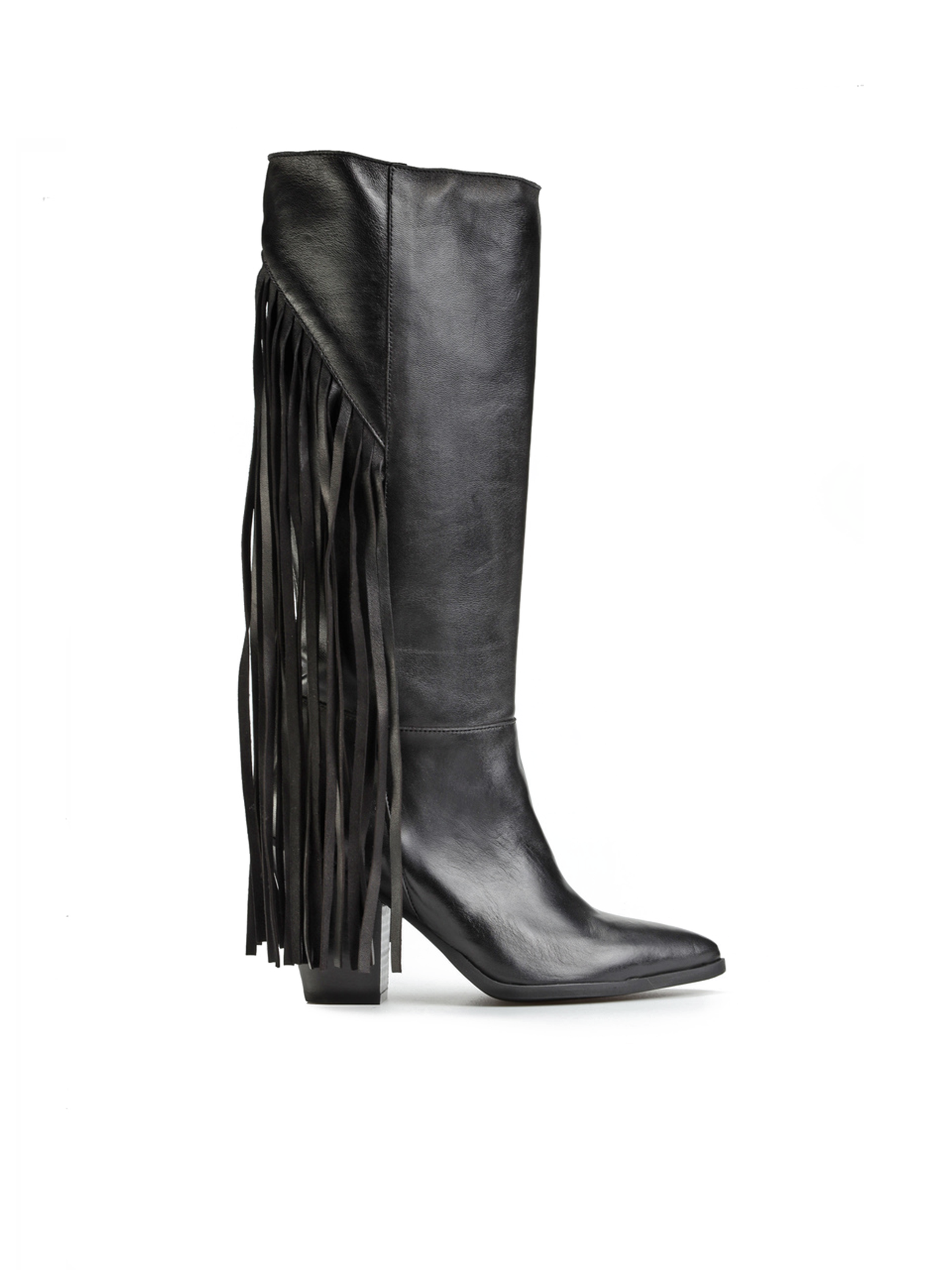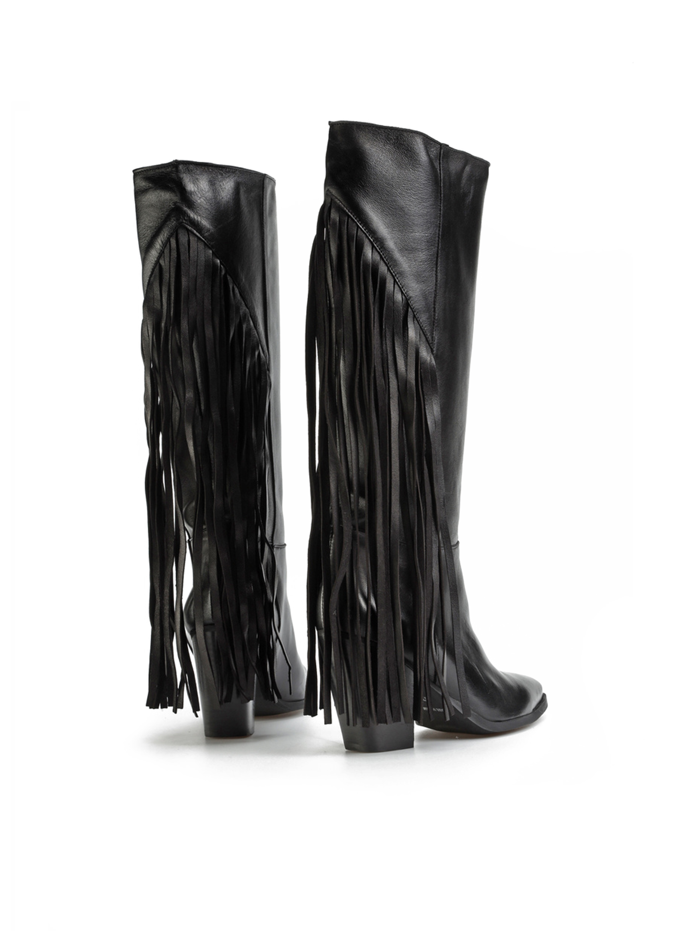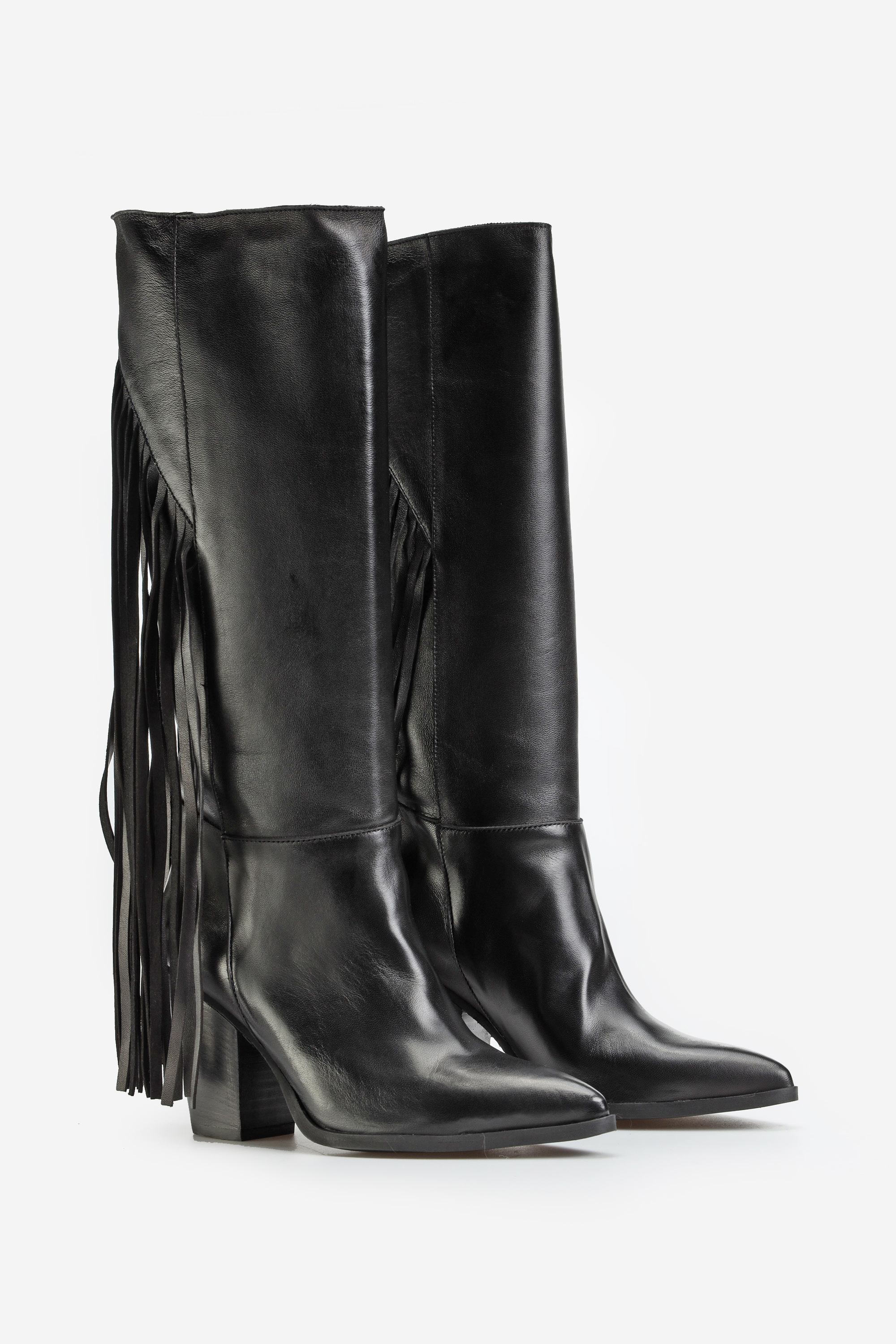 Wsuwane kozaki w klasycznym czarnym kolorze wykonane są z naturalnej, włoskiej skóry Nappa. Modnym detalem, wpisującym się w najnowsze trendy są długie frędzle z tyłu cholewki, które dodają im charakteru. Stylowy nosek w szpic i stabilny obcas na słupku to najbardziej pożądany fason.