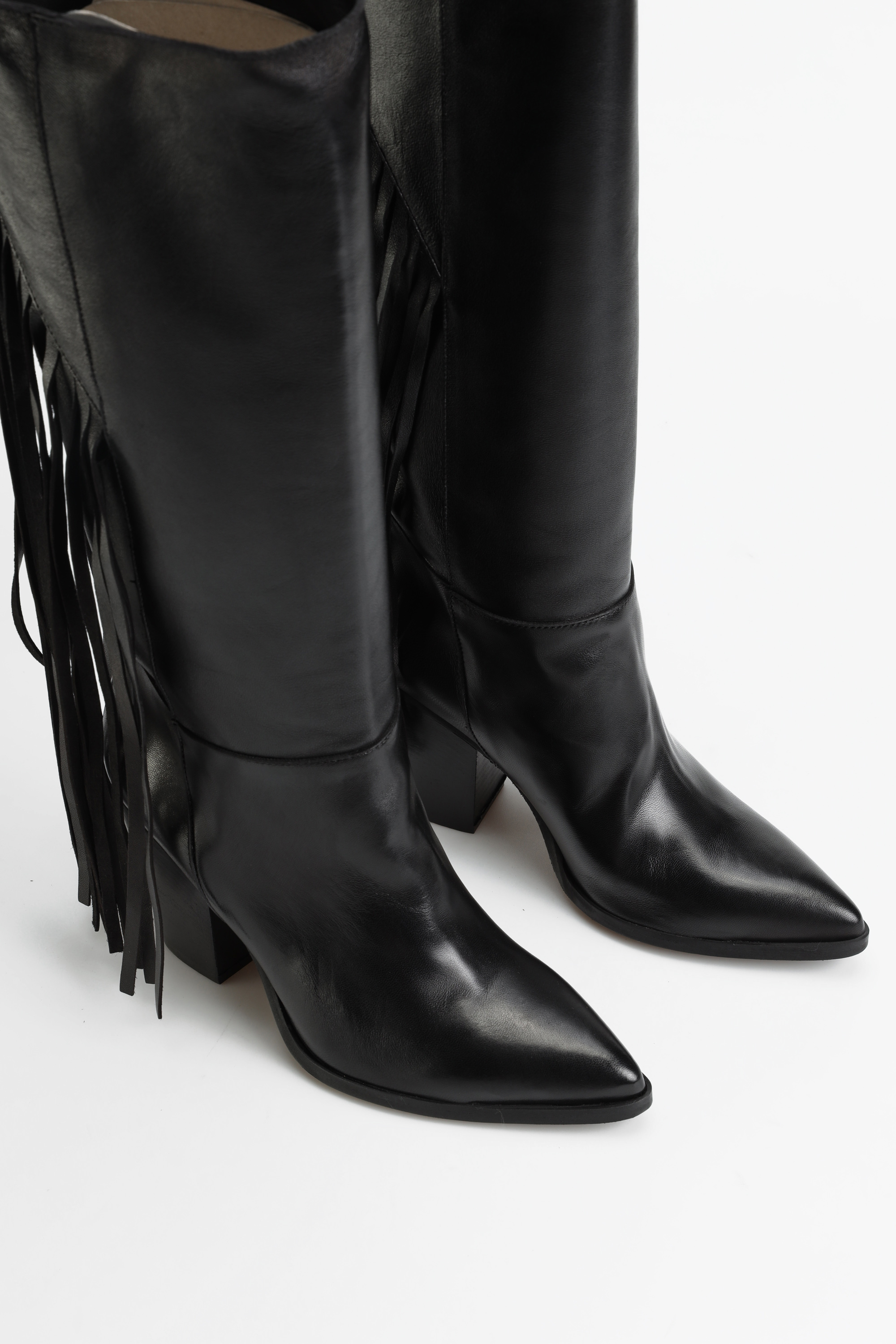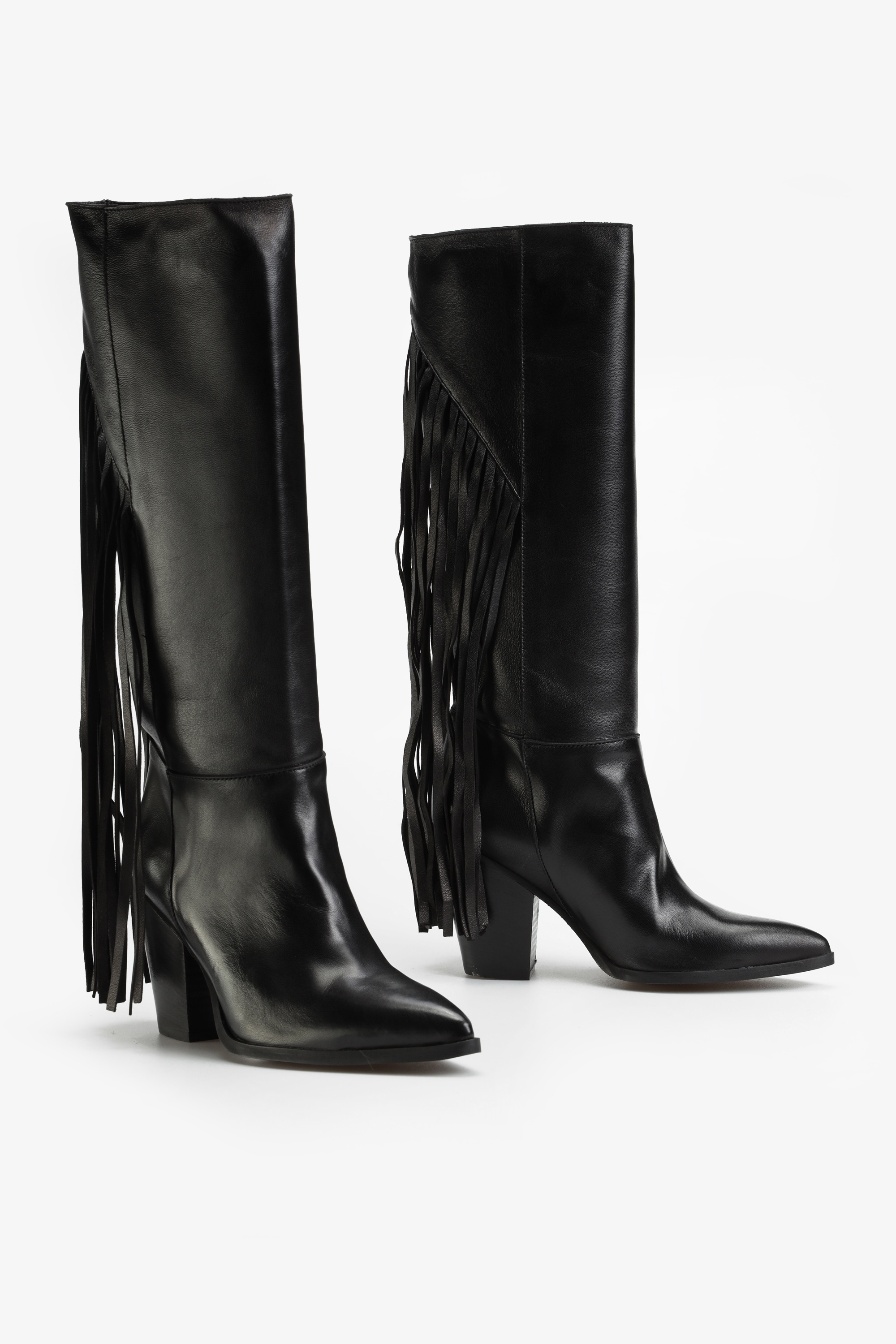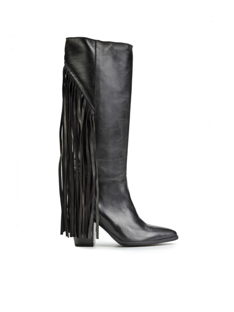 Wsuwane kozaki w klasycznym czarnym kolorze wykonane są z naturalnej, włoskiej skóry Nappa. Modnym detalem, wpisującym się w najnowsze trendy są długie frędzle z tyłu cholewki, które dodają im charakteru. Stylowy nosek w szpic i stabilny obcas na słupku to najbardziej pożądany fason.