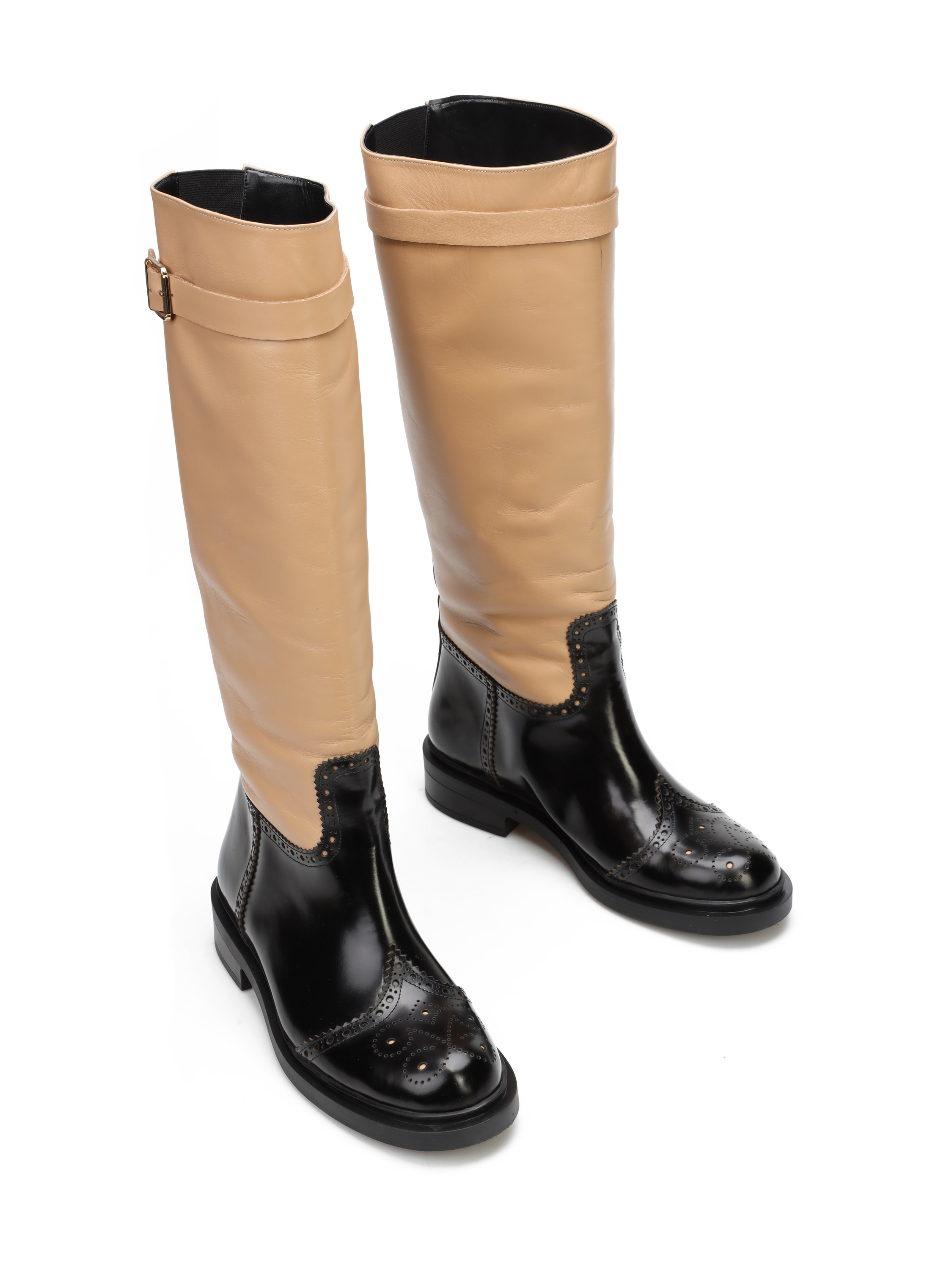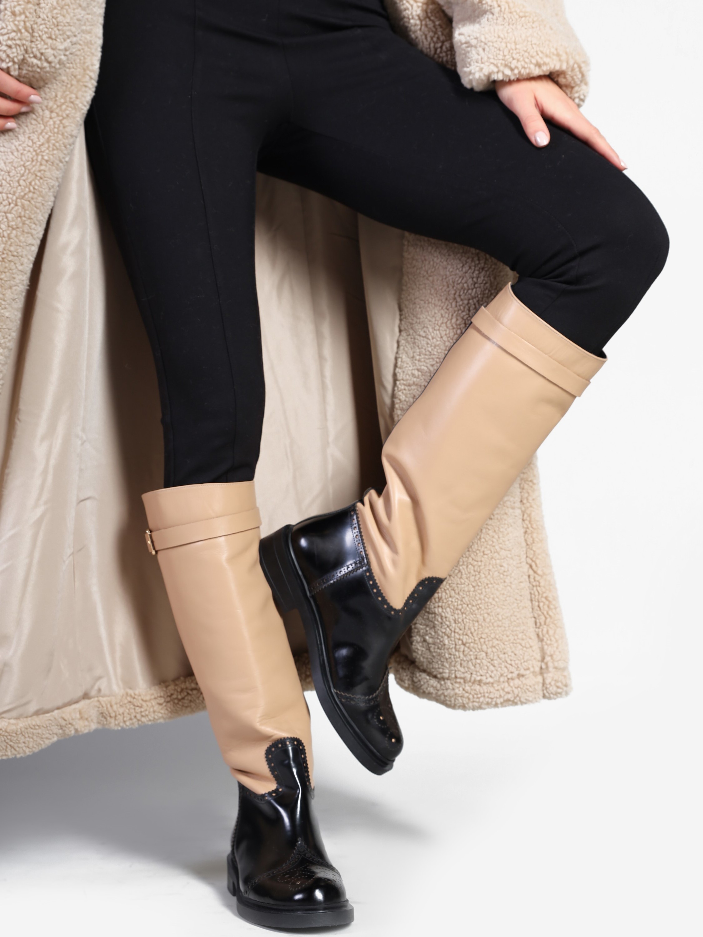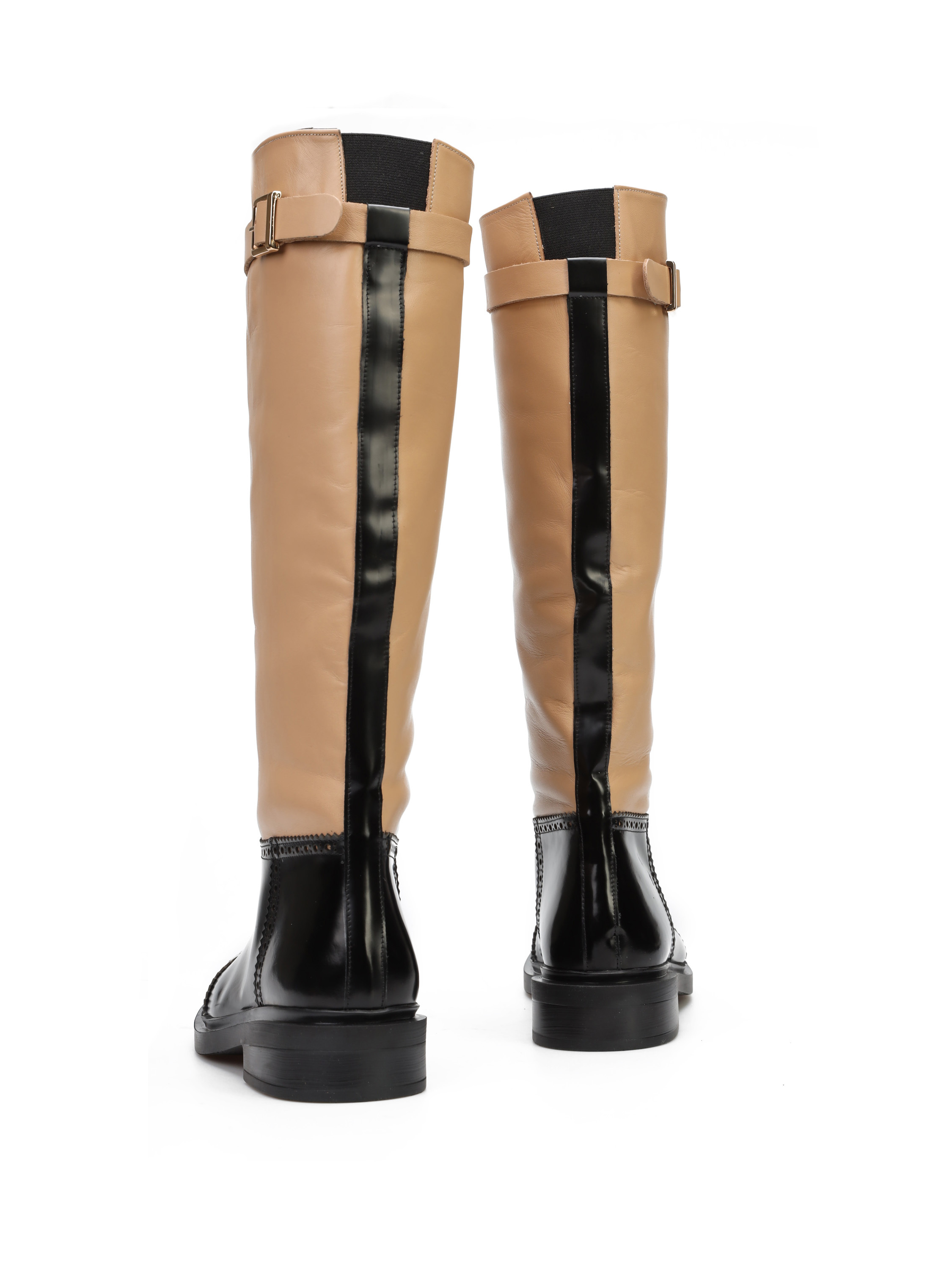 Wsuwane kozaki na płaskim obcasie wykonane są z naturalnej skóry. Wysoka cholewka to połączenie różnych faktur skór i stonowanych kolorów. Cholewka uzupełniona została  zapinanym na sprzączkę paskiem.