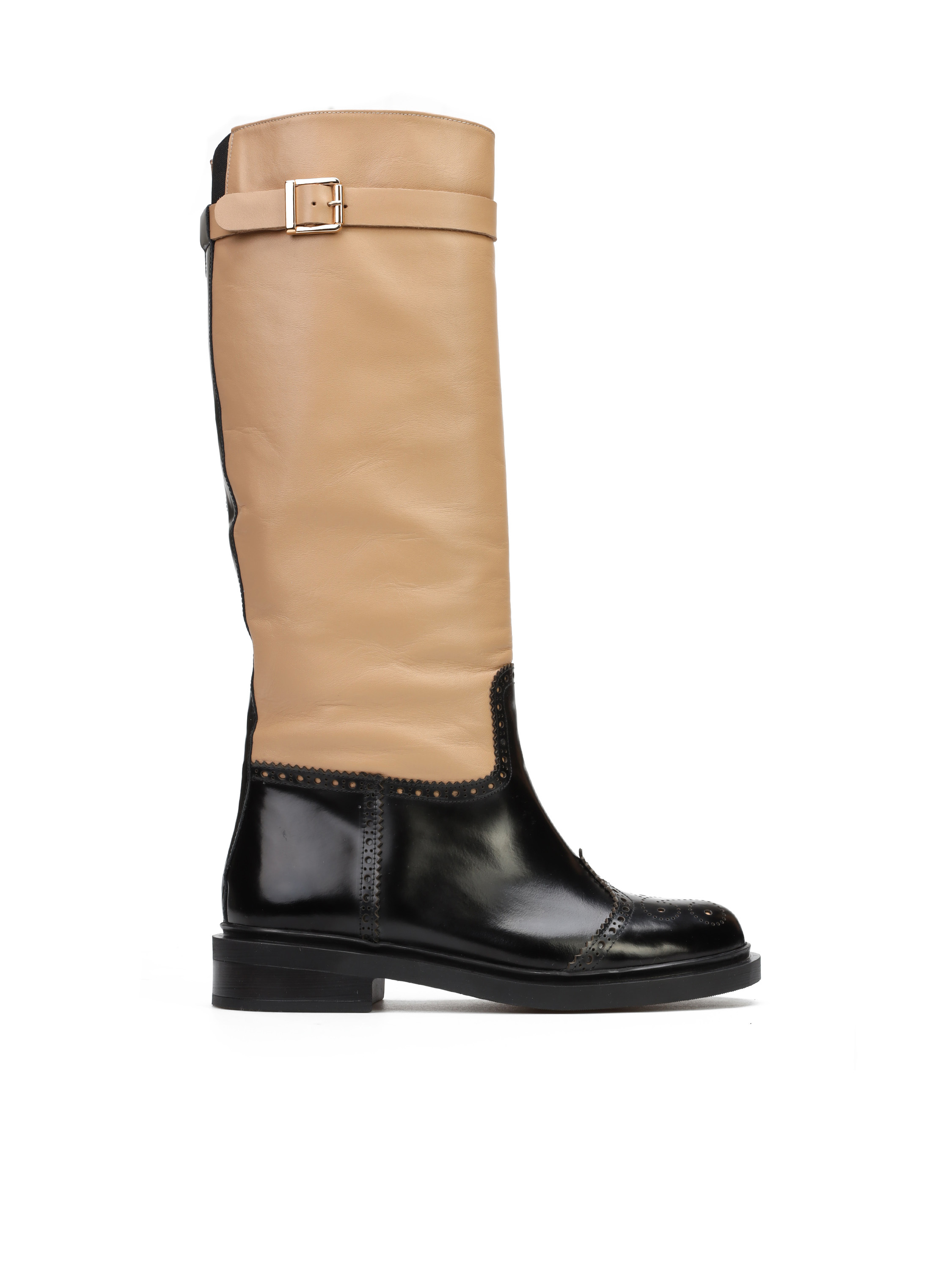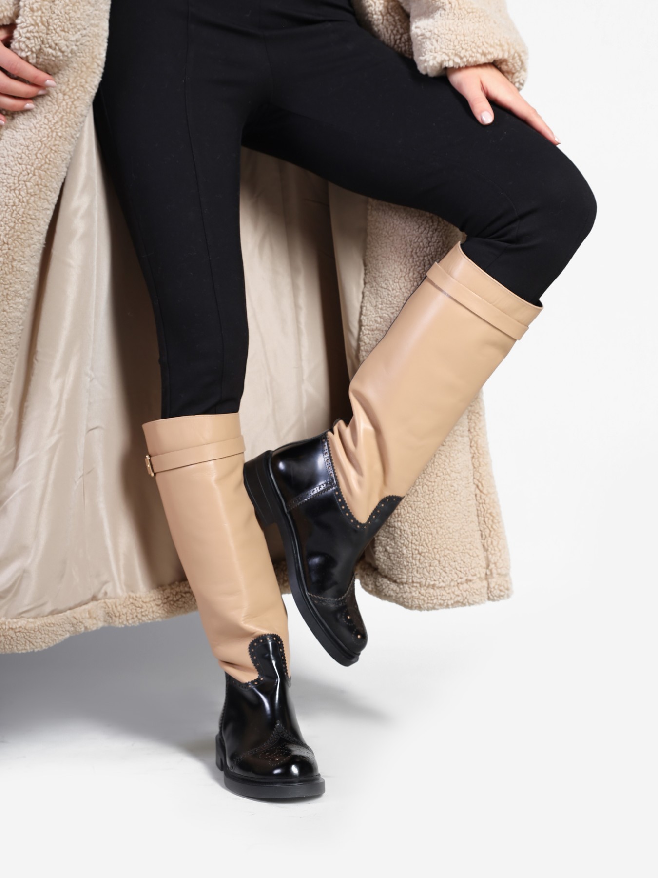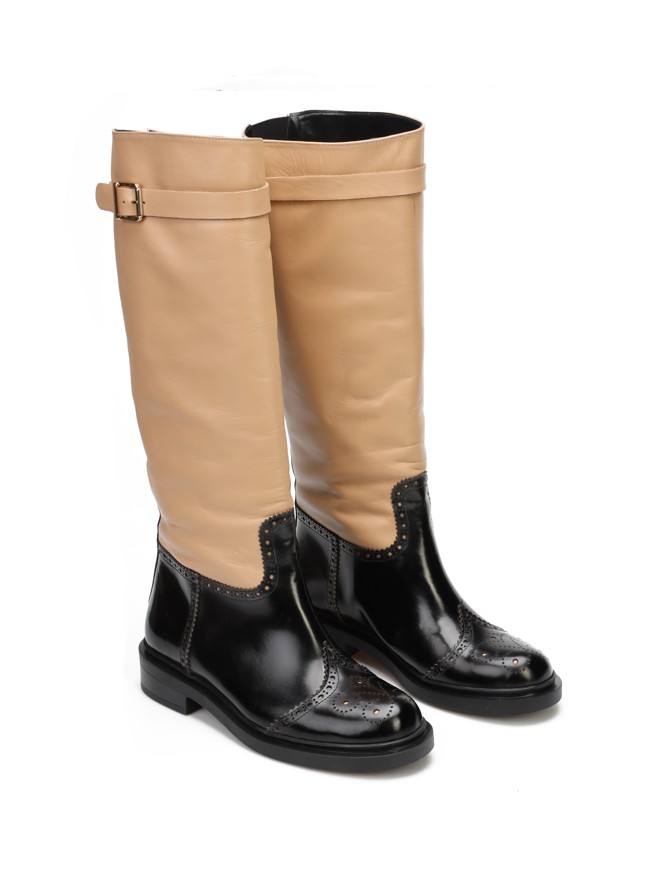 Wsuwane kozaki na płaskim obcasie wykonane są z naturalnej skóry. Wysoka cholewka to połączenie różnych faktur skór i stonowanych kolorów. Cholewka uzupełniona została  zapinanym na sprzączkę paskiem.