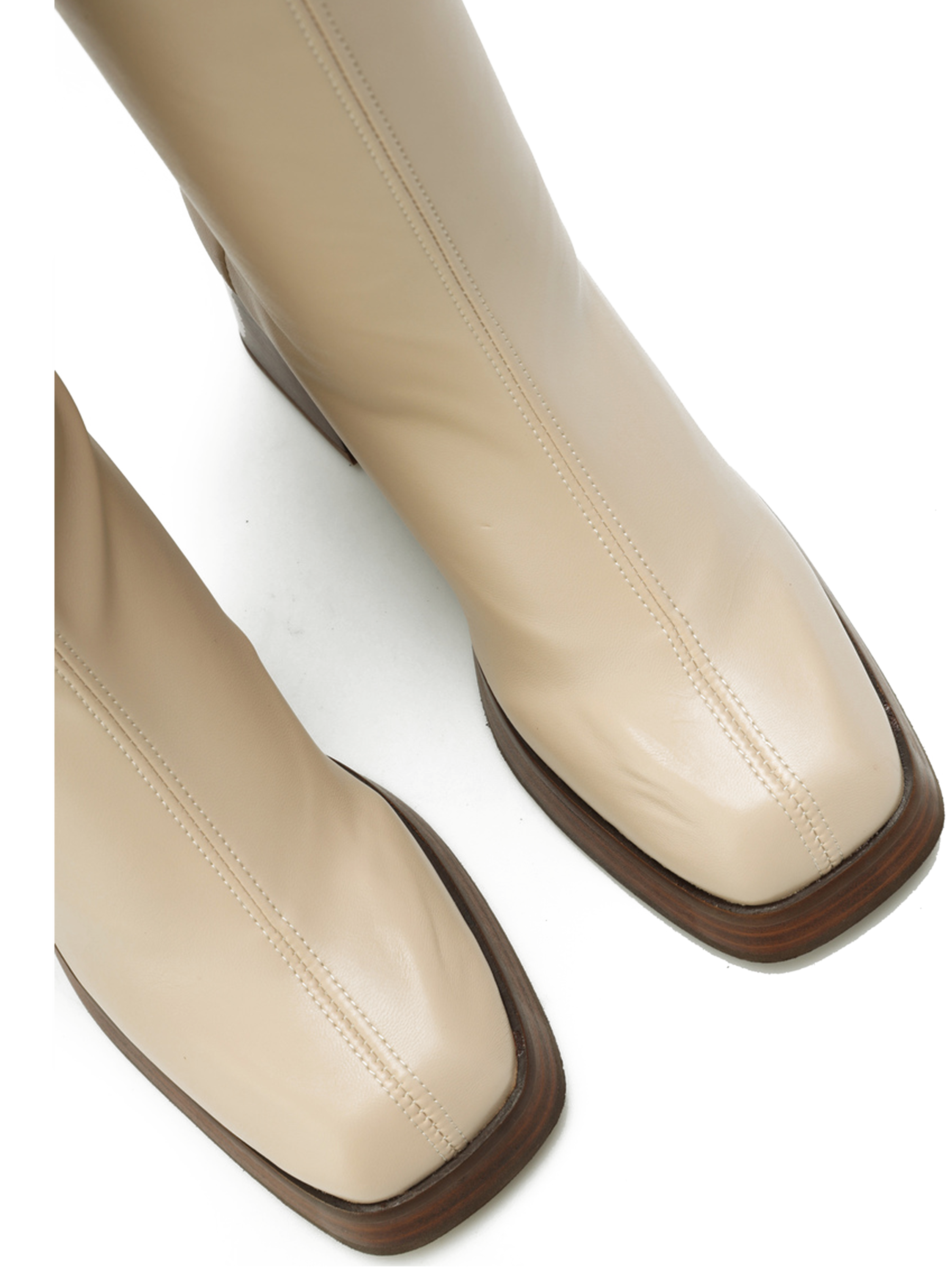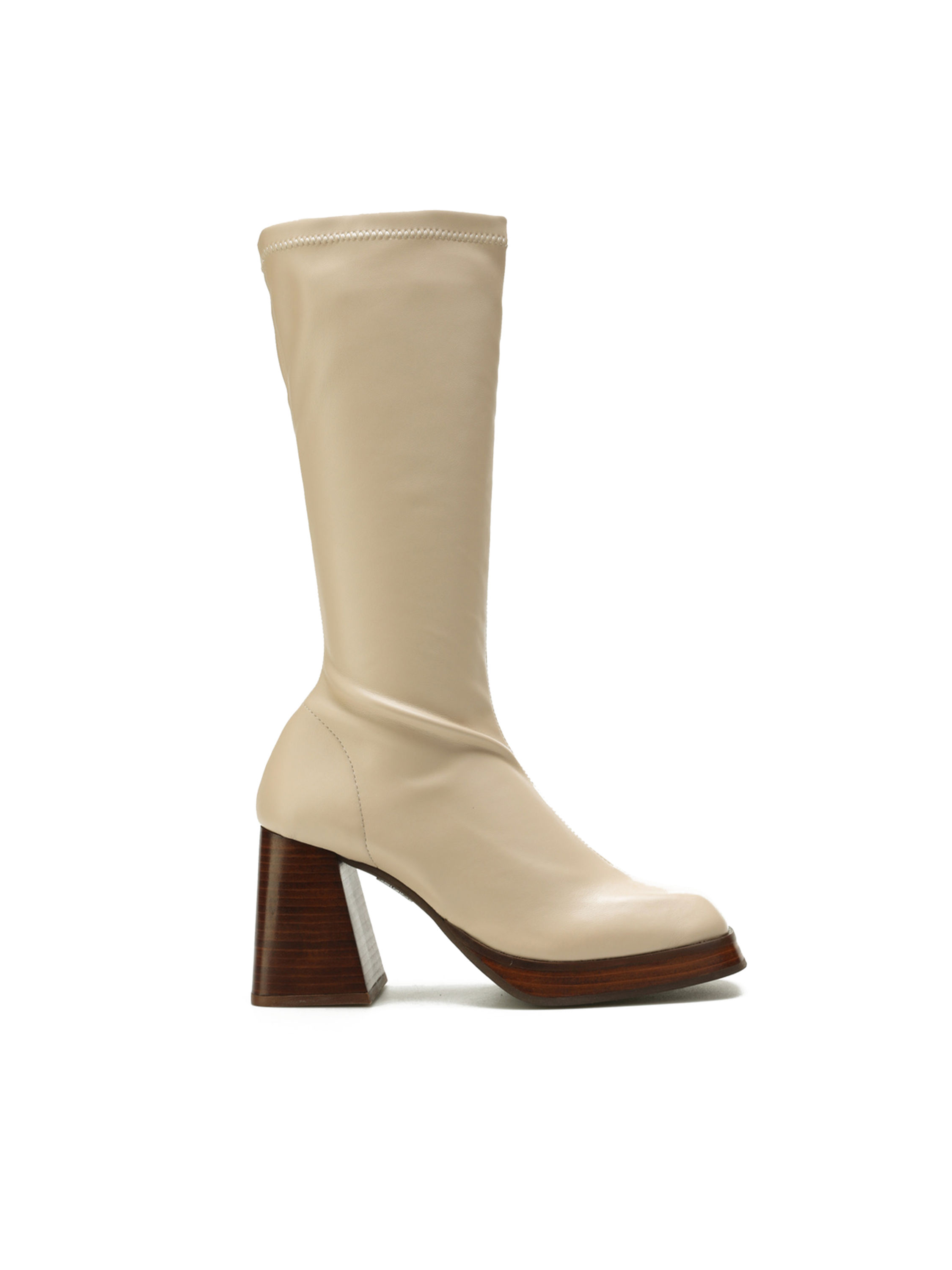 Wsuwane kozaki z elastyczną cholewką w stylu "Socks boots", przylegają do nogi jak druga skóra. Kwadratowy nosek oraz geometryczny obcas na słupku wpisują się Trendy sezonu. Podeszwa na platformie w połączeniu ze skórzaną wkładką odpowiada za komfort i wygodę.