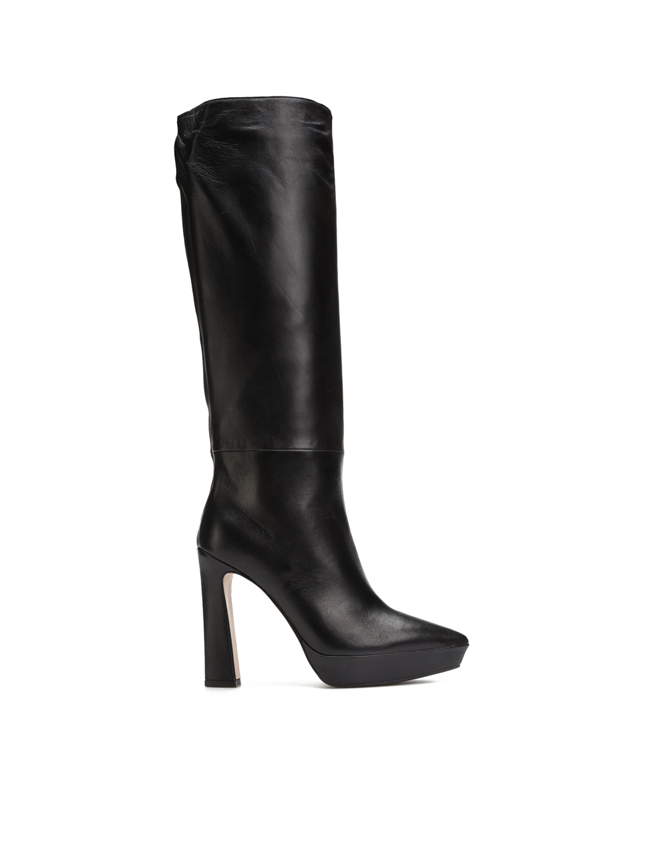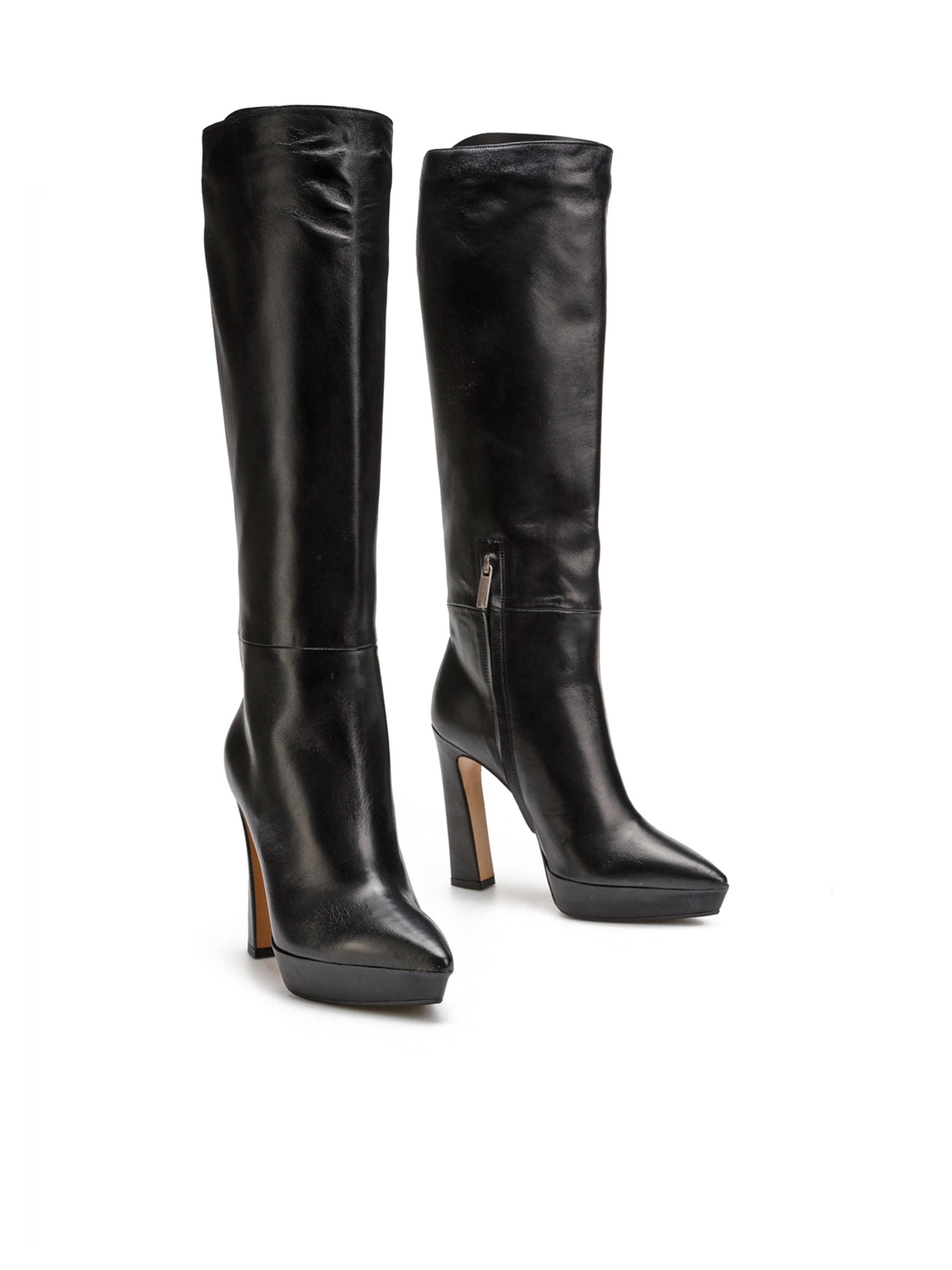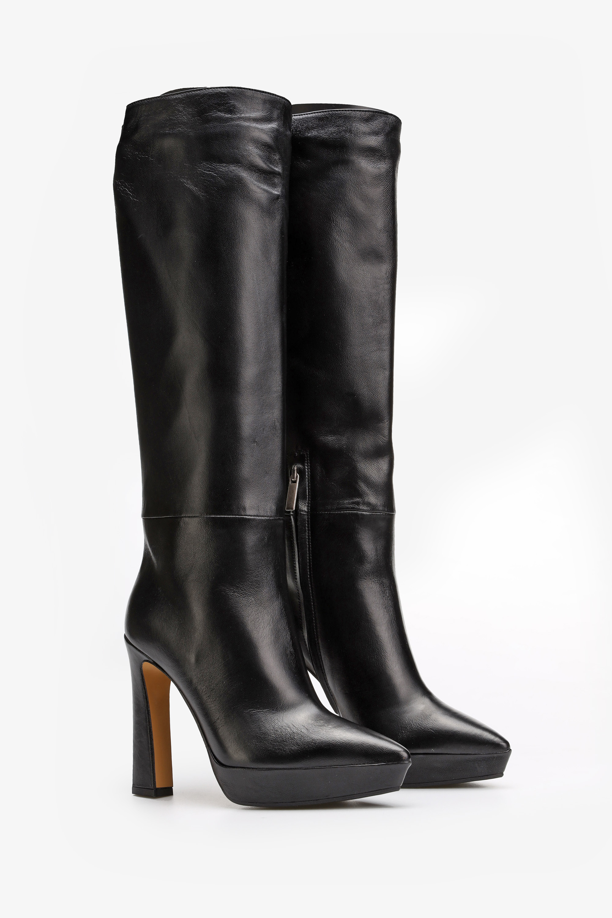 Eleganckie kozaki w ponadczasowym, czarnym kolorze wykonane są z wysokiej jakości naturalnej skóry NAPPA. Dopasowana cholewka idealnie przylega do nogi. Delikatna platforma oraz słupkowy, stabilny obcas to HOT Trend sezonu. Ukryty od wewnętrznej strony zamek błyskawiczny ułatwia zakładanie i zdejmowanie obuwia. Nosek w szpic sprawia, że model prezentuje się niezwykle stylowo.