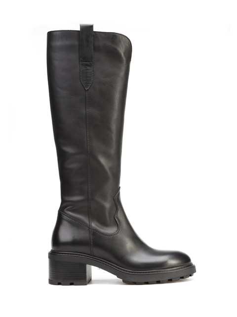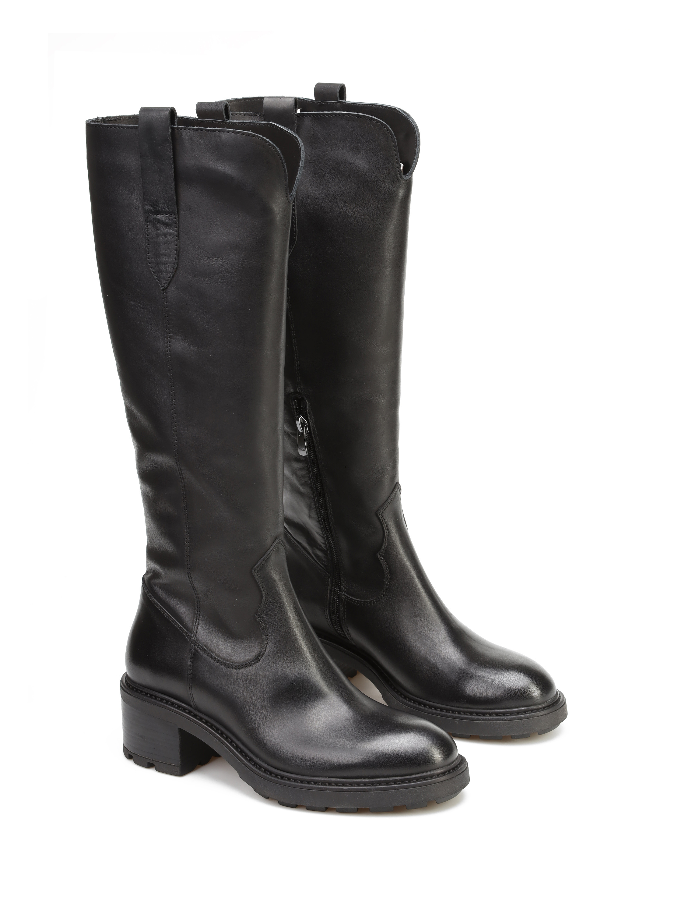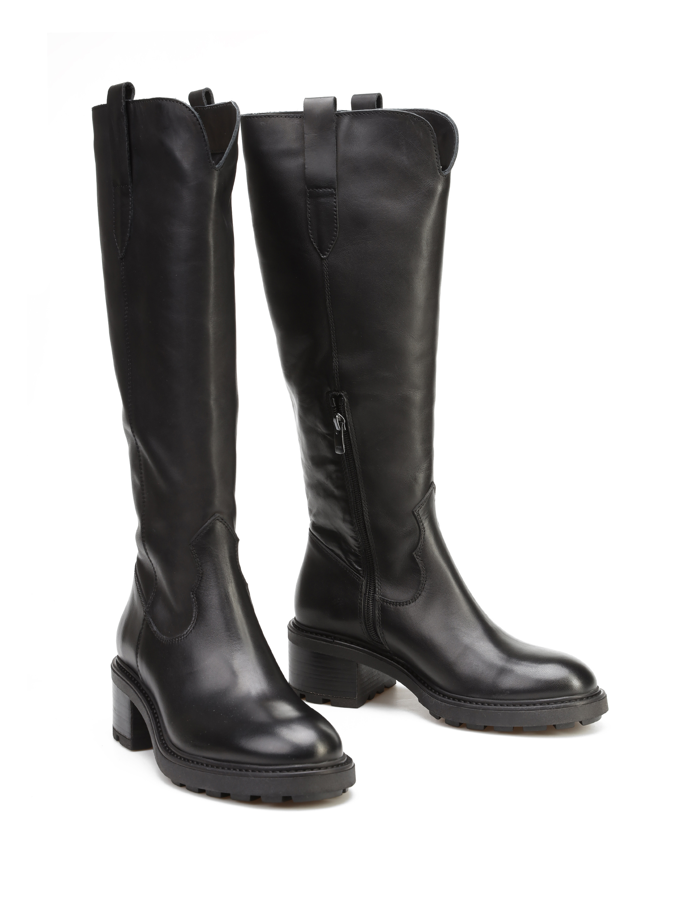 Wysokie kozaki wykonane są z naturalnej skóry. Cholewka w czarnym kolorze posiada krótki zamek błyskawiczny. Model z gumową podeszwą oraz wygodnym obcasem na słupku. Prosty fason, który powinien się znaleźć w modnej szafie kobiety.