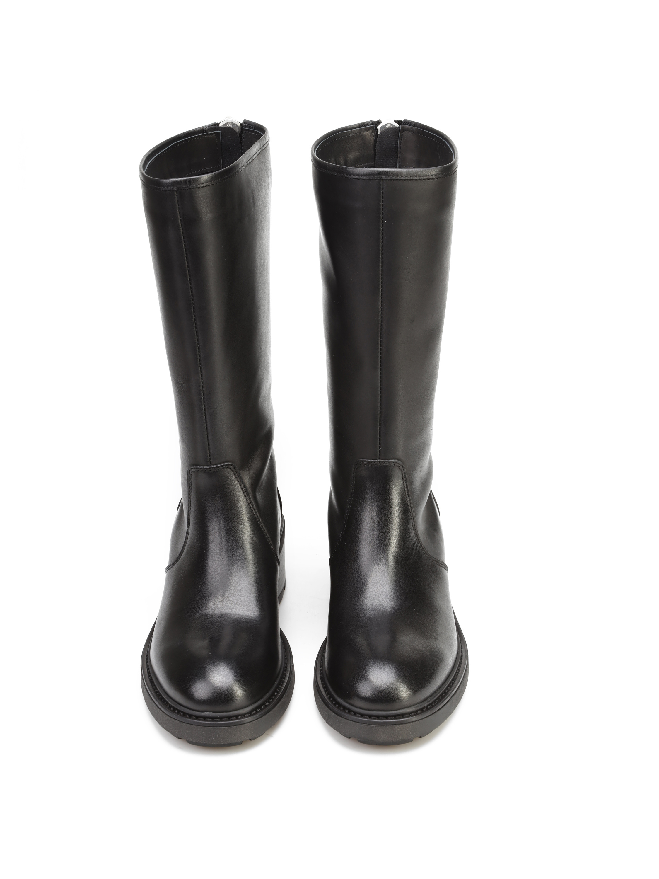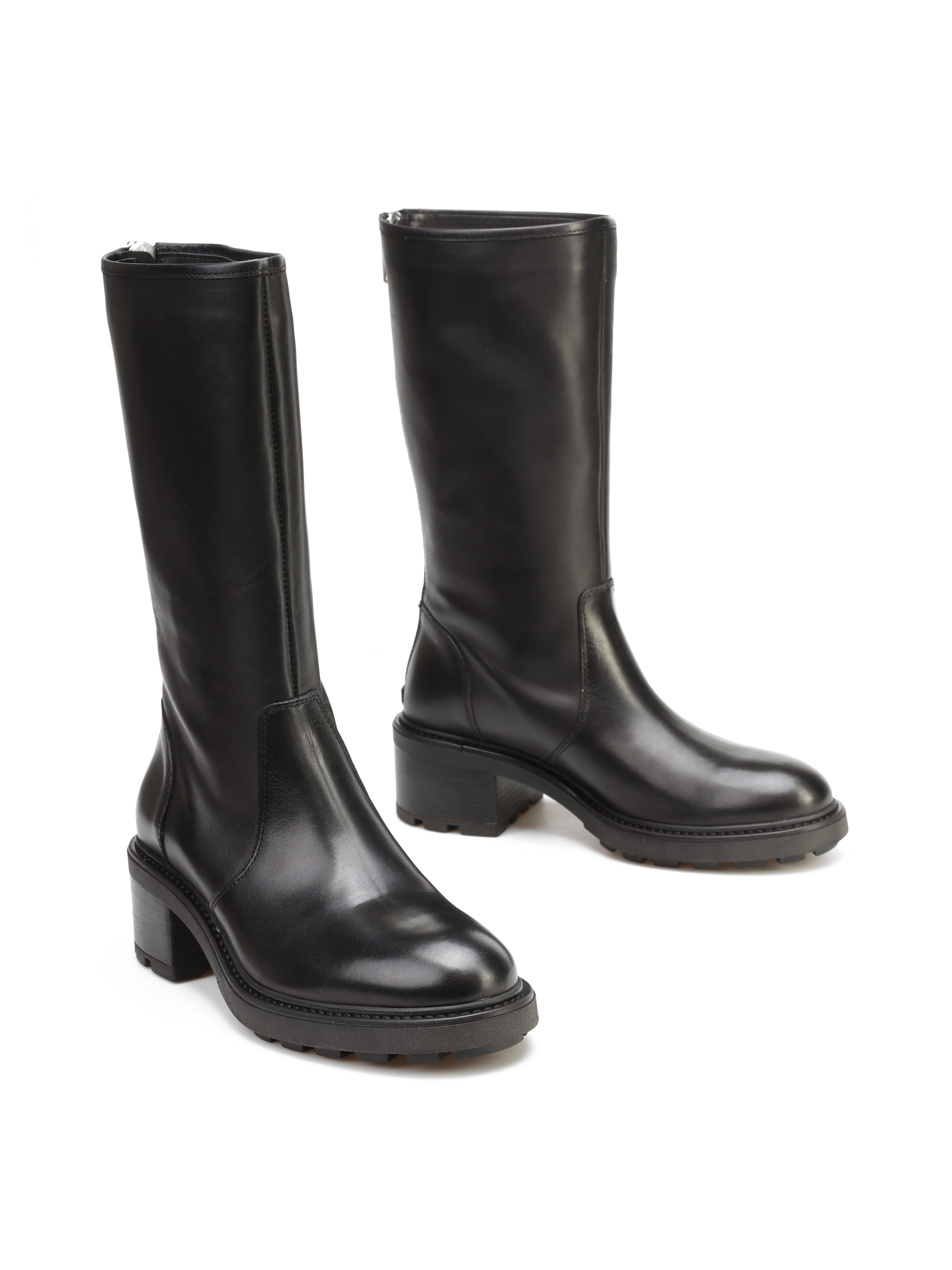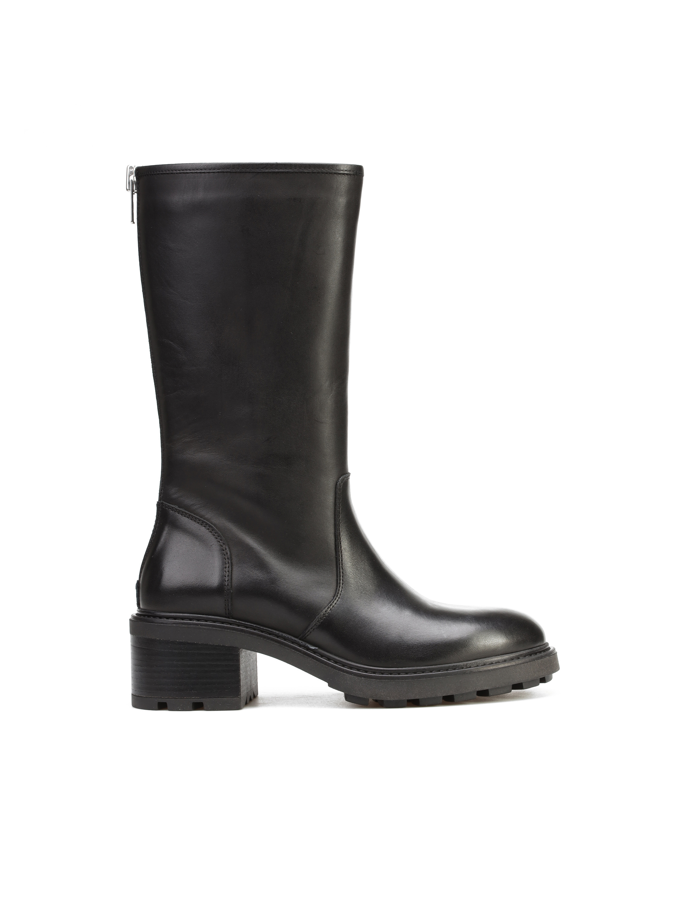 Krótkie kozaki o prostym kroju wykonane są z włoskiej skóry naturalnej. Cholewka w czarnym kolorze posiada zamek błyskawiczny, który ułatwia zakładanie i zdejmowanie obuwia. Minimalistyczny fason osadzony został na wygodnym obcasie na słupku. Będzie uzupełnieniem wielu modnych stylizacji.