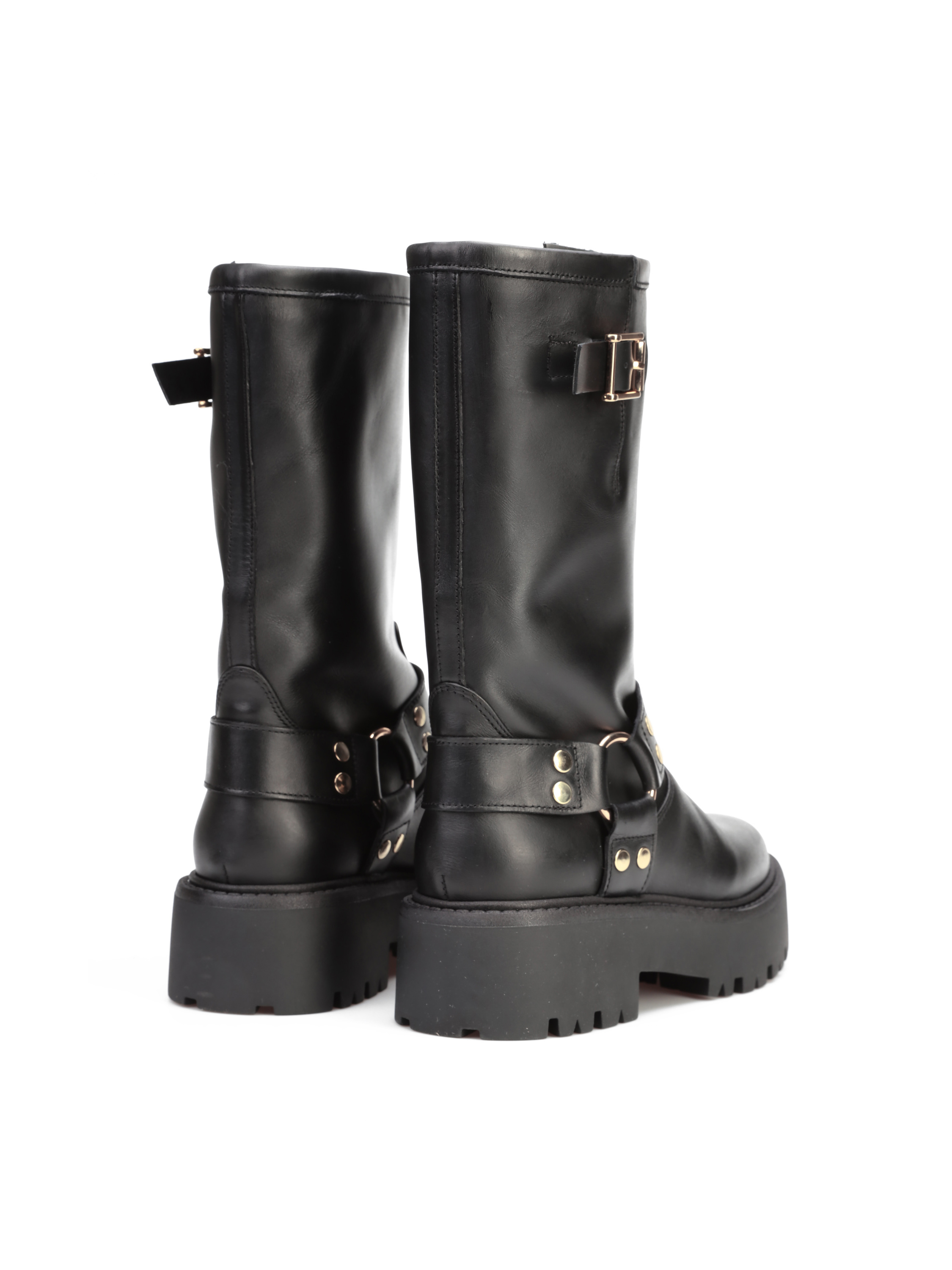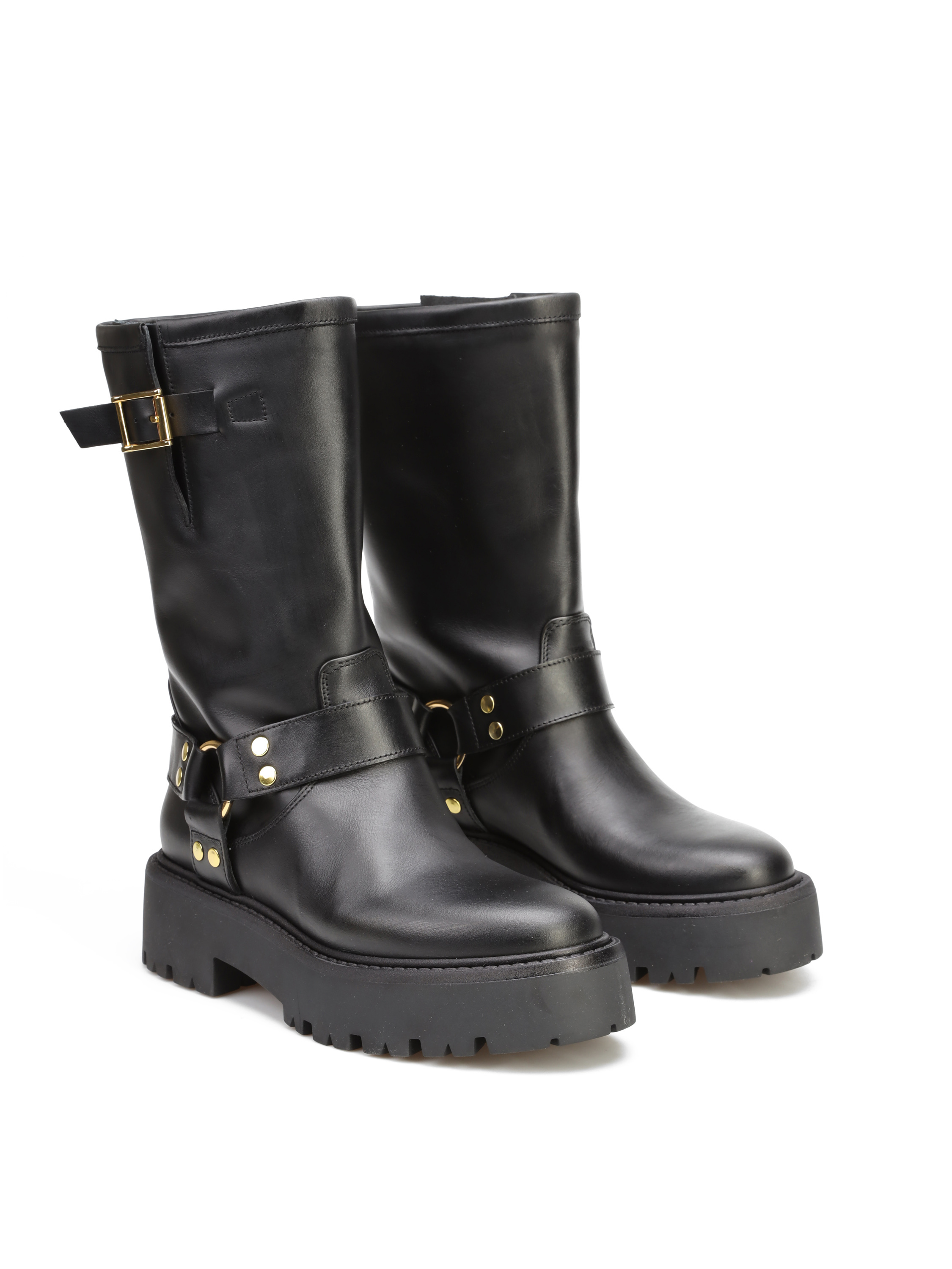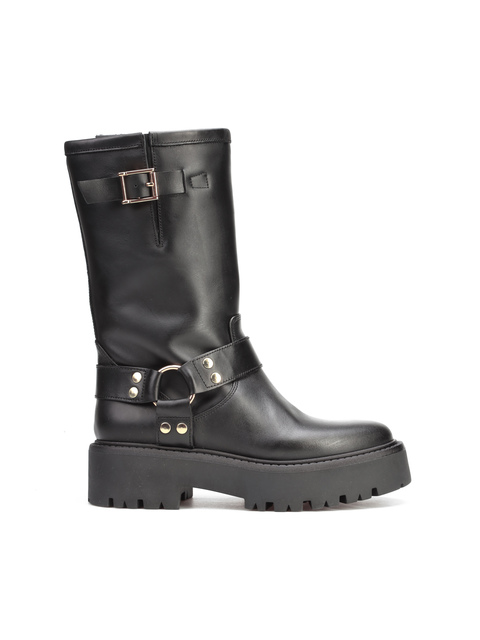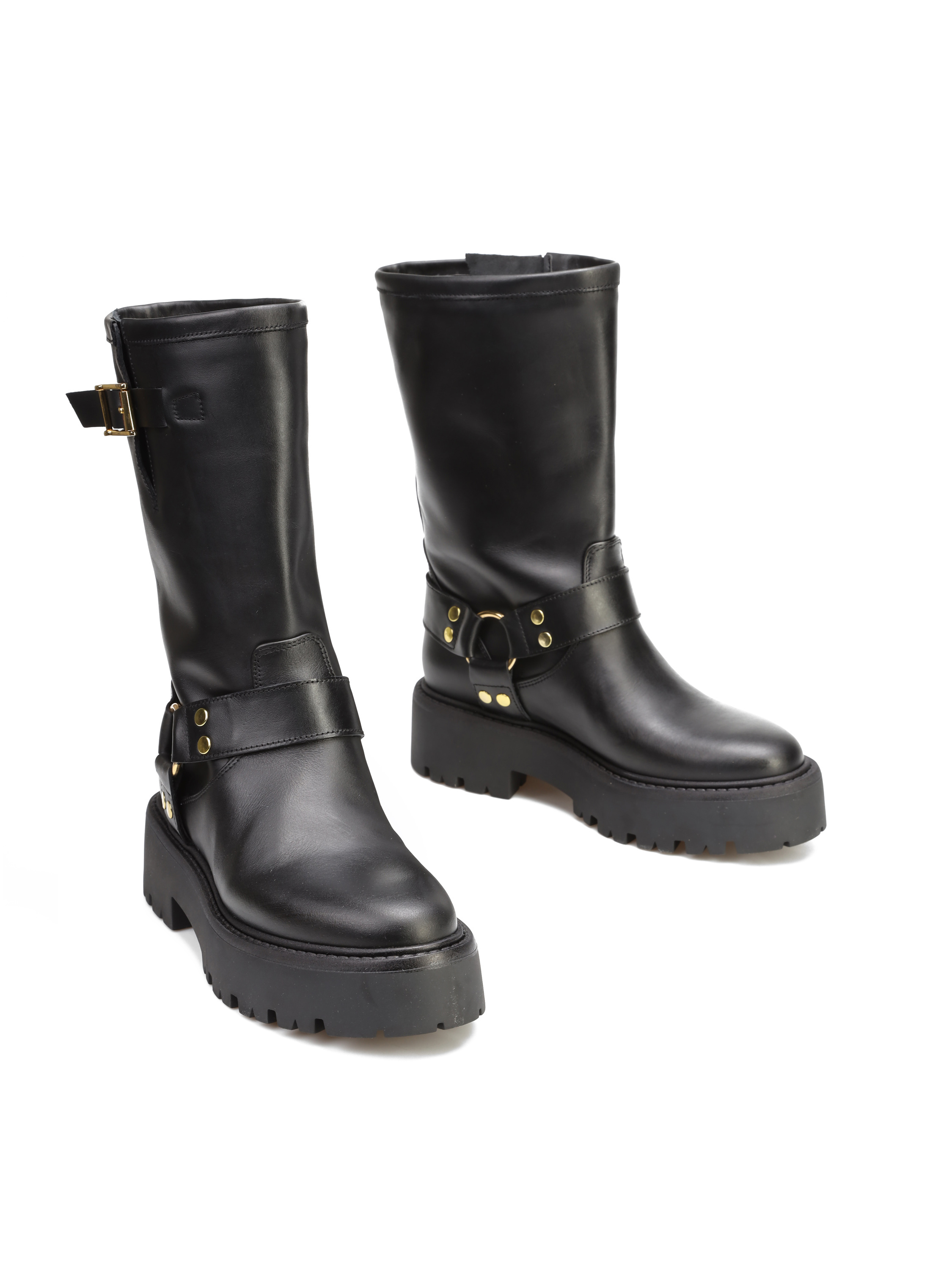 Krótkie kozaki to gorący Trend sezonu. Prosta, wsuwana cholewka w czarnym kolorze wykonana jest z naturalnej skóry. Ozdobiona została złotymi klamrami. Stylowy model będzie uzupełnienim Twoich stylizacji.