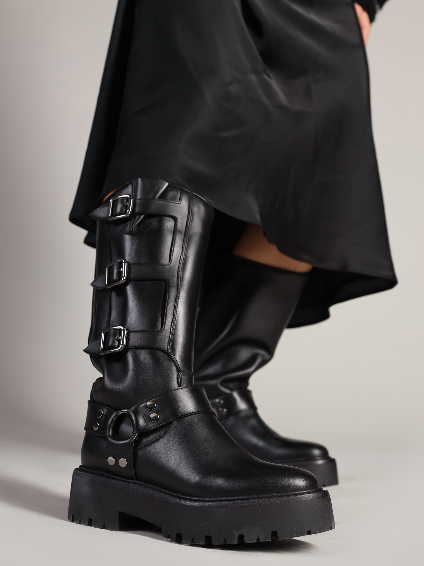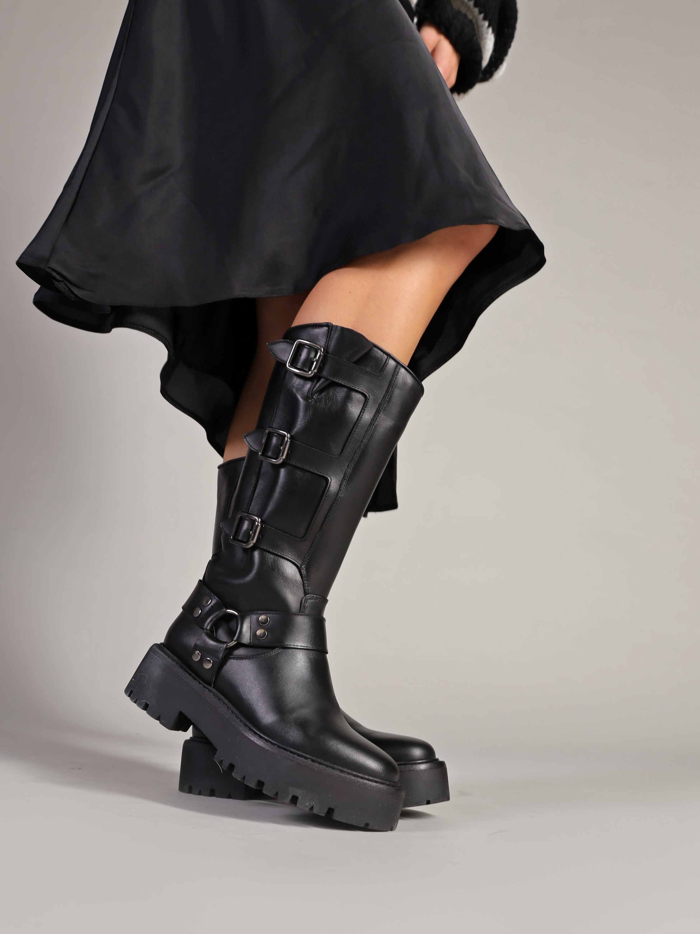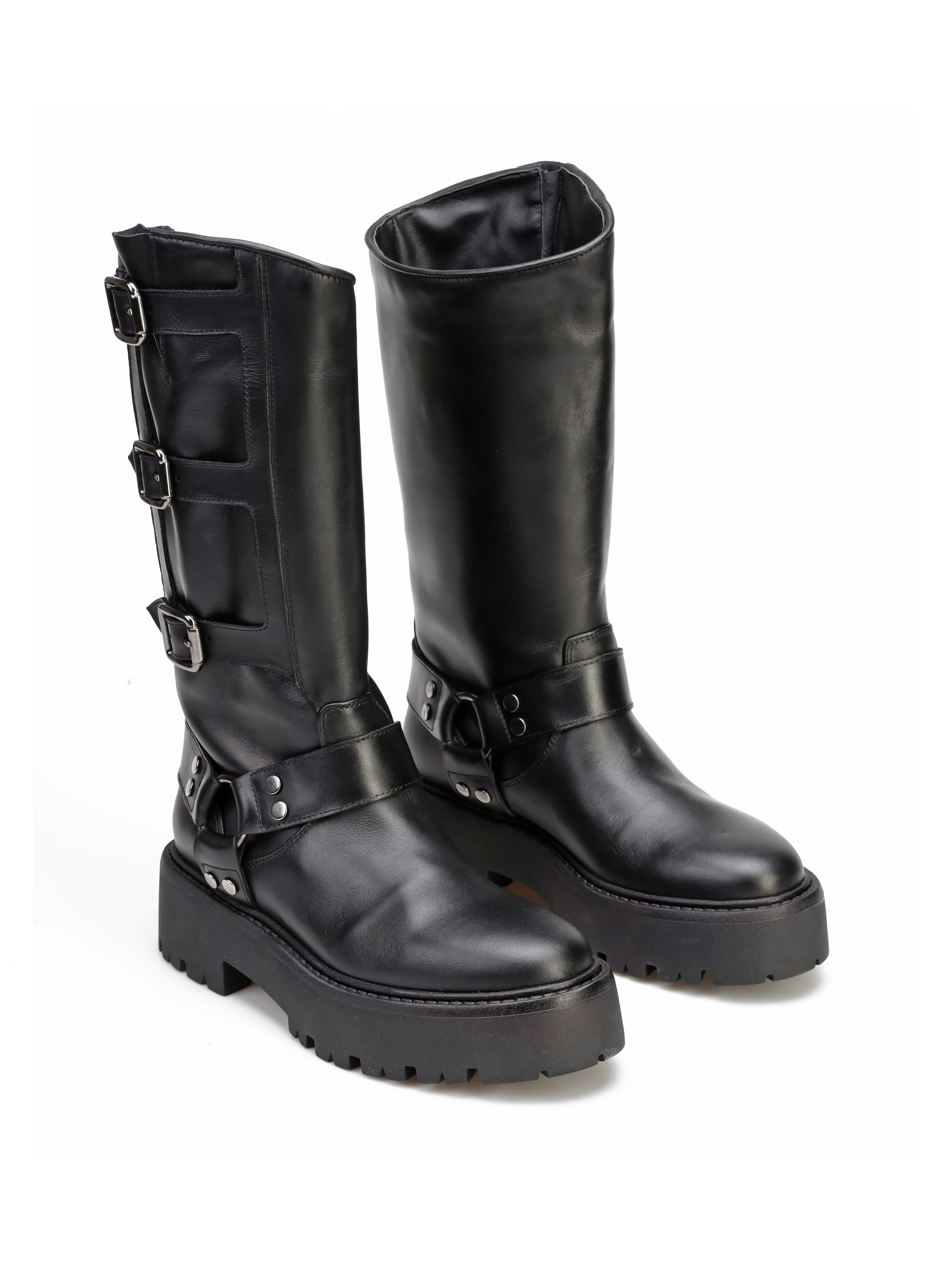 Kozaki na grubej podeszwie to gorący Trend sezonu. Wysoka, wsuwana cholewka wykonana jest z naturalnej skóry. Ozdobiona została srebrnymi klamrami. Stylowy i wygodny model będzie uzupełnieniem modnej garderoby kobiety.