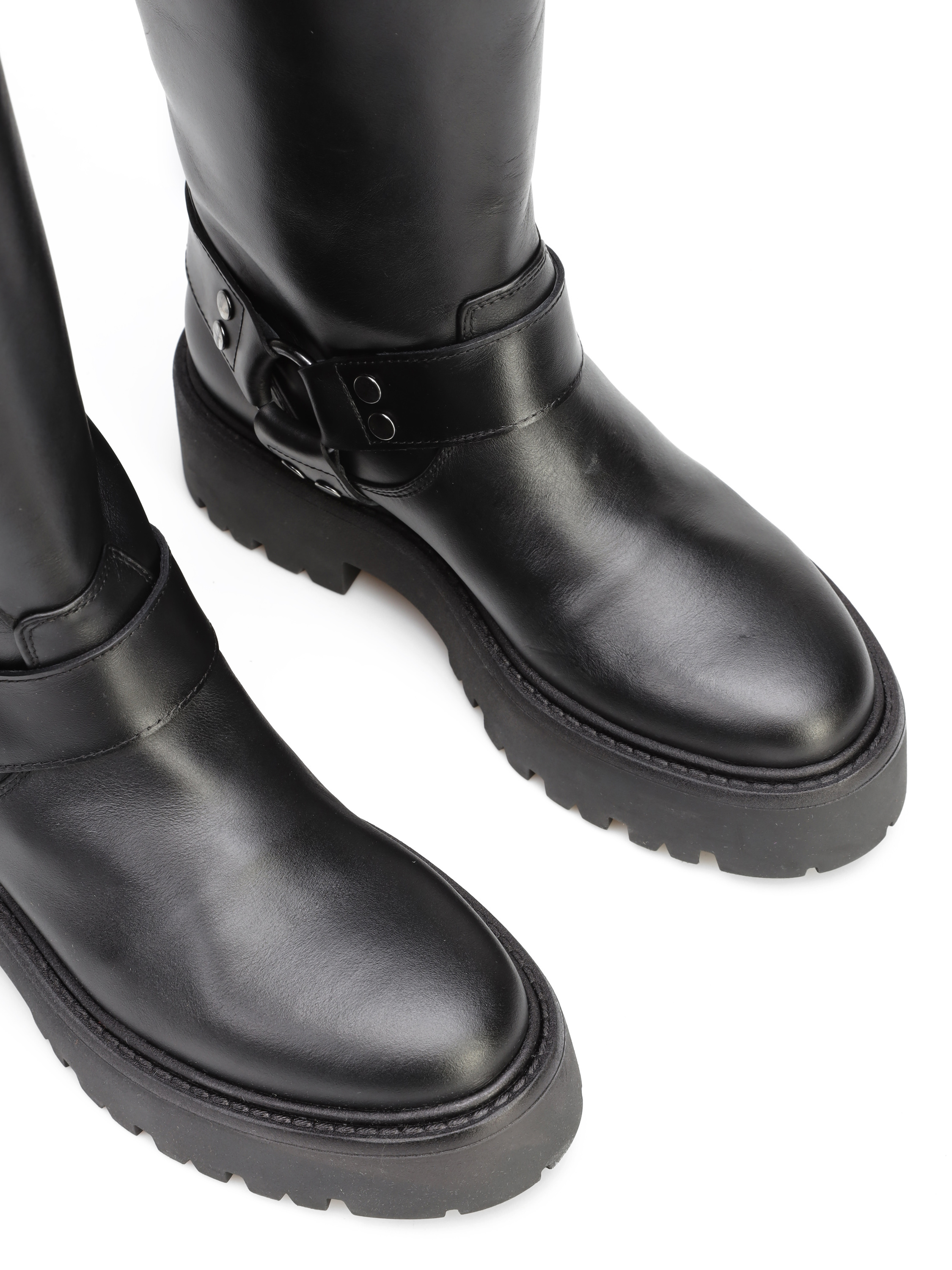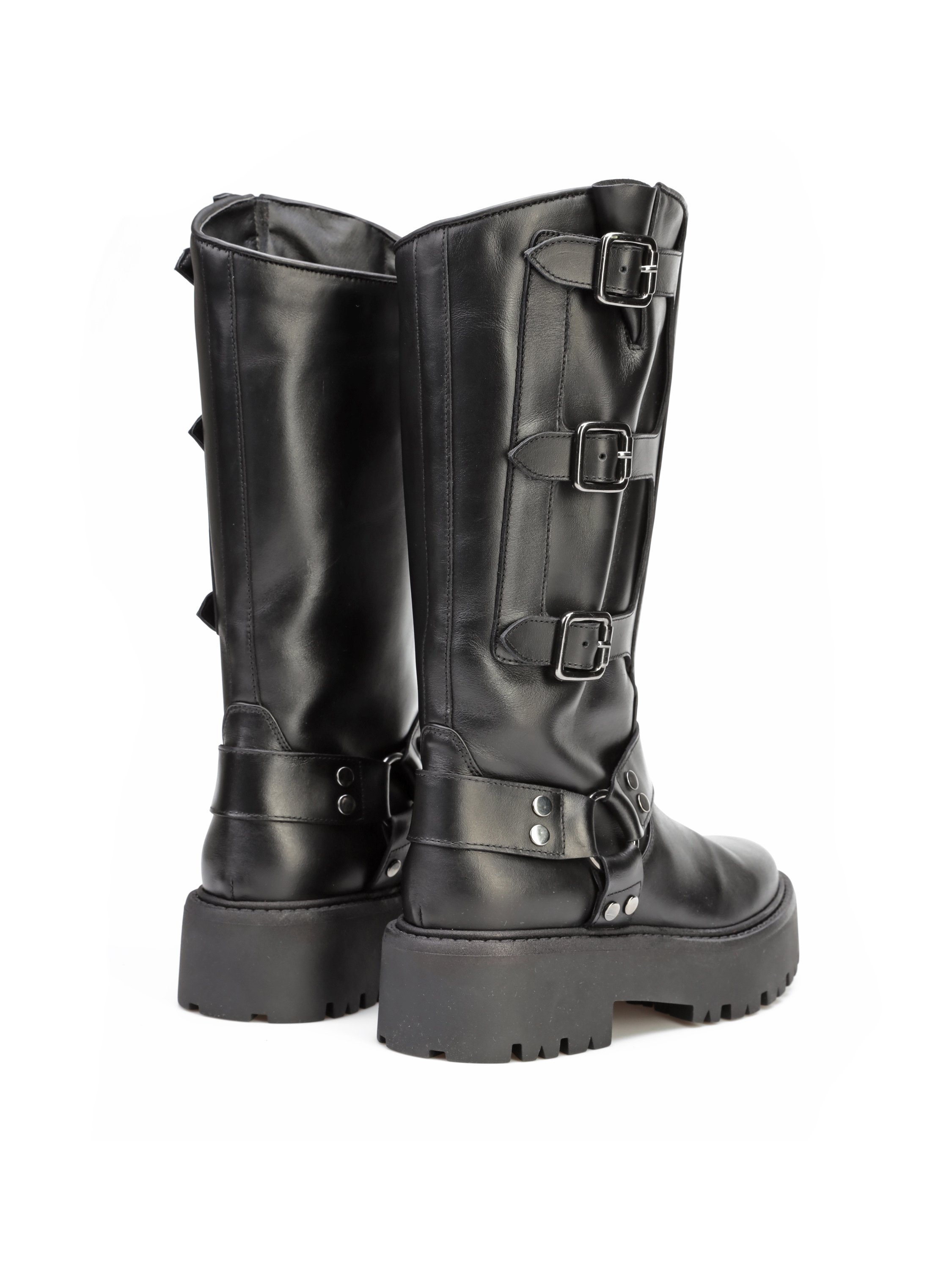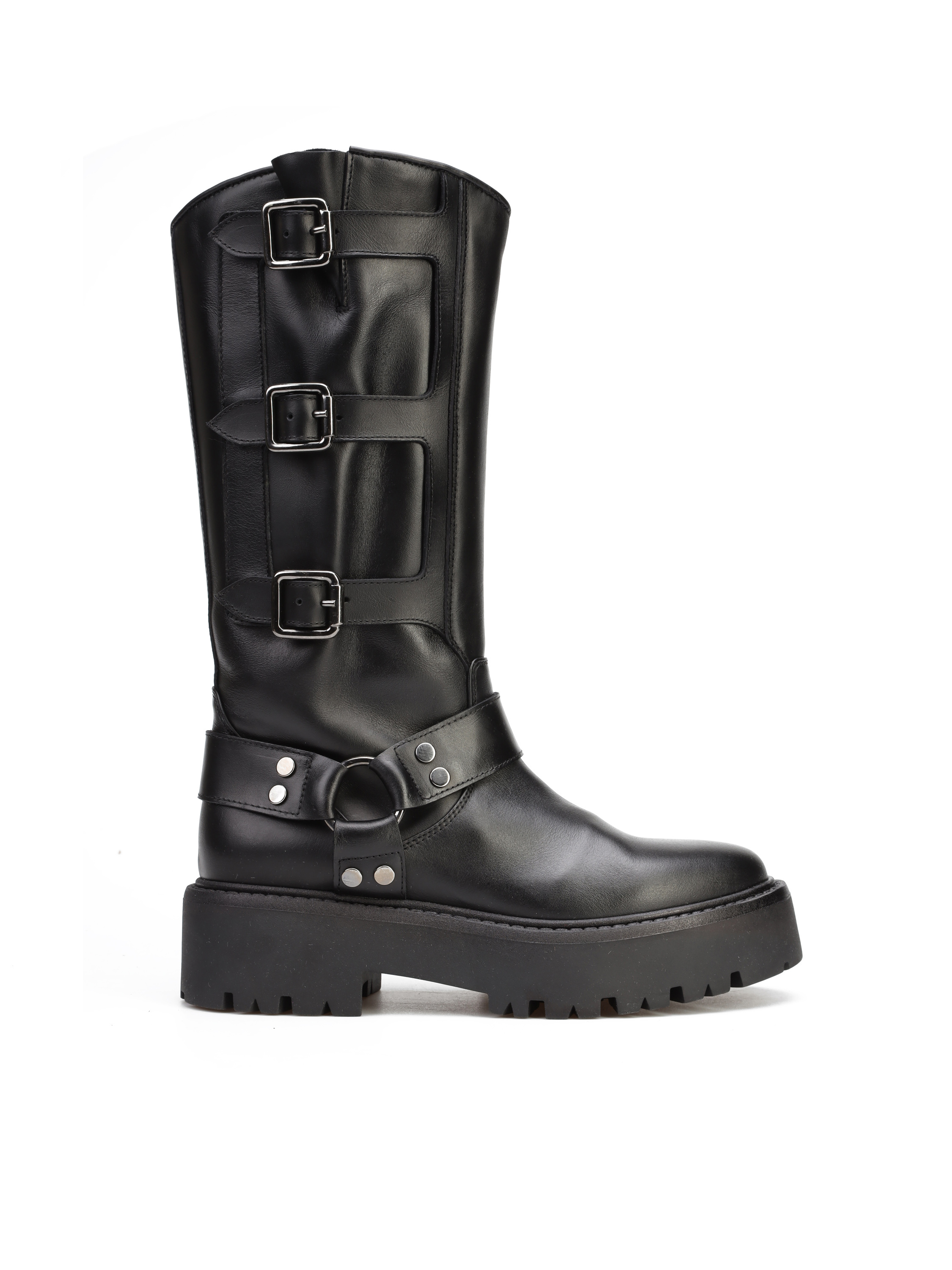Kozaki na grubej podeszwie to gorący Trend sezonu. Wysoka, wsuwana cholewka wykonana jest z naturalnej skóry. Ozdobiona została srebrnymi klamrami. Stylowy i wygodny model będzie uzupełnieniem modnej garderoby kobiety.