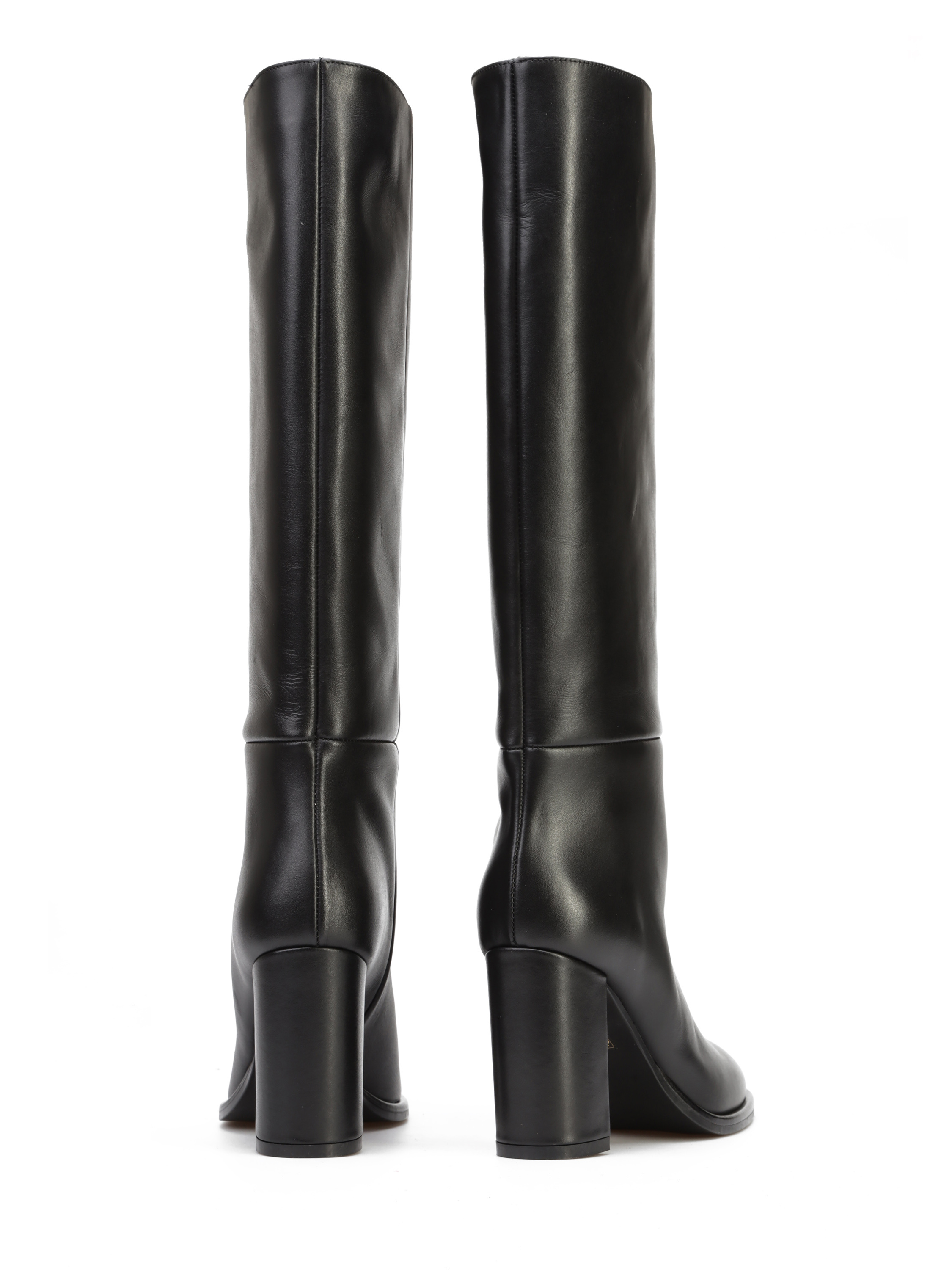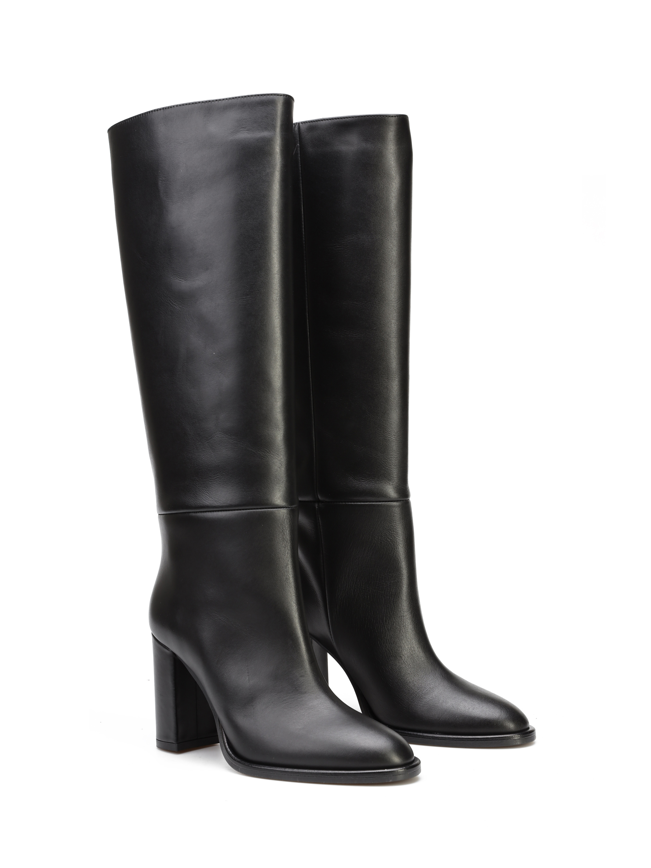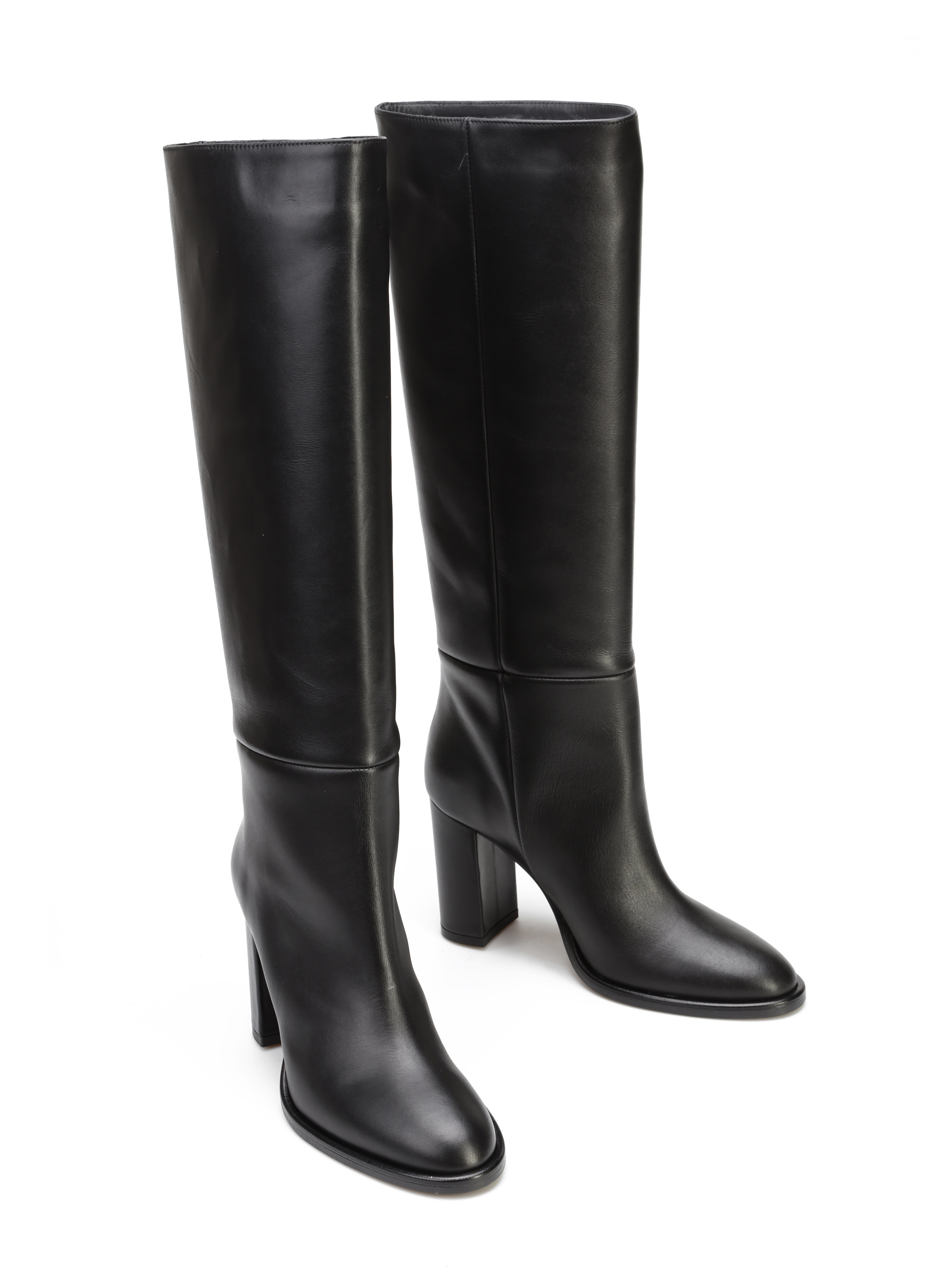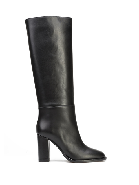 Wysokie kozaki to Trend nie tylko tego sezonu. Prosta, wsuwana cholewka w czarnym kolorze wykonana jest z włoskiej, naturalnej skóry. Model osadzony na wygodnym obcasie na słupku. Prosty fason będzie uzupełnieniem modnej garderoby kobiety.
