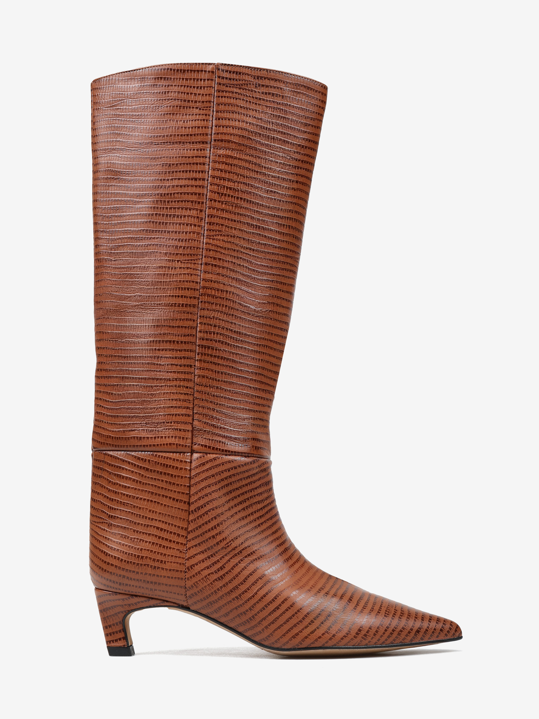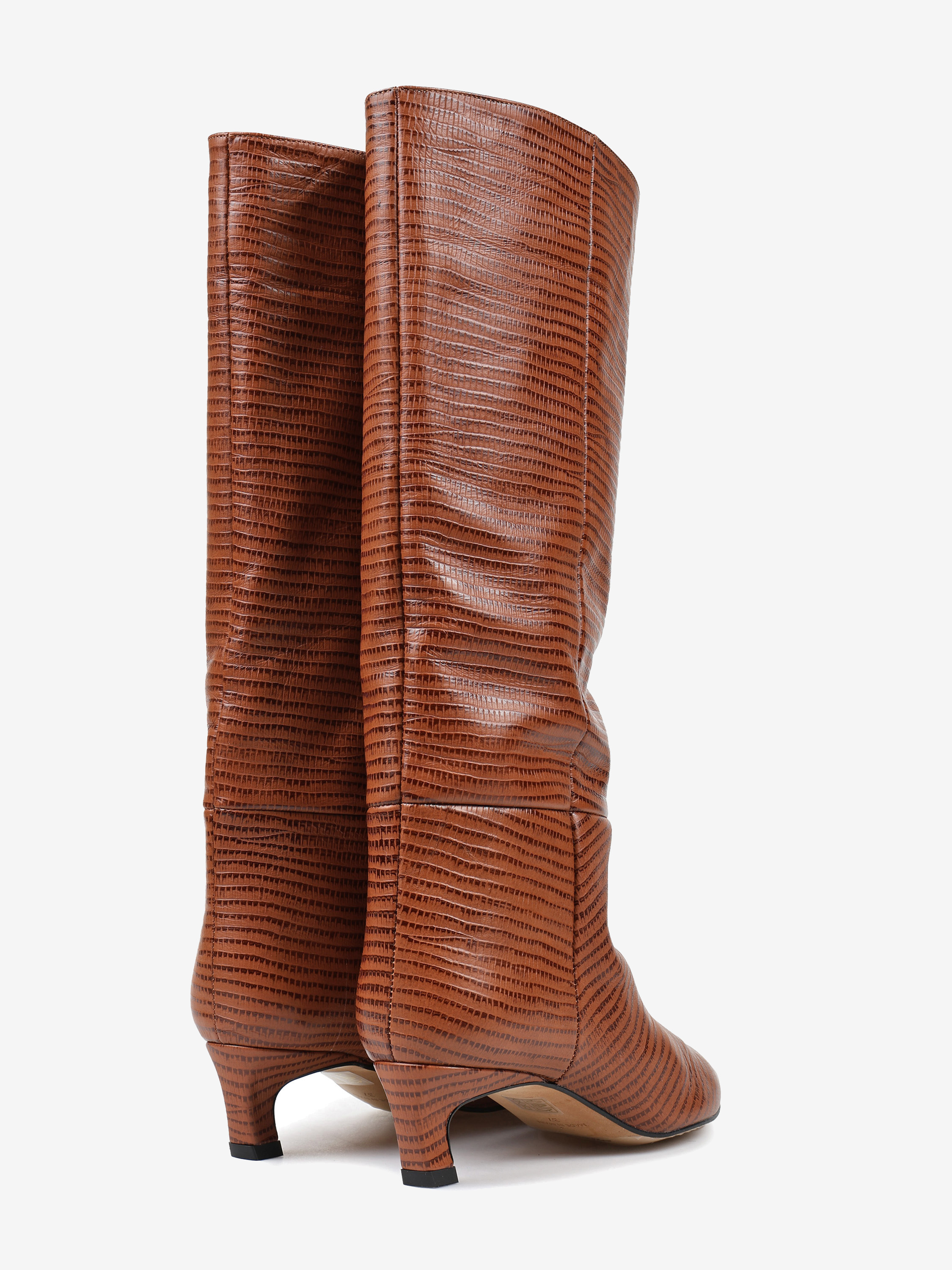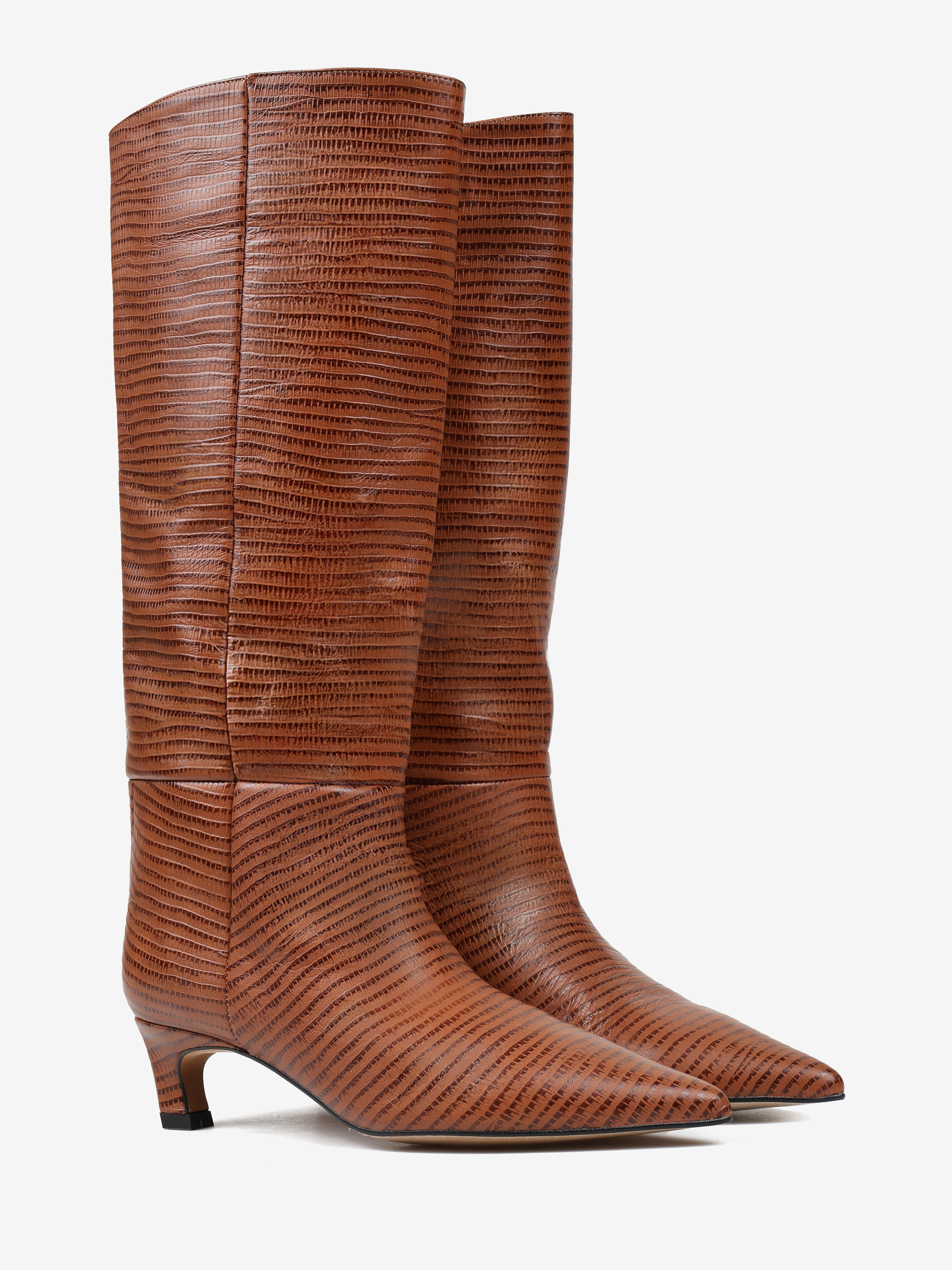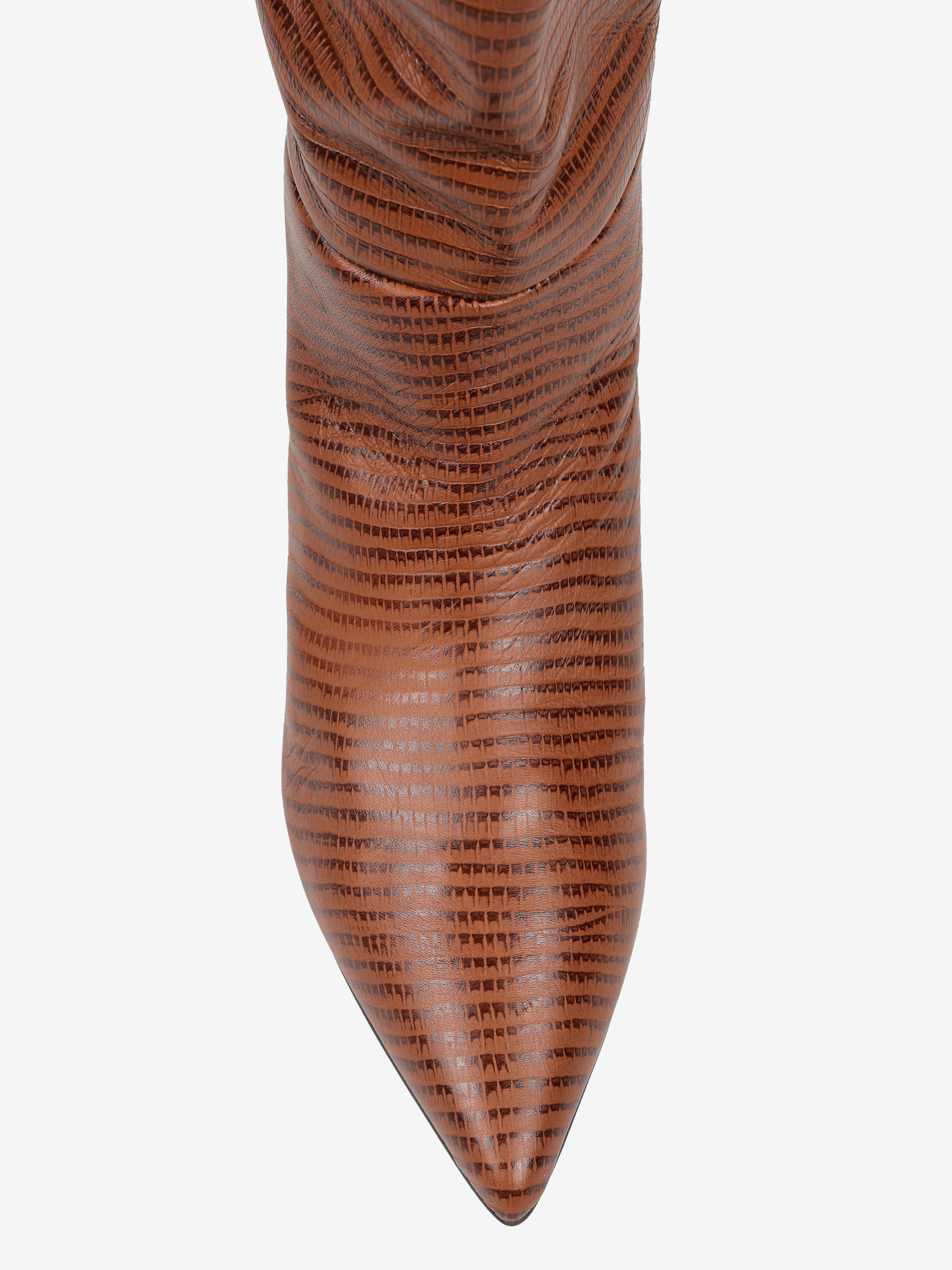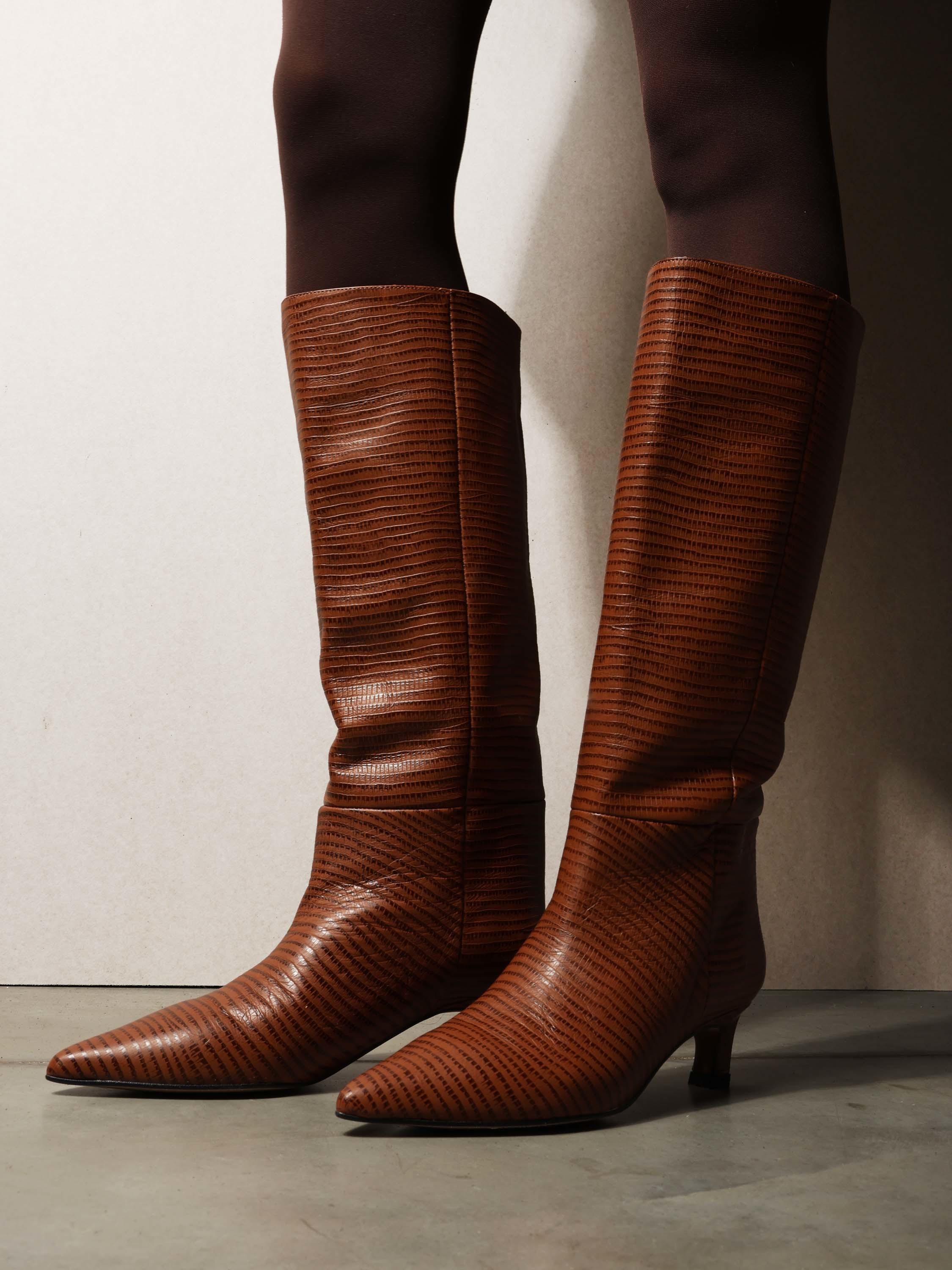 Kozaki na szpilce wykonane z rudej skóry tłoczonej w wężowy wzór. Rozszerzana cholewka i noski w szpic.
