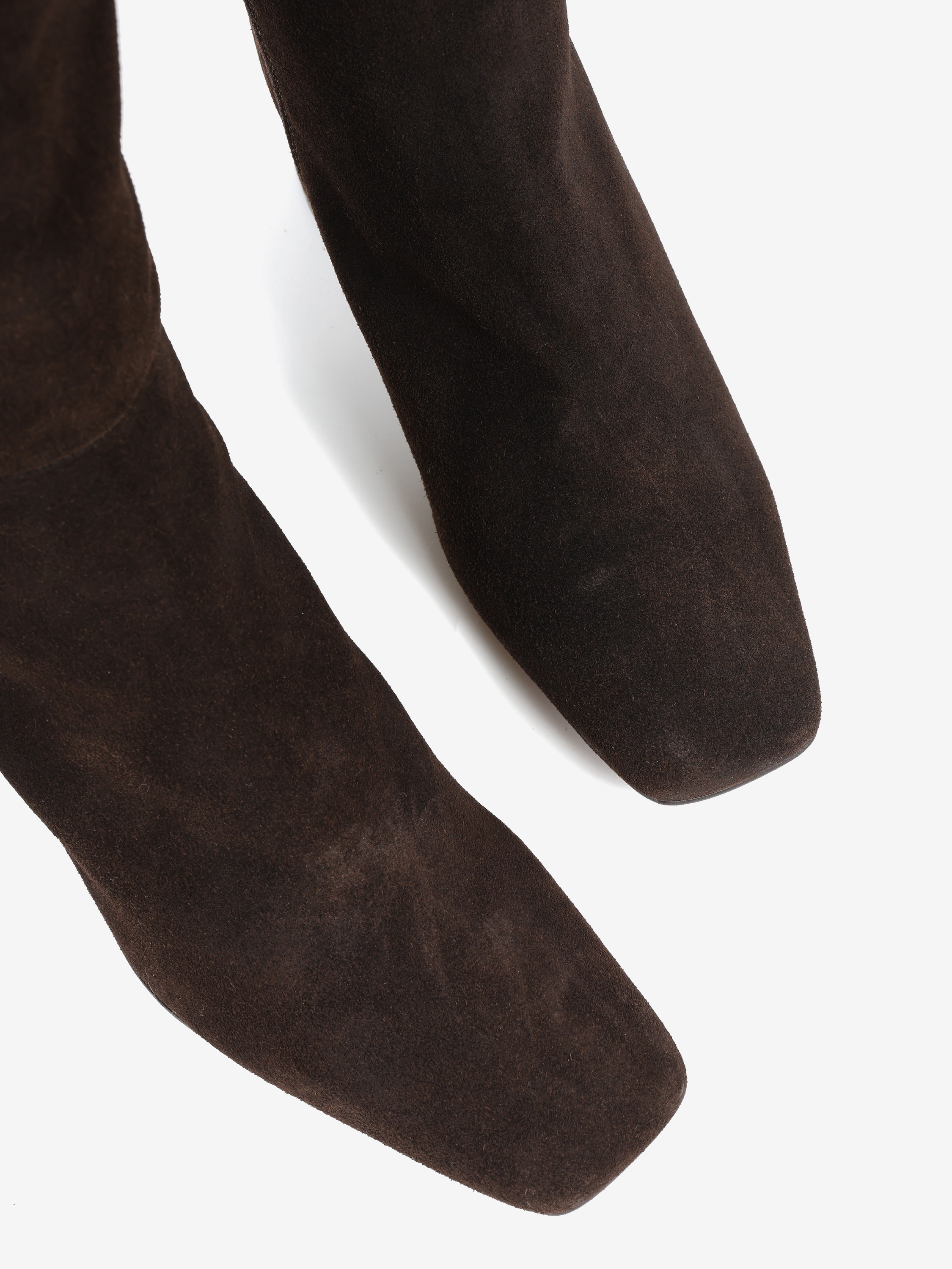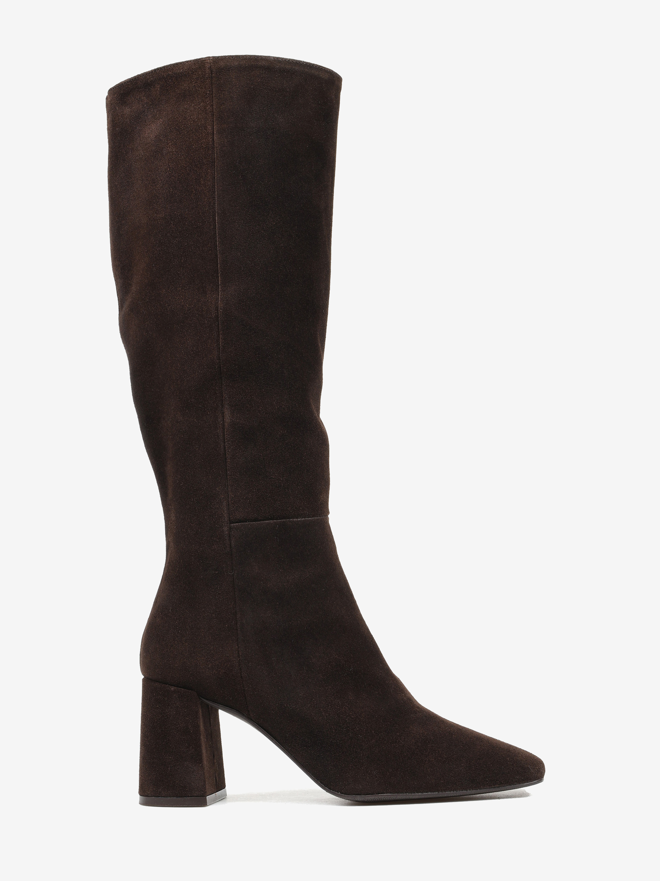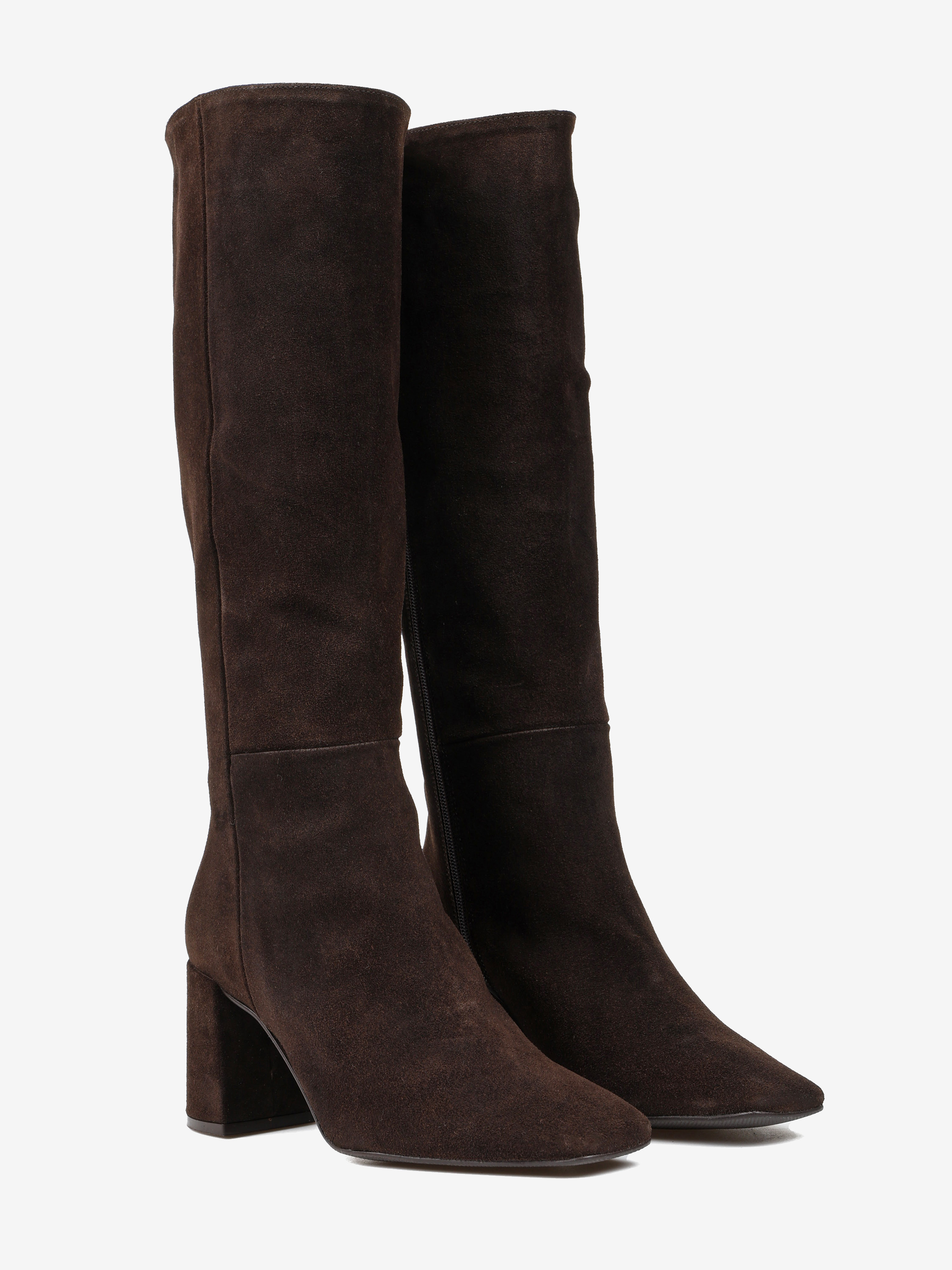 Zamszowe kozaki na słupku. Kwadratowe noski i zapięcie na suwak.