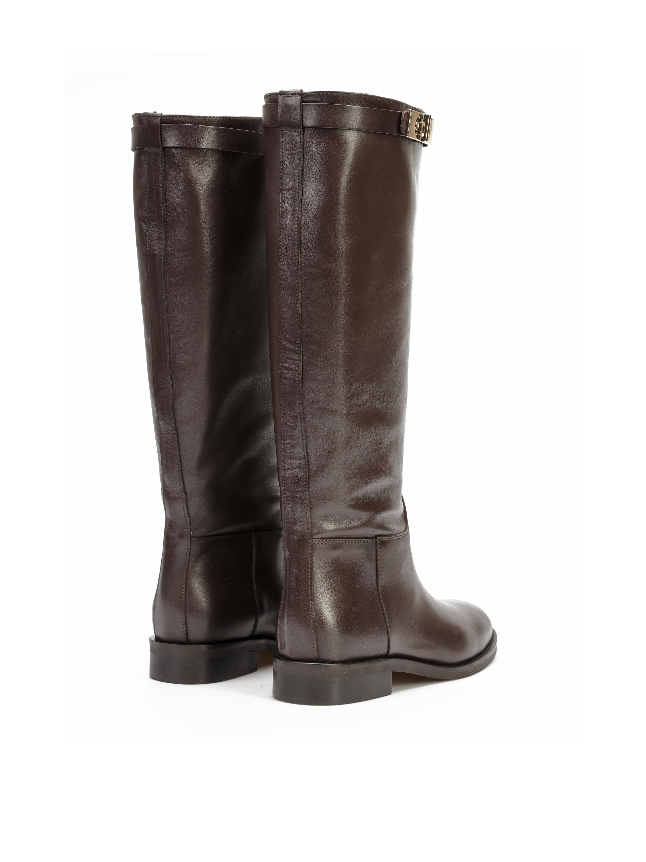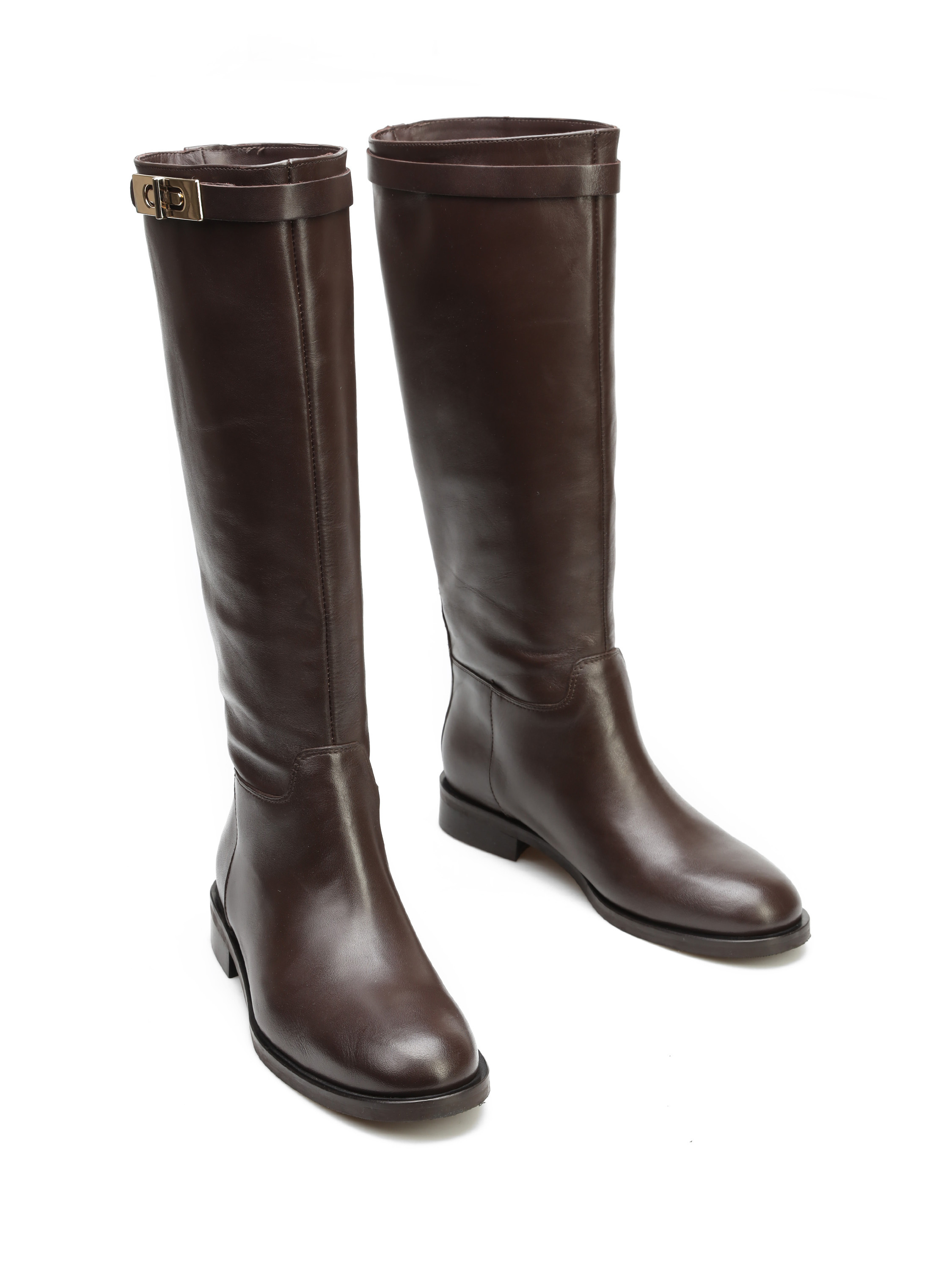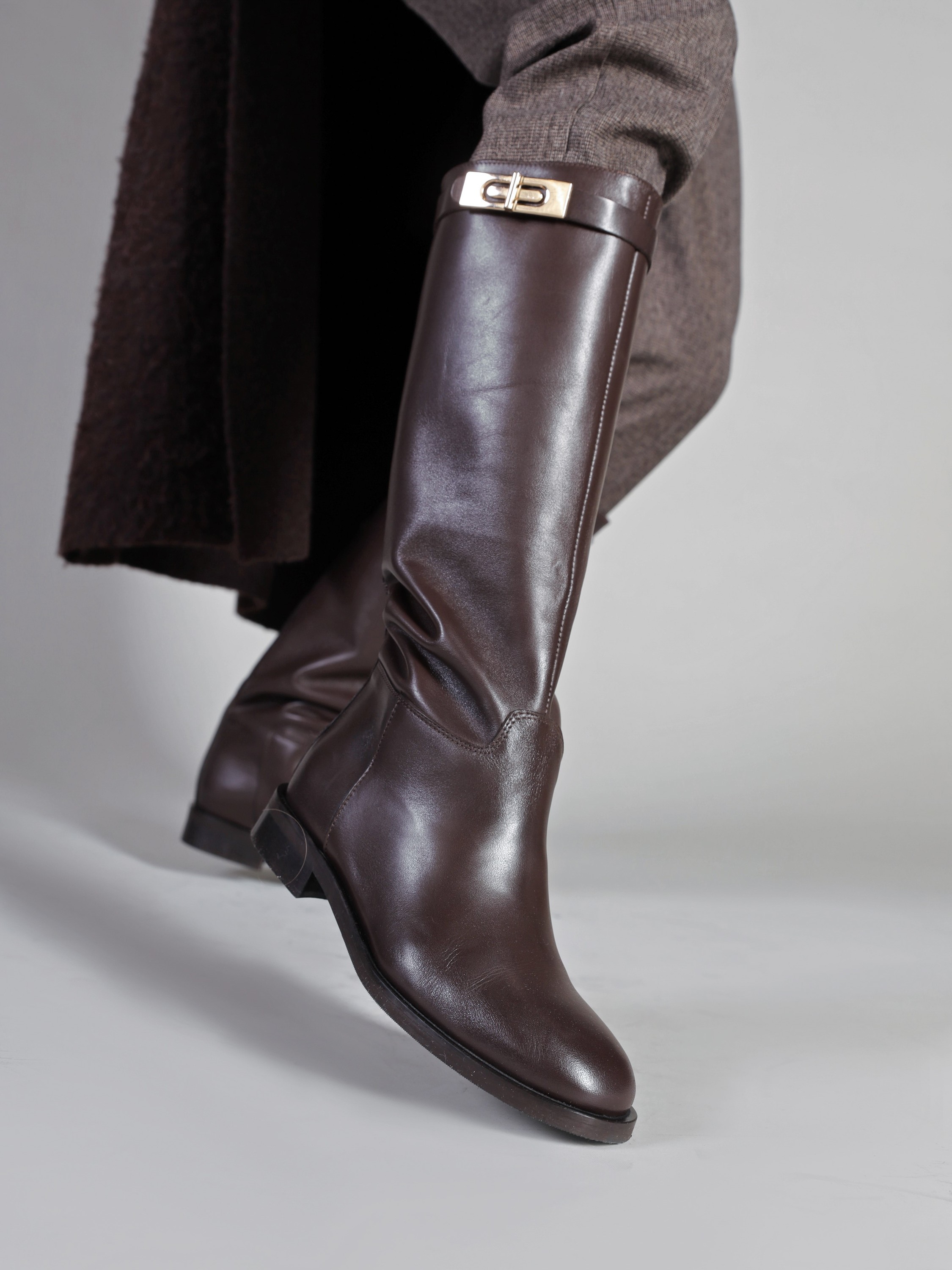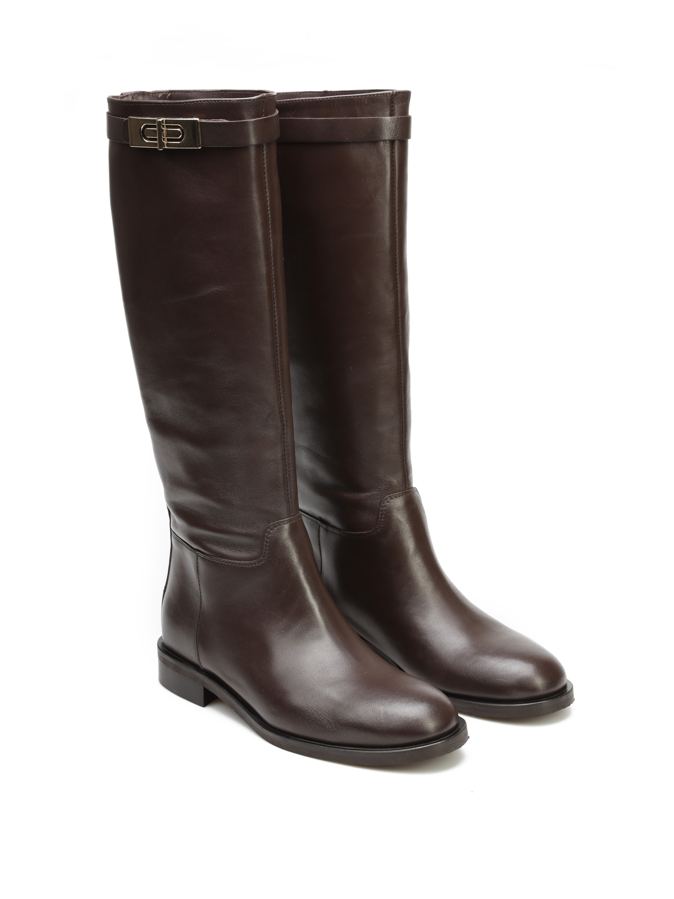 Wysokie kozaki na płaskim obcasie wykonane są z naturalnej, włoskiej skóry. Prosta cholewka w czekoladowym kolorze ozdobiona została paskiem ze złotą sprzączką. Klasyczny, prosty fason będzie uzupełnieniem Twojej garderoby.