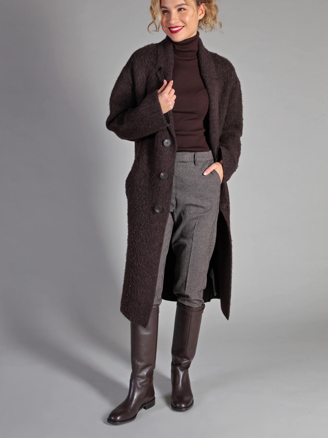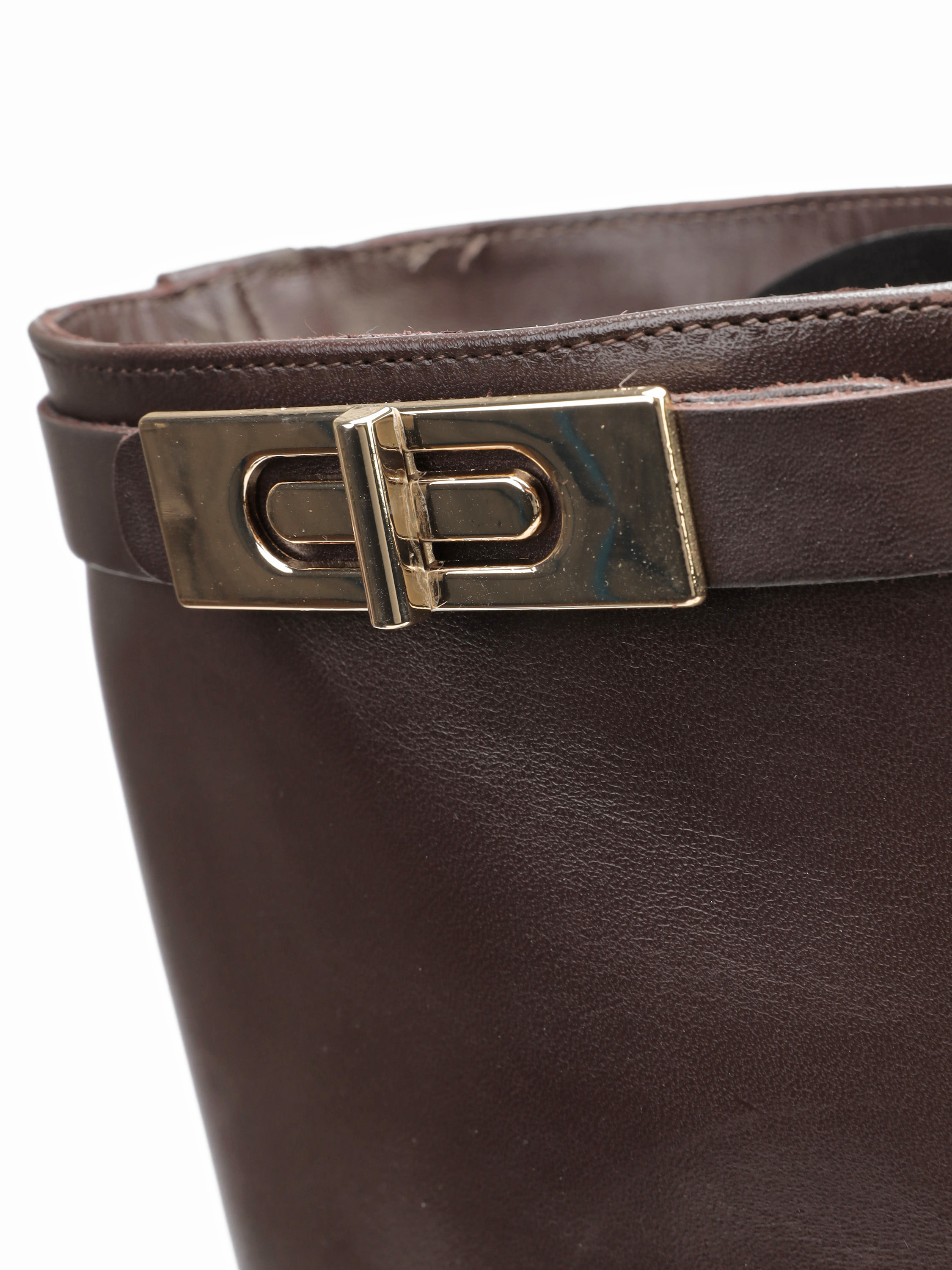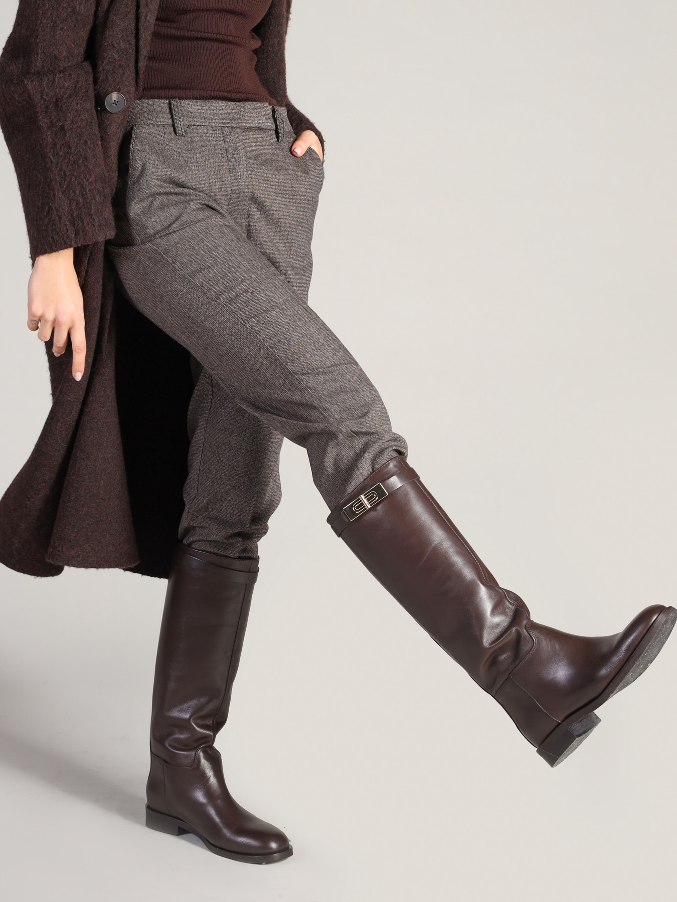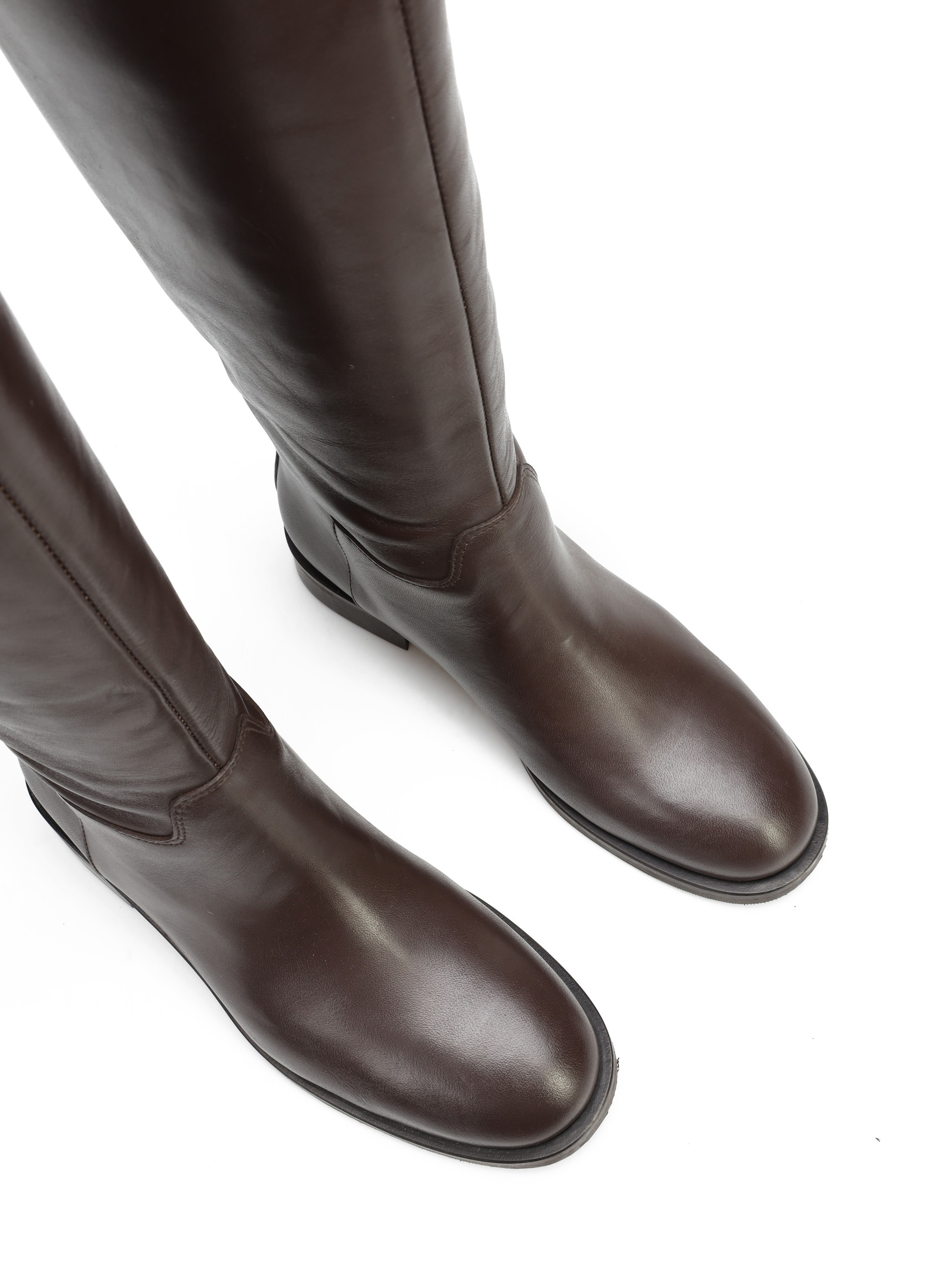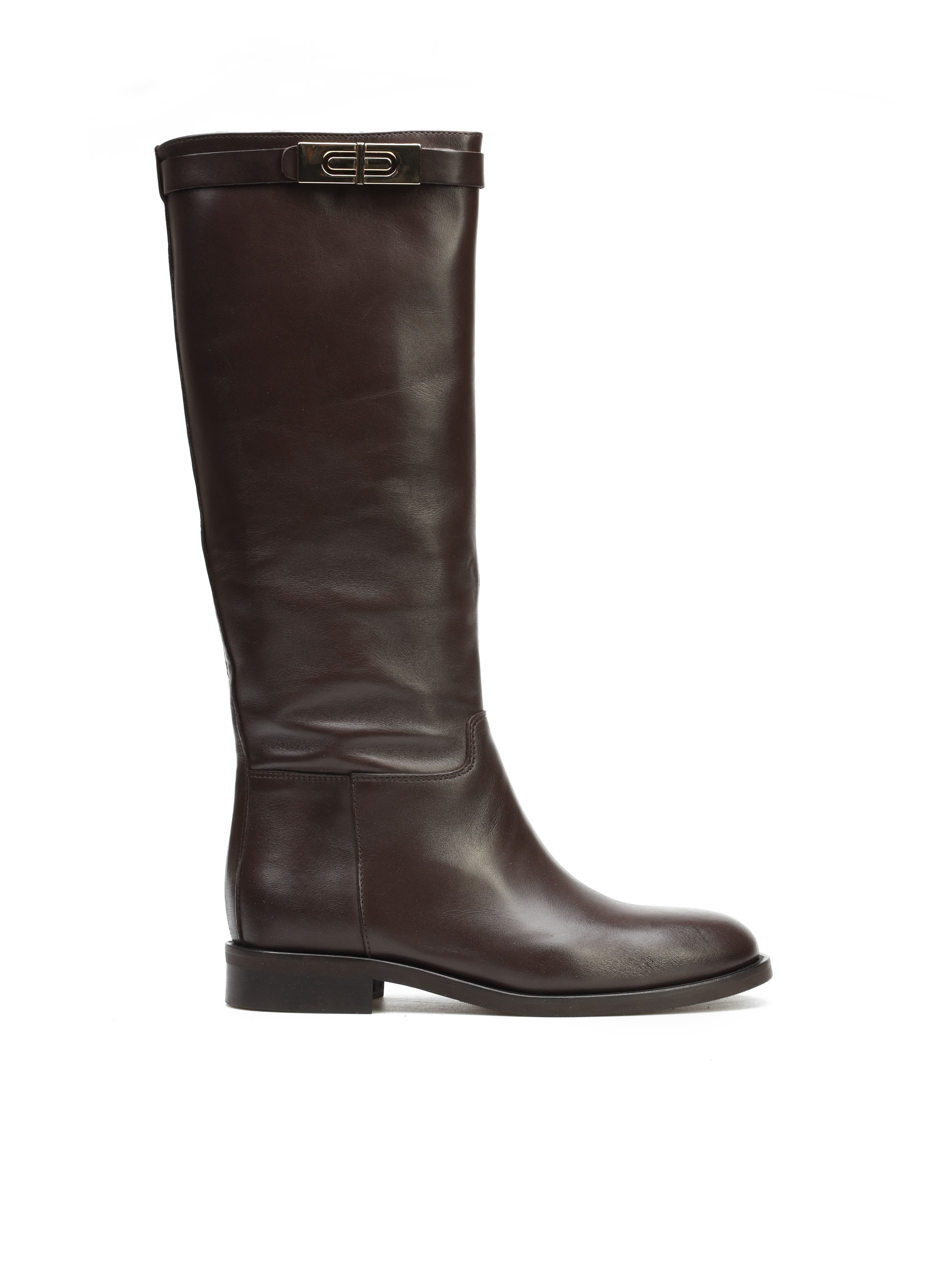 Wysokie kozaki na płaskim obcasie wykonane są z naturalnej, włoskiej skóry. Prosta cholewka w czekoladowym kolorze ozdobiona została paskiem ze złotą sprzączką. Klasyczny, prosty fason będzie uzupełnieniem Twojej garderoby.