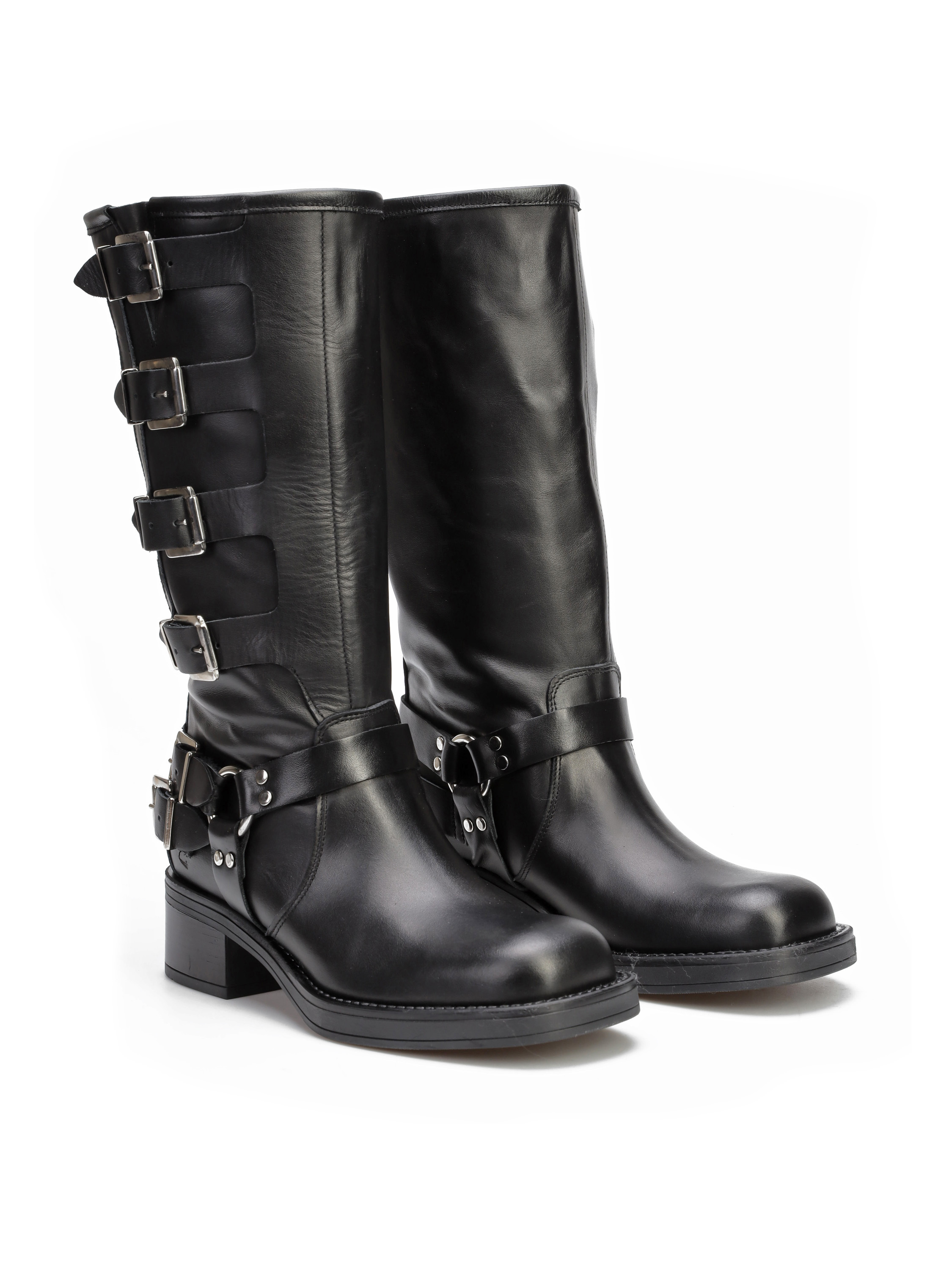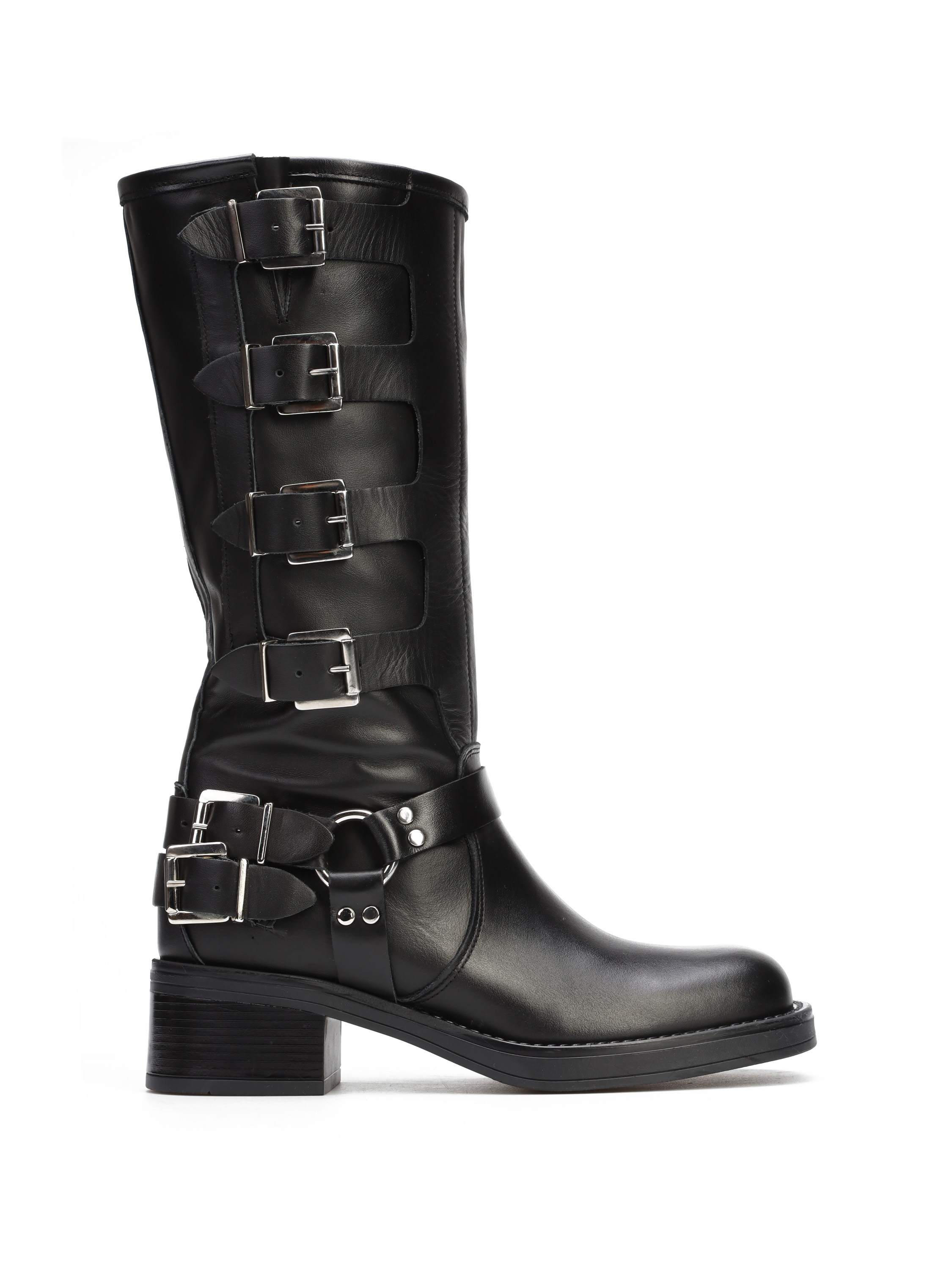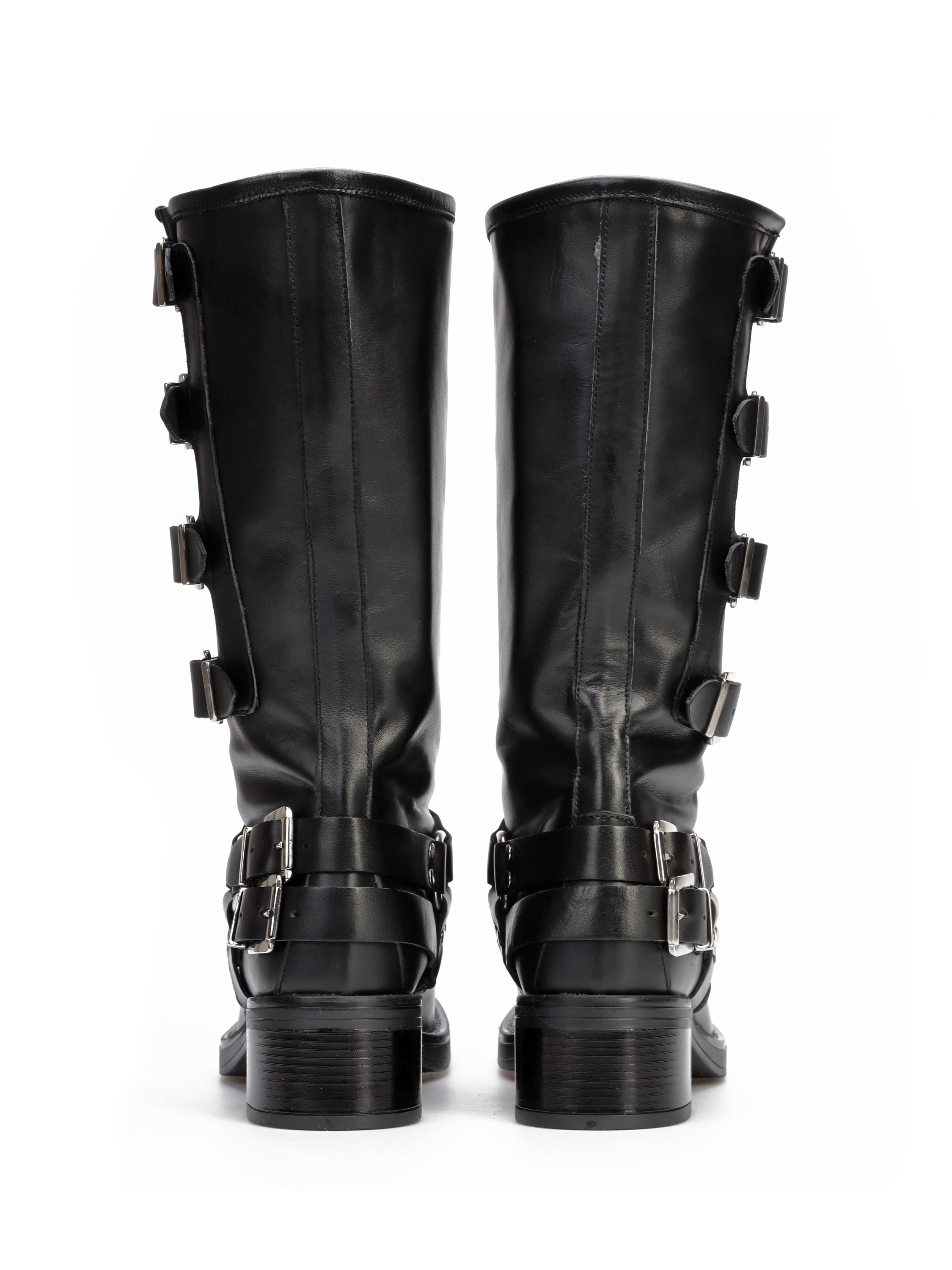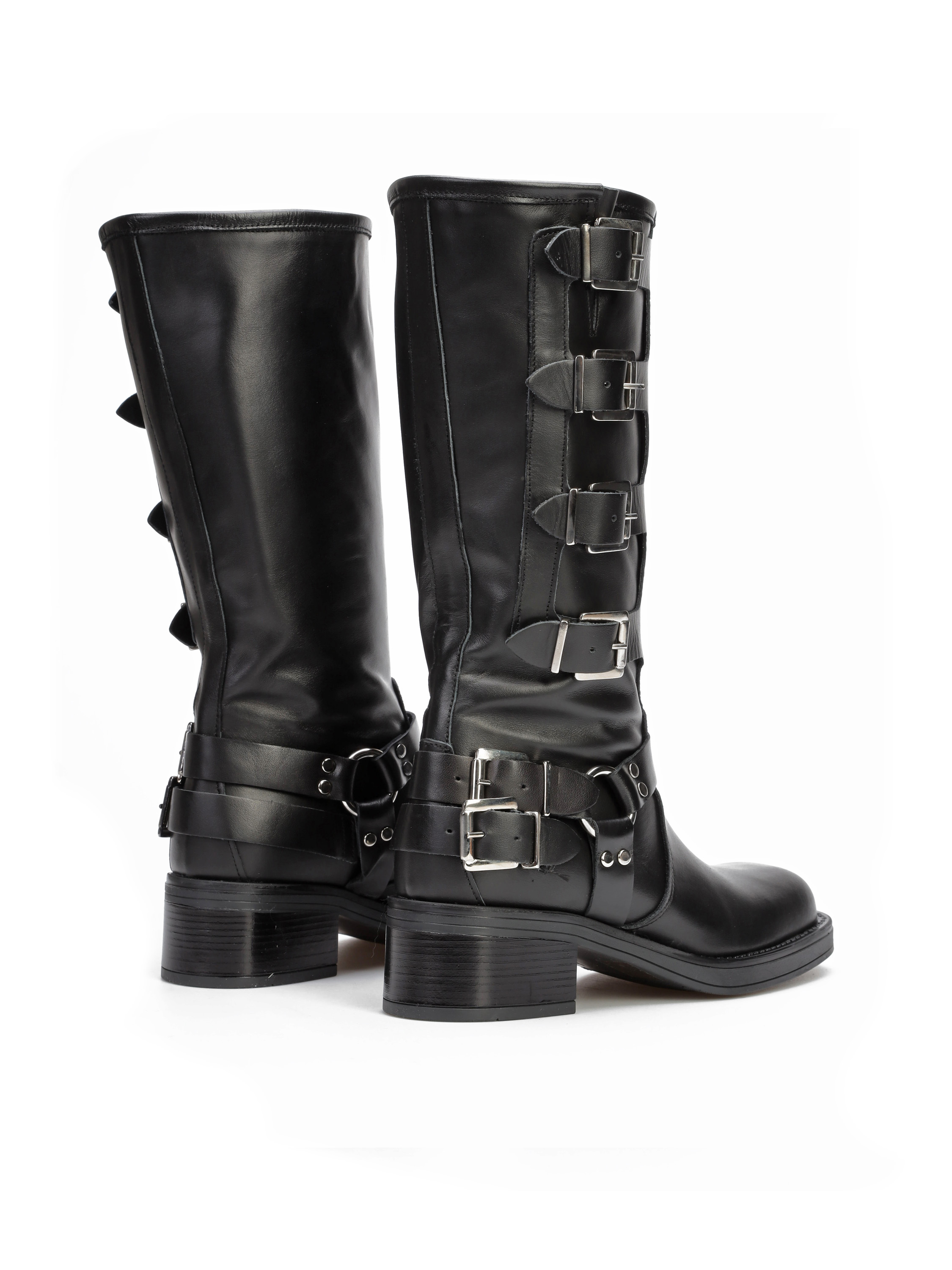 Wysokie kozaki to must have sezonu. Prosta, wsuwana cholewka wykonana jest z naturalnej skóry. Ozdobiona została srebrnymi klamrami. Model w czarnym kolorze z kwadratowym noskiem i wygodnym obcasem na słupku.