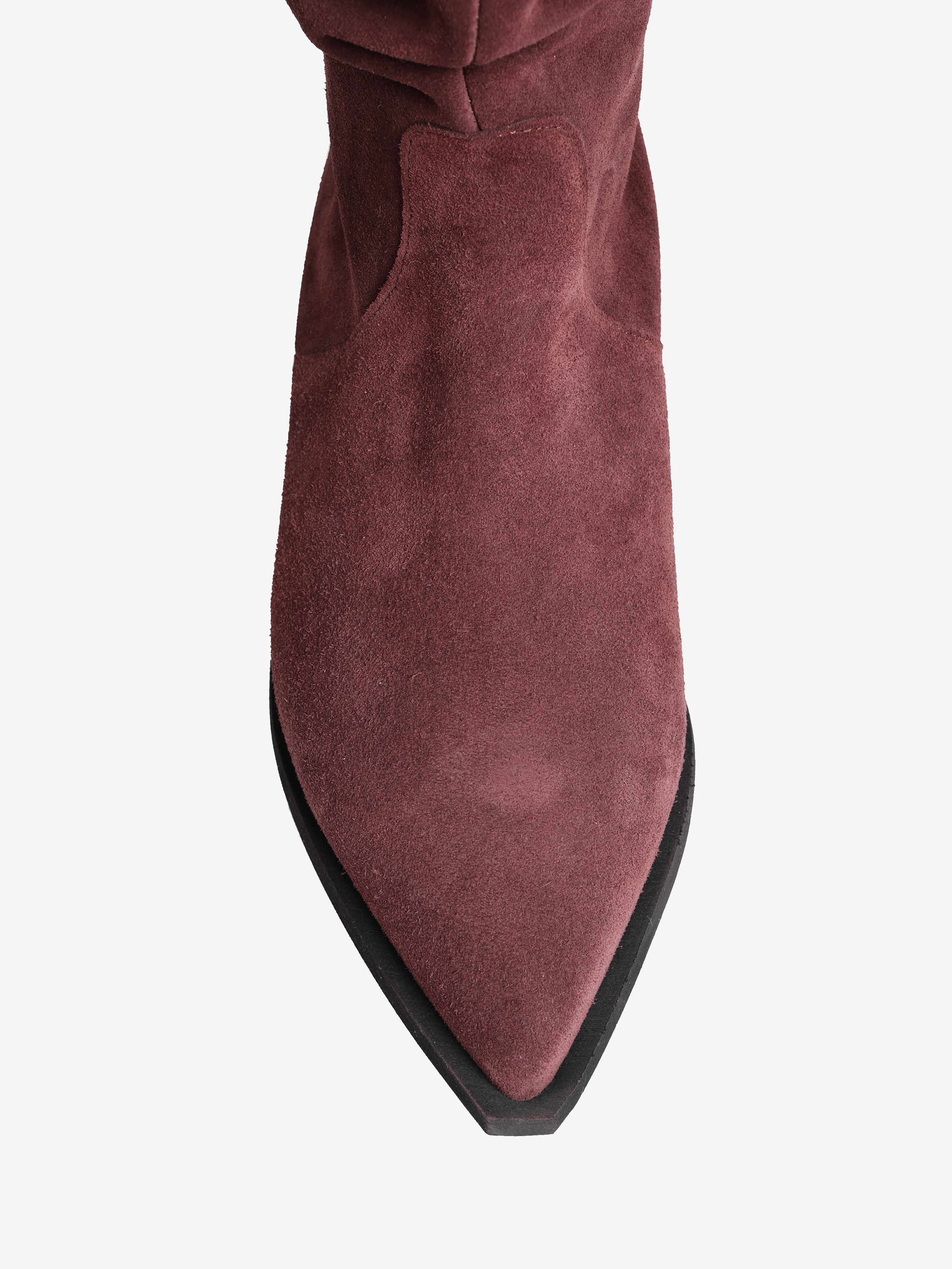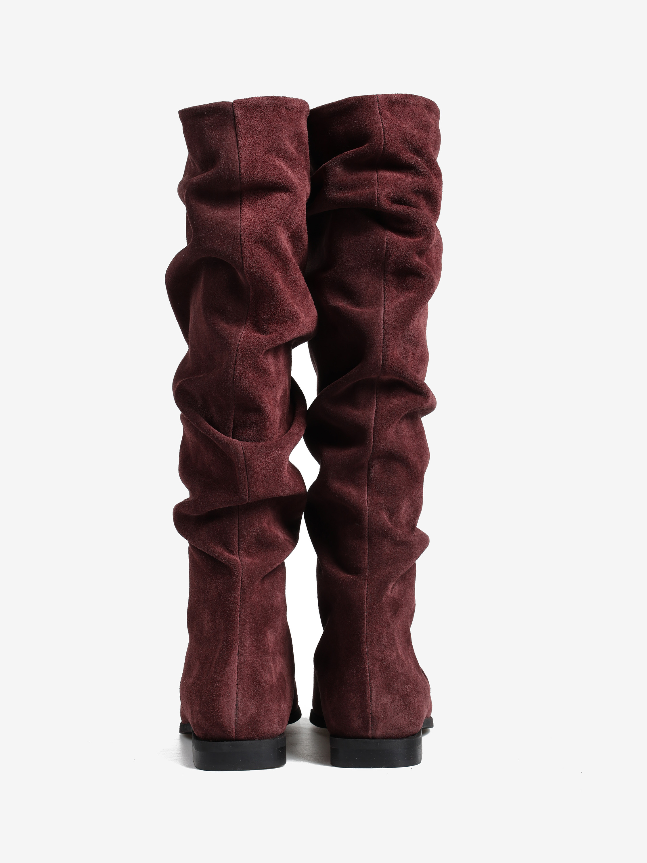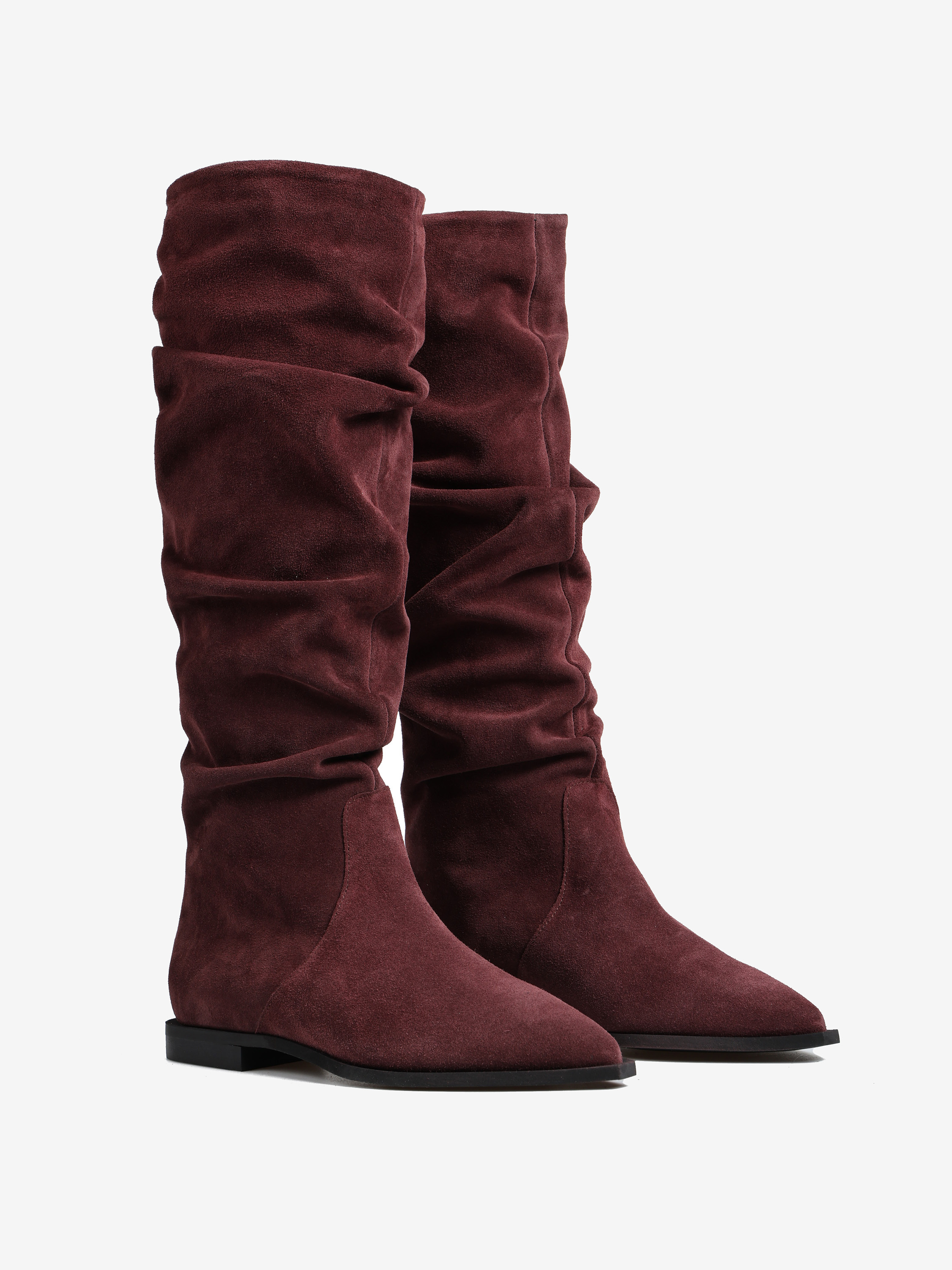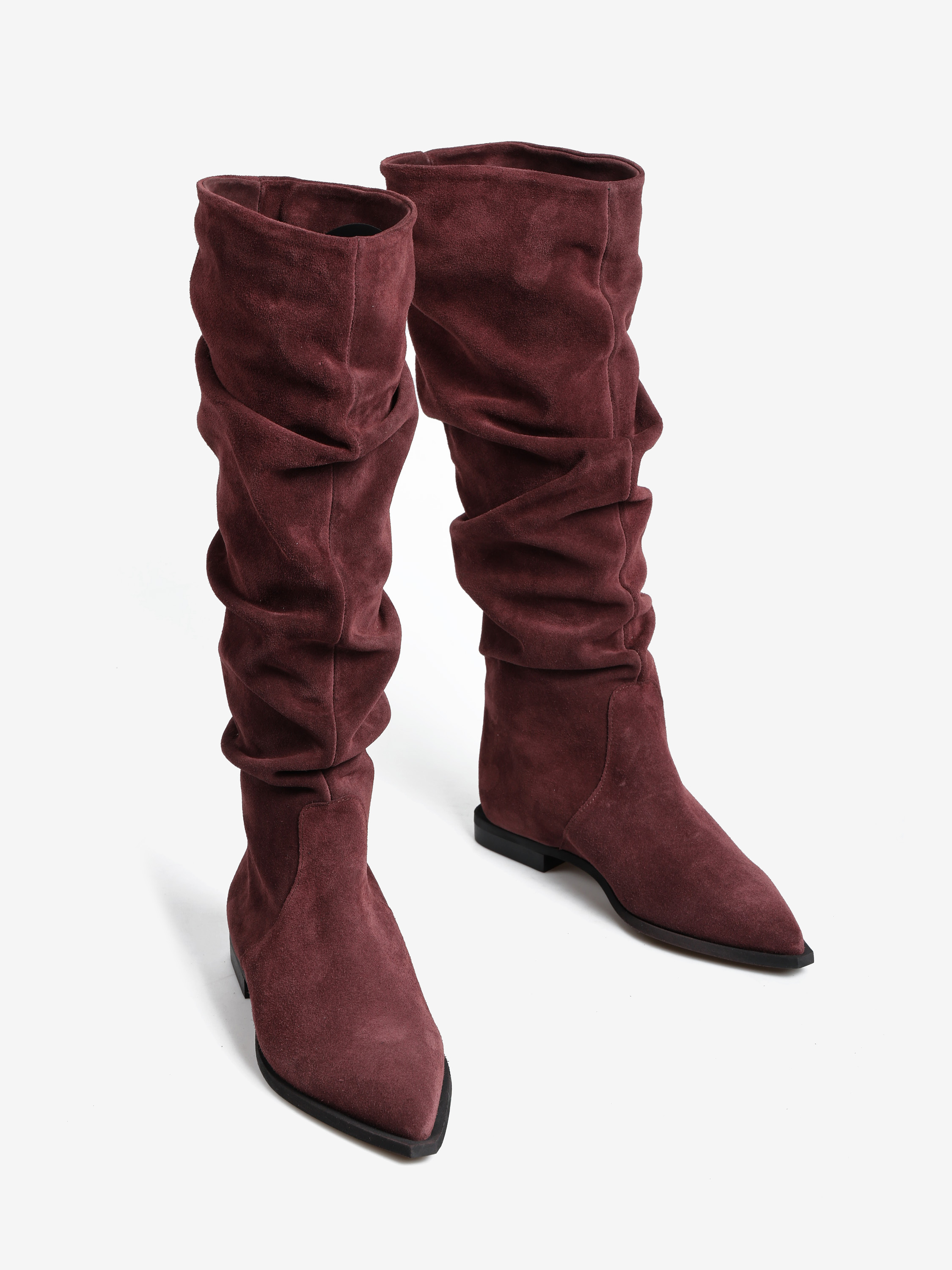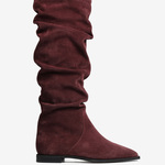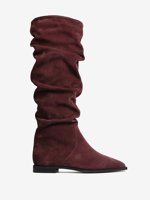 Zamszowe, wsuwane kozaki z noskami w szpic i marszczonymi cholewkami.
