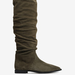 Zamszowe, wsuwane kozaki z noskami w szpic i marszczonymi cholewkami.