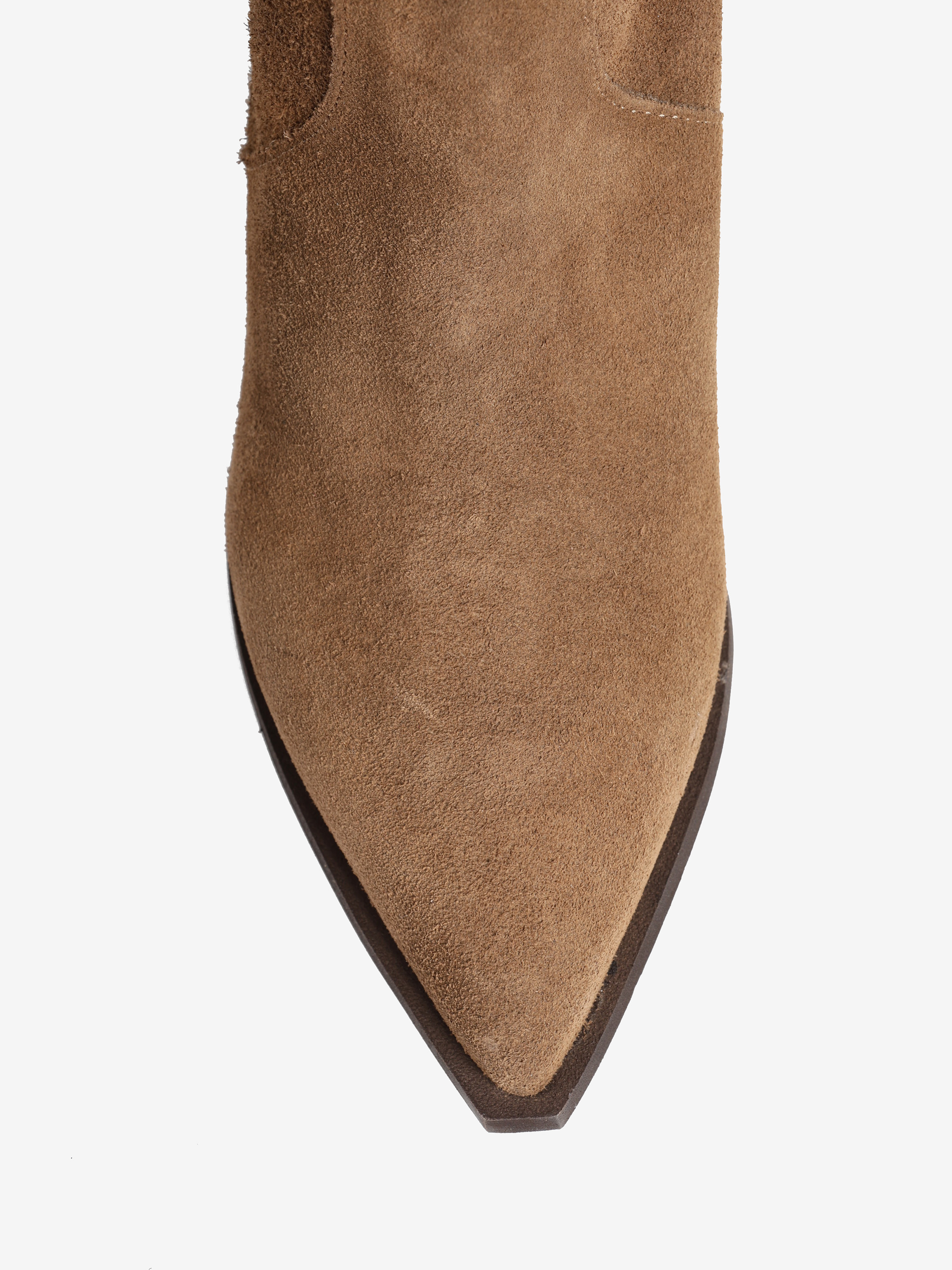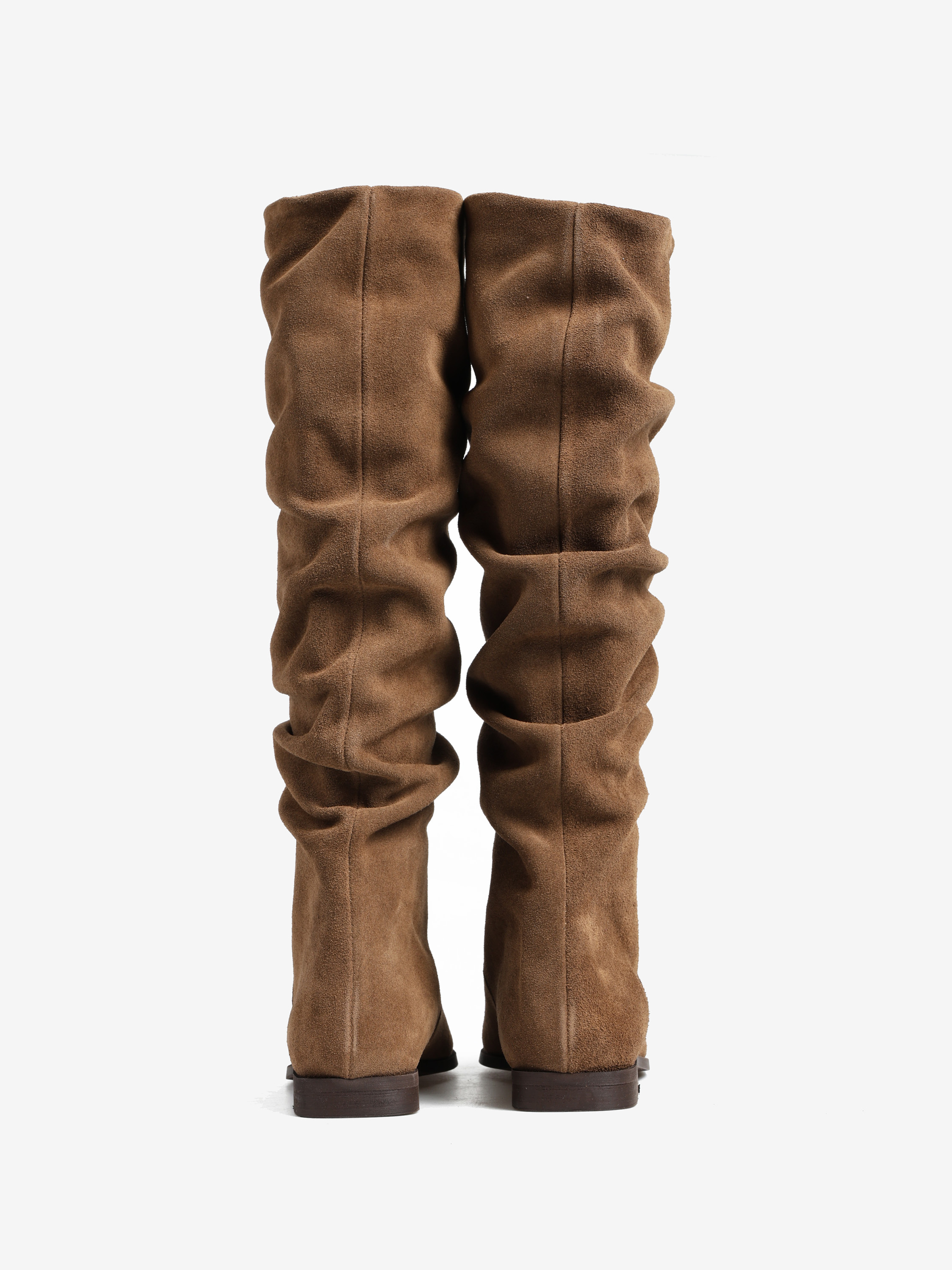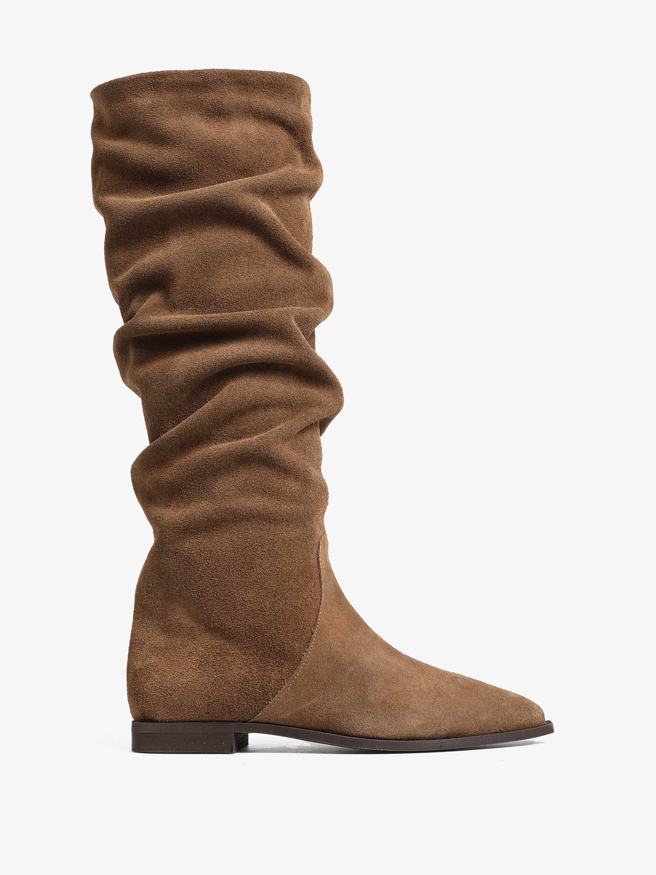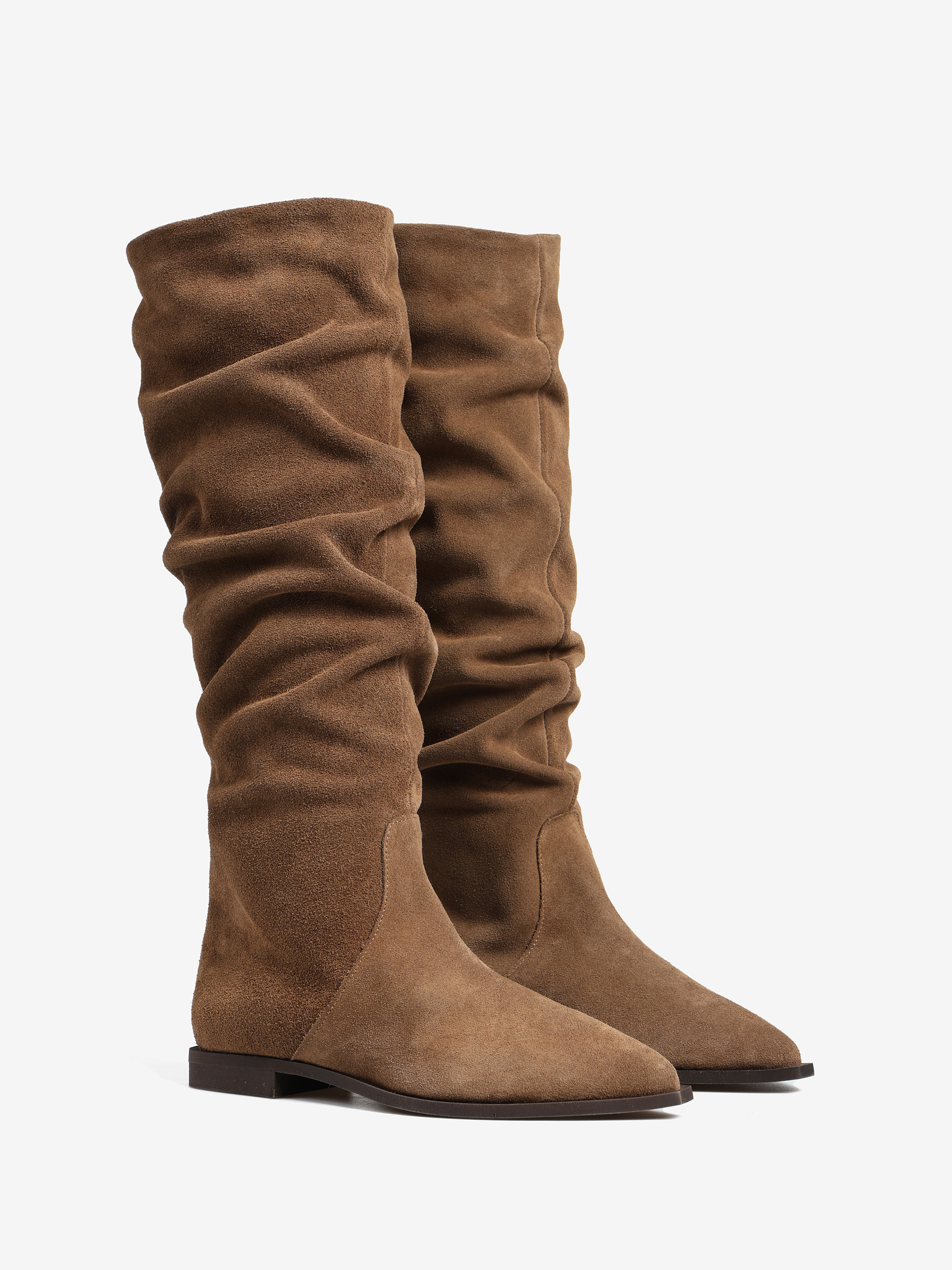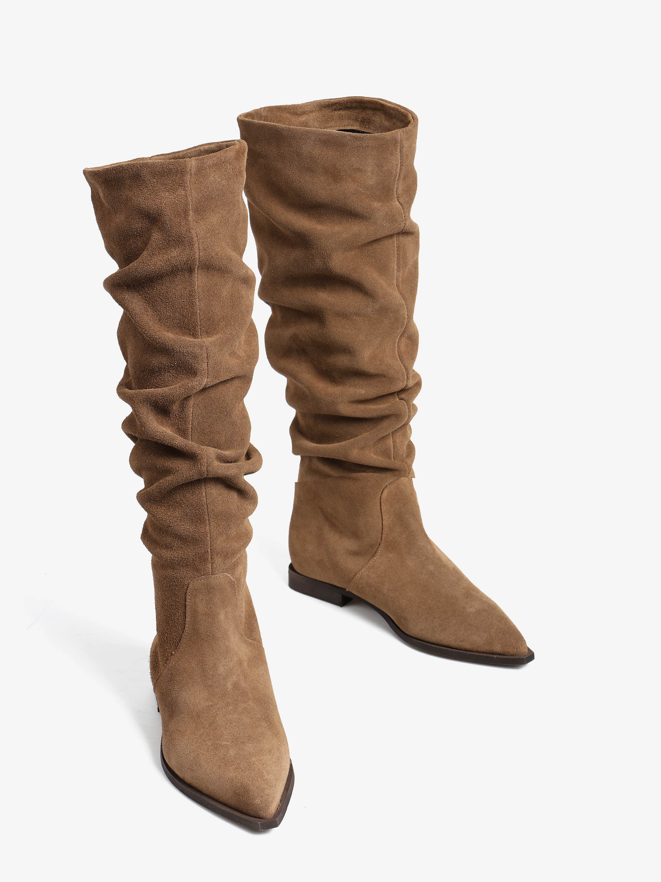 Zamszowe, wsuwane kozaki z noskami w szpic i marszczonymi cholewkami.
