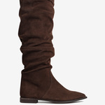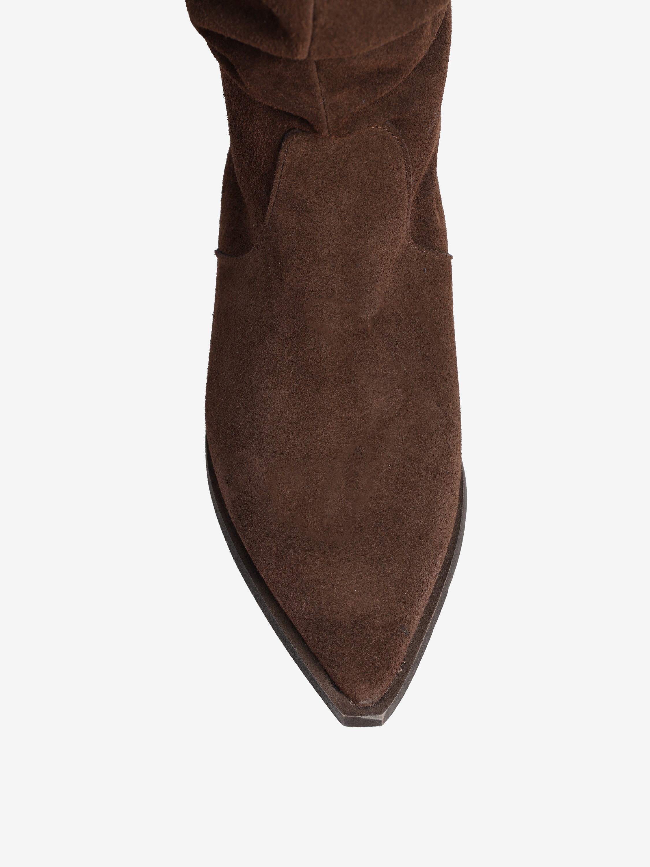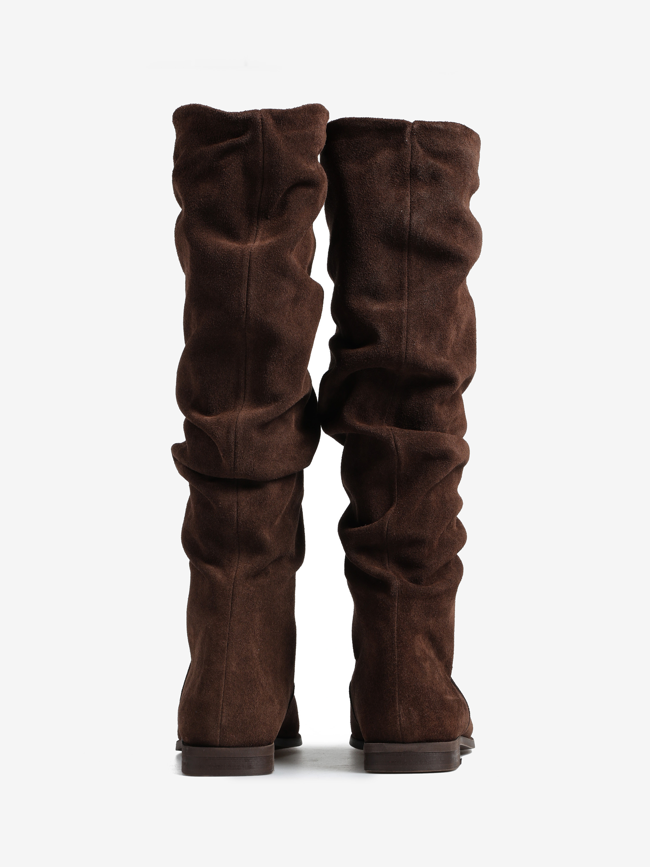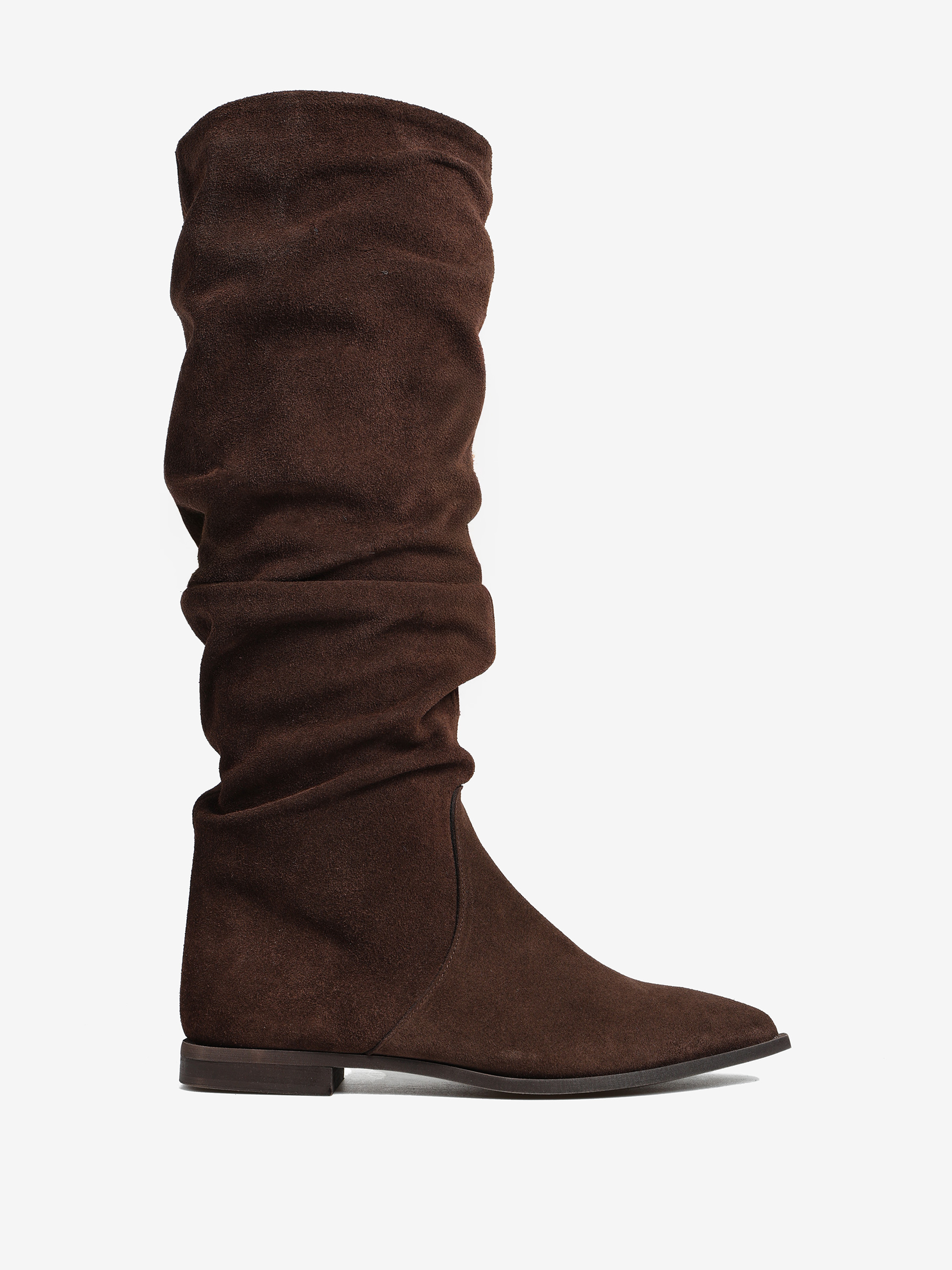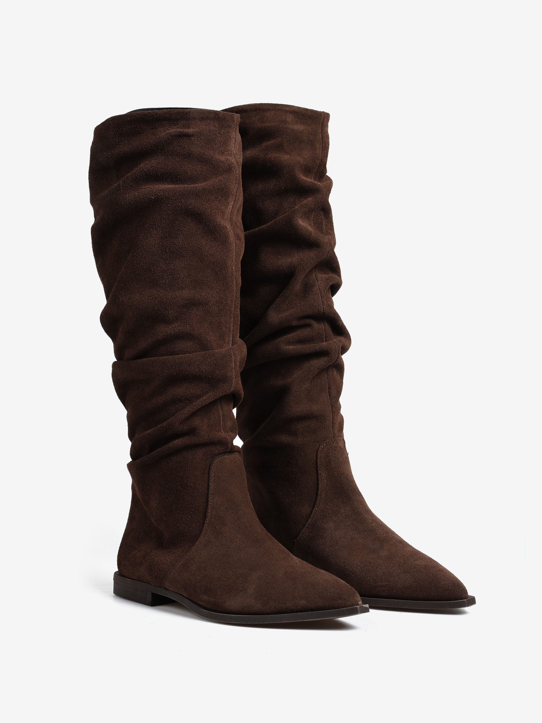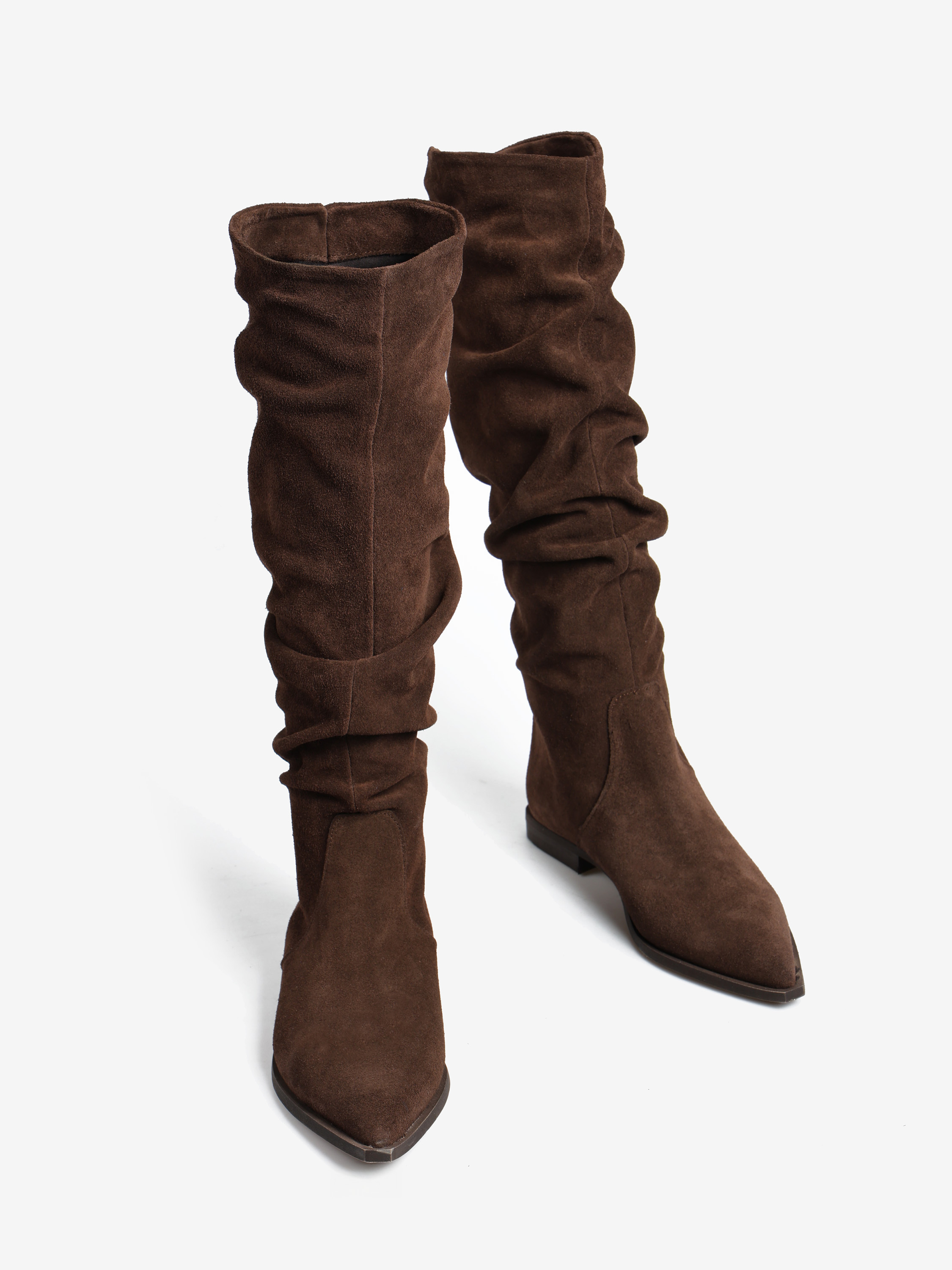 Zamszowe, wsuwane kozaki z noskami w szpic i marszczonymi cholewkami.