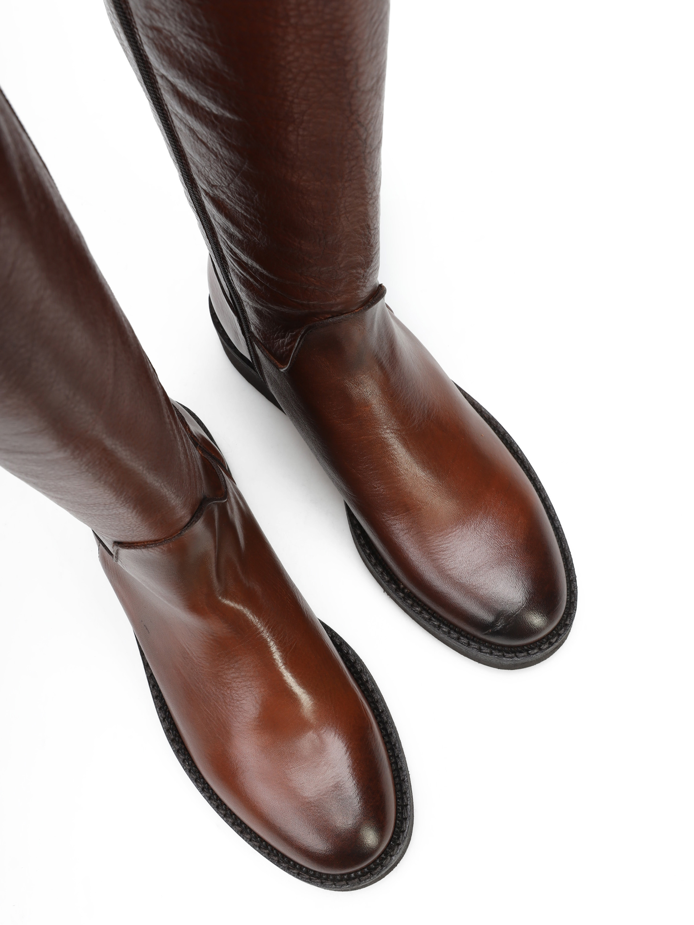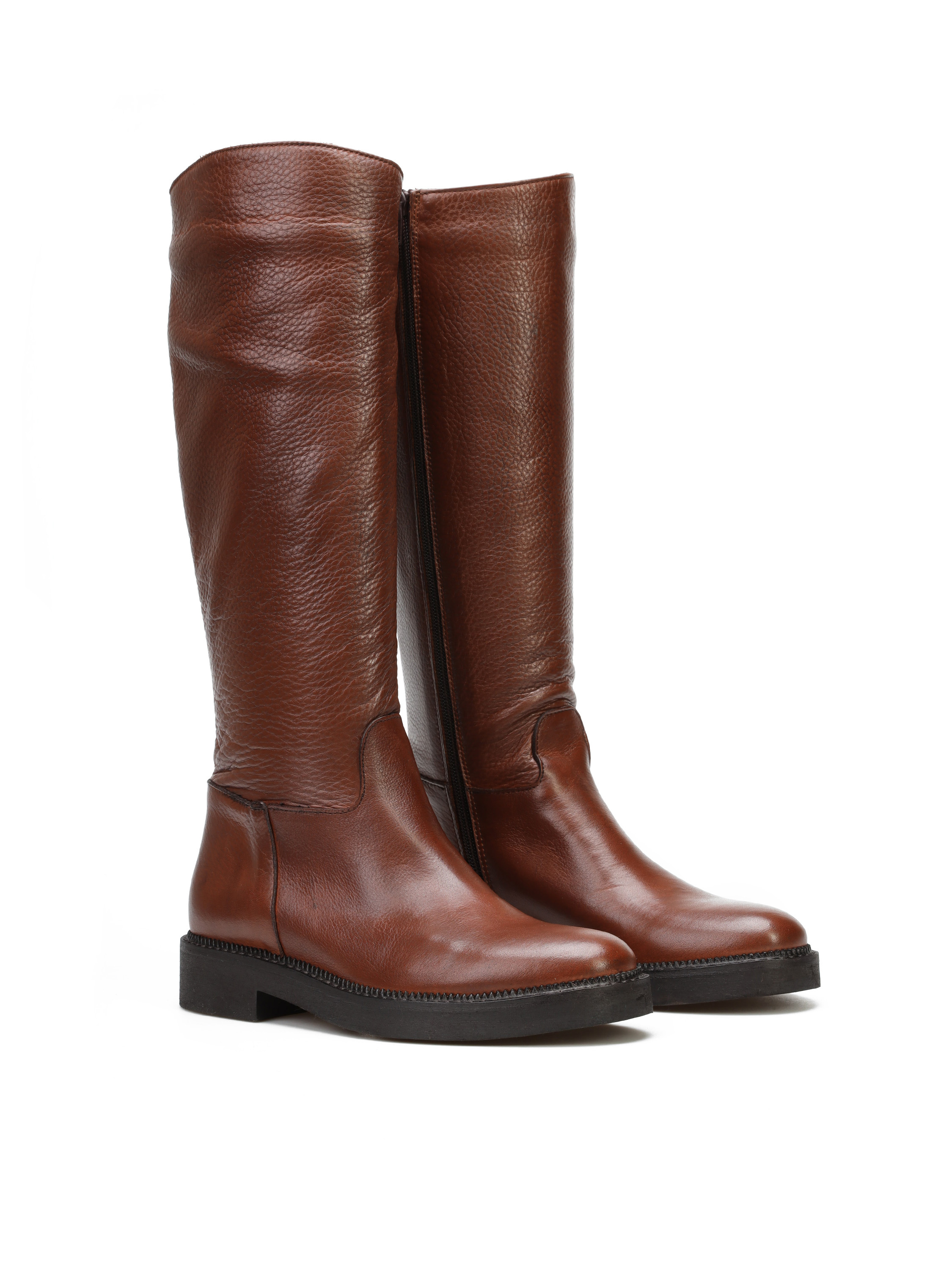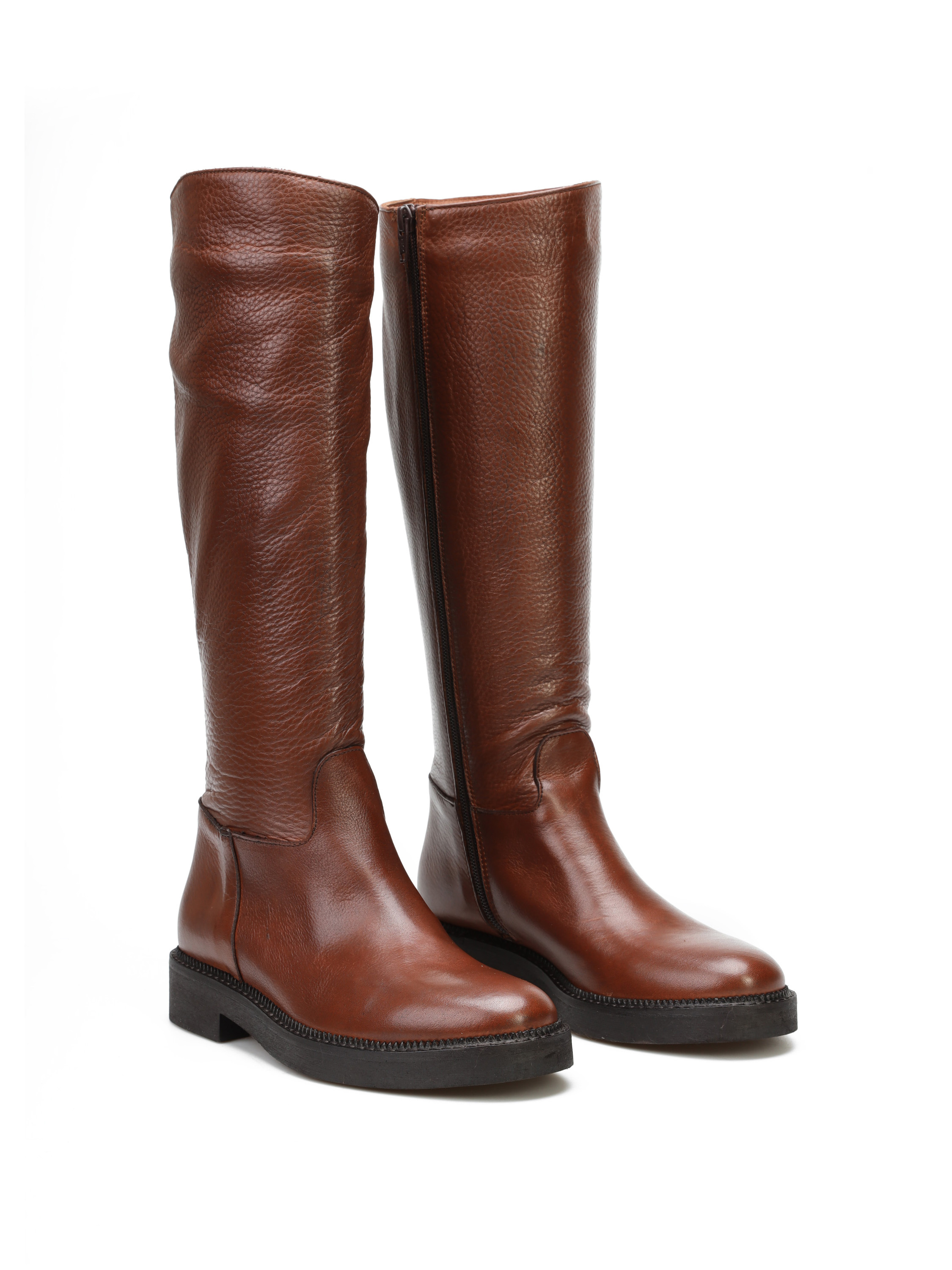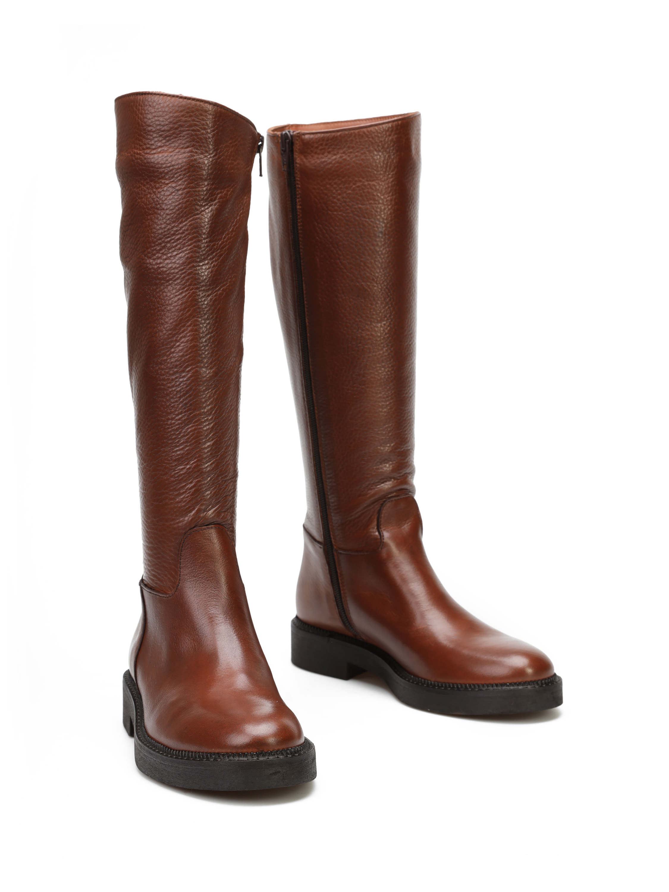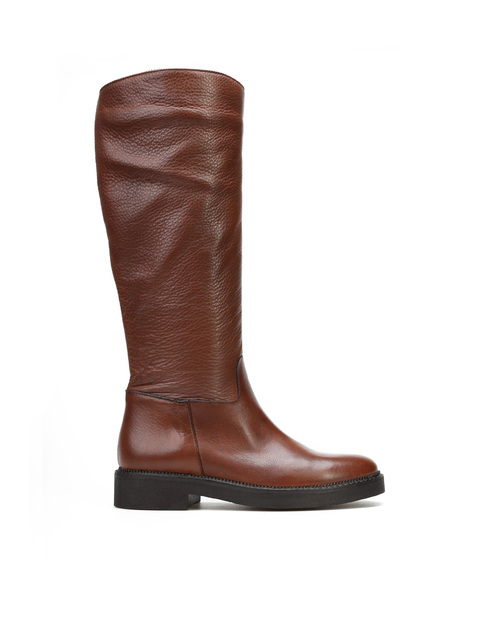Kozaki na płaskim obcasie to must have nie tylko tego sezonu. Wysoka cholewka w rudym kolorze wykonana jest z włoskiej skóry naturalnej. Posiada wszyty zamek błyskawiczny.