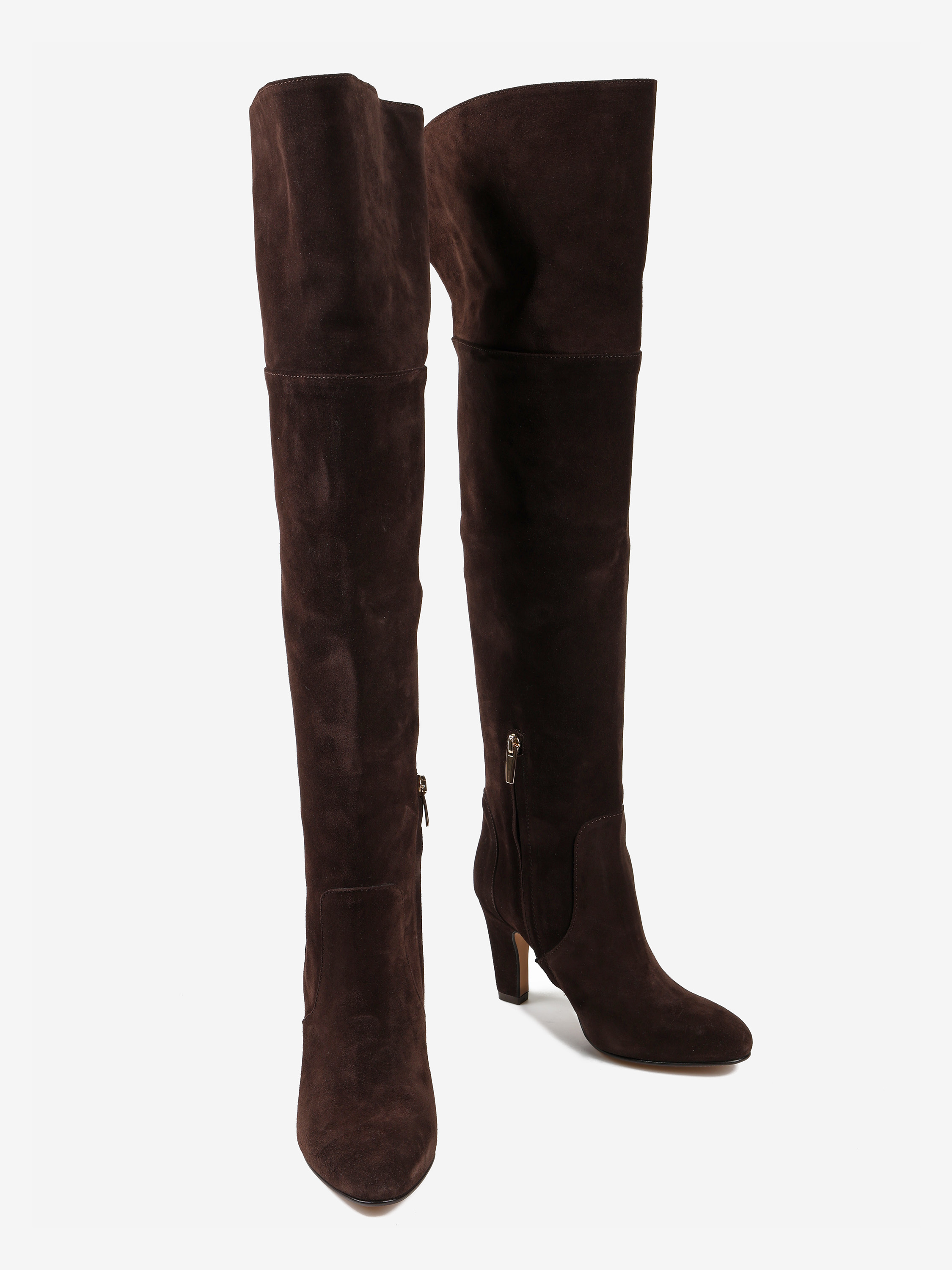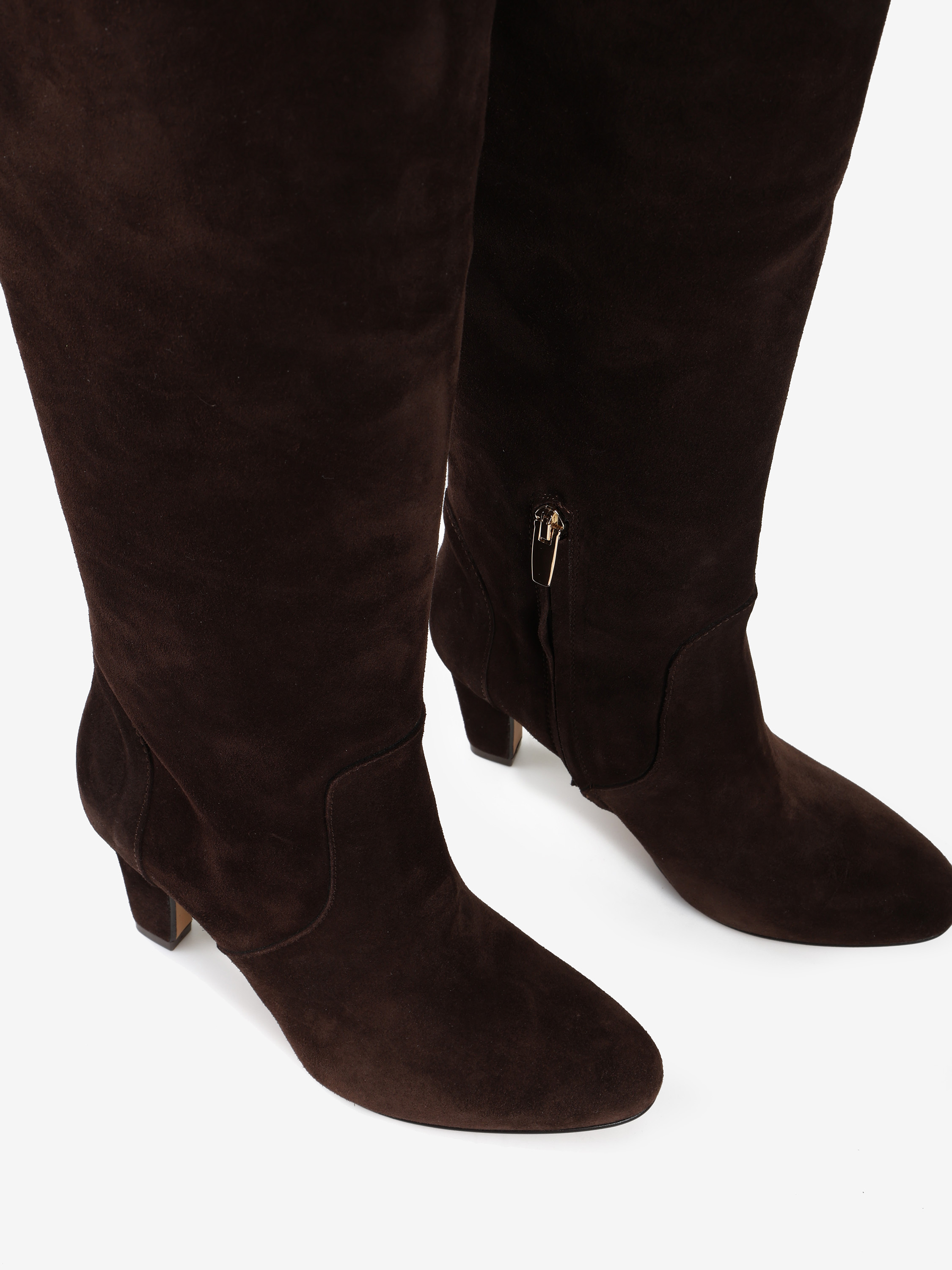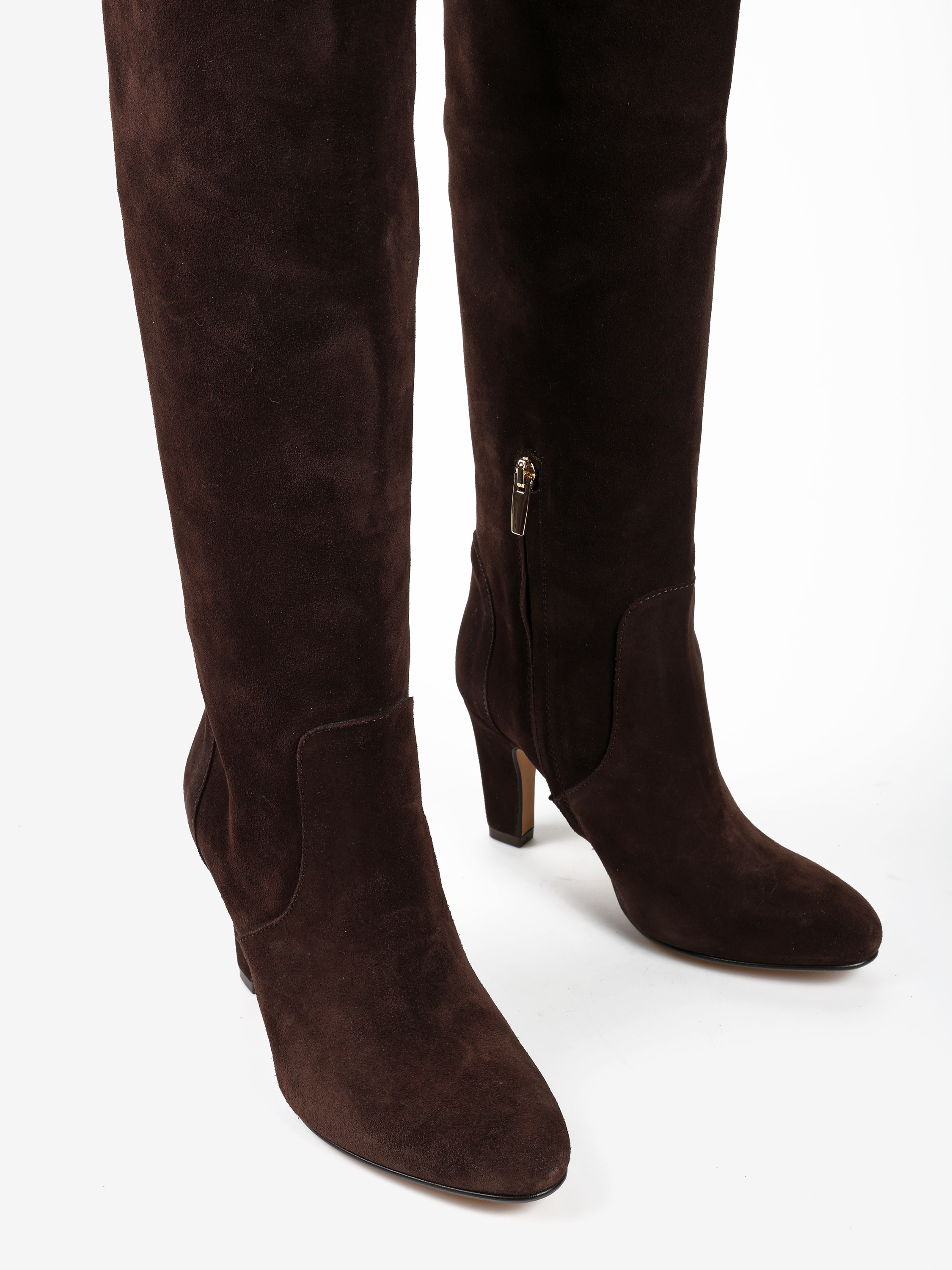 Zamszowe kozaki na obcasie w stylu muszkieterek. Lekko rozszerzana cholewa za kolano i zapięcie na suwak przy kostce.