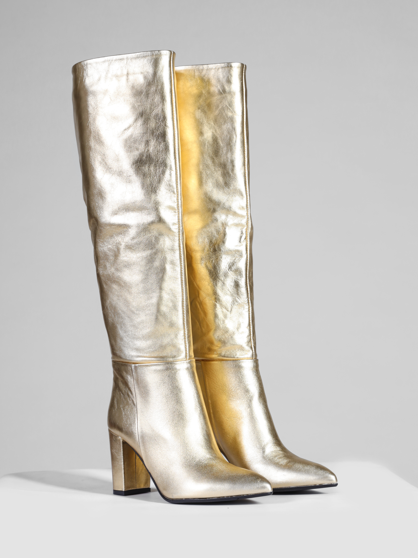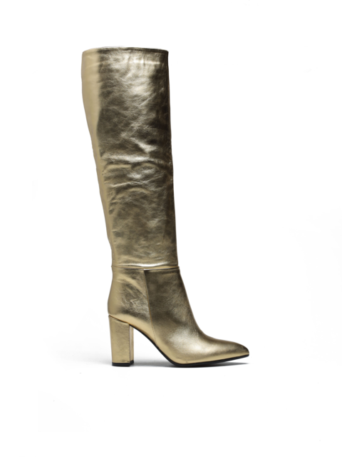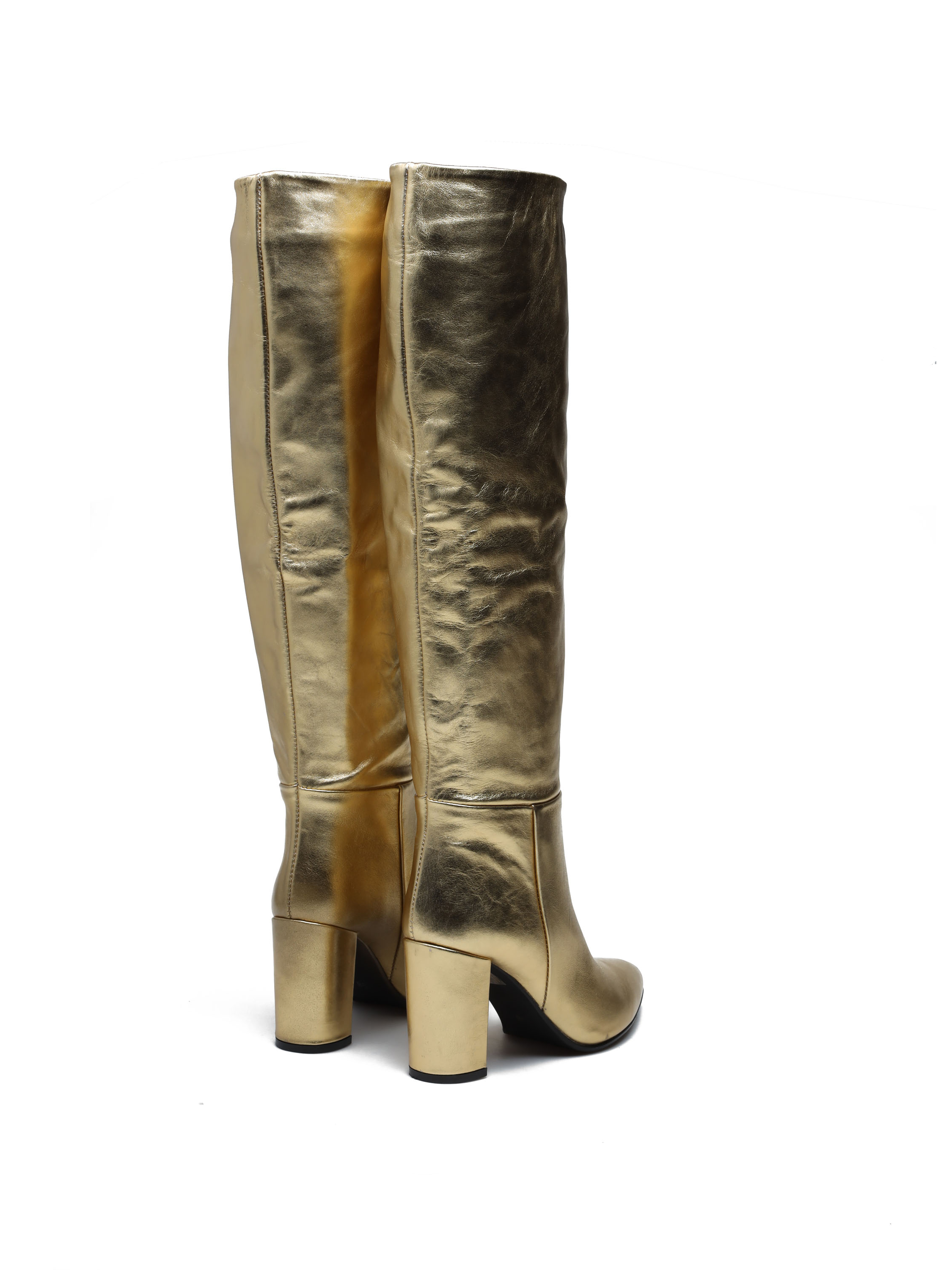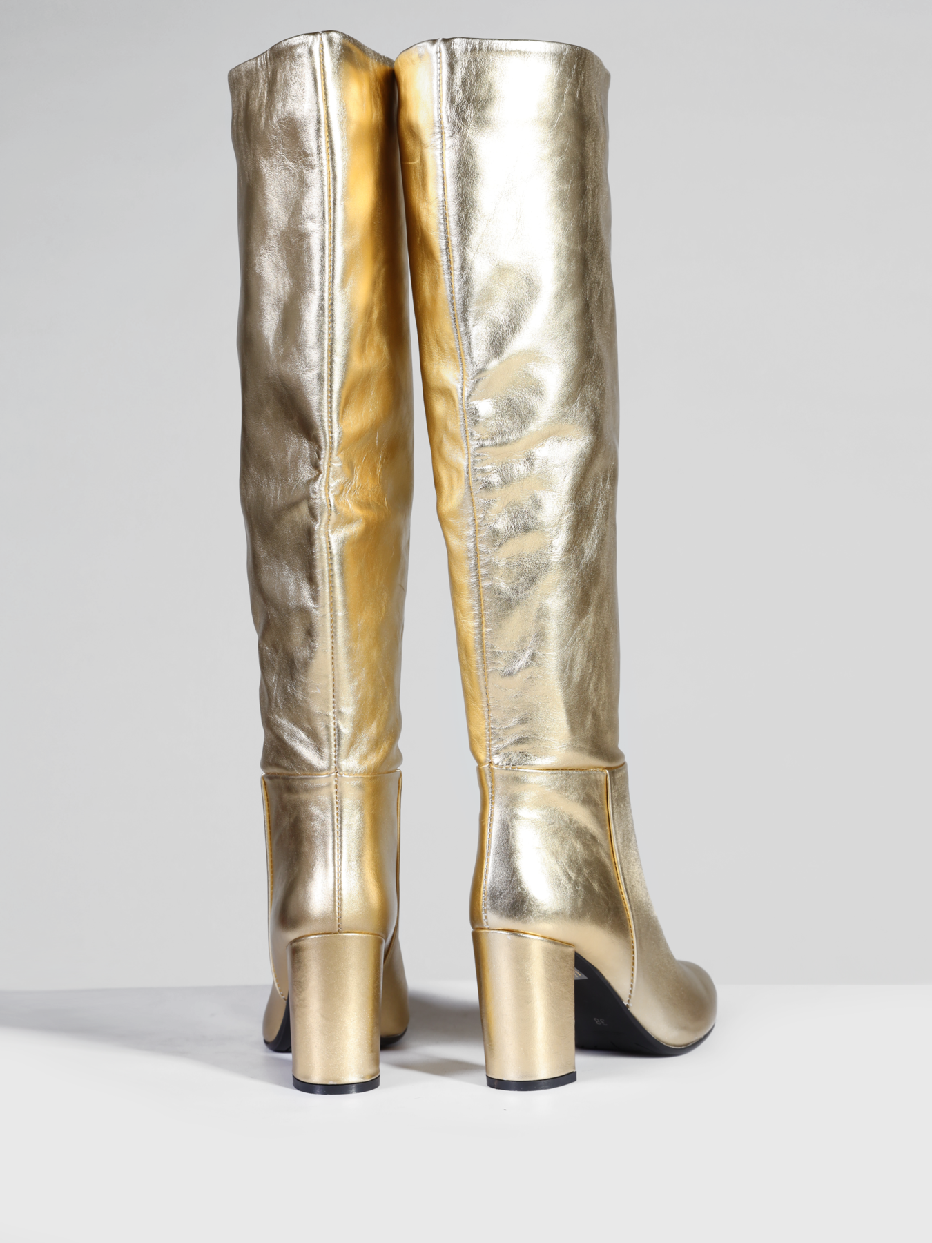 Wsuwane kozaki to must have sezonu. Wysoka cholewka do kolana wykonana jest z naturalnej, metalizowanej skóry. Model w modnym, złotym kolorze. Osadzony został na stabilnym obcasie na słupku.