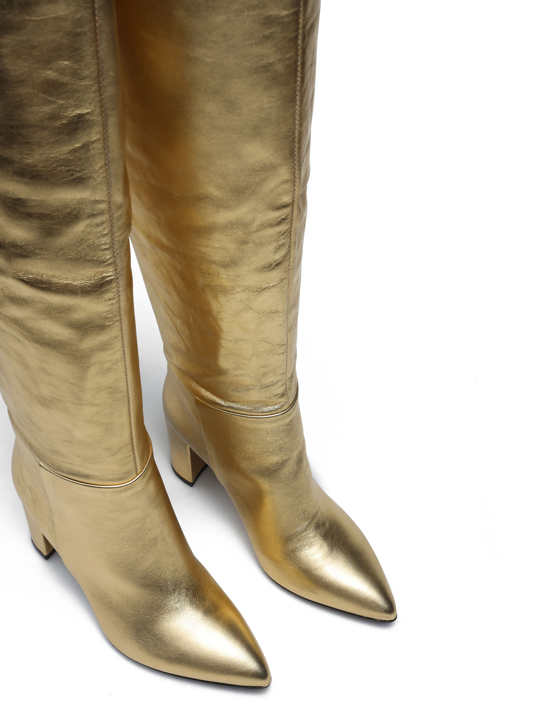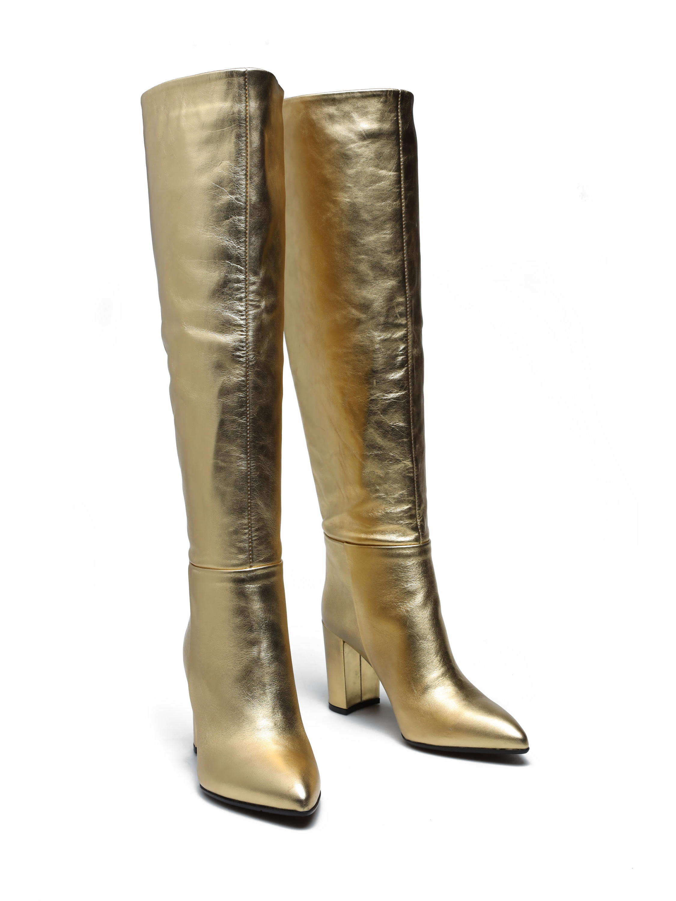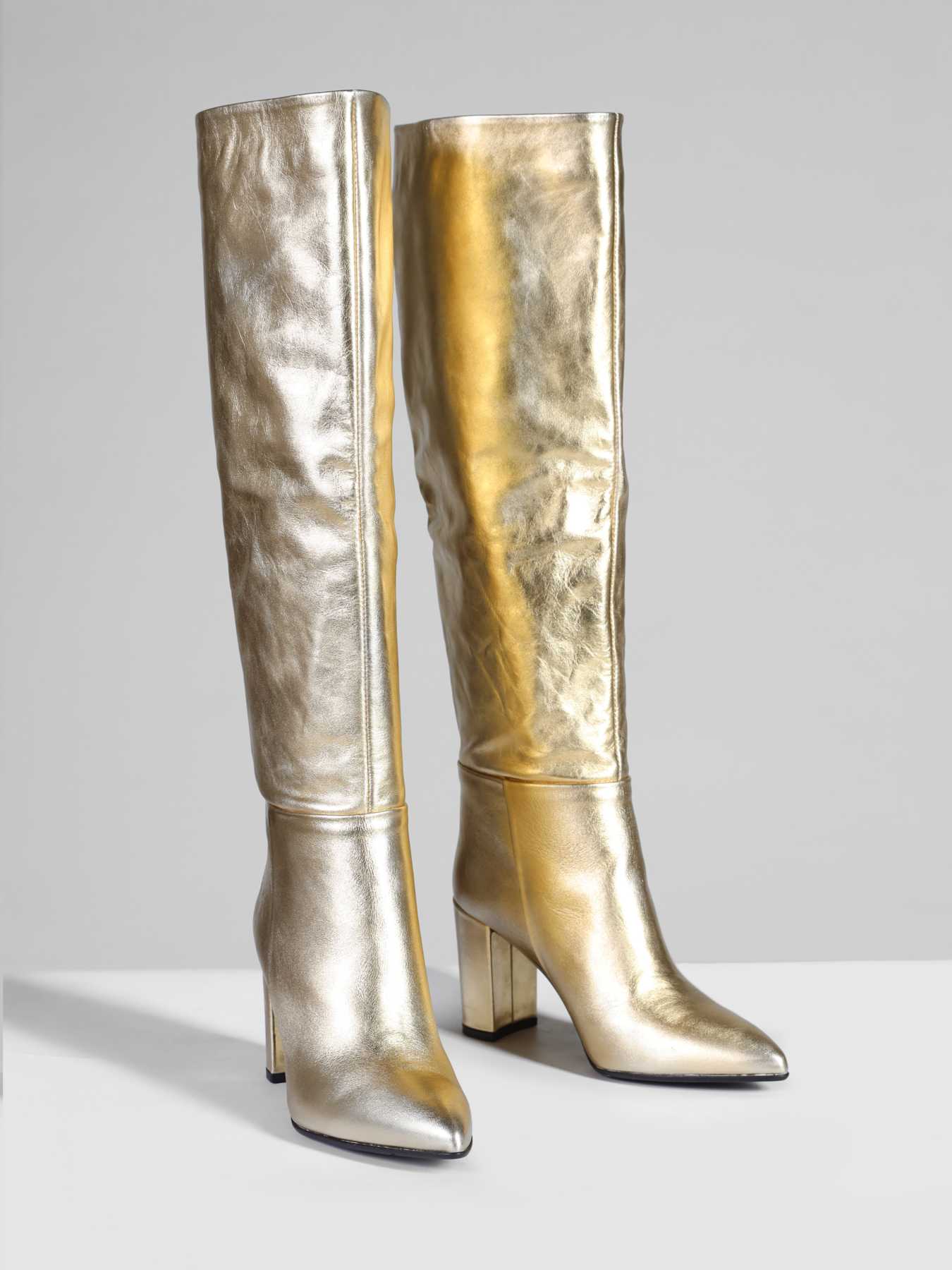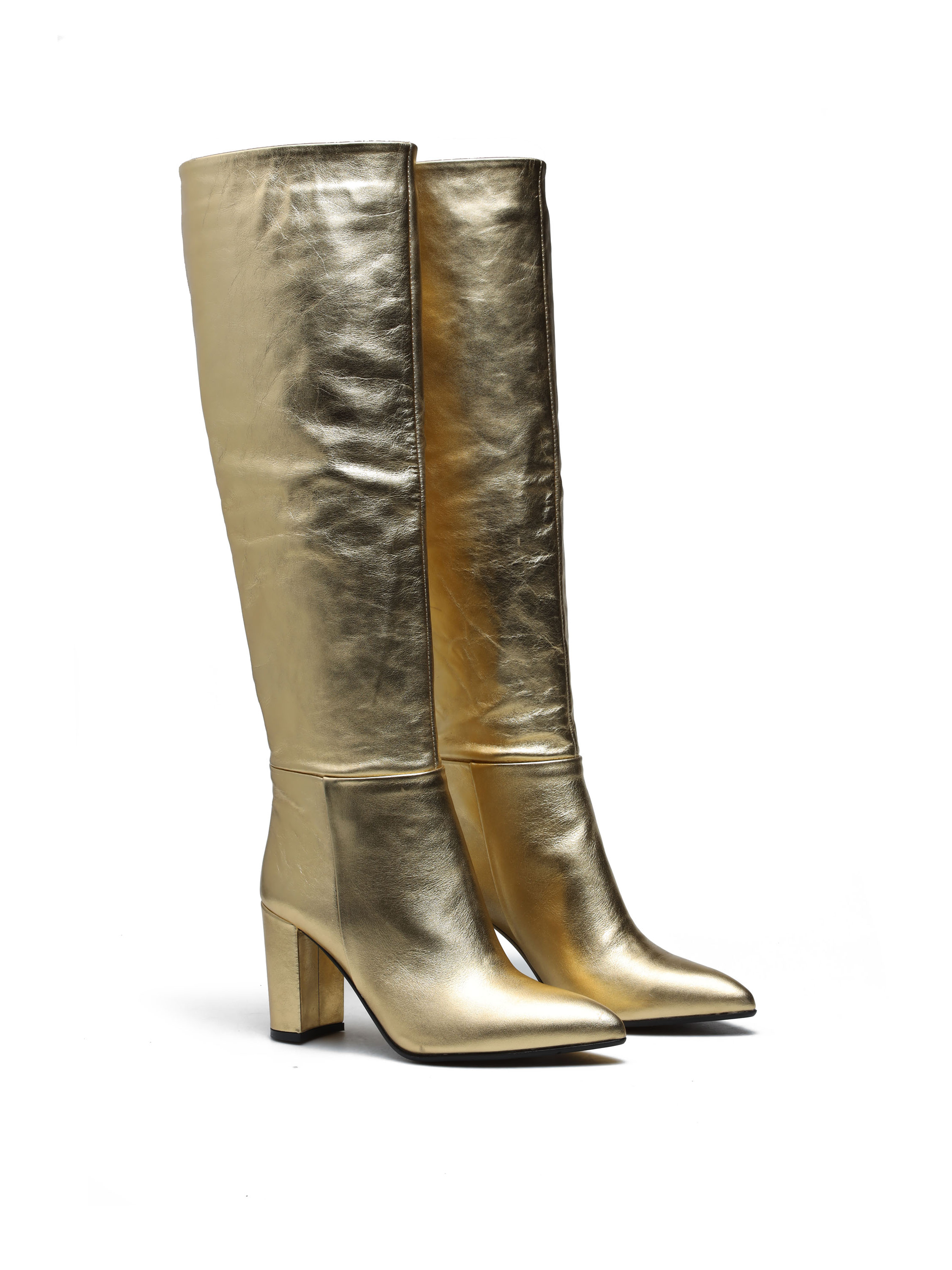 Wsuwane kozaki to must have sezonu. Wysoka cholewka do kolana wykonana jest z naturalnej, metalizowanej skóry. Model w modnym, złotym kolorze. Osadzony został na stabilnym obcasie na słupku.