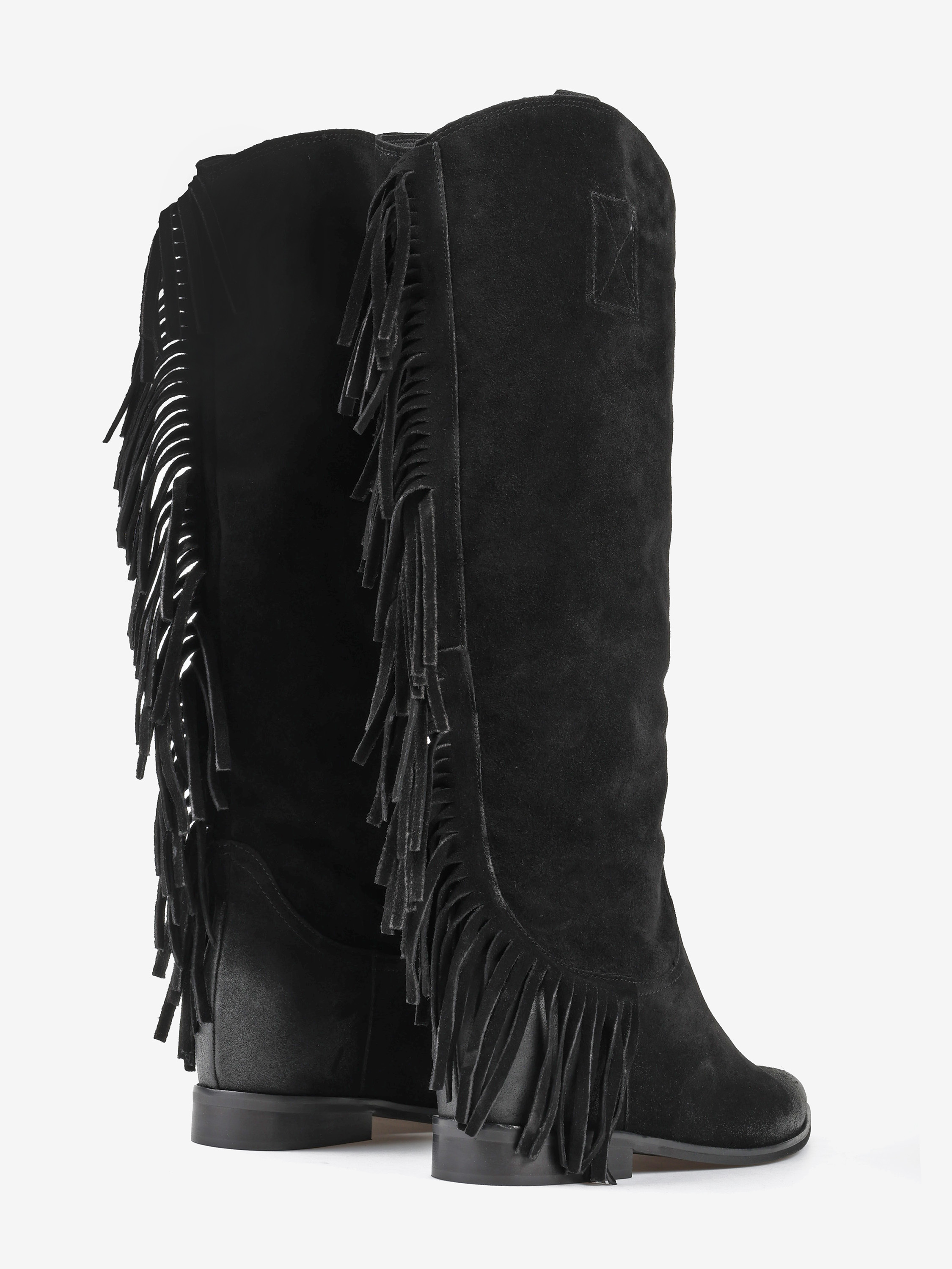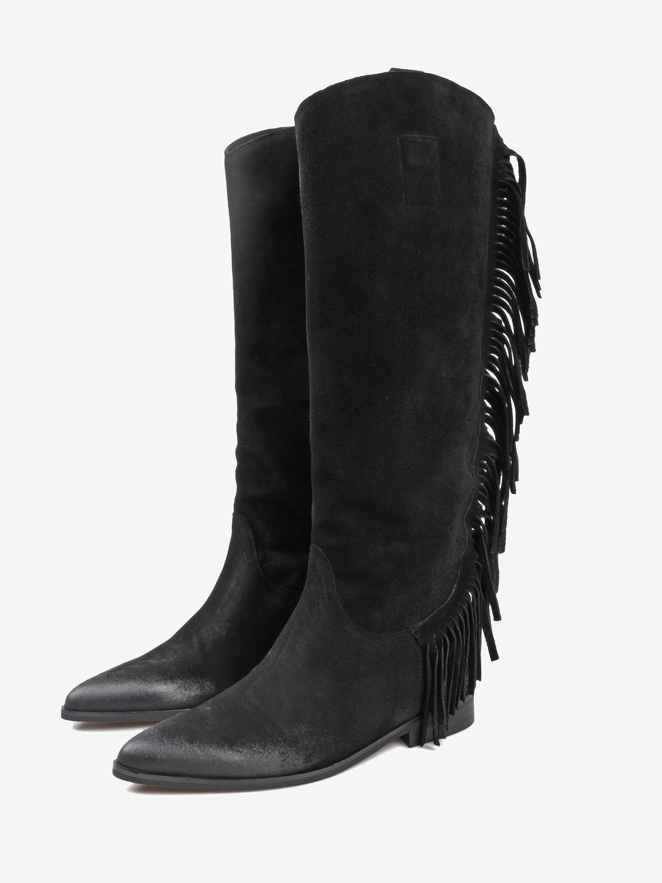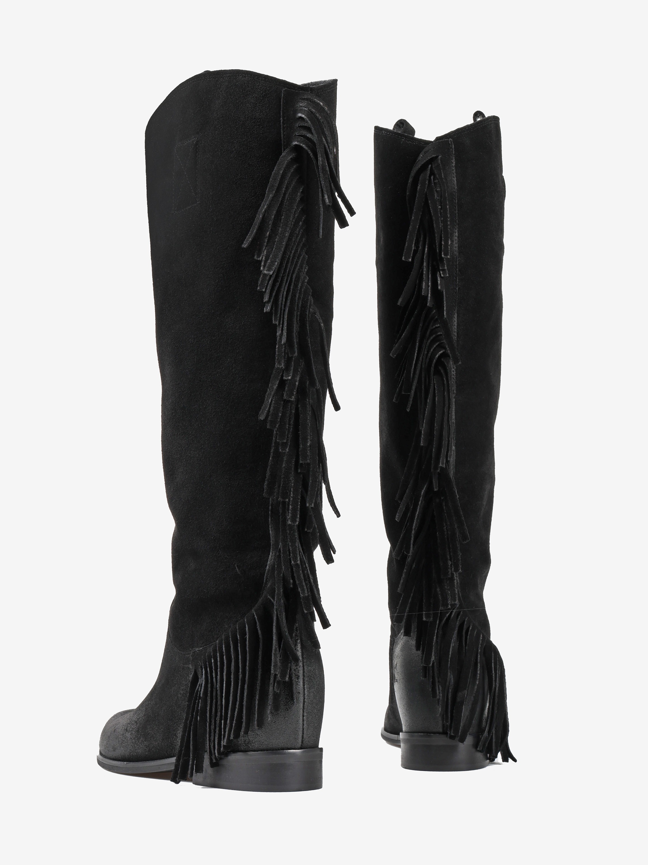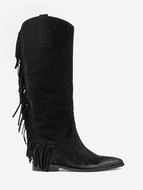 Zamszowe, wsuwane kozaki w stylu boho z frędzlami na cholewce. W środku ukryty koturn o wysokości 4 cm.
