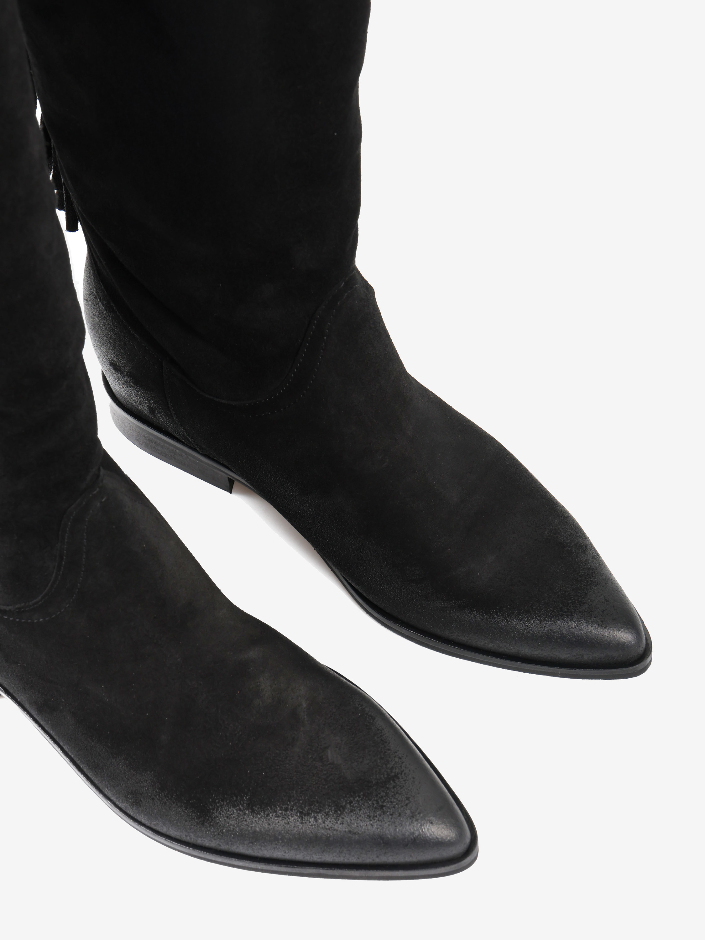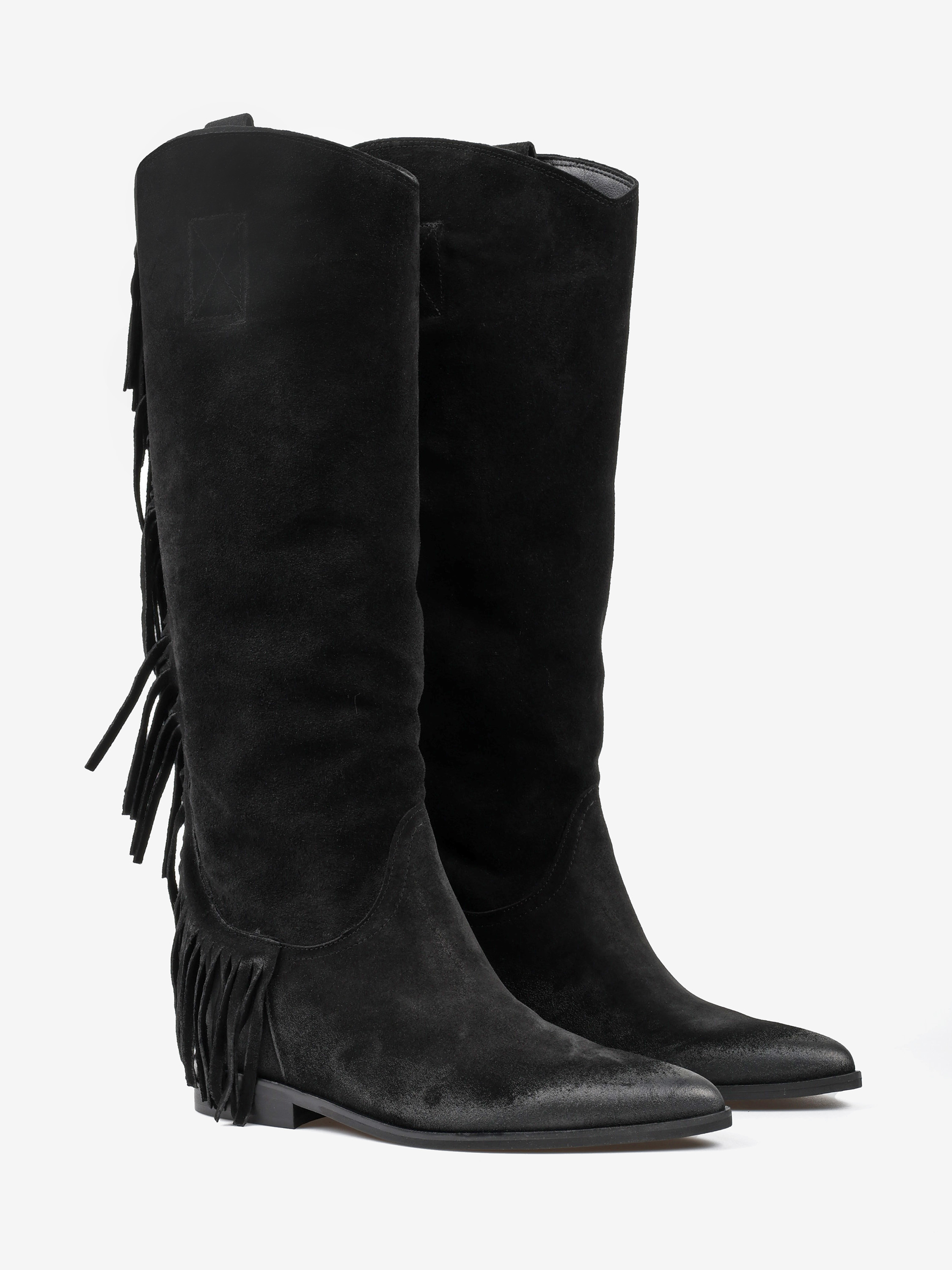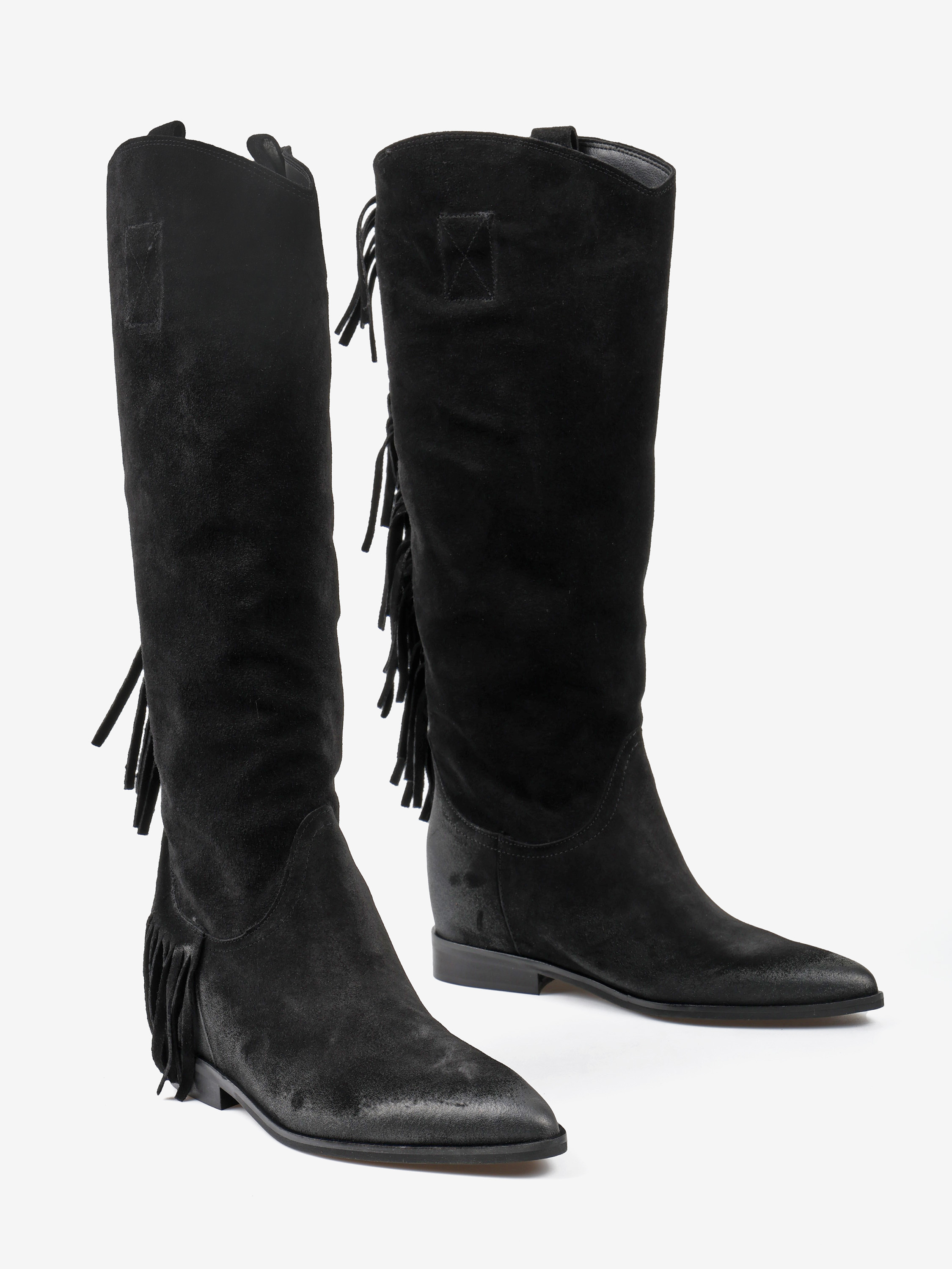 Zamszowe, wsuwane kozaki w stylu boho z frędzlami na cholewce. W środku ukryty koturn o wysokości 4 cm.