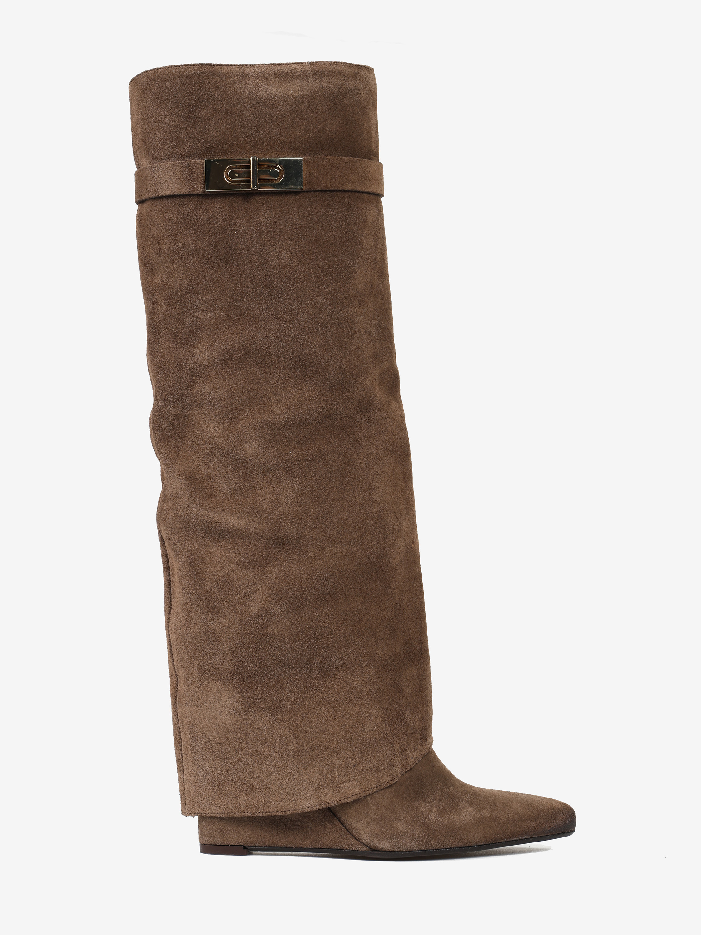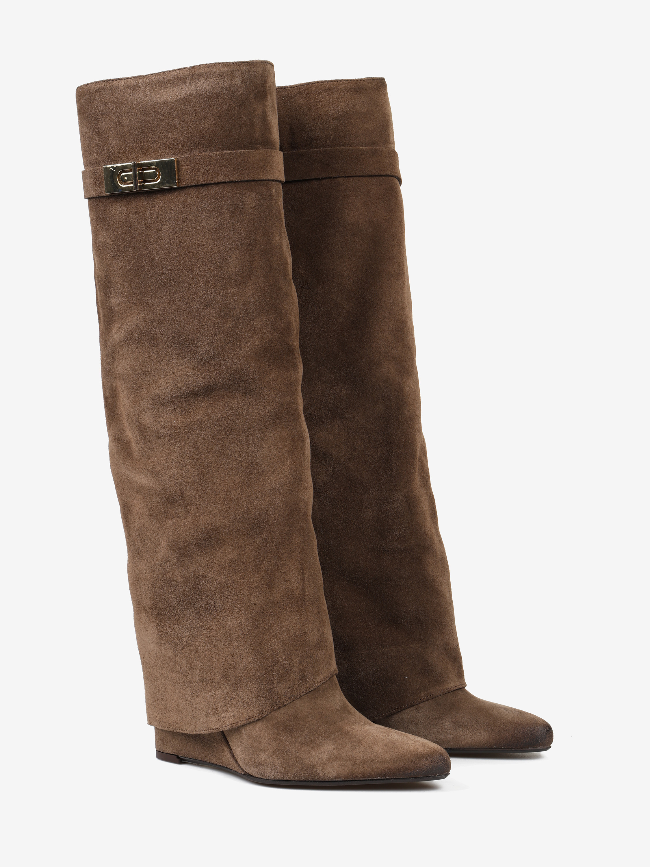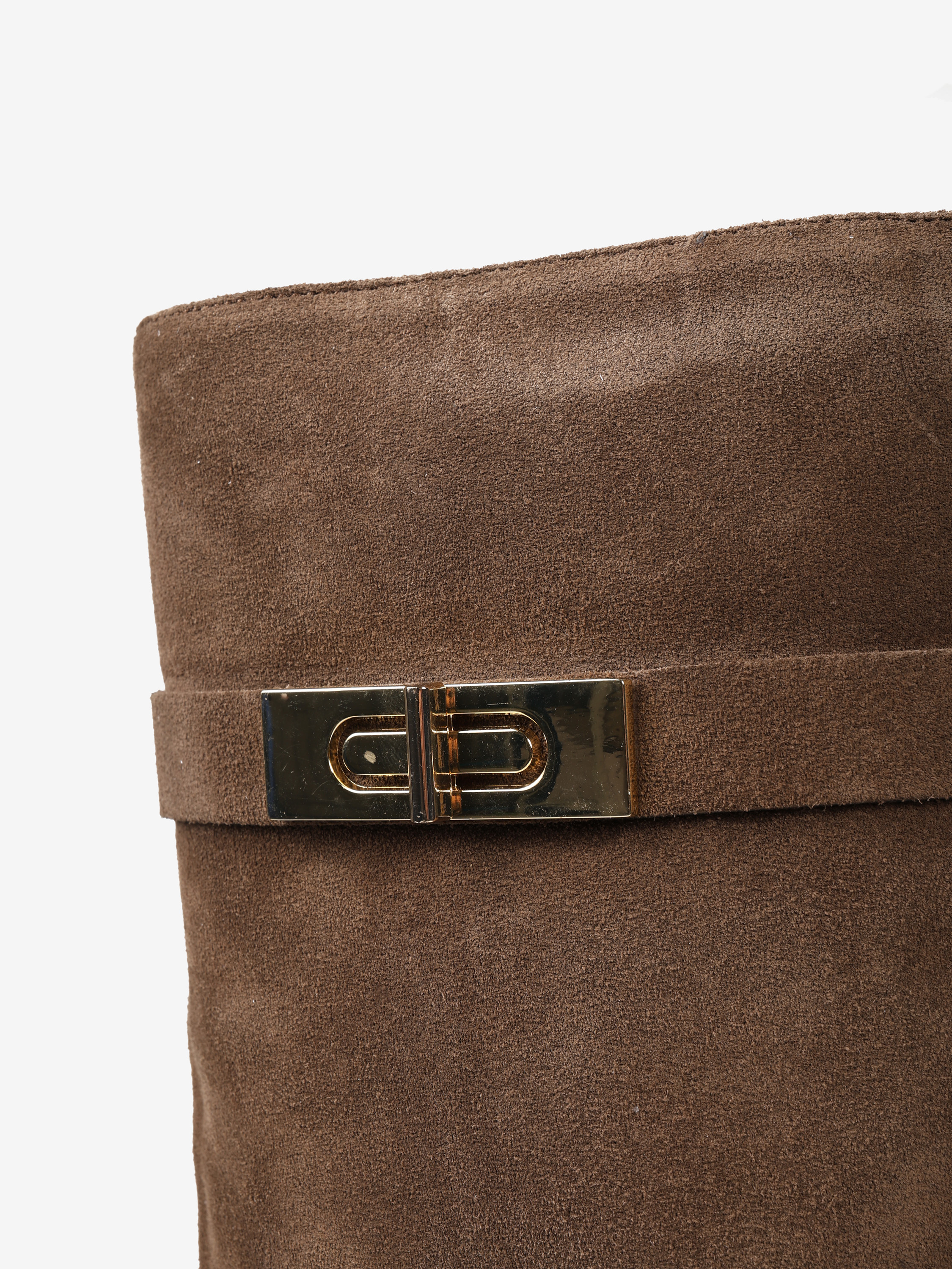 Zamszowe kozaki na koturnie z noskami w szpic. Przedłużona cholewka i ozdobny pasek ze złotą sprzączką.