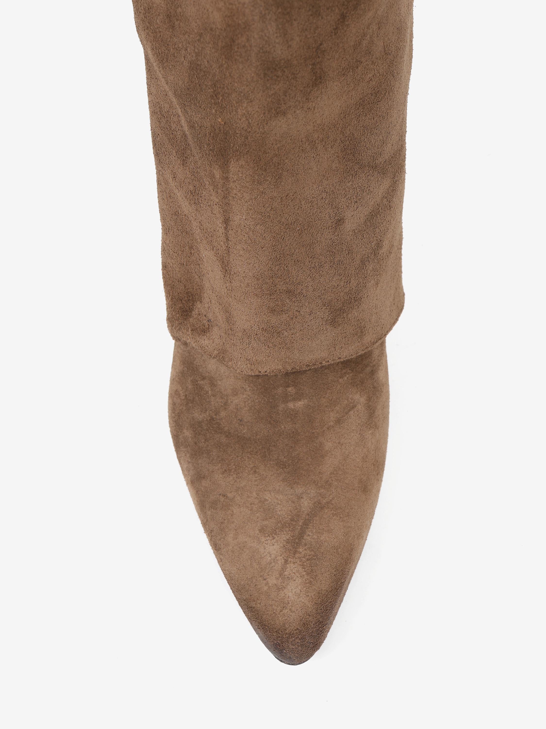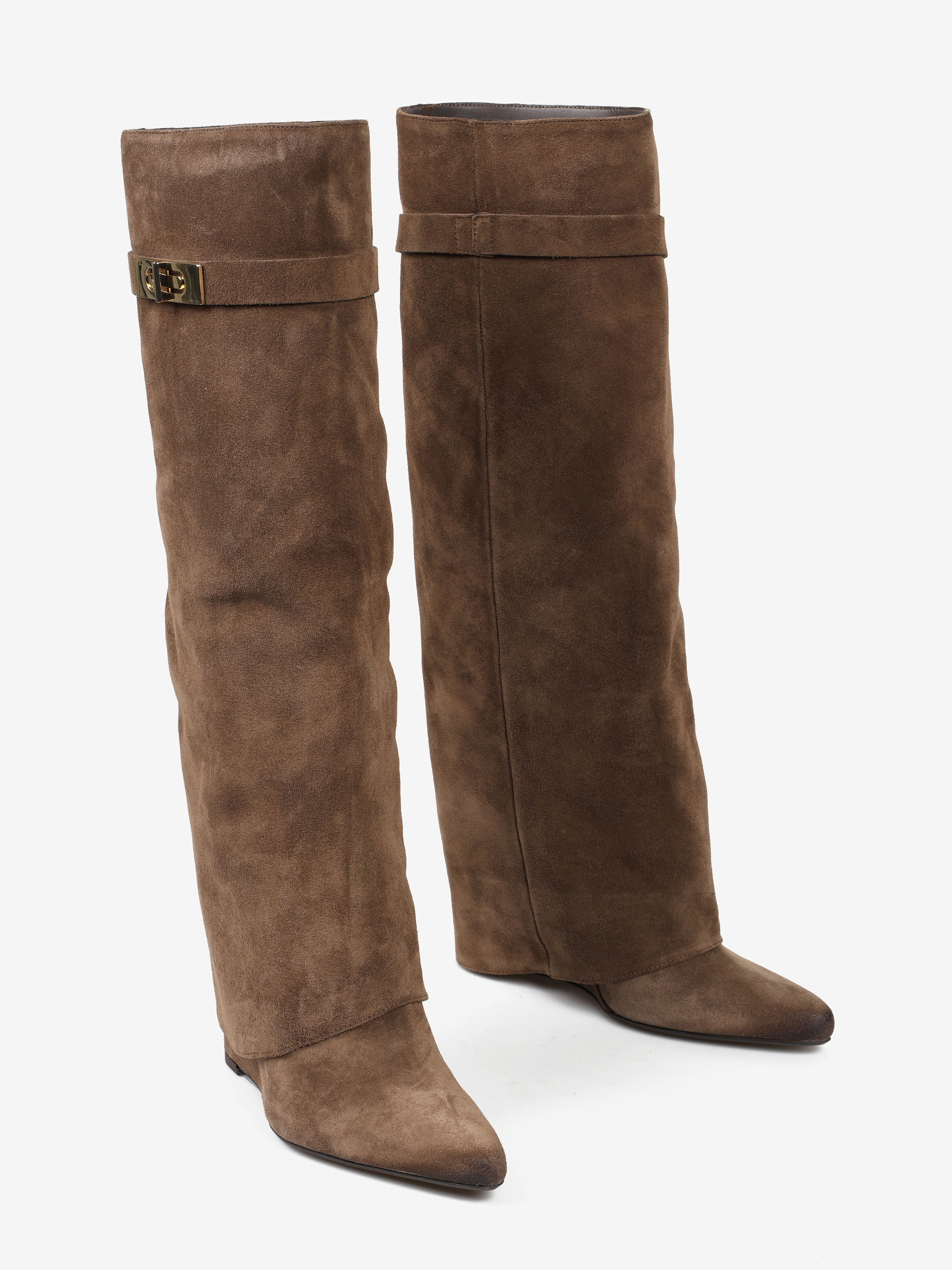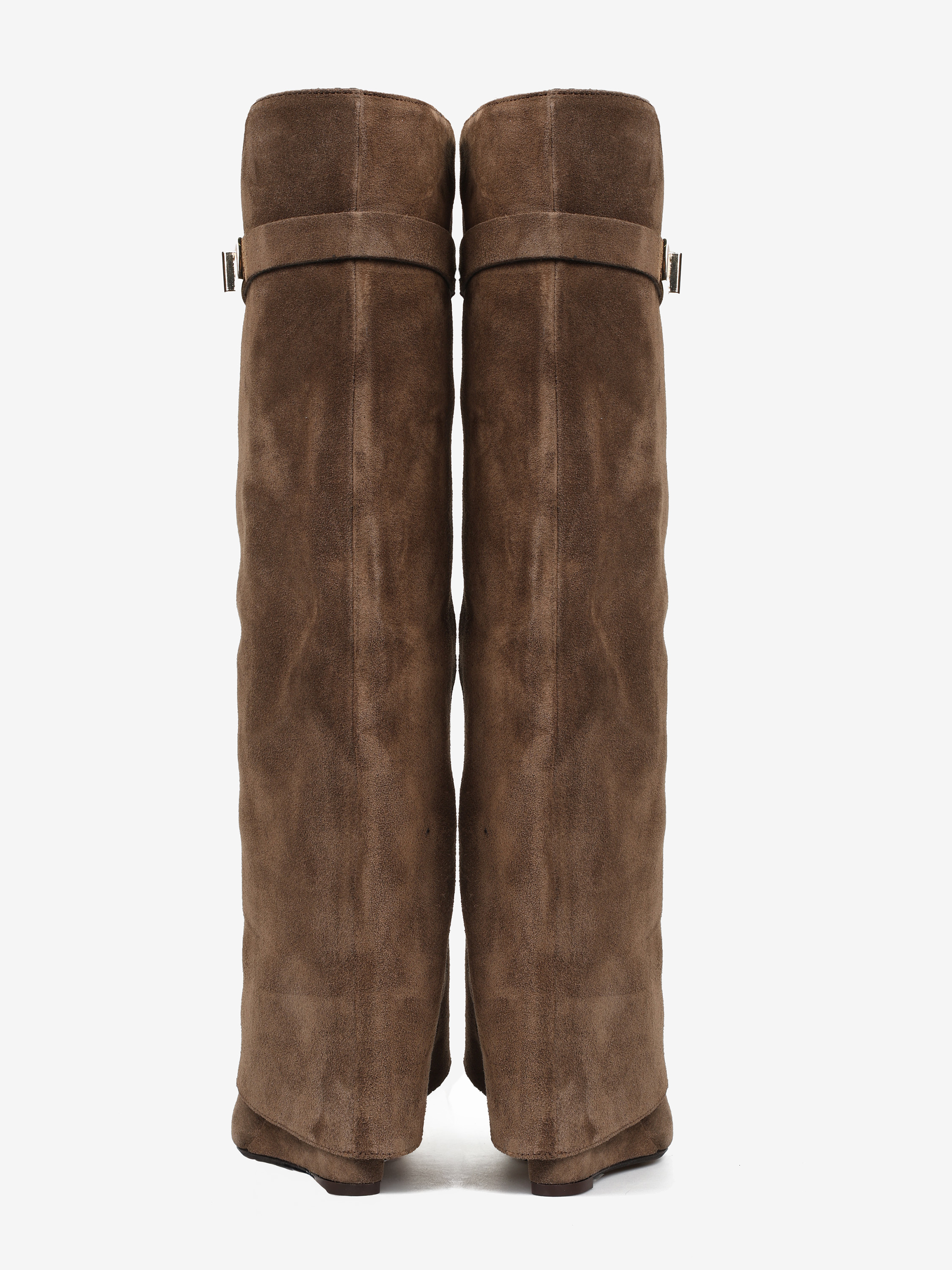 Zamszowe kozaki na koturnie z noskami w szpic. Przedłużona cholewka i ozdobny pasek ze złotą sprzączką.