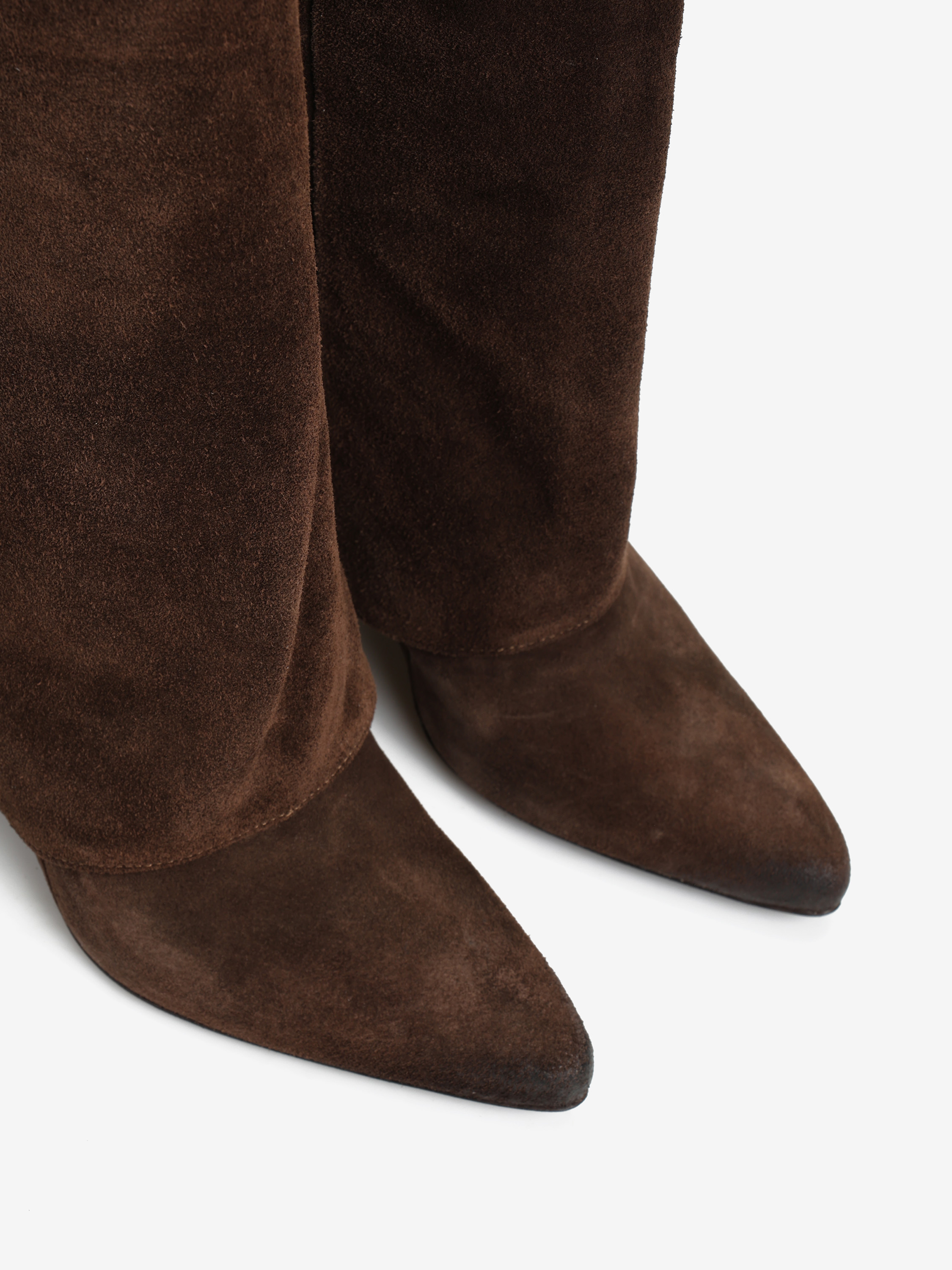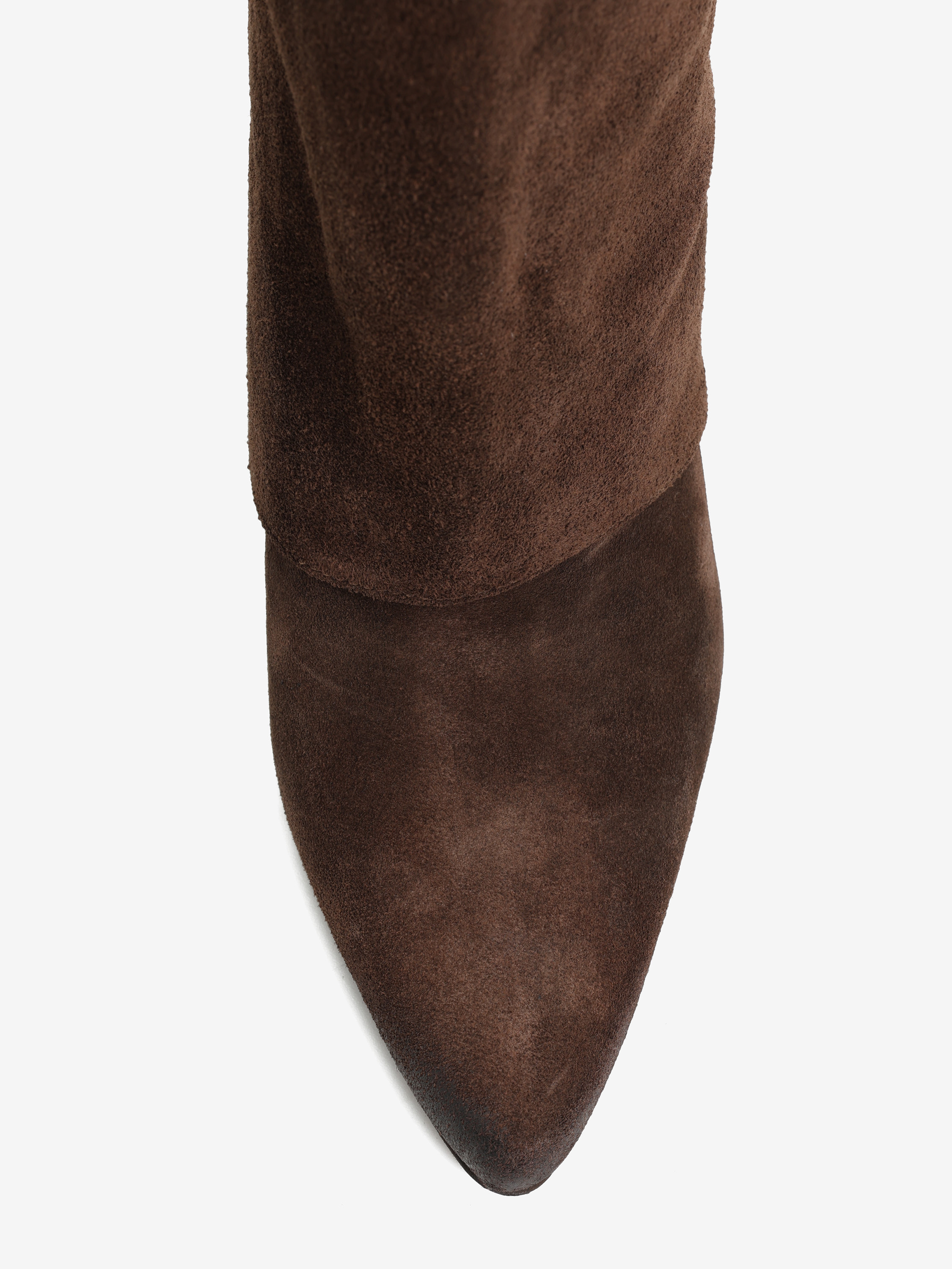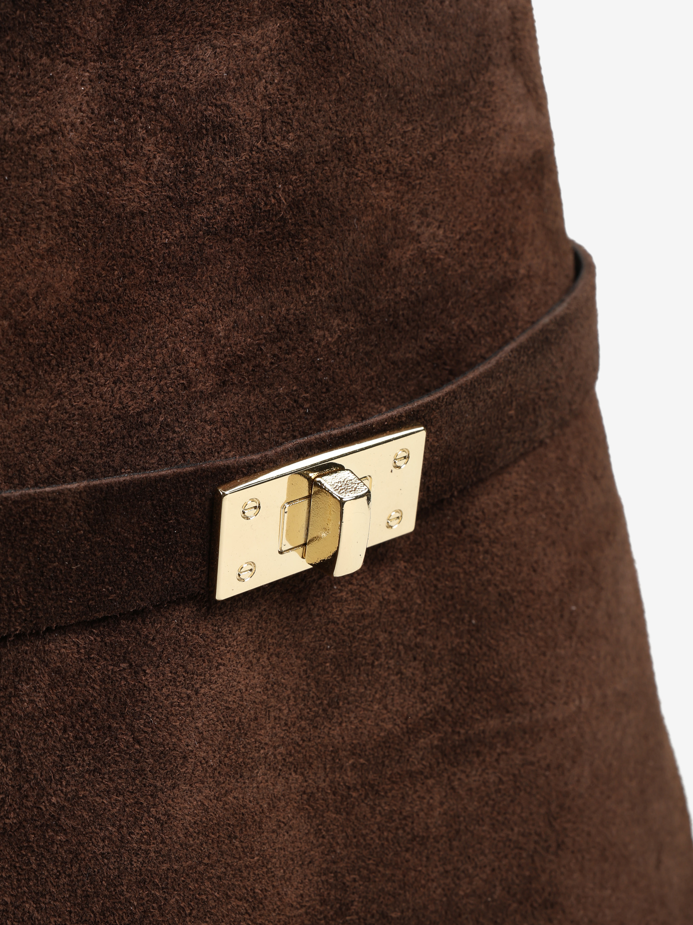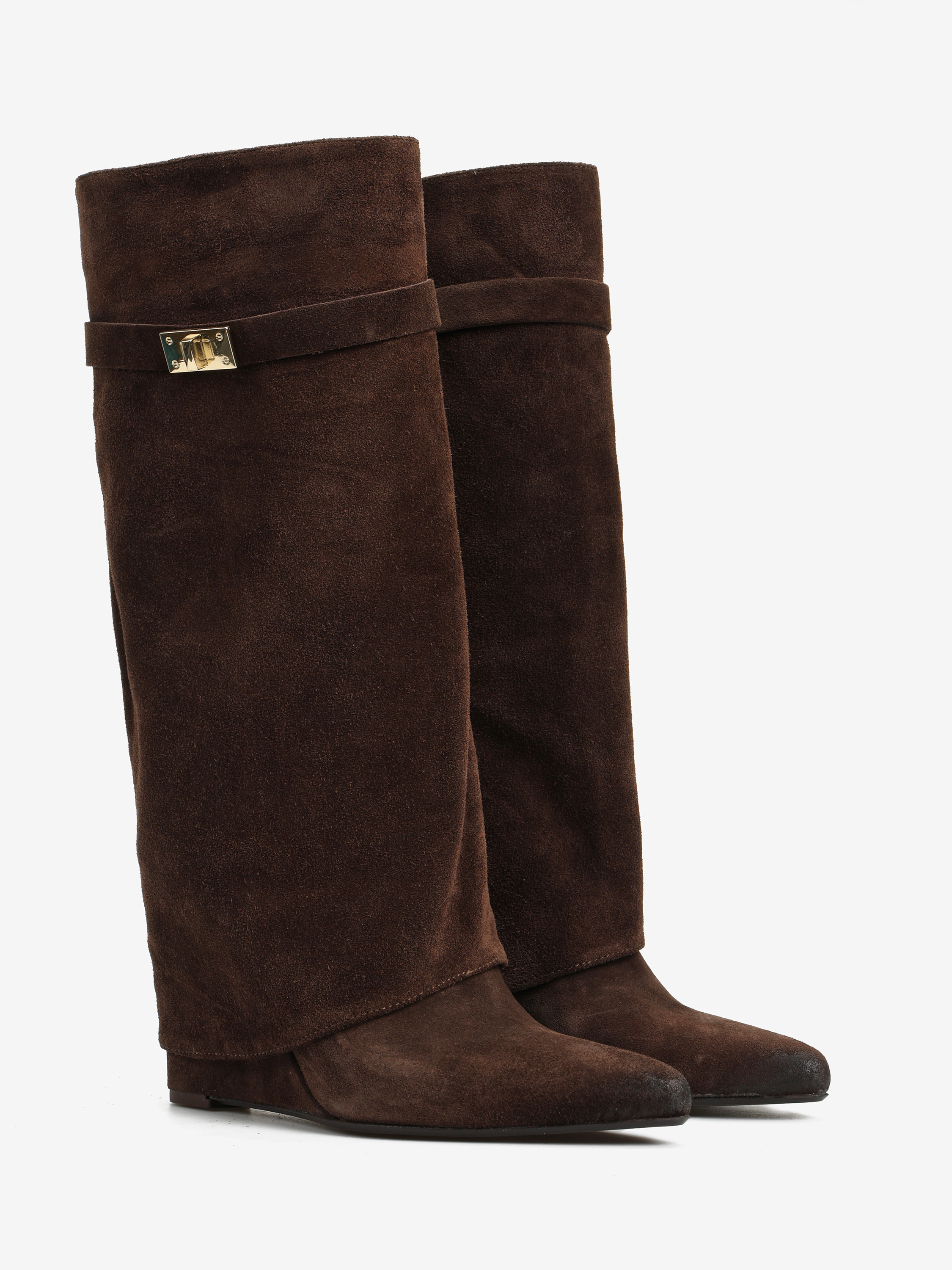 Zamszowe kozaki na koturnie. Noski w szpic i przedłużona cholewa z ozdobnym paskiem.