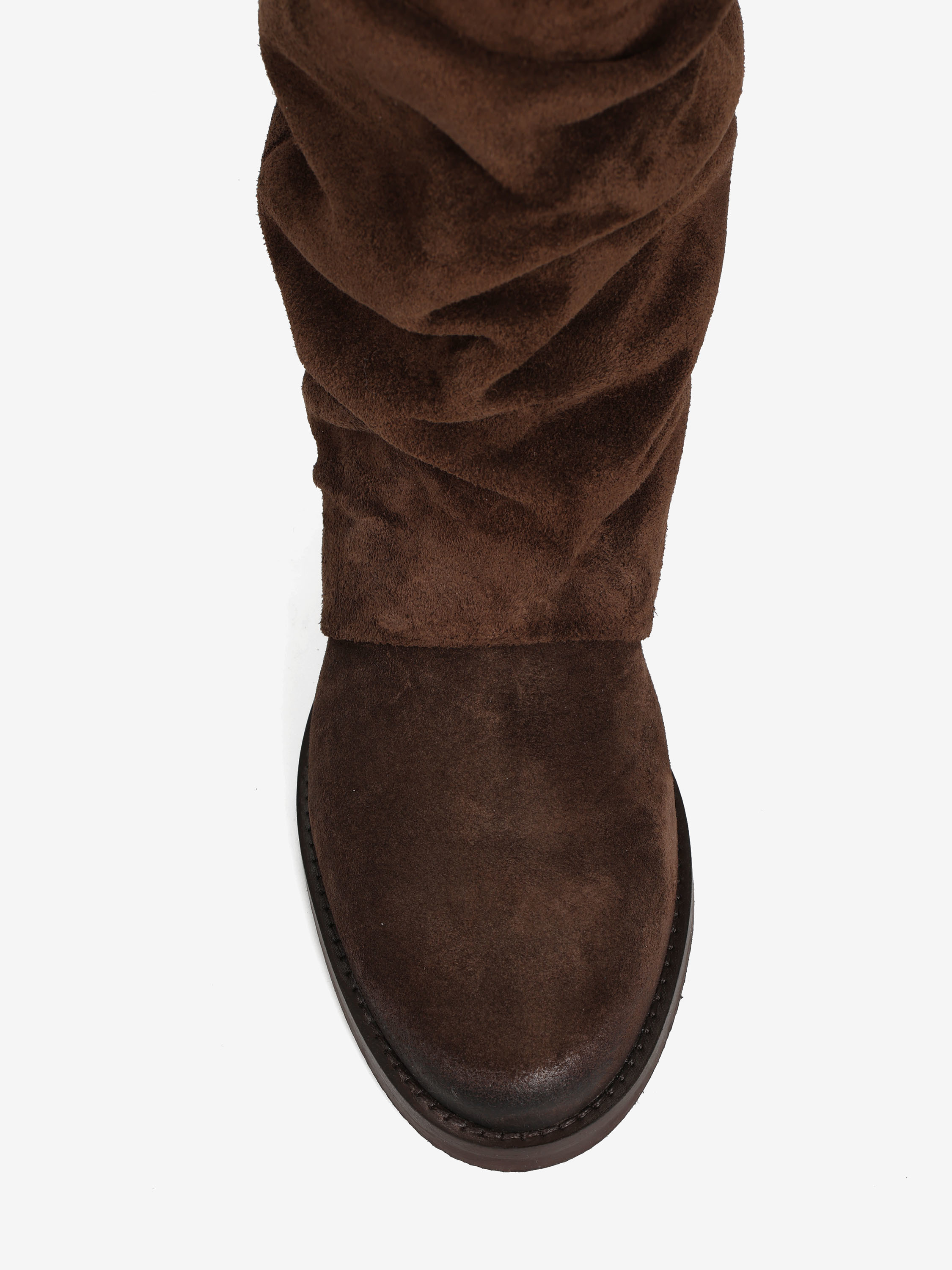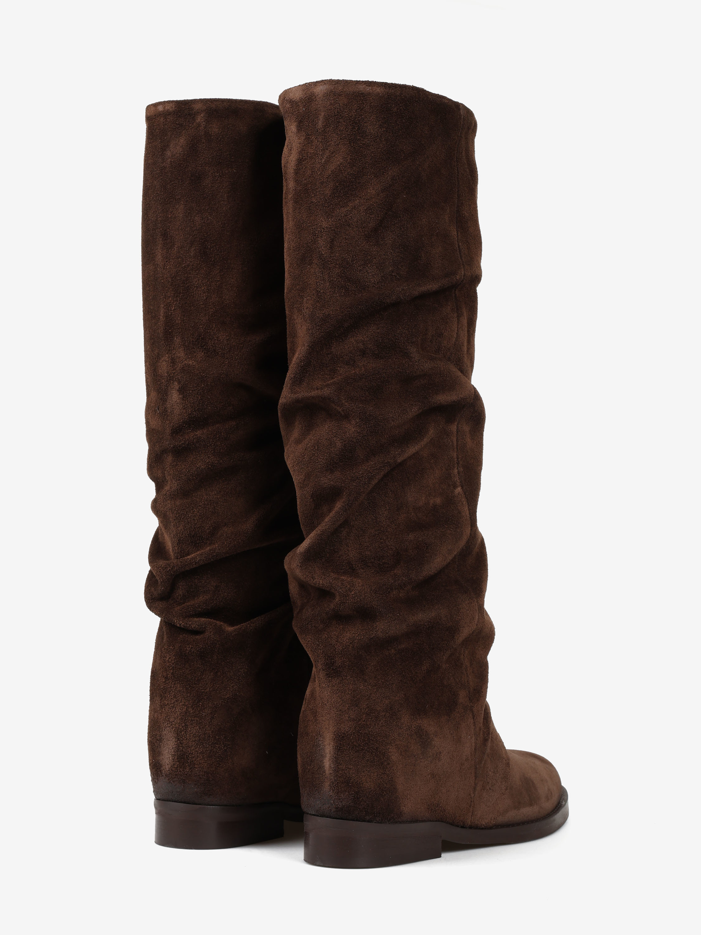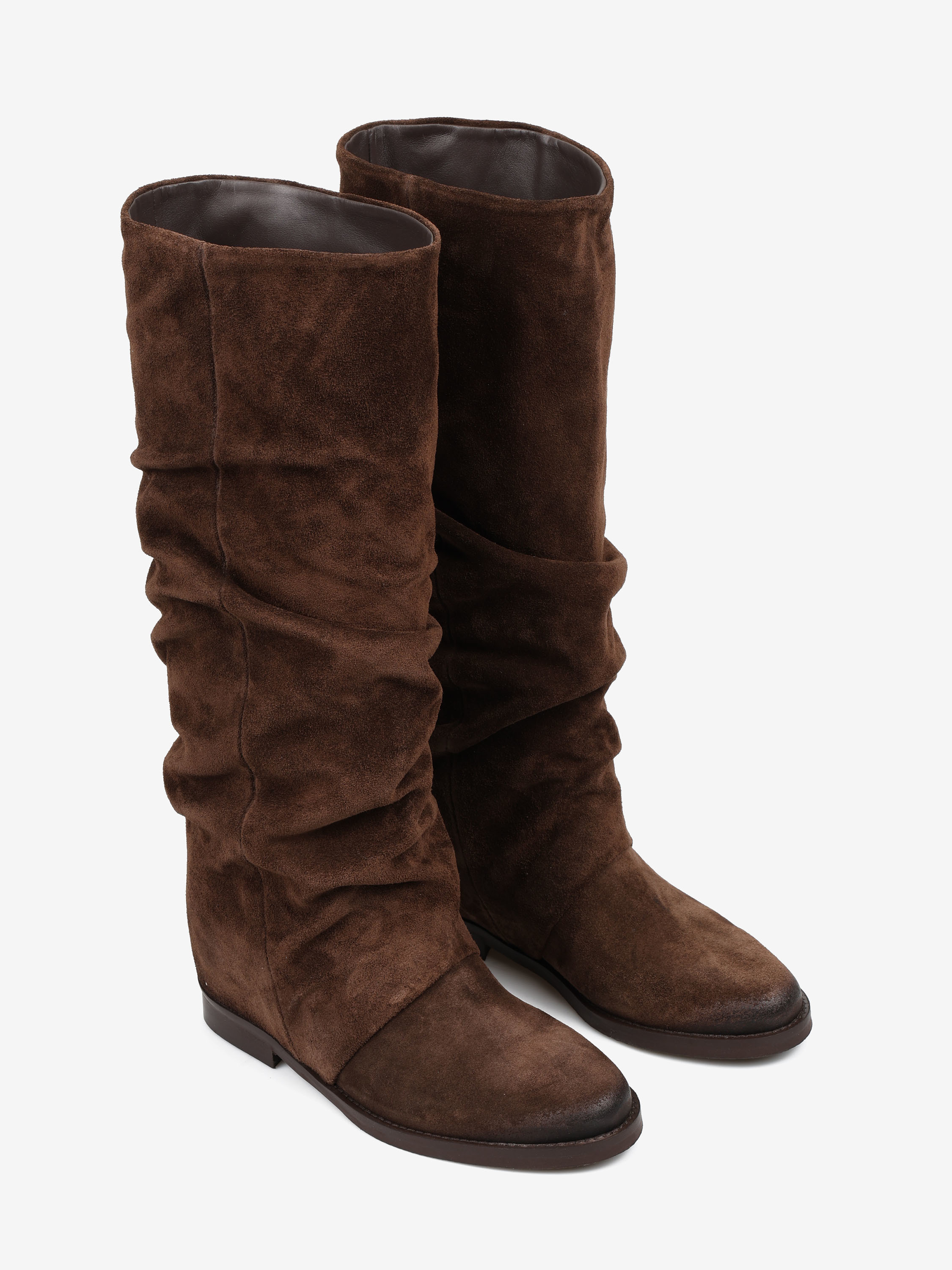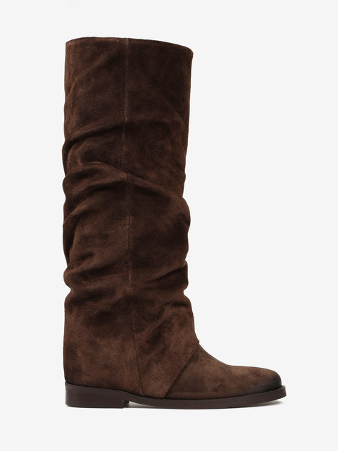 Wsuwane kozaki z ukrytym koturnem (ok. 5 cm) i przedłużoną, marszczoną cholewką.